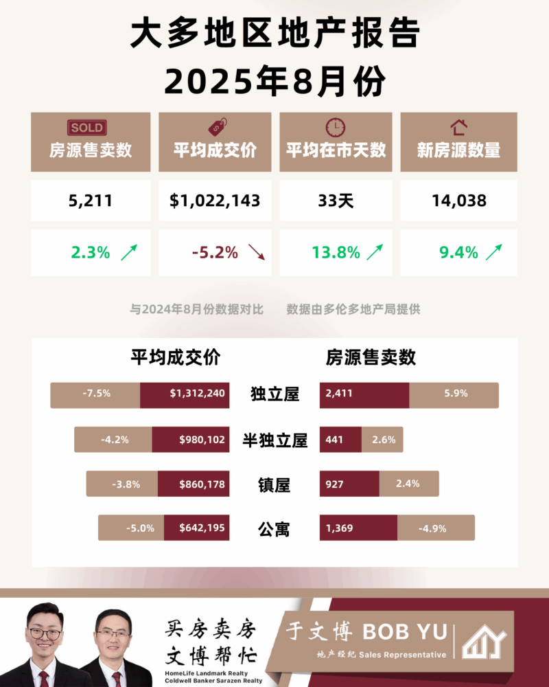 根据多伦多地产局(TRREB)的统计,8月通过MLS®系统共成交 5,211套,较去年同期增加 2.3%;与此同时,14,038套新挂牌进入市场,同比大涨 9.4%,供应扩张速度明显超过成交增长。