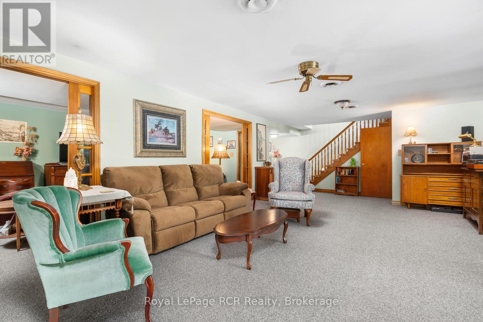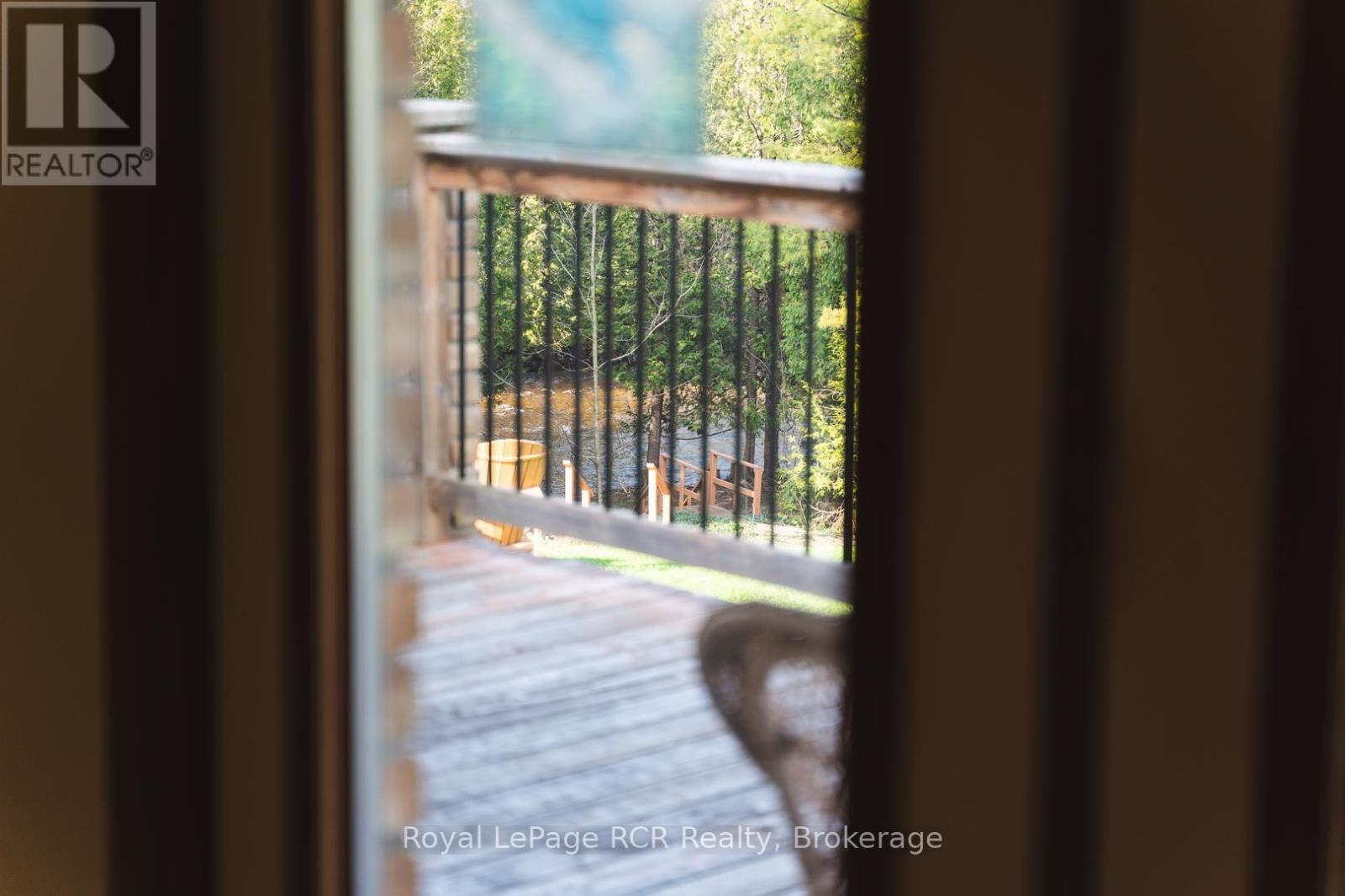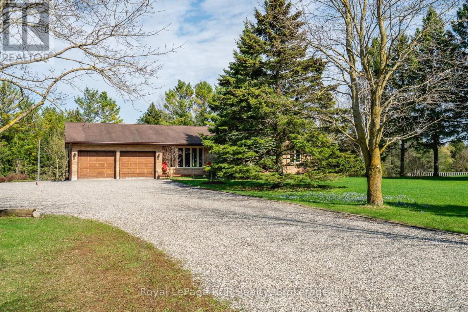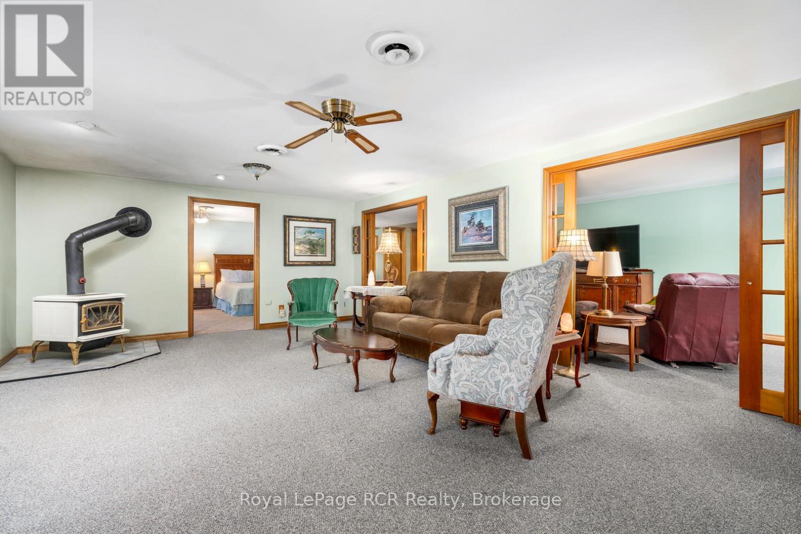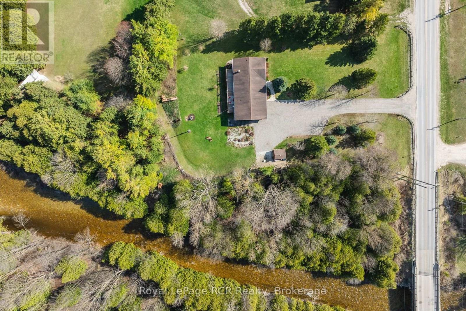 Rare opportunity to own a waterfront acreage just minutes from Hanover, offering a gorgeous natural setting with a lovely bungalow, 2 storage sheds and only moments to the convenience of town amenities. Located on a paved road with Wightman fibre optic internet, this property combines rural living with modern connectivity. The fully bricked 3+1 bedroom, 3 bathroom bungalow features a practical layout. The main floor offers an eat-in kitchen with solid wood Hanover Cabinetry, quartz countertops, and French doors leading to a large deck overlooking the forest and Beatty Saugeen River. The living room includes a picture window with views of the front covered porch, trees and gardens. There are three bedrooms, including a spacious L-shaped primary with large closet and direct access to the four-piece bathroom. A two-piece bathroom, laundry room, and attached double car garage complete the main level.The fully finished lower level includes a walk-out, living room with an airtight wood stove, family room with pocket French doors, a spacious bedroom, kitchenette, three-piece bathroom, 3 storage rooms--ideal for guests or multigenerational living. Other features include two automatic garage door openers, updated windows (2016), high-efficiency furnace, central air (2010), water system (with RO water treatment, iron filter, water softener), recycled asphalt driveway, generator, full appliance package and two storage sheds.This acreage is a private playground--whether you are fishing or tubing in the summer, snowshoeing in the winter, relaxing at the river or at the campfire, watching wildlife or gardening, every season offers a new way to enjoy outdoor life. Conveniently located just minutes from Hanover's schools, hospital, and shopping, this waterfront property combines a peaceful rural setting with easy access to everyday amenities. Spacious with main floor just over 1600sq ft, lower level 1343, above grade finished approx 2400 sq ft with walkout. (id:43681)