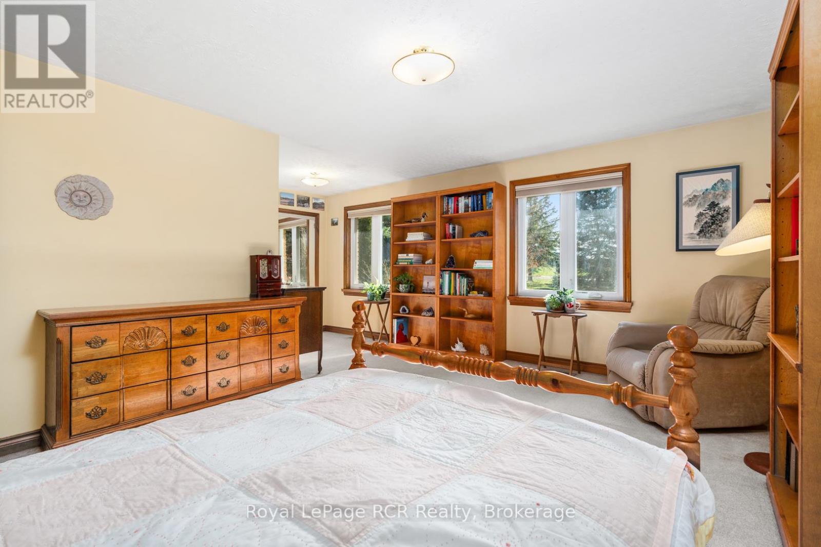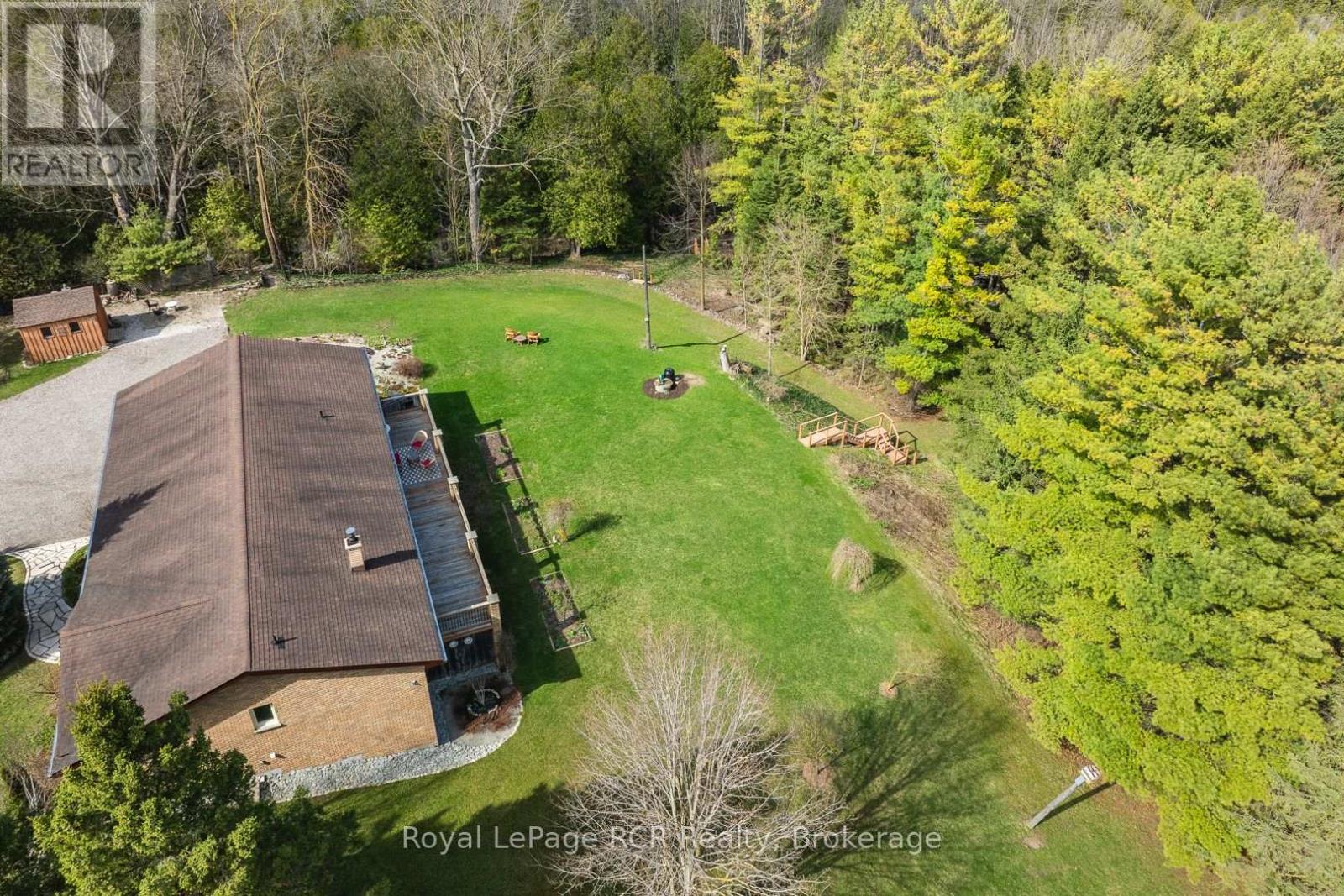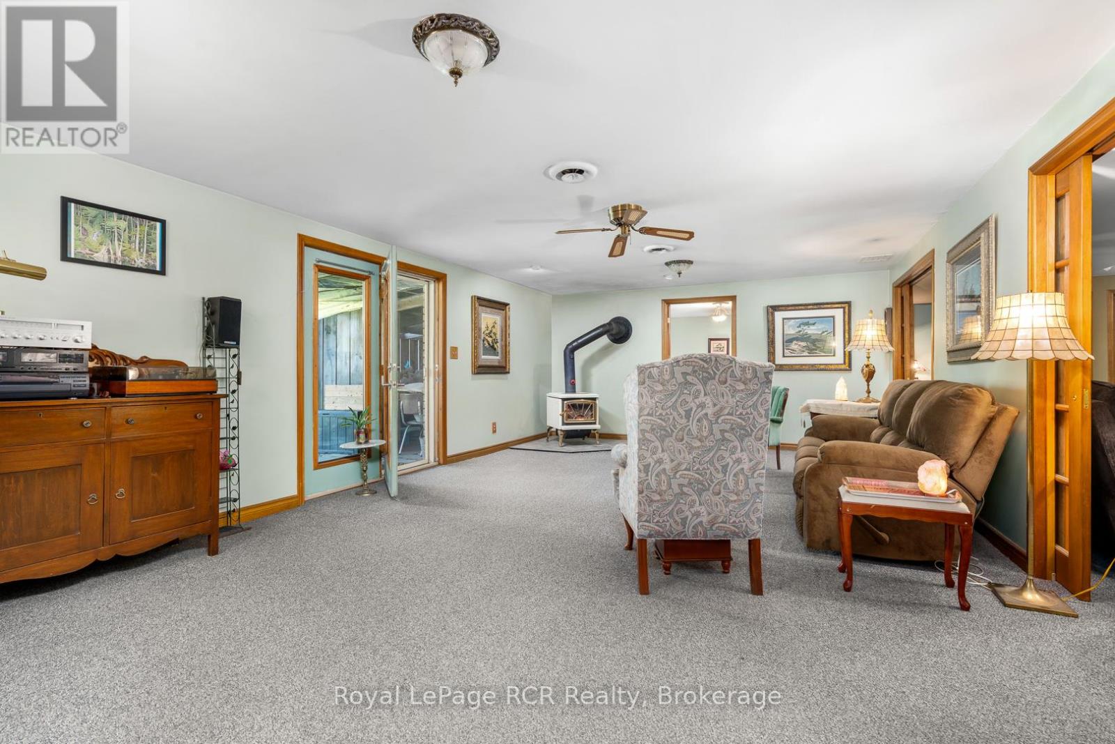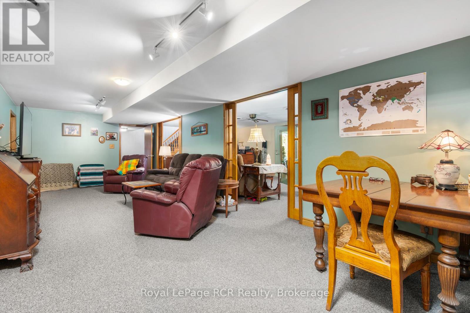Rare opportunity to own a waterfront acreage just minutes from Hanover, offering a gorgeous natural setting with a lovely bungalow, 2 storage sheds and only moments to the convenience of town amenities. Located on a paved road with Wightman fibre optic internet, this property combines rural living with modern connectivity. The fully bricked 3+1 bedroom, 3 bathroom bungalow features a practical layout. The main floor offers an eat-in kitchen with solid wood Hanover Cabinetry, quartz countertops, and French doors leading to a large deck overlooking the forest and Beatty Saugeen River. The living room includes a picture window with views of the front covered porch, trees and gardens. There are three bedrooms, including a spacious L-shaped primary with large closet and direct access to the four-piece bathroom. A two-piece bathroom, laundry room, and attached double car garage complete the main level.The fully finished lower level includes a walk-out, living room with an airtight wood stove, family room with pocket French doors, a spacious bedroom, kitchenette, three-piece bathroom, 3 storage rooms--ideal for guests or multigenerational living. Other features include two automatic garage door openers, updated windows (2016), high-efficiency furnace, central air (2010), water system (with RO water treatment, iron filter, water softener), recycled asphalt driveway, generator, full appliance package and two storage sheds.This acreage is a private playground--whether you are fishing or tubing in the summer, snowshoeing in the winter, relaxing at the river or at the campfire, watching wildlife or gardening, every season offers a new way to enjoy outdoor life. Conveniently located just minutes from Hanover's schools, hospital, and shopping, this waterfront property combines a peaceful rural setting with easy access to everyday amenities. Spacious with main floor just over 1600sq ft, lower level 1343, above grade finished approx 2400 sq ft with walkout. (id:43681)