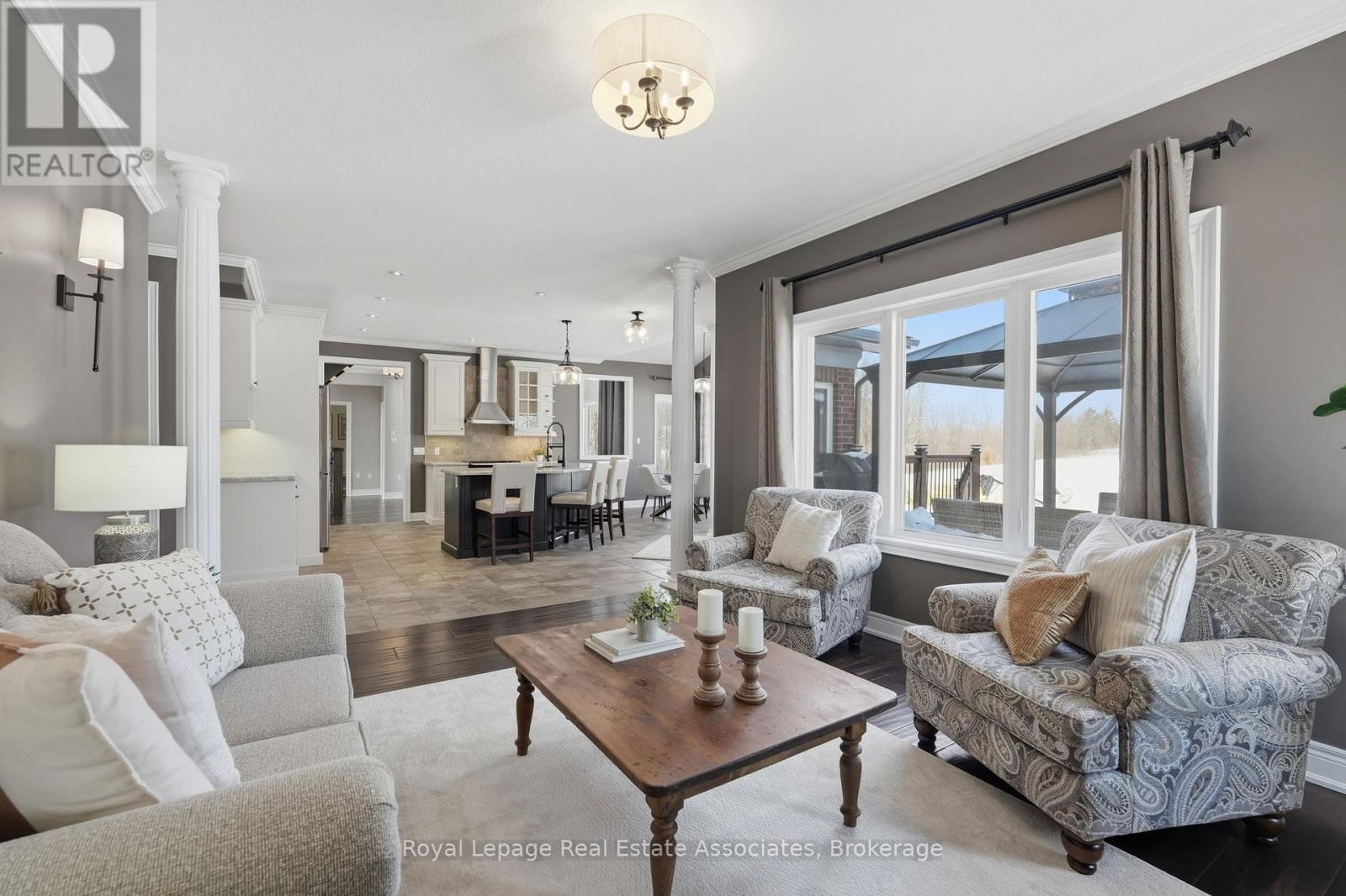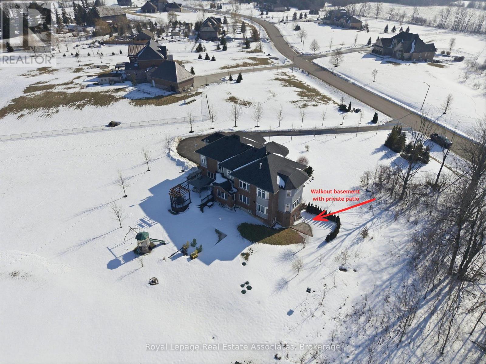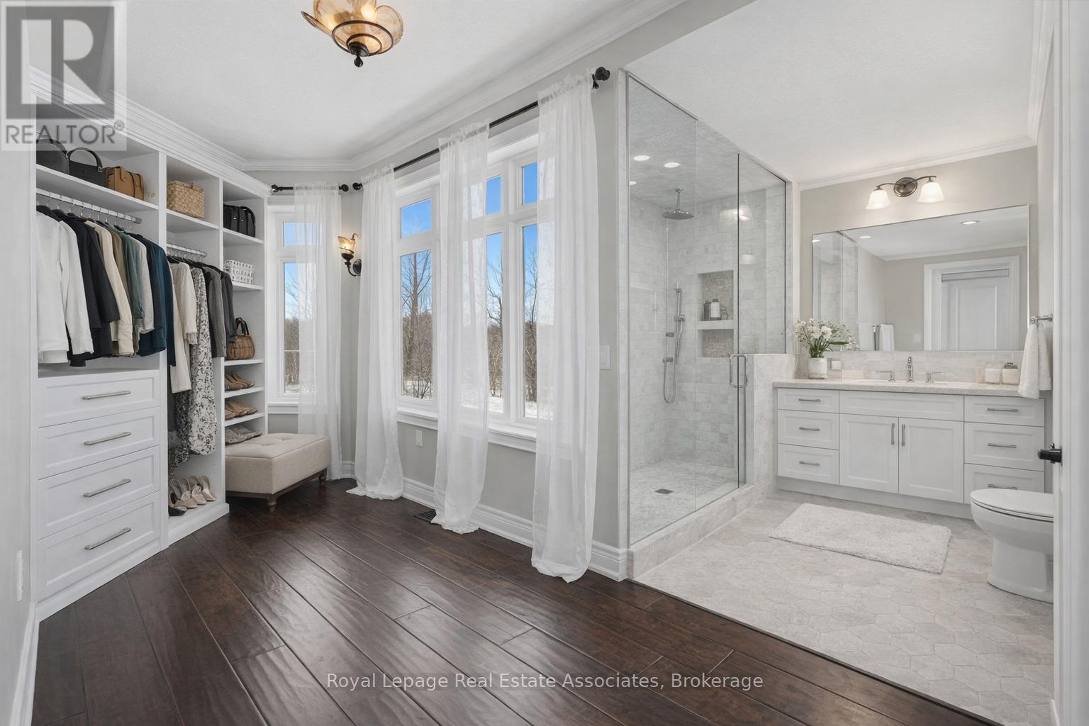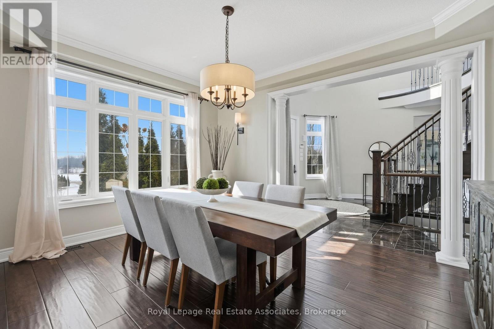 Welcome to 100 Chesswood Trail, an executive custom built estate home on a quiet cul-de-sac in prestigious Chestnut Grove Estates. Set on over 8 acres with breathtaking countryside views, this spectacular home has it all. Featuring over 6,000 sq ft of finished living space with 6+2 bedrooms, 5.5 bathrooms, this home makes a stunning first impression with a 19-foot, two-story foyer, marble flooring, and grand 'Scarlett O'Hara' Staircase. The wide-plank hardwood floors lead to a bright two-storey sitting room with floor-to-ceiling windows and a stone gas fireplace. The kitchen offers granite countertops, stainless steel appliances, and an oversized island, with a breakfast area opening to the backyard deck. The main level also includes a family room, formal dining room, office, versatile bonus room (bedroom or den), and a mudroom with built-ins, including separate exterior access and access to the 3-car garage. Upstairs, five bedrooms enjoy ensuite or shared Jack-and-Jill baths, ensuring privacy and convenience for family or guests. The luxurious primary retreat features a spa-inspired 5-piece ensuite, custom walk-in closet, and private sitting area. The fully finished walk-out basement has a separate entrance, offering excellent in-law suite potential, and includes a kitchen rough-in, large recreation area, media room, two bedrooms, a 3-piece bath, gym or multi-purpose room, and ample storage. Additional highlights include geothermal heating and cooling, pot lights, rounded wall corners, 200 AMP service, professionally landscaped grounds, and patterned concrete walkways. Conveniently located 15/20 minutes to Waterdown, Burlington, Guelph, Cambridge, this home offers quick highway access and is your perfect picturesque city retreat. (id:43681)