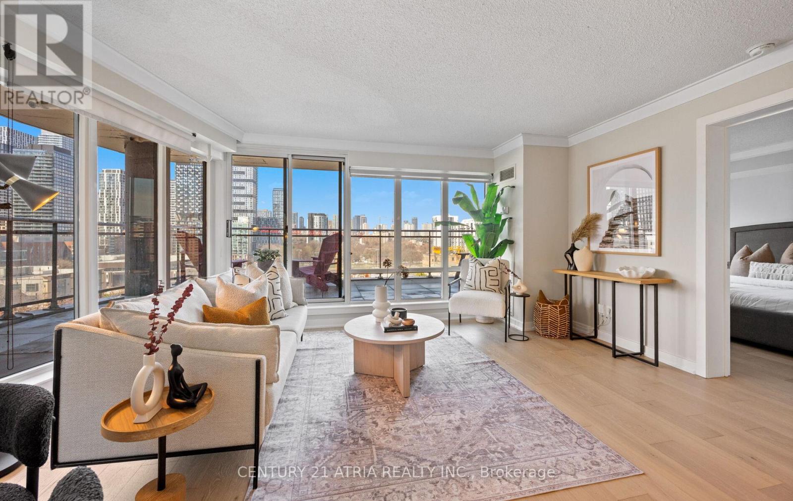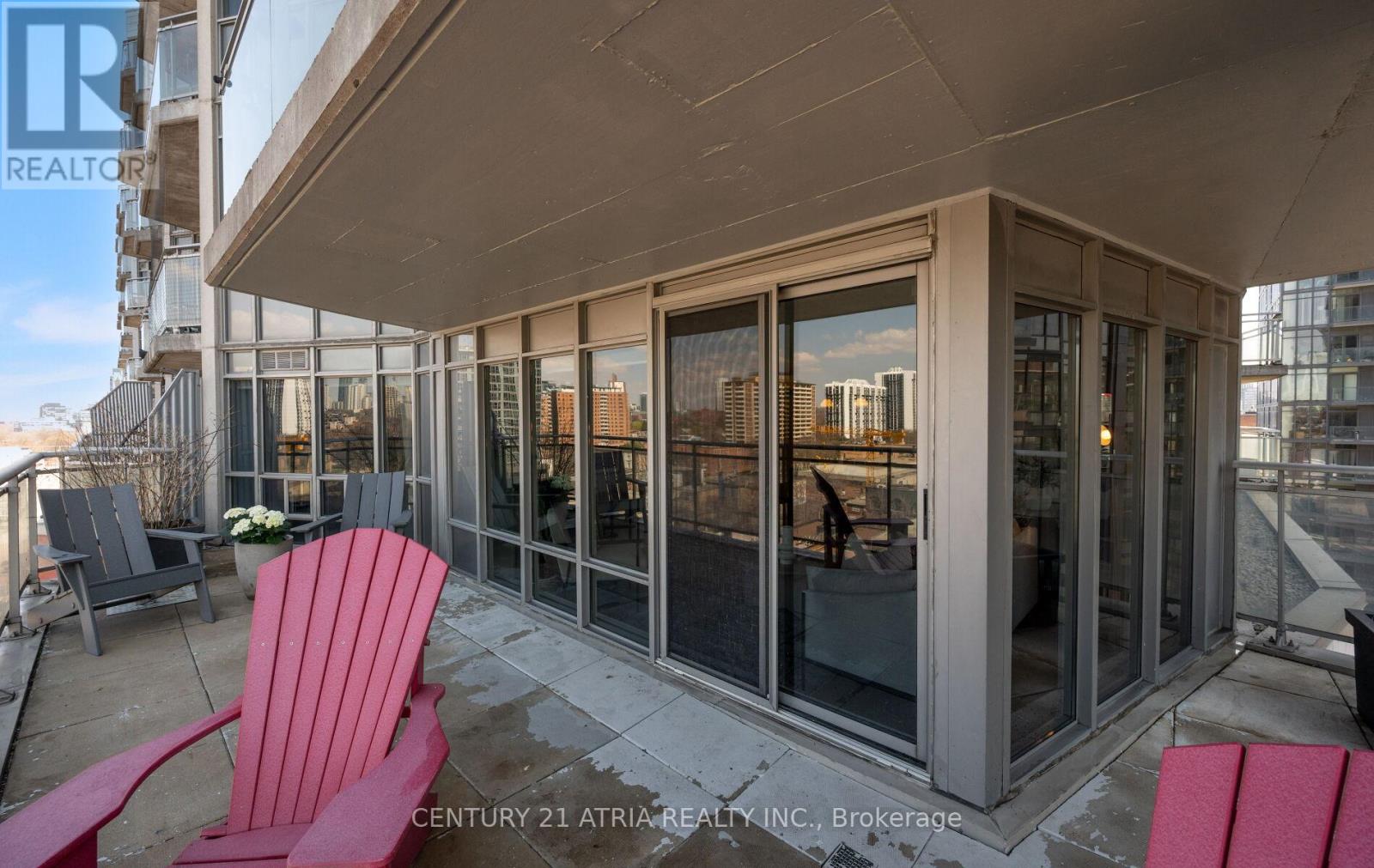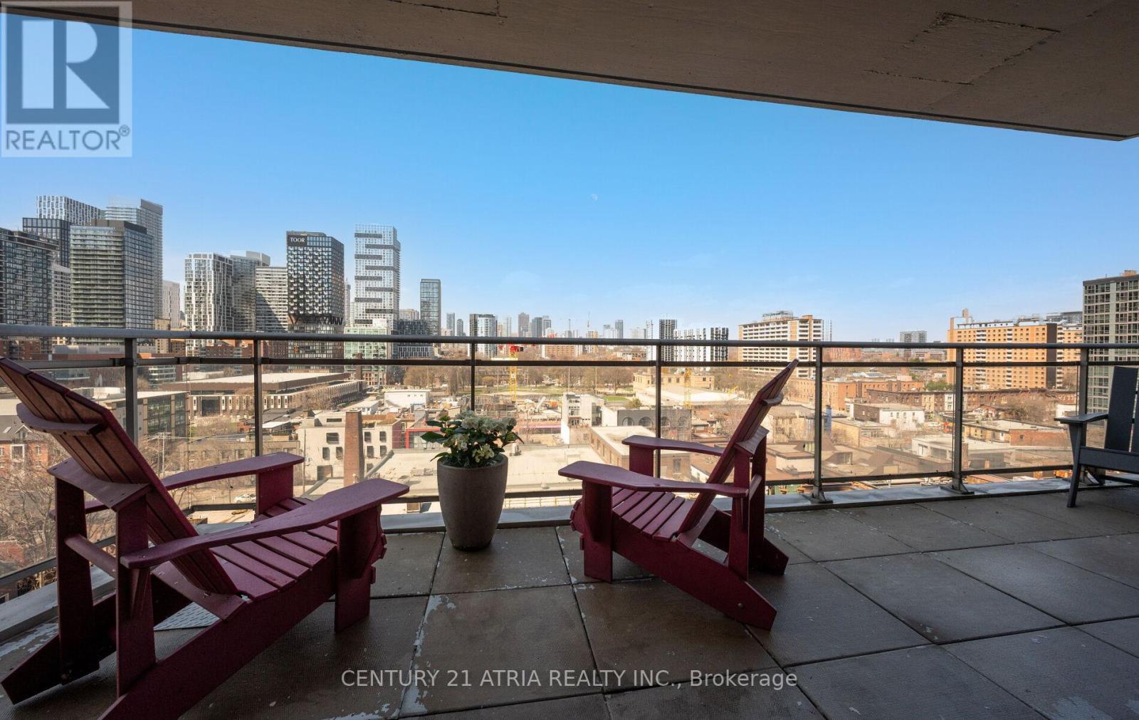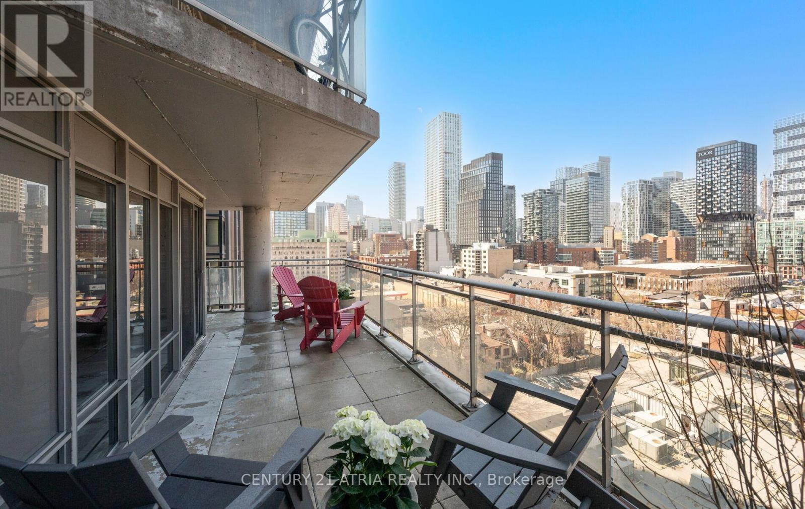 $712 每月Rarely offered corner end-unit at Space Lofts. This bright and spacious 1+den layout offers nearly 1,000 sq ft of combined indoor/outdoor living, highlighted by a massive wrap-around terrace - one of the best in the building - perfect for entertaining or unwinding with unobstructed city views. Positioned on the 10th floor and set along a one-way street, the unit enjoys a quiet, peaceful atmosphere rarely found downtown. The open-concept design is filled with natural light from expansive windows and features a highly functional layout, including a large primary bedroom that comfortably fits a king-sized bed, plus a generous den ideal as a second bedroom or home office. The kitchen is equipped with granite countertops and flows seamlessly into the living and dining areas. A standout feature is the oversized parking spot that can accommodate two vehicles, with a locker conveniently located directly across - an extremely rare find downtown. All utilities are included in the maintenance fees for added convenience. Ideally located, steps to St. Lawrence Market, the Distillery District, transit, restaurants, and the waterfront. Exceptional value in a well-managed building with unbeatable convenience and outdoor space. (id:43681)
