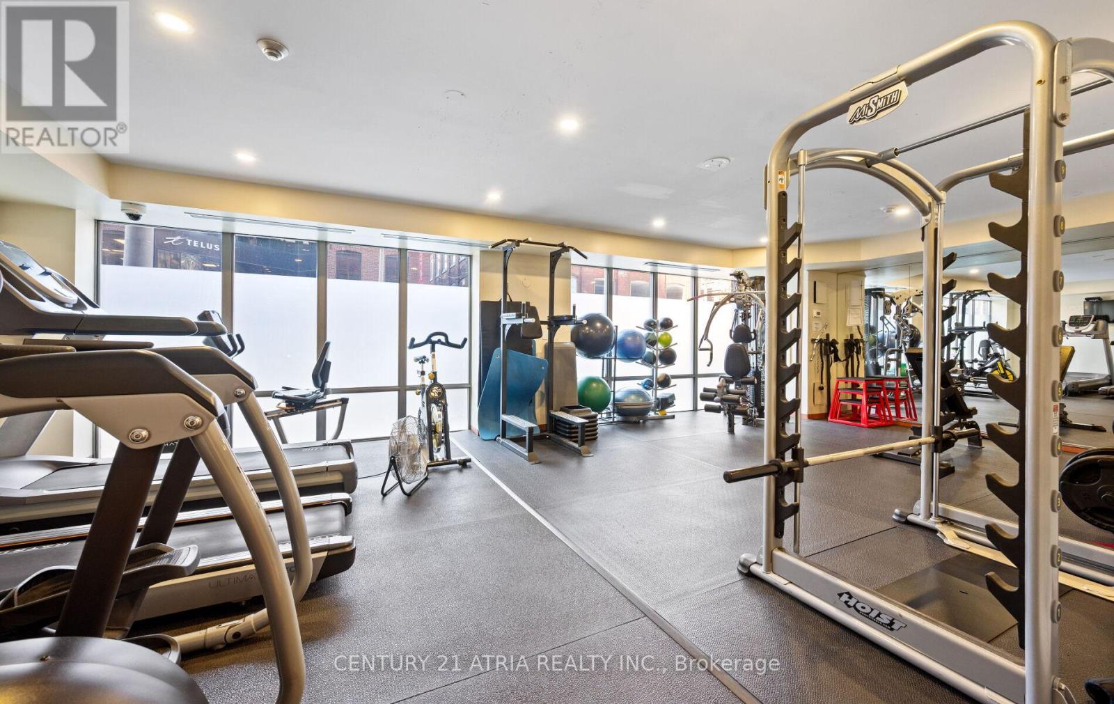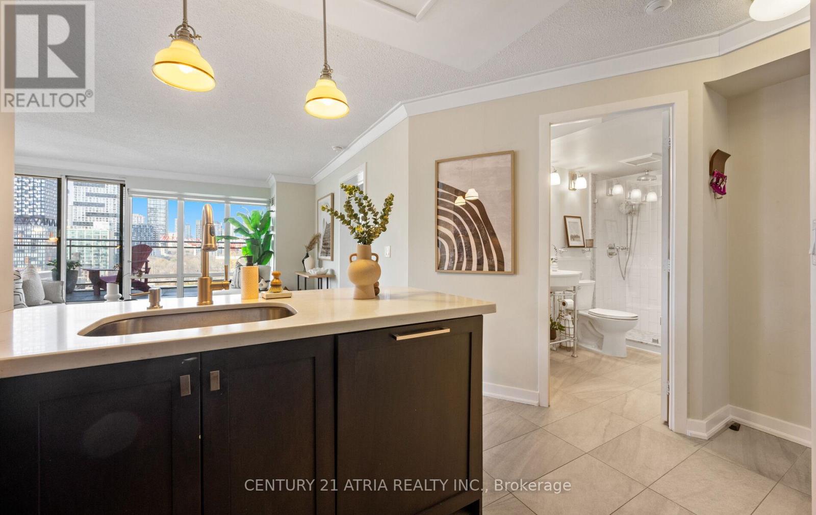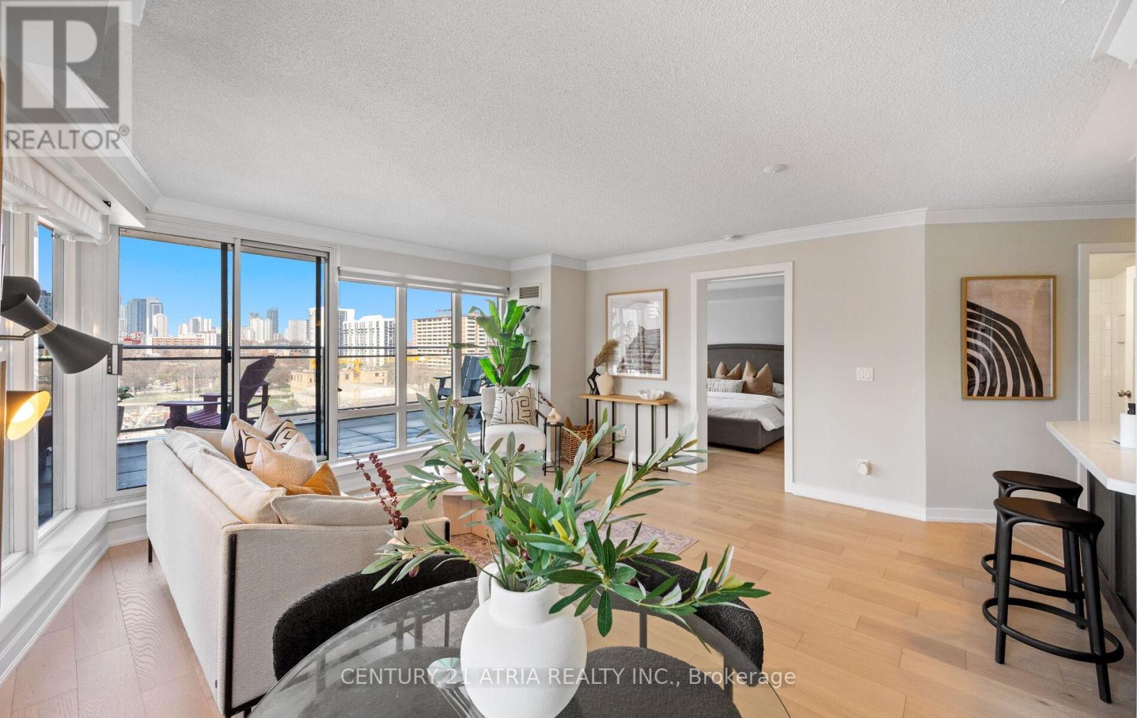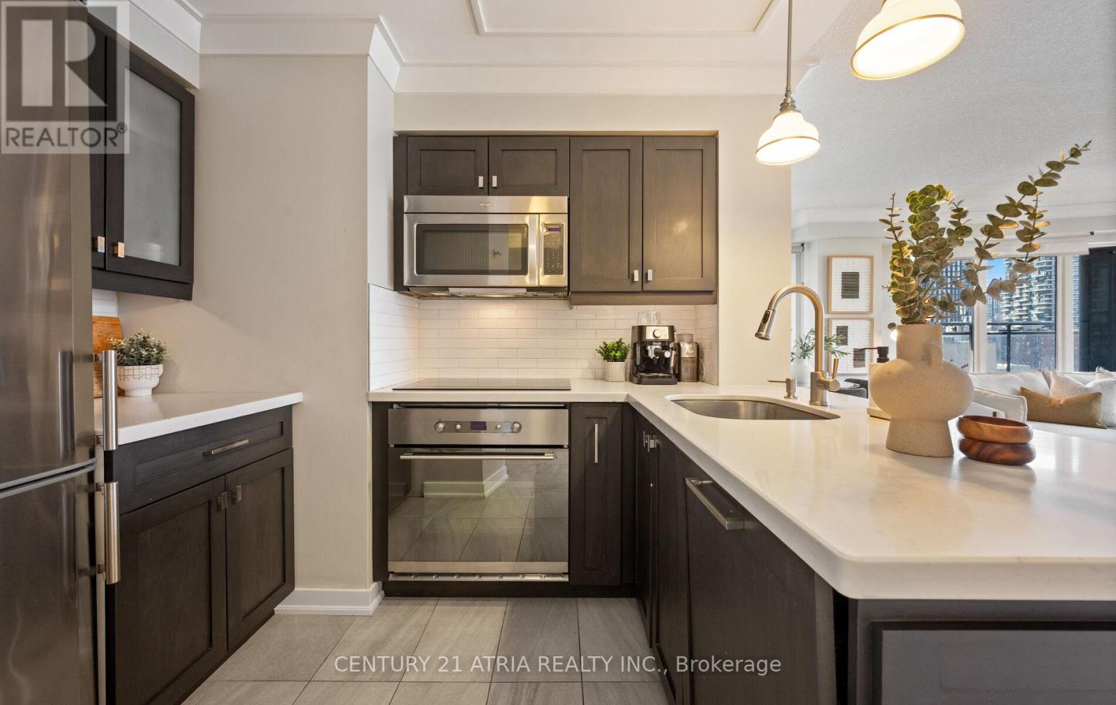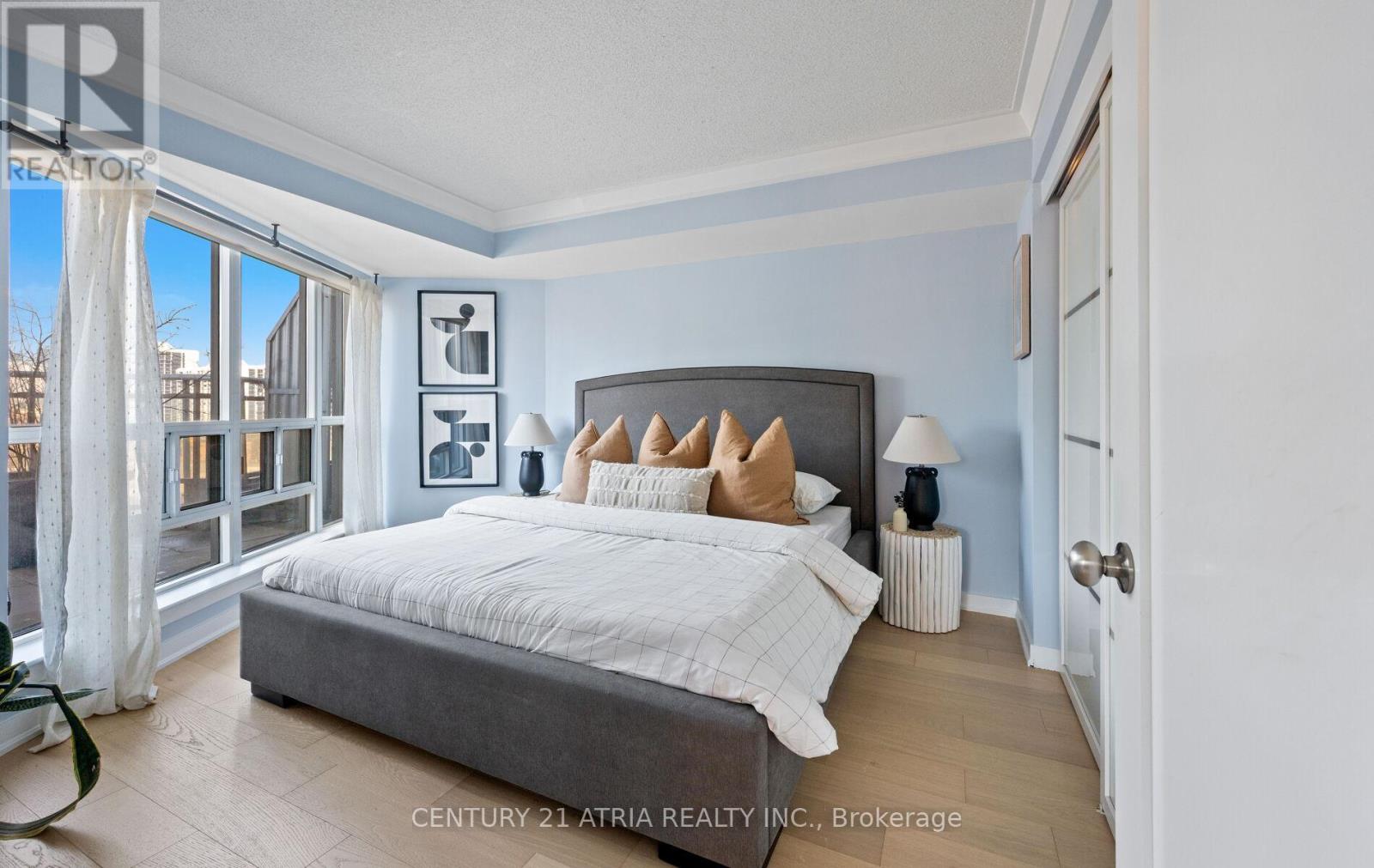 $712 每月Rarely offered corner end-unit at Space Lofts. This bright and spacious 1+den layout offers nearly 1,000 sq ft of combined indoor/outdoor living, highlighted by a massive wrap-around terrace - one of the best in the building - perfect for entertaining or unwinding with unobstructed city views. Positioned on the 10th floor and set along a one-way street, the unit enjoys a quiet, peaceful atmosphere rarely found downtown. The open-concept design is filled with natural light from expansive windows and features a highly functional layout, including a large primary bedroom that comfortably fits a king-sized bed, plus a generous den ideal as a second bedroom or home office. The kitchen is equipped with granite countertops and flows seamlessly into the living and dining areas. A standout feature is the oversized parking spot that can accommodate two vehicles, with a locker conveniently located directly across - an extremely rare find downtown. All utilities are included in the maintenance fees for added convenience. Ideally located, steps to St. Lawrence Market, the Distillery District, transit, restaurants, and the waterfront. Exceptional value in a well-managed building with unbeatable convenience and outdoor space. (id:43681)
