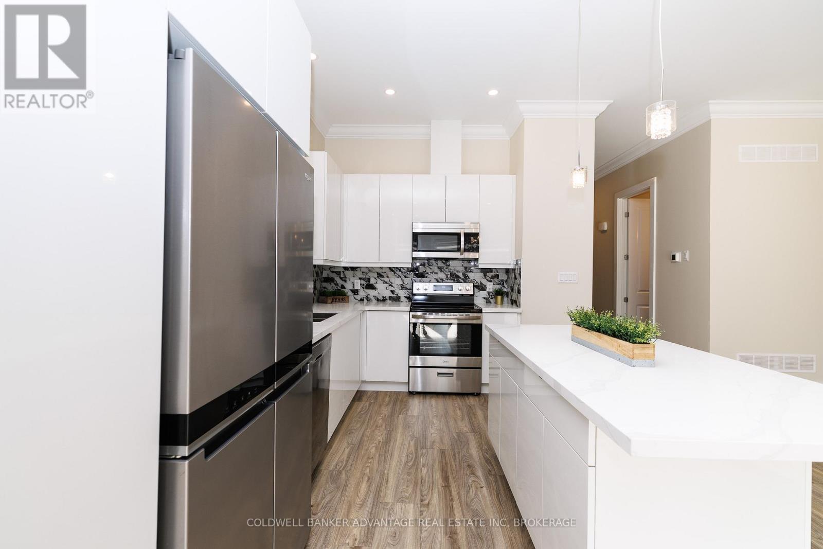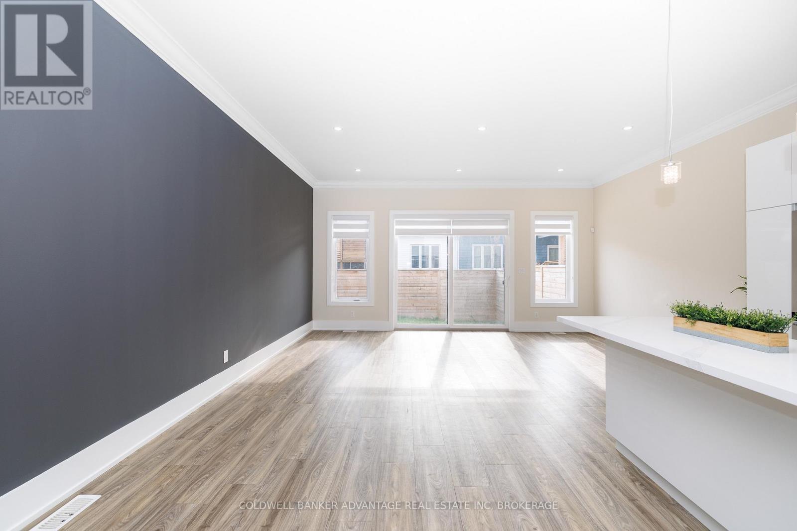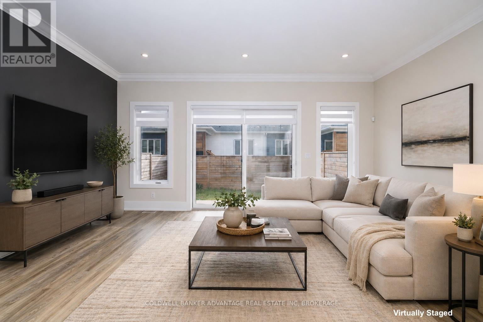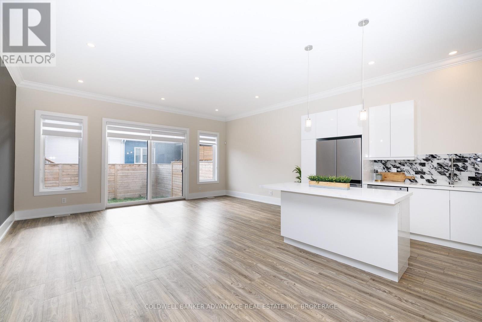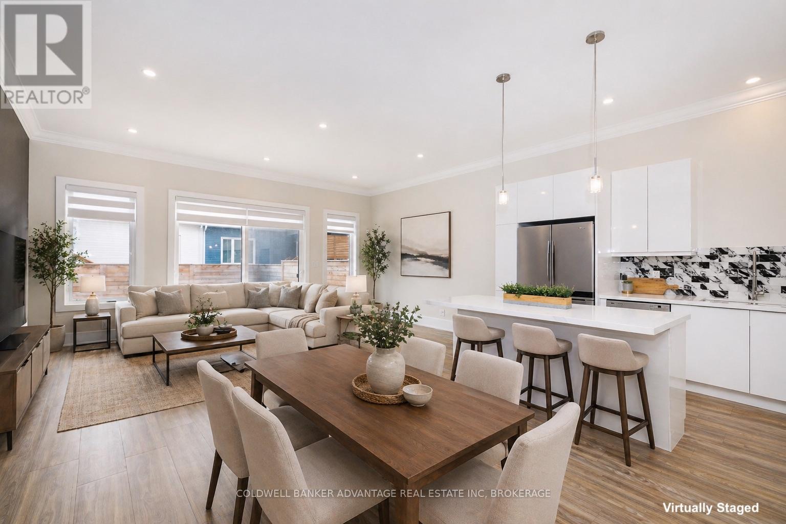 Impressive freehold end-unit townhome with a single attached garage and soaring ceilings, offering over 2,000 sq ft of beautifully finished living space in the highly sought-after Hansler Heights neighbourhood. With its abundance of natural light, this home delivers a true detached like feel. The main floor is designed for modern living, featuring a bright open concept layout centred around a stylish kitchen with quartz countertops, a large island, contemporary cabinetry, and a sleek backsplash. Upgraded finishes throughout include durable vinyl plank flooring, crown moulding, an iron spindle staircase. Enjoy impressive 10 foot ceilings on the main level and 9 foot ceilings upstairs, creating a spacious and airy atmosphere. The upper level offers four generously sized bedrooms, each with ample closet space. The primary suite features a walk-in closet and a well-appointed 4-piece ensuite. Added convenience comes with second floor laundry and an additional full 4-piece bathroom. The basement offers excellent future potential with high ceilings, egress windows, and a separate exterior entrance, ideal for an in-law suite or income generating opportunity.Step outside to a fully fenced backyard, perfect for relaxing or entertaining. Located close to parks, schools, shopping, and everyday amenities, with quick access to Highway 406 for an easy commute. (id:43681)