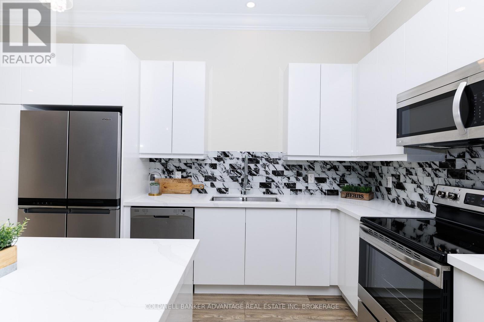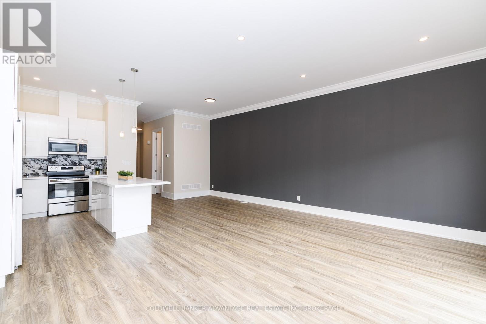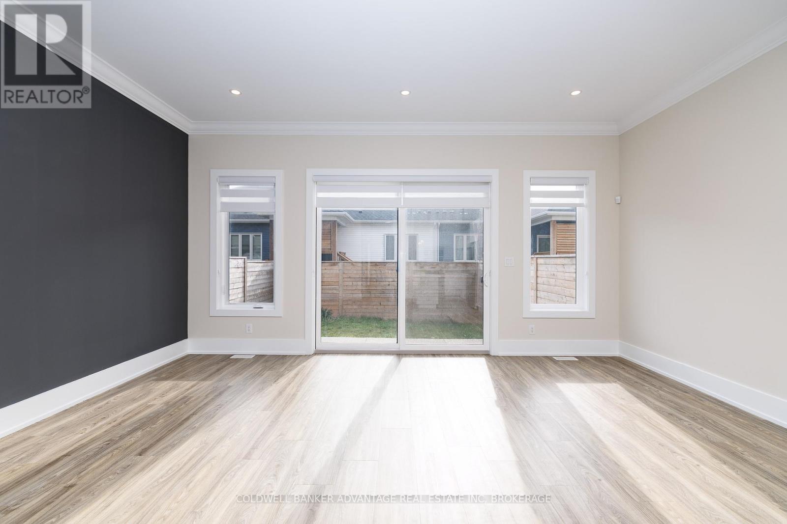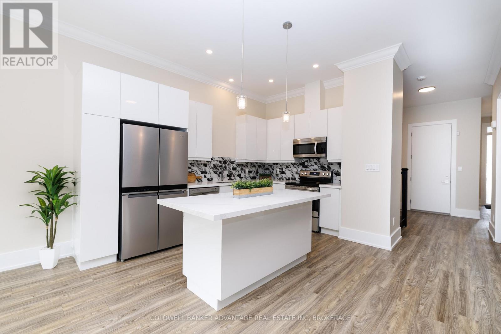 Impressive freehold end-unit townhome with a single attached garage and soaring ceilings, offering over 2,000 sq ft of beautifully finished living space in the highly sought-after Hansler Heights neighbourhood. With its abundance of natural light, this home delivers a true detached like feel. The main floor is designed for modern living, featuring a bright open concept layout centred around a stylish kitchen with quartz countertops, a large island, contemporary cabinetry, and a sleek backsplash. Upgraded finishes throughout include durable vinyl plank flooring, crown moulding, an iron spindle staircase. Enjoy impressive 10 foot ceilings on the main level and 9 foot ceilings upstairs, creating a spacious and airy atmosphere. The upper level offers four generously sized bedrooms, each with ample closet space. The primary suite features a walk-in closet and a well-appointed 4-piece ensuite. Added convenience comes with second floor laundry and an additional full 4-piece bathroom. The basement offers excellent future potential with high ceilings, egress windows, and a separate exterior entrance, ideal for an in-law suite or income generating opportunity.Step outside to a fully fenced backyard, perfect for relaxing or entertaining. Located close to parks, schools, shopping, and everyday amenities, with quick access to Highway 406 for an easy commute. (id:43681)