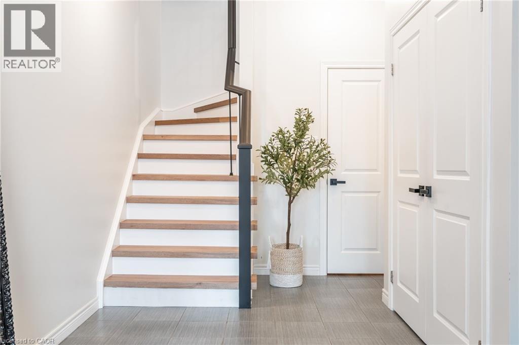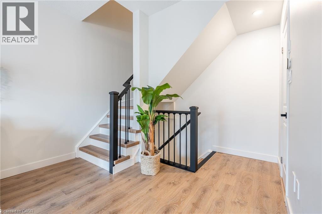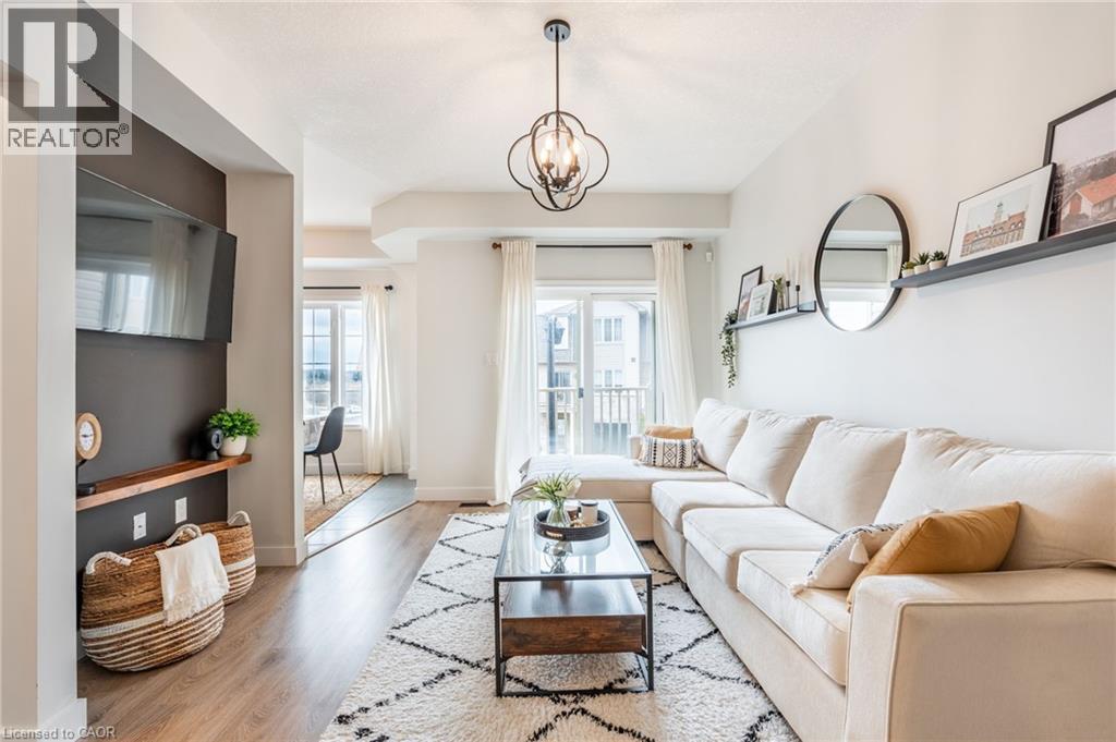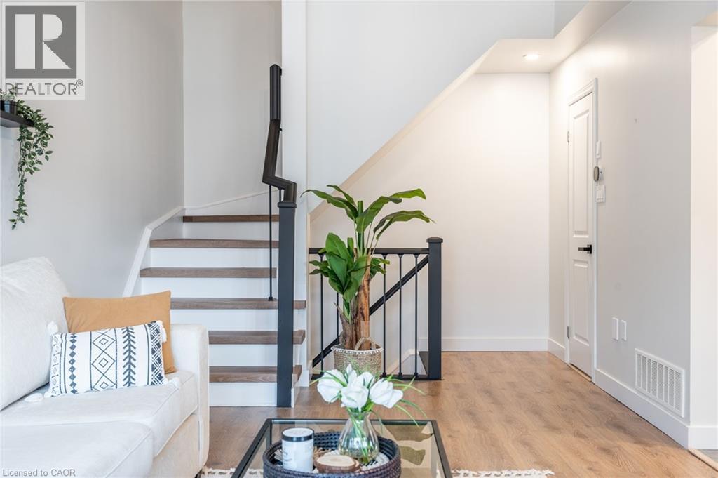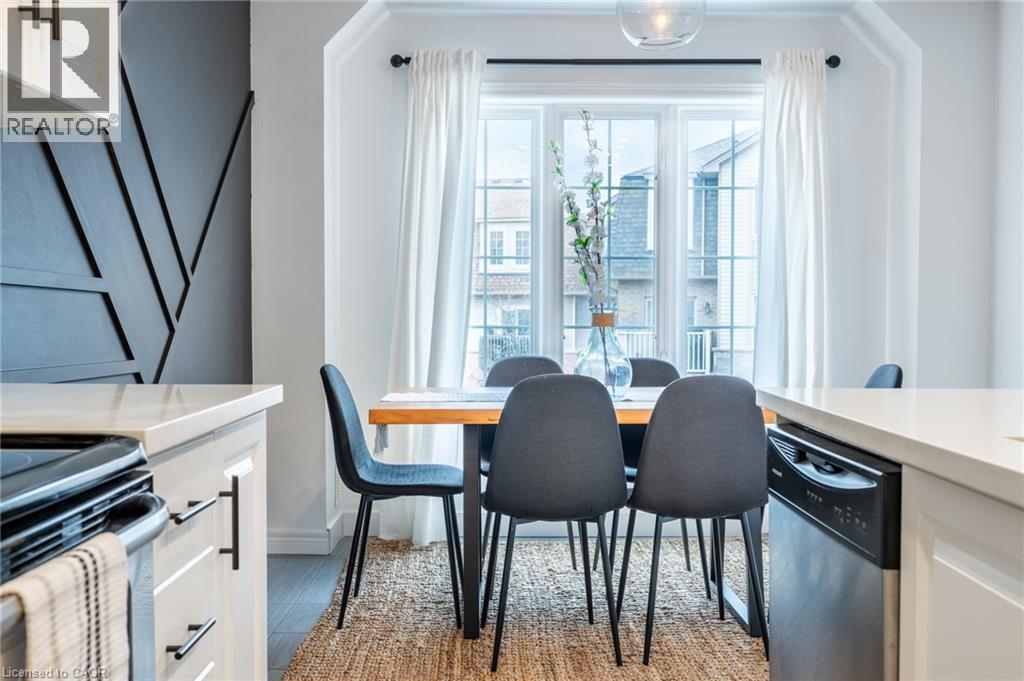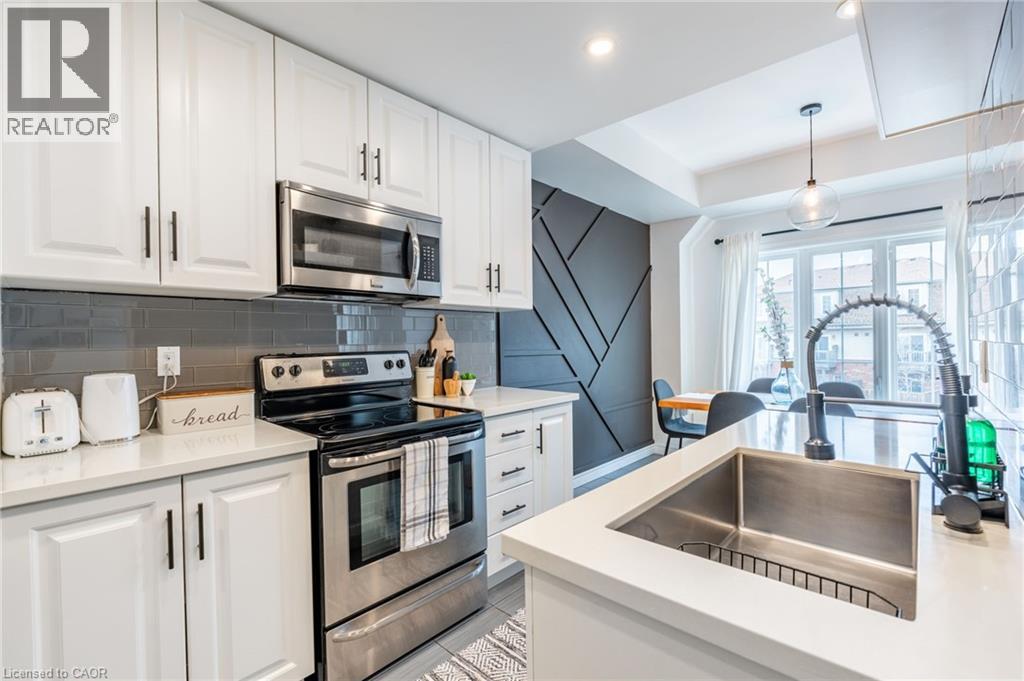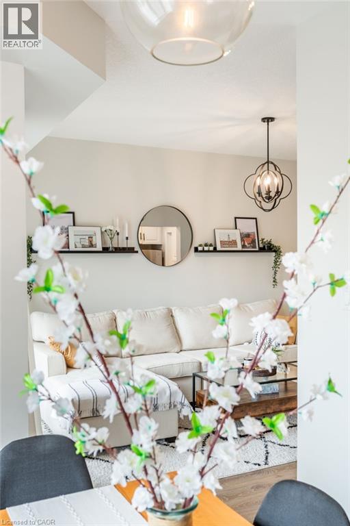 Feel immediately at home. This thoughtfully designed entryway sets the tone with its charcoal accent wall and bright natural light streaming through flanking windows. Cool-toned tile flooring flows underfoot, while a built-in nook offers the perfect spot to drop your keys and settle in. Every detail speaks to the care and attention invested in this Stoney Creek gem. Laminate floors stretch across this sun-filled living space, creating an open canvas for your daily life. The built-in media niche with its contrasting accent wall becomes a natural gathering point, while sculptural pendant lighting adds character overhead. Balcony access invites fresh air and natural light to flow freely, making this the kind of space where you'll actually want to spend your evenings unwinding. The dining room transforms ordinary meals into occasions worth savouring. The accent wall with geometric panelling creates an intimate backdrop, while expansive windows frame neighbourhood views and flood the space with daylight. Positioned perfectly between kitchen and windows, this spot becomes the heart of your home—where morning coffee tastes better and dinner conversations last longer. Stunning kitchen delivers everything you need without the fuss. Crisp white shaker cabinets pair with stainless steel appliances and gleaming quartz countertops, while grey subway tile backsplash adds subtle sophistication. Modern black hardware and thoughtful recessed lighting make meal prep a pleasure, and the open connection to your dining area means you're never cooking alone. Your primary bedroom wraps you in calm with its soothing sage green accent wall and warm laminate underfoot. The walk-in closet keeps everything organized and out of sight, while layered window treatments let you control the light exactly how you want it. Clean, functional, and thoughtfully updated bathrooms make daily routines feel less like chores. This one stands out from the rest - not to be overlooked! (id:43681)