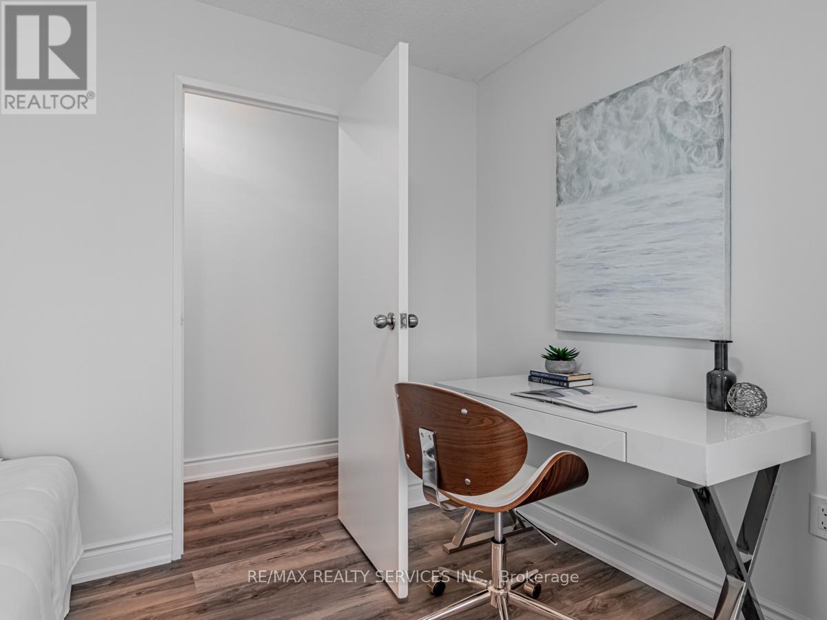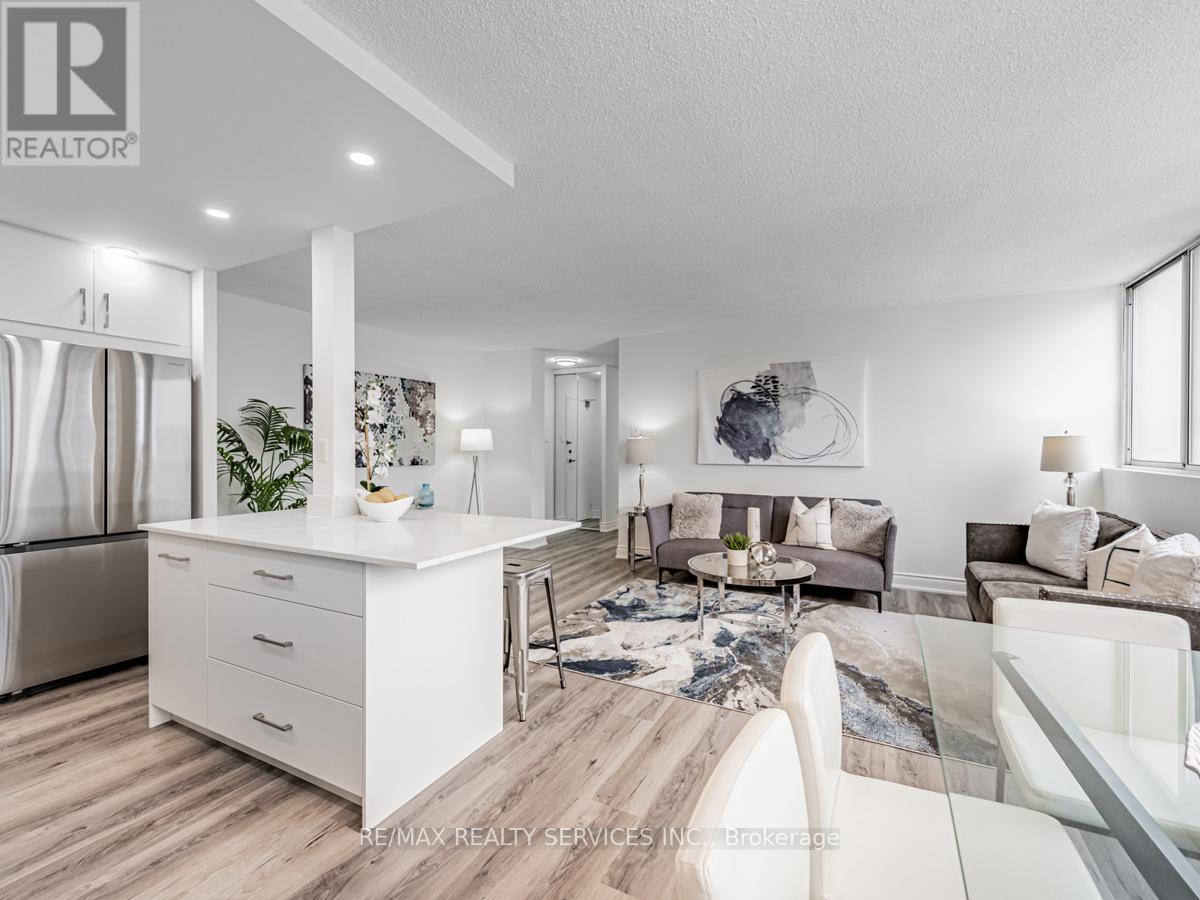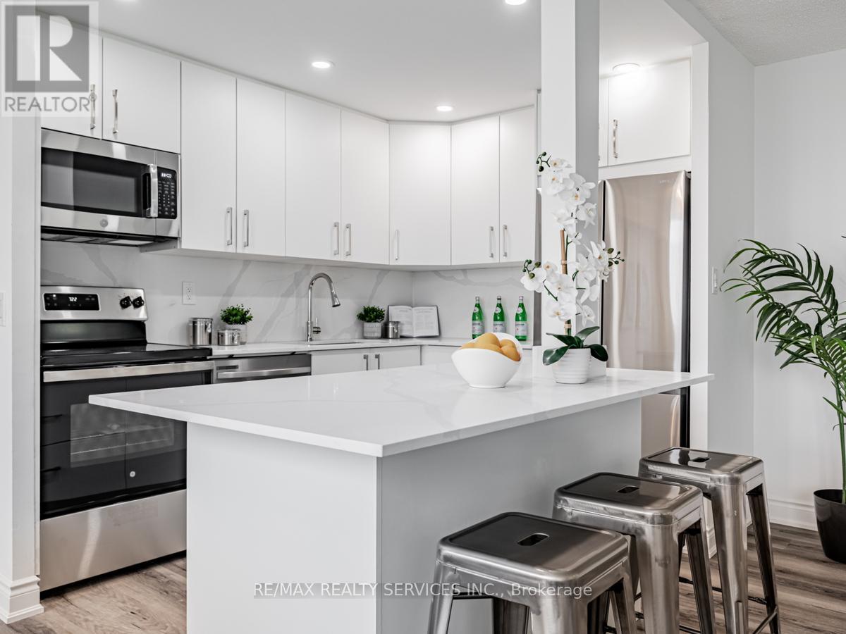 Beautifully renovated 2-bedroom + den condo featuring a modern kitchen with quartz countertops, stylish backsplash, and upgraded appliances. Bright open-concept living and dining area with large windows. Spacious bedrooms with ample closet space and a fully updated bathroom with contemporary finishes. Fresh paint and new flooring throughout. The versatile den can be used as a third bedroom or a home office. Includes ensuite laundry and one underground parking space. Maintenance fees cover all utilities, building insurance, and common elements. Enjoy excellent amenities including indoor pool, gym, sauna, party room, and 24/7 concierge/security. Prime location just steps to Square One, transit, shopping, and major highways, with the upcoming Hurontario LRT nearby. Ideal for first-time buyers, down-sizers, or investors. (id:43681)