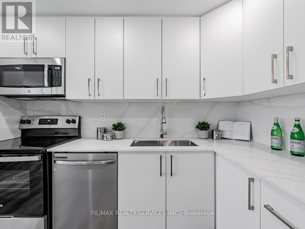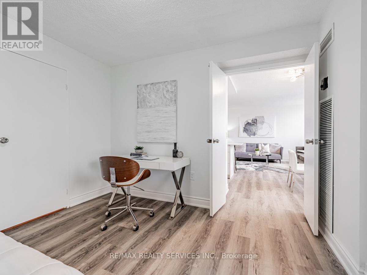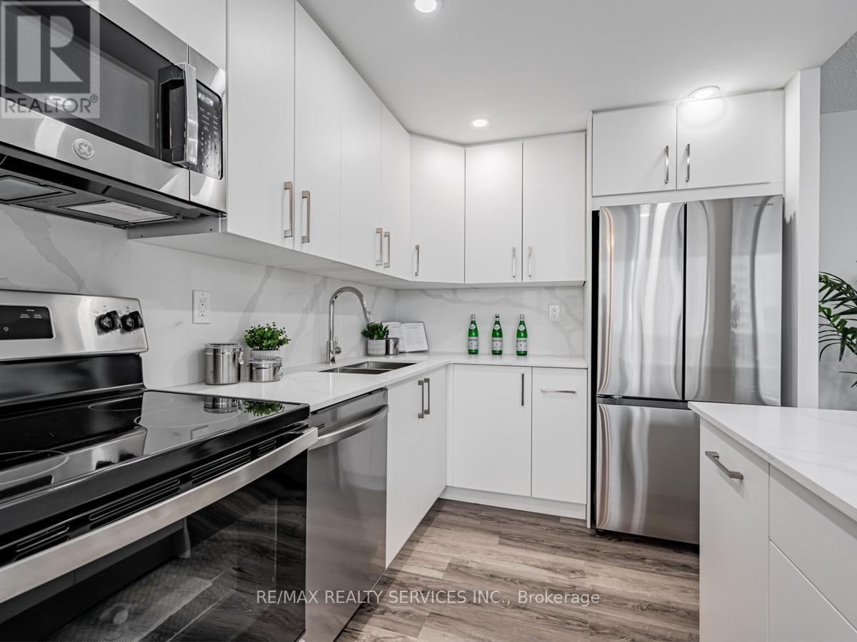 Beautifully renovated 2-bedroom + den condo featuring a modern kitchen with quartz countertops, stylish backsplash, and upgraded appliances. Bright open-concept living and dining area with large windows. Spacious bedrooms with ample closet space and a fully updated bathroom with contemporary finishes. Fresh paint and new flooring throughout. The versatile den can be used as a third bedroom or a home office. Includes ensuite laundry and one underground parking space. Maintenance fees cover all utilities, building insurance, and common elements. Enjoy excellent amenities including indoor pool, gym, sauna, party room, and 24/7 concierge/security. Prime location just steps to Square One, transit, shopping, and major highways, with the upcoming Hurontario LRT nearby. Ideal for first-time buyers, down-sizers, or investors. (id:43681)