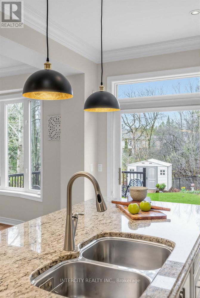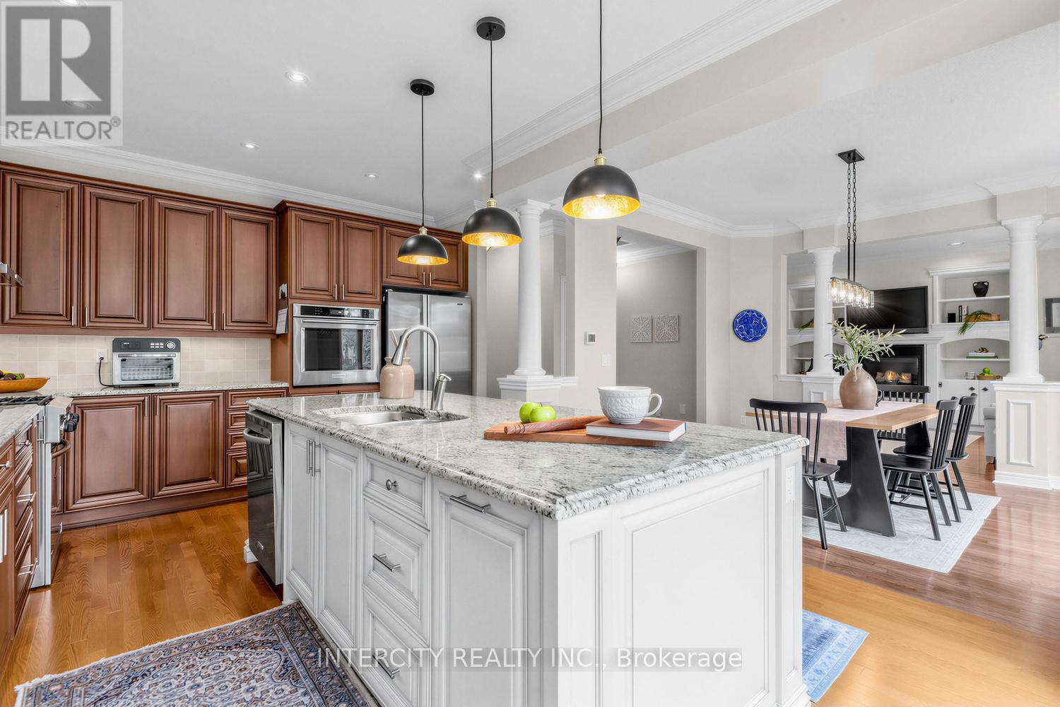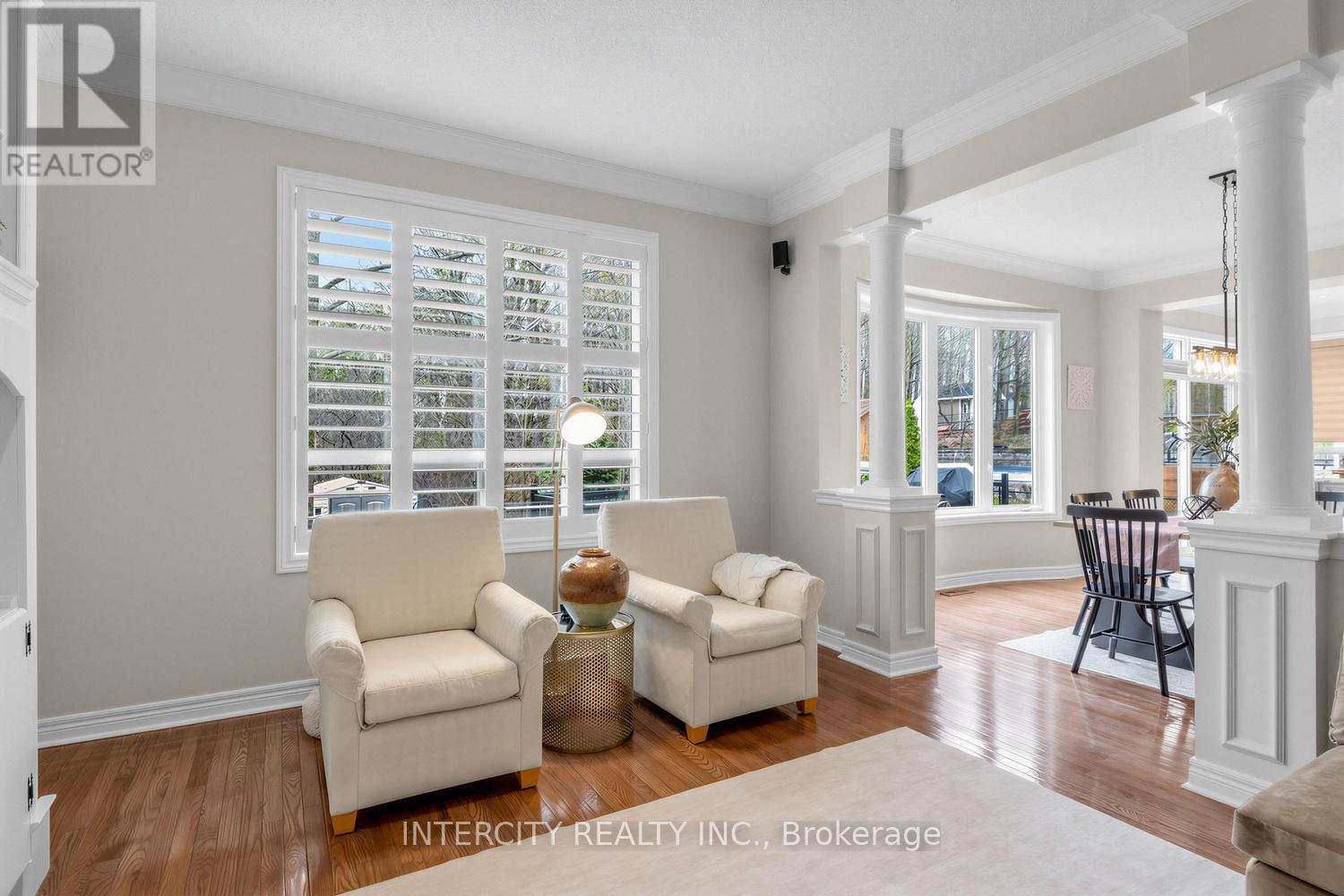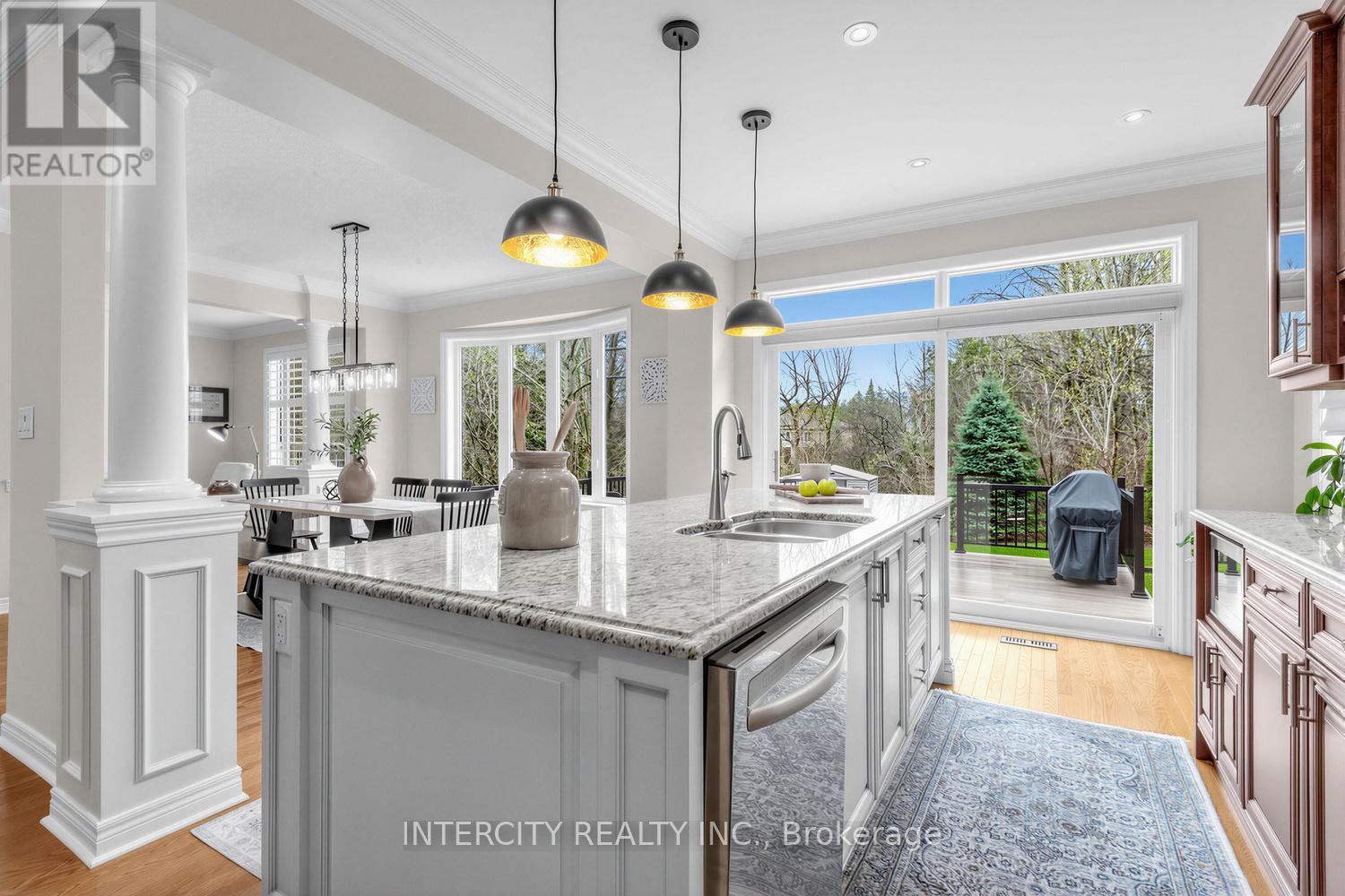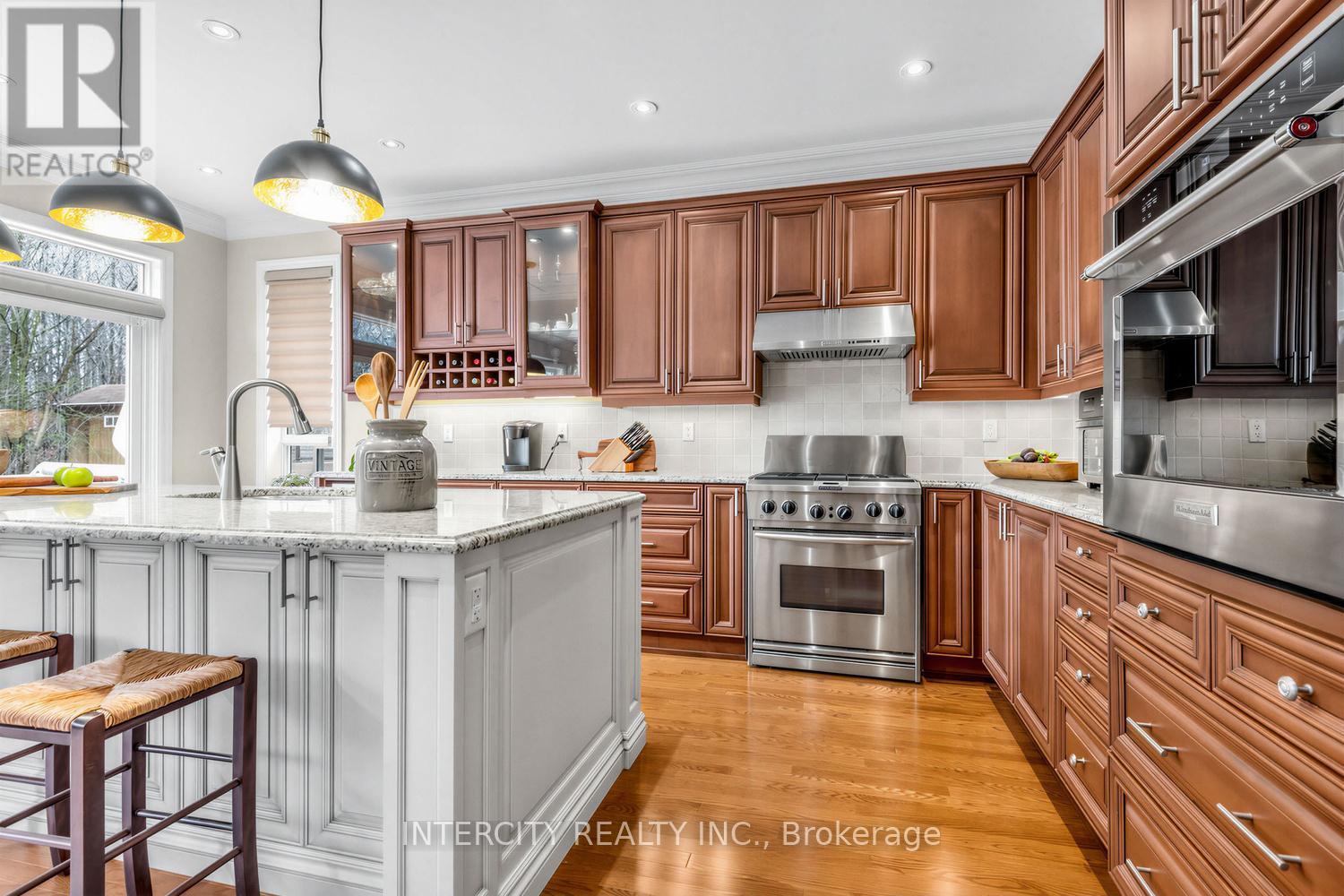 Nestled within lush greenspace and surrounded by mature trees, 12 Sandbanks Drive offers a rare sense of privacy and tranquility in the heart of Richmond Hill. This exceptional residence blends natural beauty with refined living, creating the perfect setting for families and those seeking a peaceful retreat without sacrificing convenience. Step inside to a thoughtfully designed layout featuring solid hardwood floors throughout, adding warmth and timeless elegance across every level. Sun-filled principal rooms provide both comfort and functionality, ideal for everyday living and entertaining. The heart of the home is the upgraded chef's kitchen, showcasing built-in appliances and oven, gas stove, granite countertops, porcelain backsplash, and extended cabinetry with lighting. An oversized island anchors the space-perfect for gathering, hosting, and everyday family living-seamlessly flowing into the dining and living areas. Elegant details such as mouldings and a classic oak staircase elevate the home's character and craftsmanship. Upstairs, generously sized bedrooms provide comfort for the whole family, complemented by beautifully updated bathrooms offering a fresh, modern feel. The primary suite serves as a peaceful retreat with its own ensuite and ample closet space. The outdoor setting is a true highlight-your own private escape framed by mature trees and greenspace, ideal for relaxing evenings or entertaining in a serene natural setting. Situated in a quiet, family-friendly neighbourhood close to top-rated schools, places of worship, Southlake and Mackenzie Health hospital, public transit, Go train, highways, parks, trails, and all amenities, this is a rare opportunity to own a home where lifestyle, comfort, and location come together effortlessly. (id:43681)