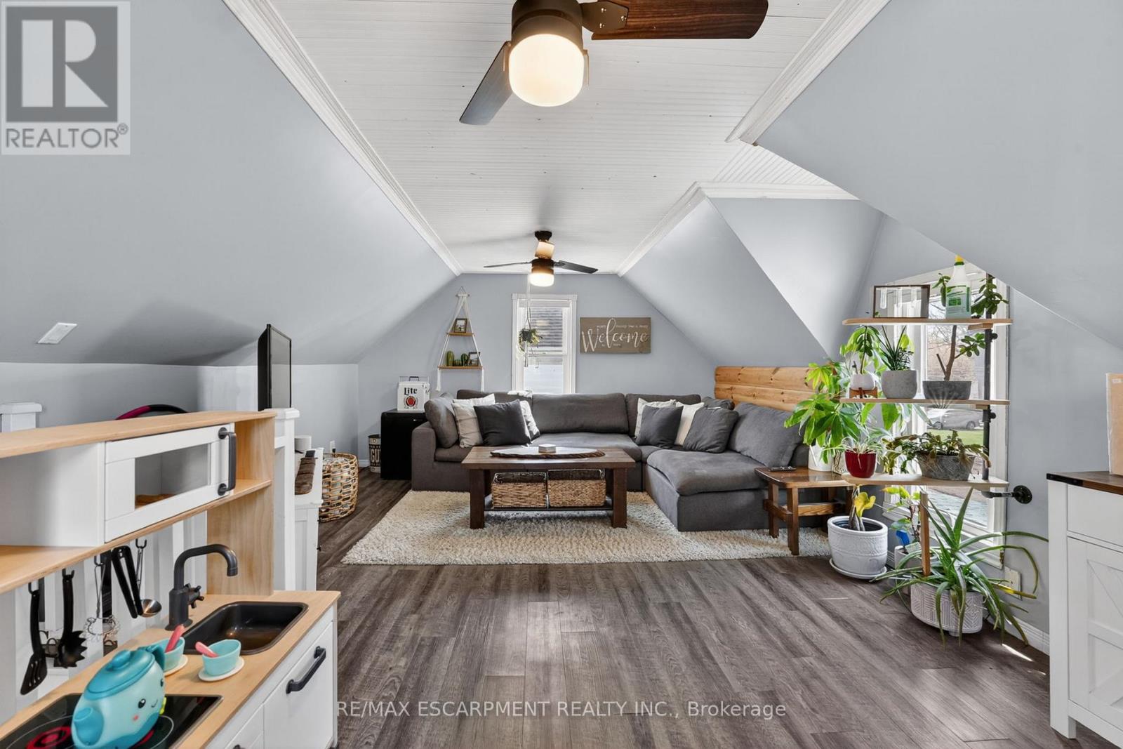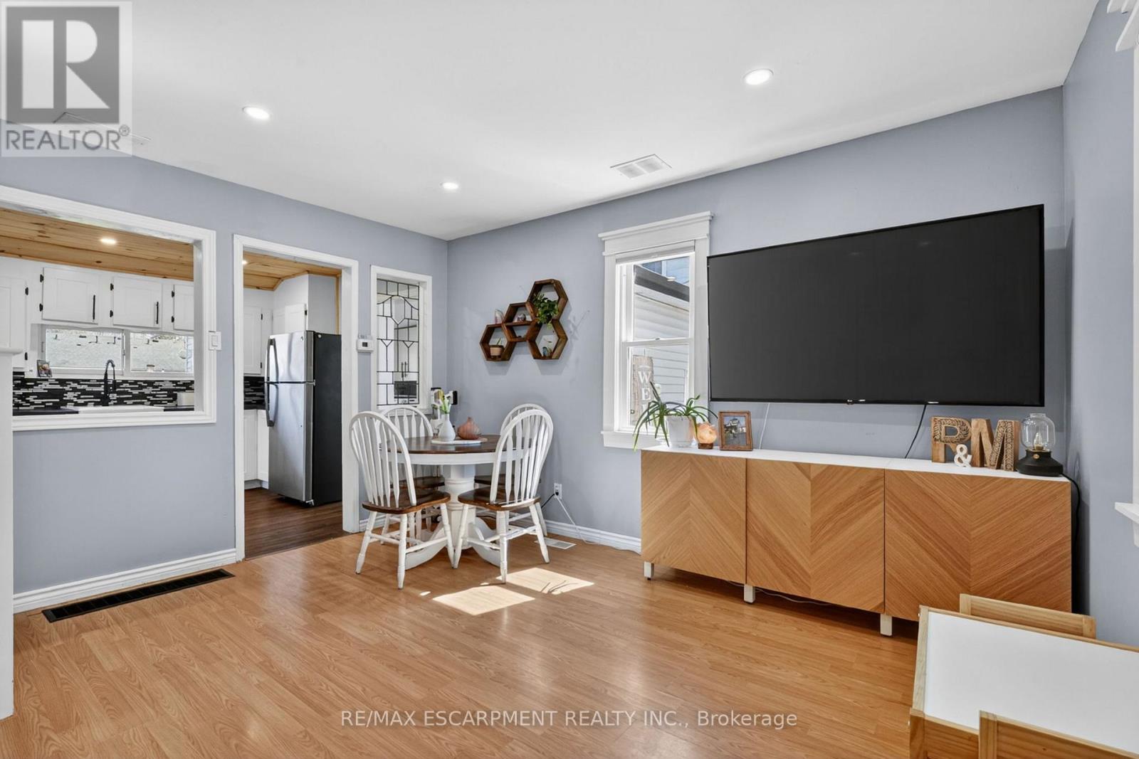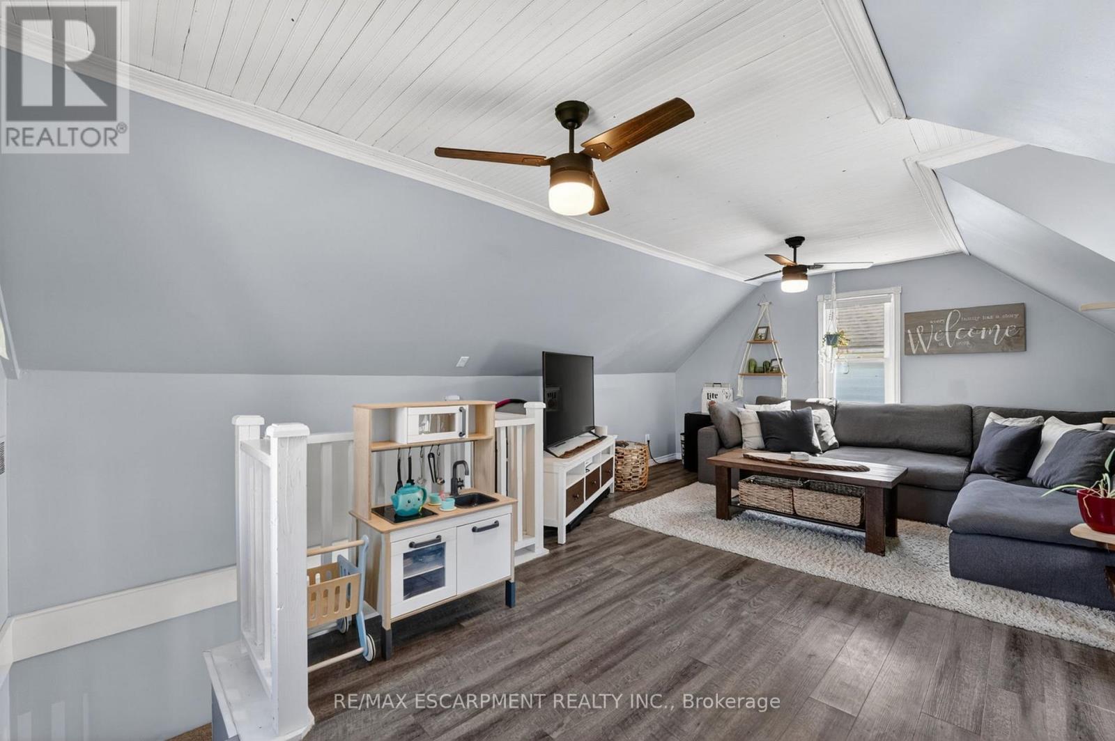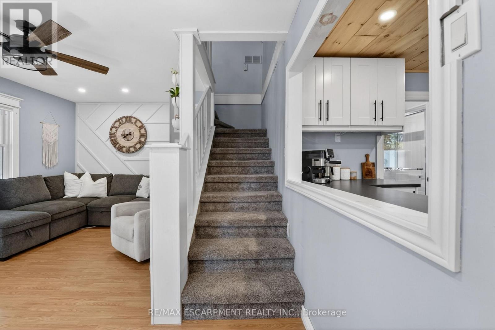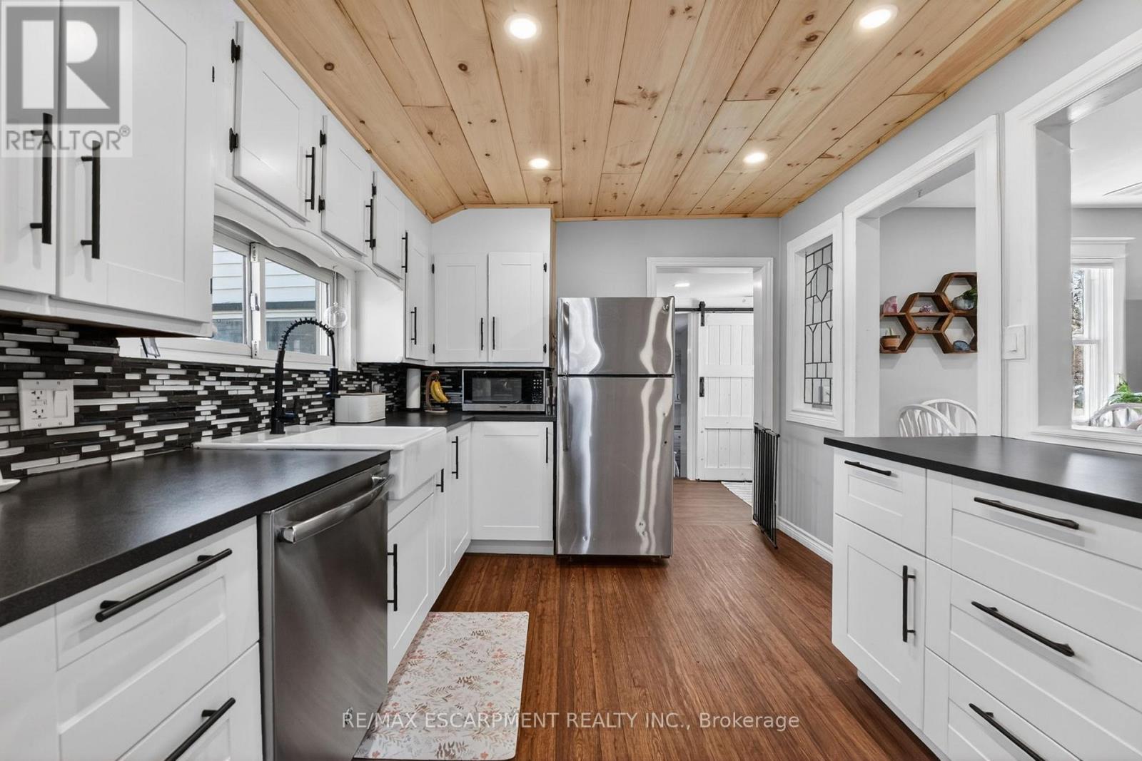 Beautifully updated and exceptionally cared for, this charming storybook home sits on a generous 55' x 165' lot in a prime walk-to-downtown Dunnville location. With a bright, open-concept layout, the main floor features an upgraded white kitchen complete with a farmhouse sink, glass-tile backsplash, stainless steel appliances, and abundant cabinetry. Updated pot lighting, upgraded flooring, and thoughtful built-ins add warmth and character throughout. The main level offers two comfortable bedrooms and a newly renovated, elegant 3-piece bathroom with a glass shower. Convenient main-floor laundry enhances everyday ease. Upstairs, a spacious den provides the perfect opportunity for a dreamy primary suite, home office, or hobby room. Recent windows and exterior doors, a 2019 paved double-wide driveway plus bonus side driveway, and a newly fully fenced backyard all contribute to the home's impressive functionality. Out back, a new concrete patio paired with beautiful outdoor lighting creates an inviting setting for evening dinners, quiet relaxation, or entertaining friends. A large yard and storage shed complete this private outdoor retreat. The welcoming front porch is another standout-ideal for morning coffee or unwinding at the end of the day. Located near the Grand River, where locals enjoy boating, fishing, and winter ice activities, this home blends small-town charm with everyday convenience. Grocery stores, hardware shops, farm stands, and essential amenities are all close by, offering a true country-living feel with walkable access to town. (id:43681)
