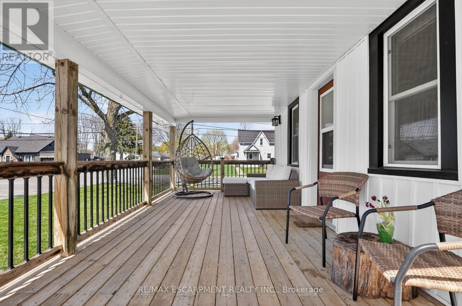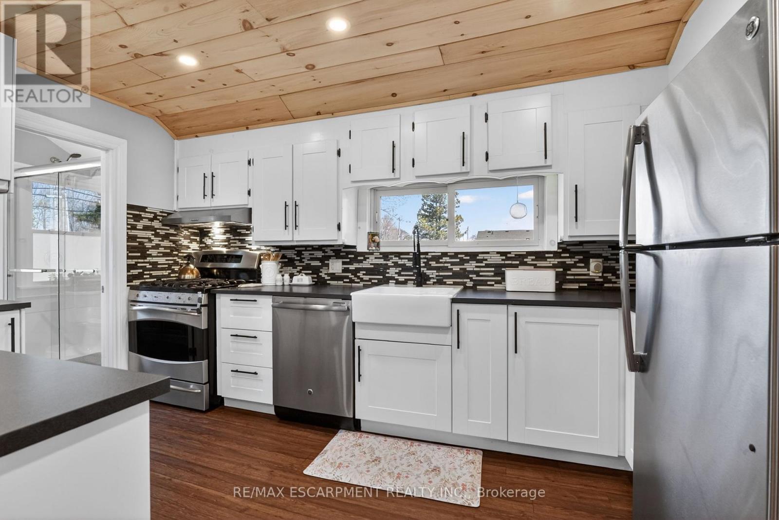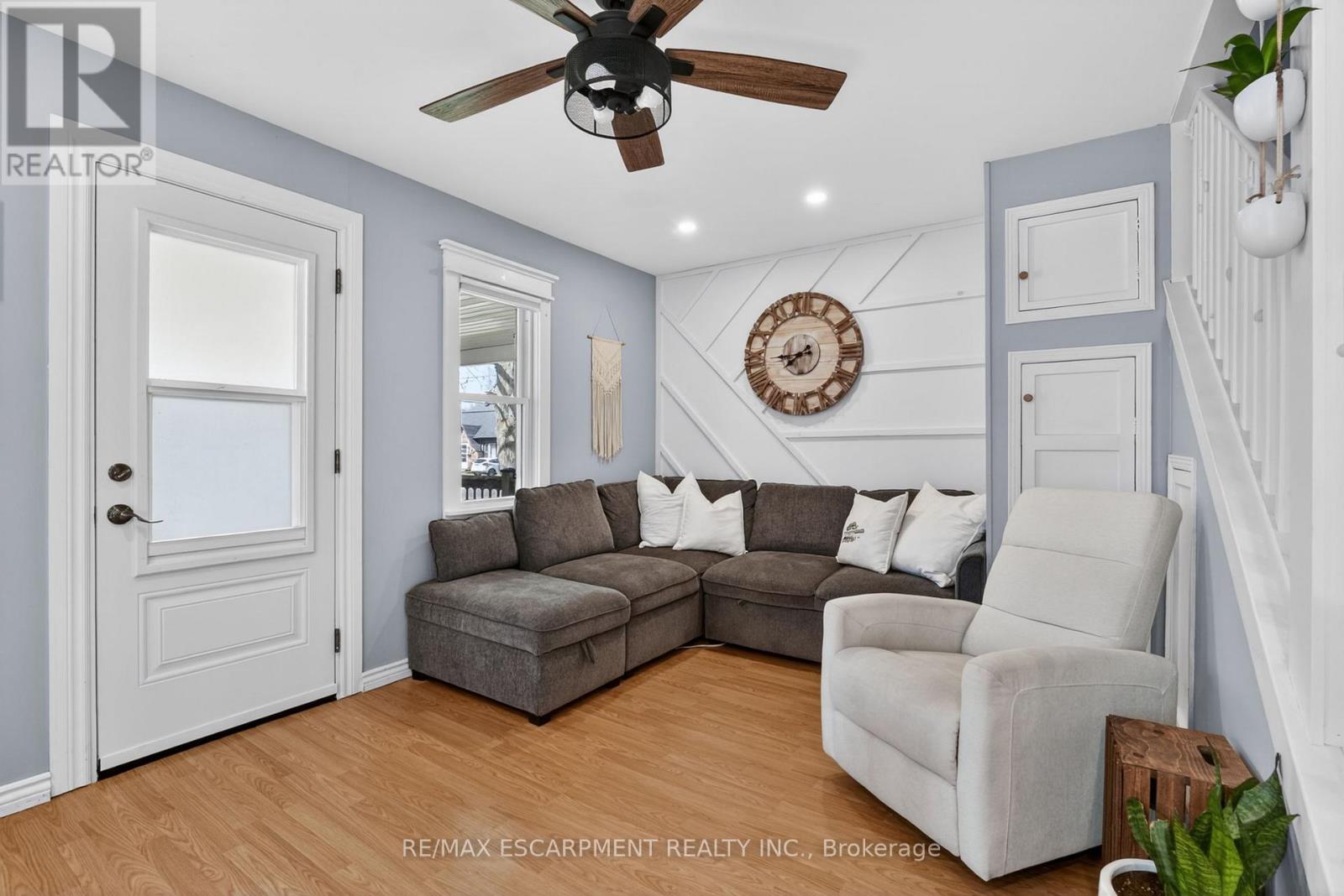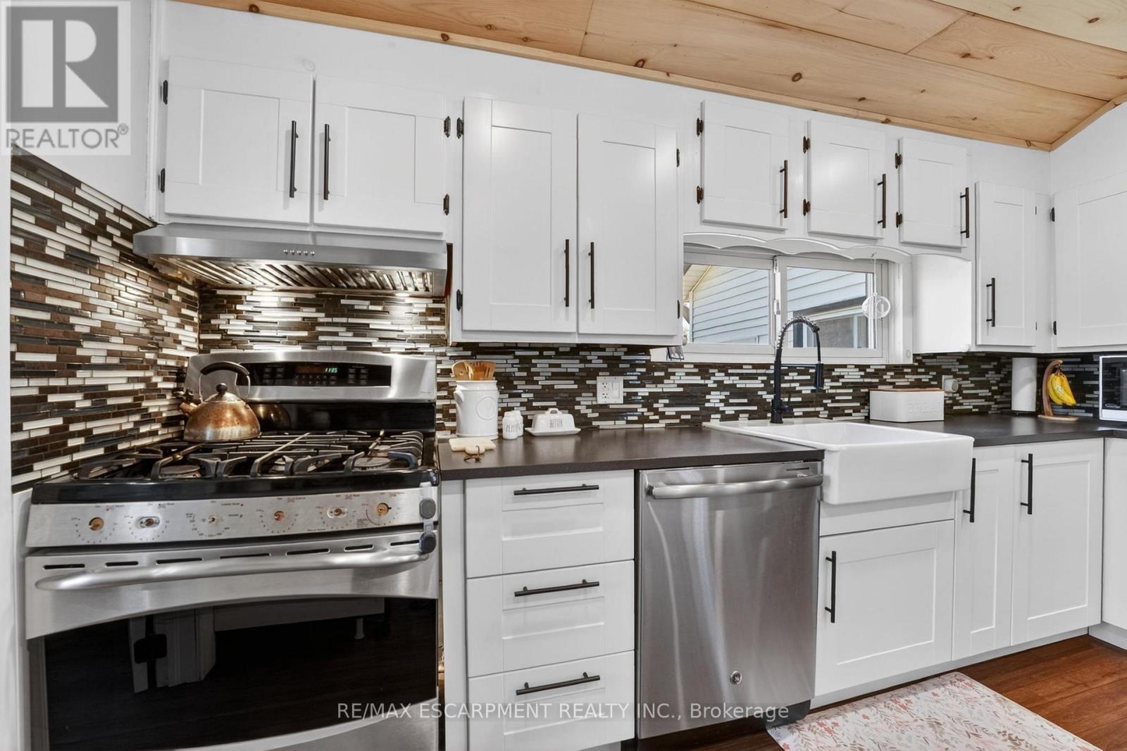 Beautifully updated and exceptionally cared for, this charming storybook home sits on a generous 55' x 165' lot in a prime walk-to-downtown Dunnville location. With a bright, open-concept layout, the main floor features an upgraded white kitchen complete with a farmhouse sink, glass-tile backsplash, stainless steel appliances, and abundant cabinetry. Updated pot lighting, upgraded flooring, and thoughtful built-ins add warmth and character throughout. The main level offers two comfortable bedrooms and a newly renovated, elegant 3-piece bathroom with a glass shower. Convenient main-floor laundry enhances everyday ease. Upstairs, a spacious den provides the perfect opportunity for a dreamy primary suite, home office, or hobby room. Recent windows and exterior doors, a 2019 paved double-wide driveway plus bonus side driveway, and a newly fully fenced backyard all contribute to the home's impressive functionality. Out back, a new concrete patio paired with beautiful outdoor lighting creates an inviting setting for evening dinners, quiet relaxation, or entertaining friends. A large yard and storage shed complete this private outdoor retreat. The welcoming front porch is another standout-ideal for morning coffee or unwinding at the end of the day. Located near the Grand River, where locals enjoy boating, fishing, and winter ice activities, this home blends small-town charm with everyday convenience. Grocery stores, hardware shops, farm stands, and essential amenities are all close by, offering a true country-living feel with walkable access to town. (id:43681)