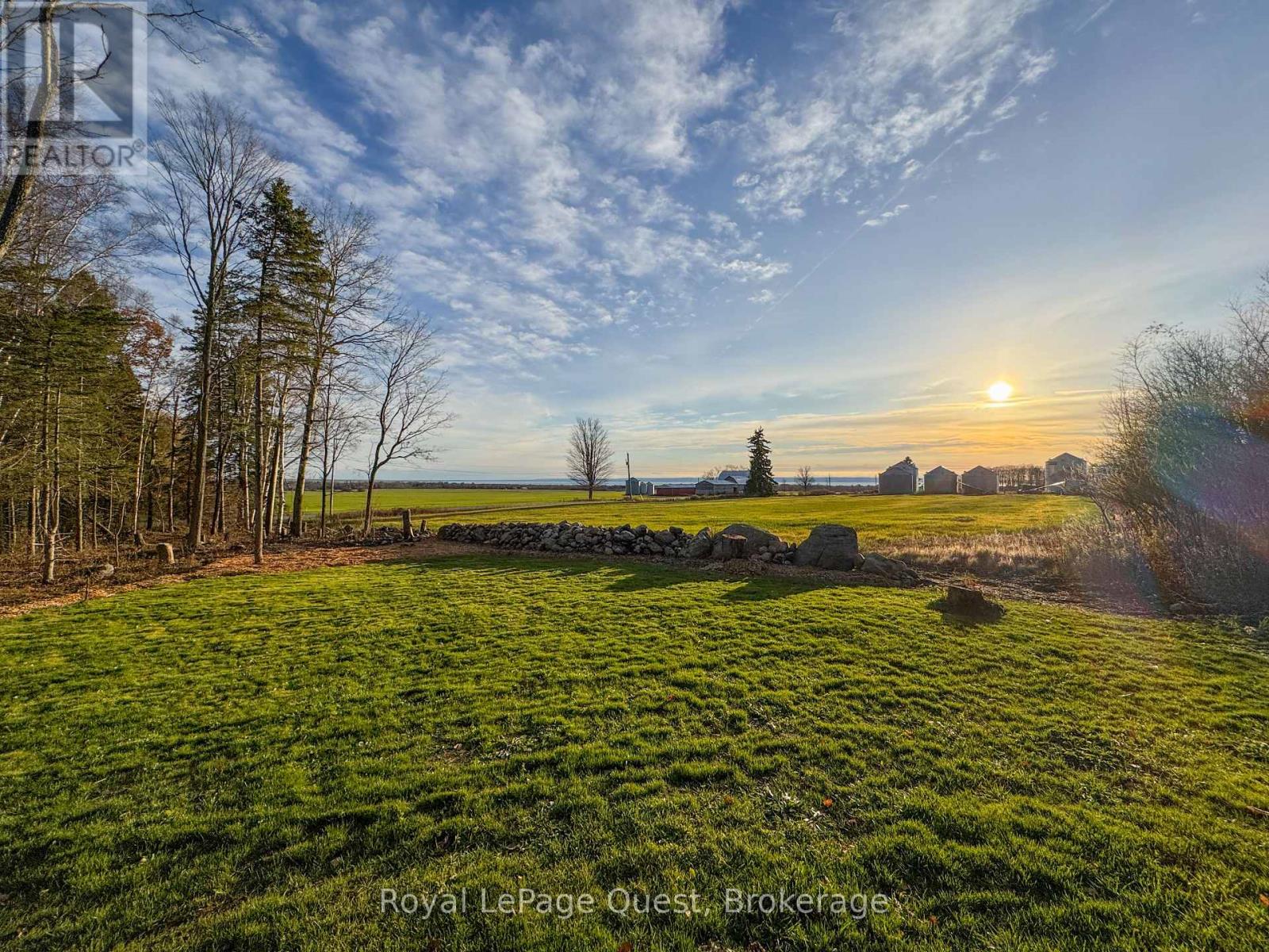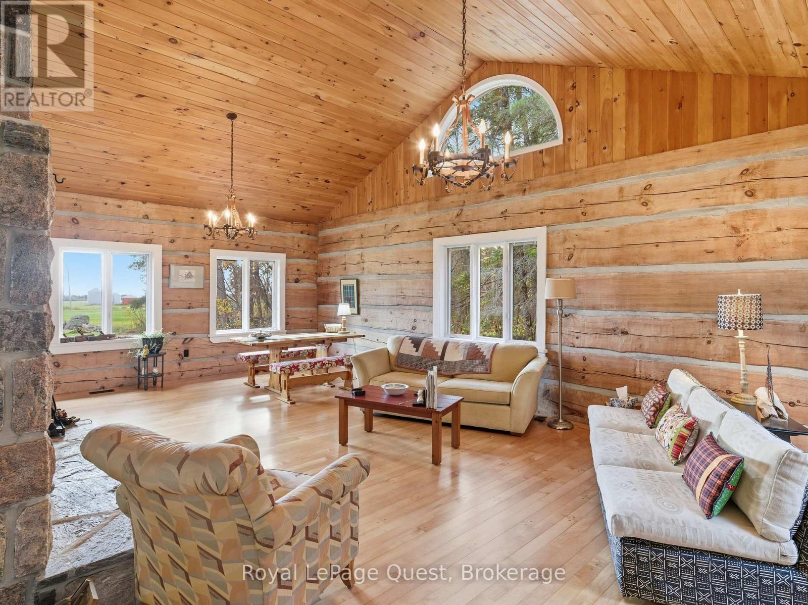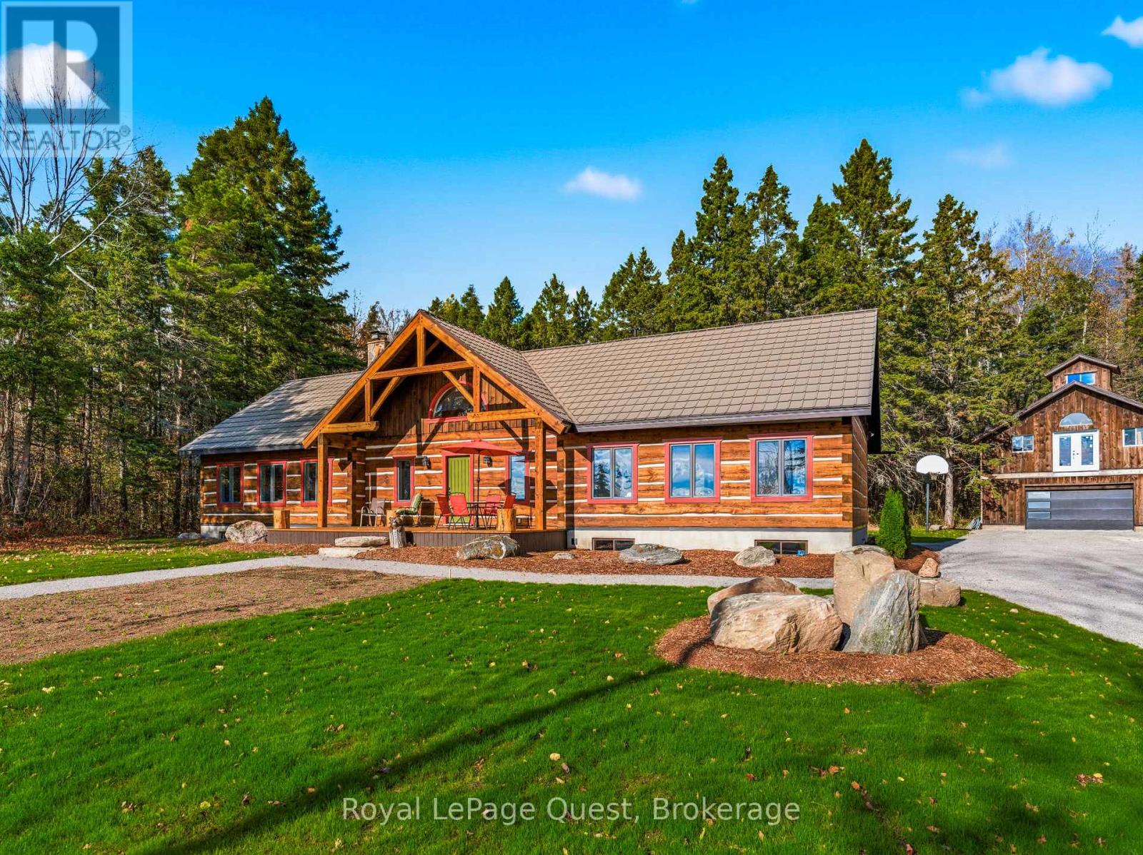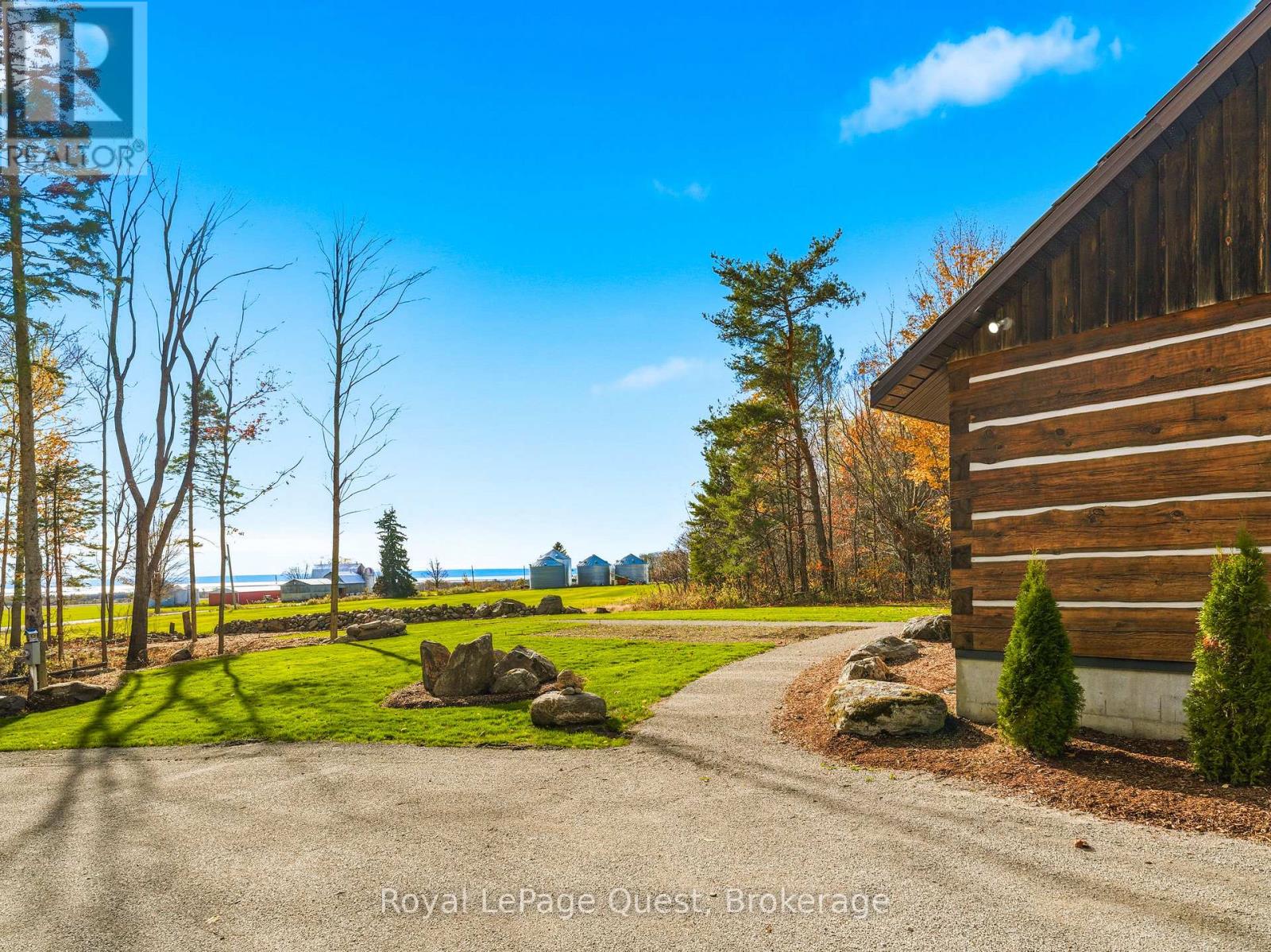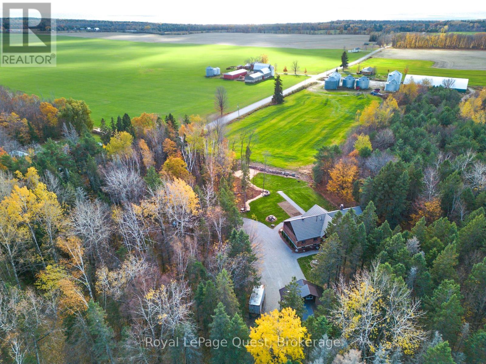 Set on 50.6 acres of complete privacy, this custom log home captures some of the most captivating views in the region-stretching across Georgian Bay, rolling farmland, and all the way to Blue Mountain, visible from the living room, primary suite, and covered porch. Inside, a warm and inviting interior with soaring cathedral ceilings and a striking stone fireplace creates a true sense of retreat, perfectly framed by expansive windows that bring the landscape in. The thoughtful layout offers flexibility, including a primary suite with a large walk-in closet (originally a bedroom and easily converted back if desired).The approach is just as impressive as the home itself-set well back from the road for ultimate seclusion, with a wrap-around driveway and a fully finished detached garage/shop ideal for hobbies, storage, or workspace.Recent upgrades enhance both form and function: the exterior has been professionally refinished, including new chinking by a skilled log home specialist, and the landscaping has been refreshed to open up and maximize the already stunning views.Location balances tranquility with convenience-just 10 minutes to major shopping and only 3 minutes to the sandy beach at the end of Concession 14 W.A truly special feature reveals itself in the winter months: as the leaves fall and the air clears, the view across the bay opens completely, and in the distance, the Blue Mountain ski hills glow at night-lit up like the world's largest Christmas tree.The treed acreage also benefits from the Ontario Managed Forest Tax Incentive Program, offering long-term value for nature lovers and investors alike.A rare offering where privacy, landscape, and lifestyle come together-this is more than a home, it's an experience. (id:43681)
