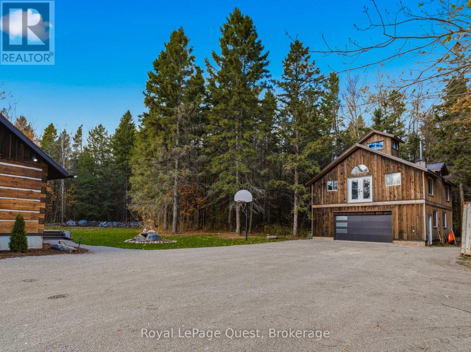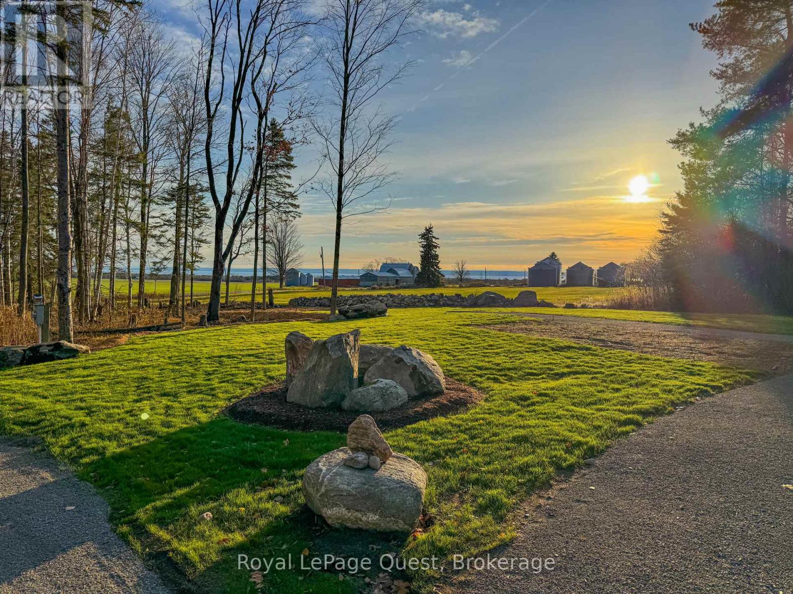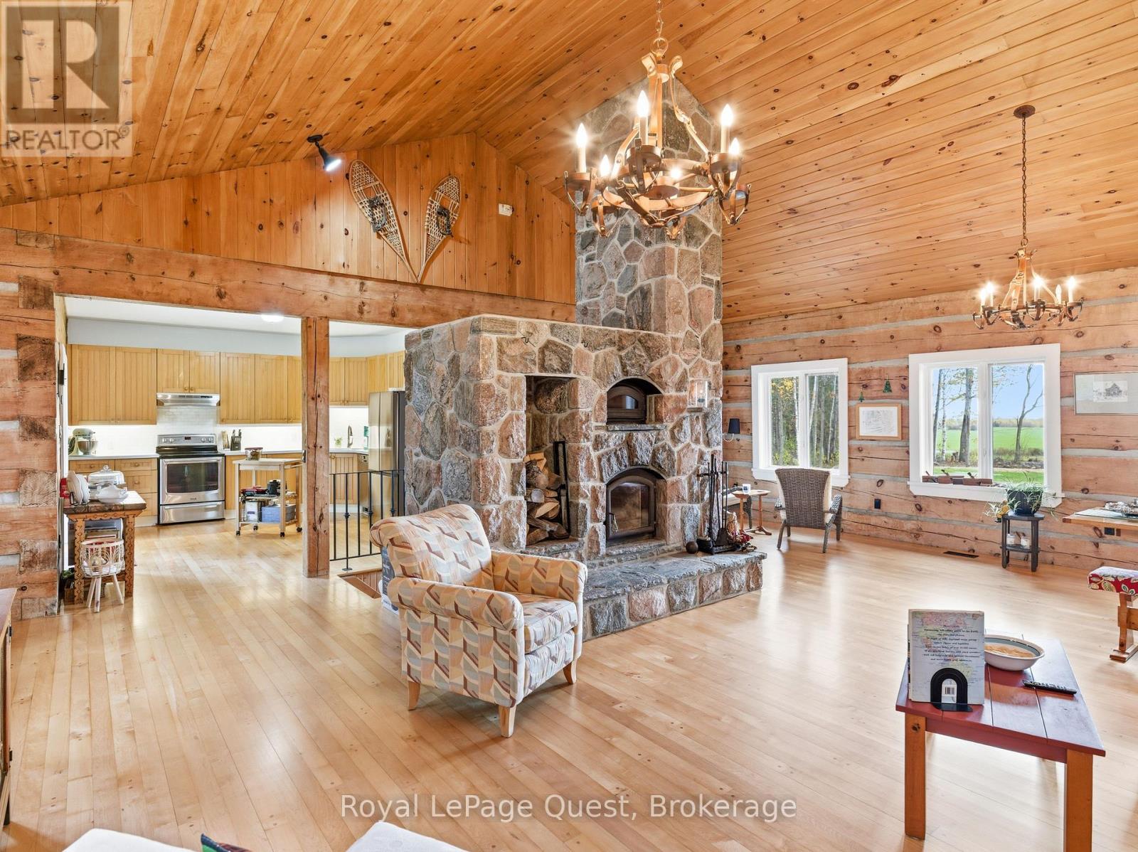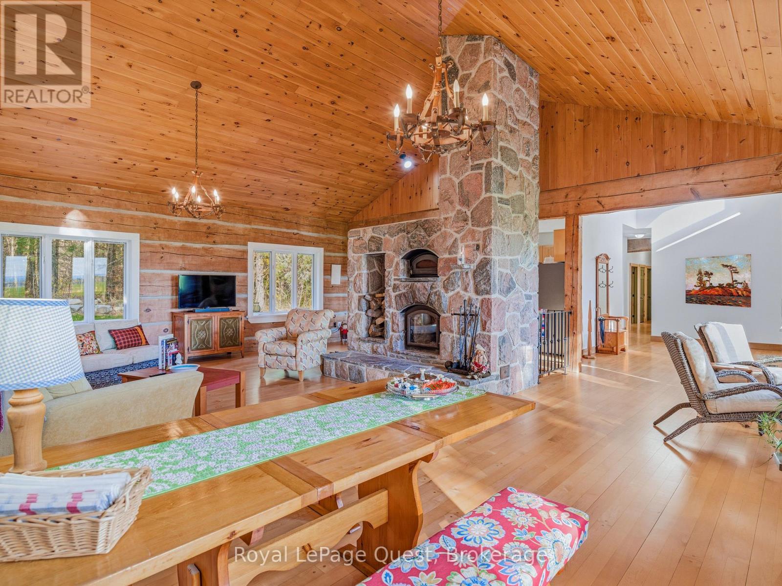 Set on 50.6 acres of complete privacy, this custom log home captures some of the most captivating views in the region-stretching across Georgian Bay, rolling farmland, and all the way to Blue Mountain, visible from the living room, primary suite, and covered porch. Inside, a warm and inviting interior with soaring cathedral ceilings and a striking stone fireplace creates a true sense of retreat, perfectly framed by expansive windows that bring the landscape in. The thoughtful layout offers flexibility, including a primary suite with a large walk-in closet (originally a bedroom and easily converted back if desired).The approach is just as impressive as the home itself-set well back from the road for ultimate seclusion, with a wrap-around driveway and a fully finished detached garage/shop ideal for hobbies, storage, or workspace.Recent upgrades enhance both form and function: the exterior has been professionally refinished, including new chinking by a skilled log home specialist, and the landscaping has been refreshed to open up and maximize the already stunning views.Location balances tranquility with convenience-just 10 minutes to major shopping and only 3 minutes to the sandy beach at the end of Concession 14 W.A truly special feature reveals itself in the winter months: as the leaves fall and the air clears, the view across the bay opens completely, and in the distance, the Blue Mountain ski hills glow at night-lit up like the world's largest Christmas tree.The treed acreage also benefits from the Ontario Managed Forest Tax Incentive Program, offering long-term value for nature lovers and investors alike.A rare offering where privacy, landscape, and lifestyle come together-this is more than a home, it's an experience. (id:43681)