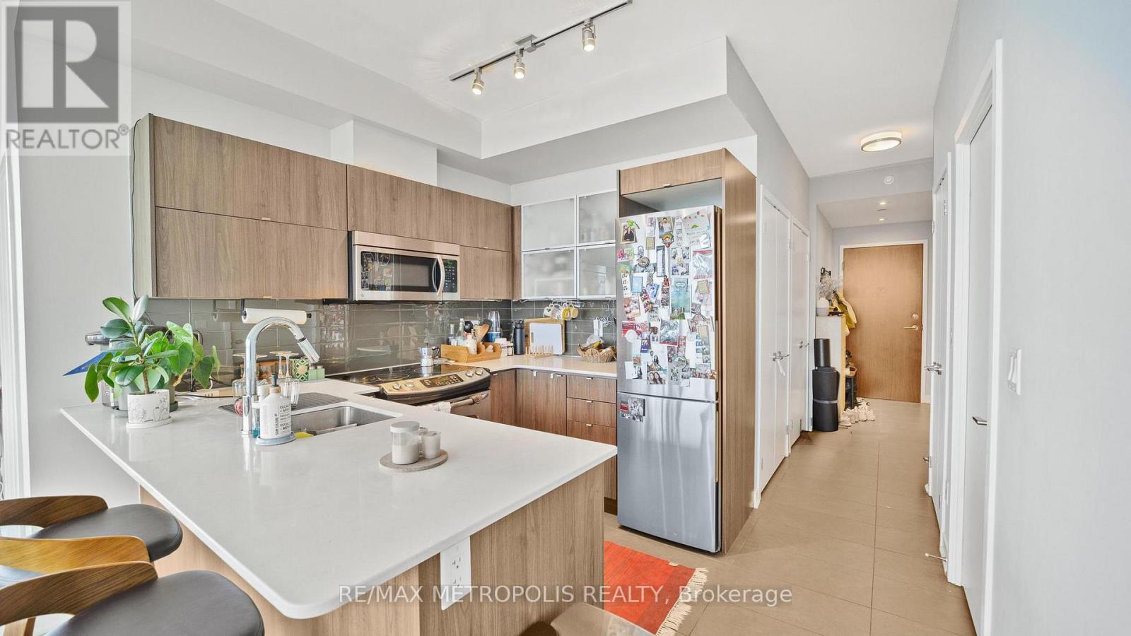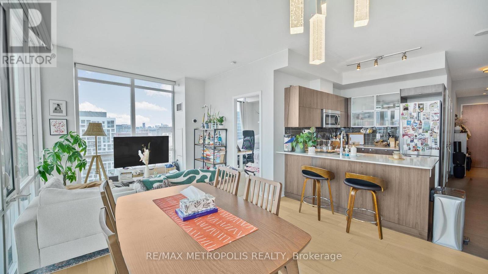 Step into refined waterfront living in this sun-drenched northwest-facing corner residence, featuring a rare full-width private terrace. Thoughtfully designed, this 2-bedroom split layout offers the perfect balance of privacy and sophistication, with an airy open-concept living space framed by floor-to-ceiling windows.The sleek, modern kitchen is equipped with a breakfast bar and exceptional storage, and 2 pantries! Spa-inspired bathrooms elevate everyday living with a glass-enclosed walk-in shower and deep soaker tub, while smart home features, including Google Nest thermostats and upgraded designer lighting, add comfort and convenience. Brand new washer & dryer complete this fully upgraded, turnkey suite. Parking included. Located right next to Toronto Public Library and just steps to the Waterfront, Martin Goodman Trail, King West's top restaurants and boutiques, premier schools, and community amenities, with seamless access to the DVP. A rare corner offering that blends lifestyle, luxury, and location-this is one you don't want to miss. (id:43681)