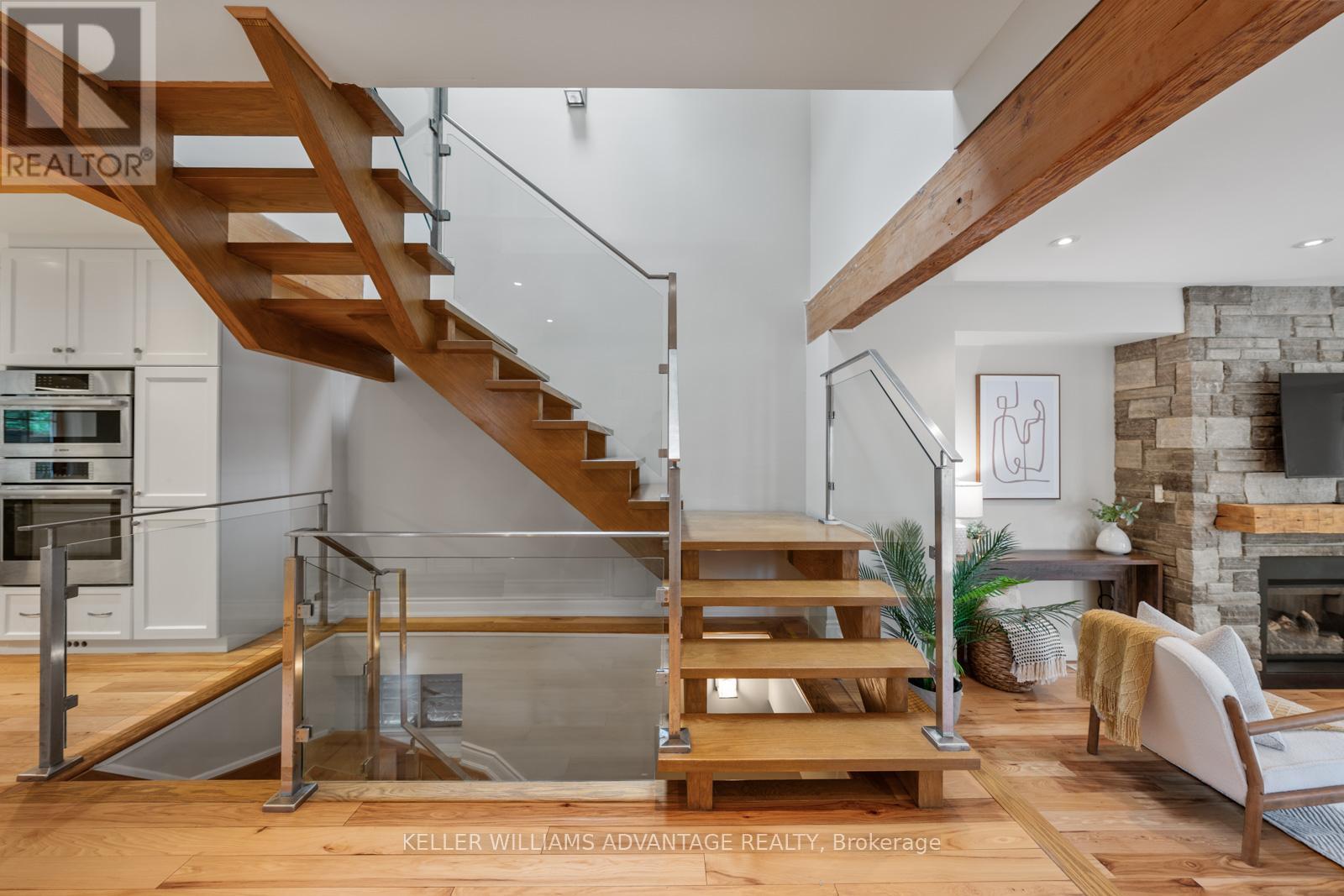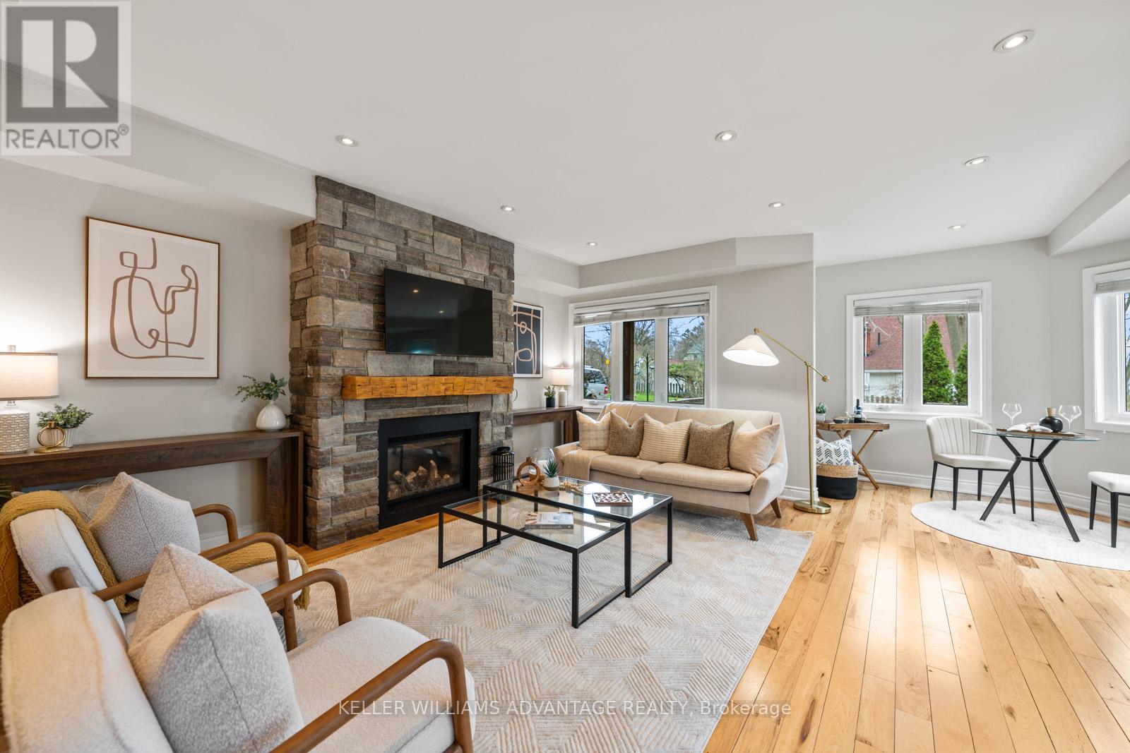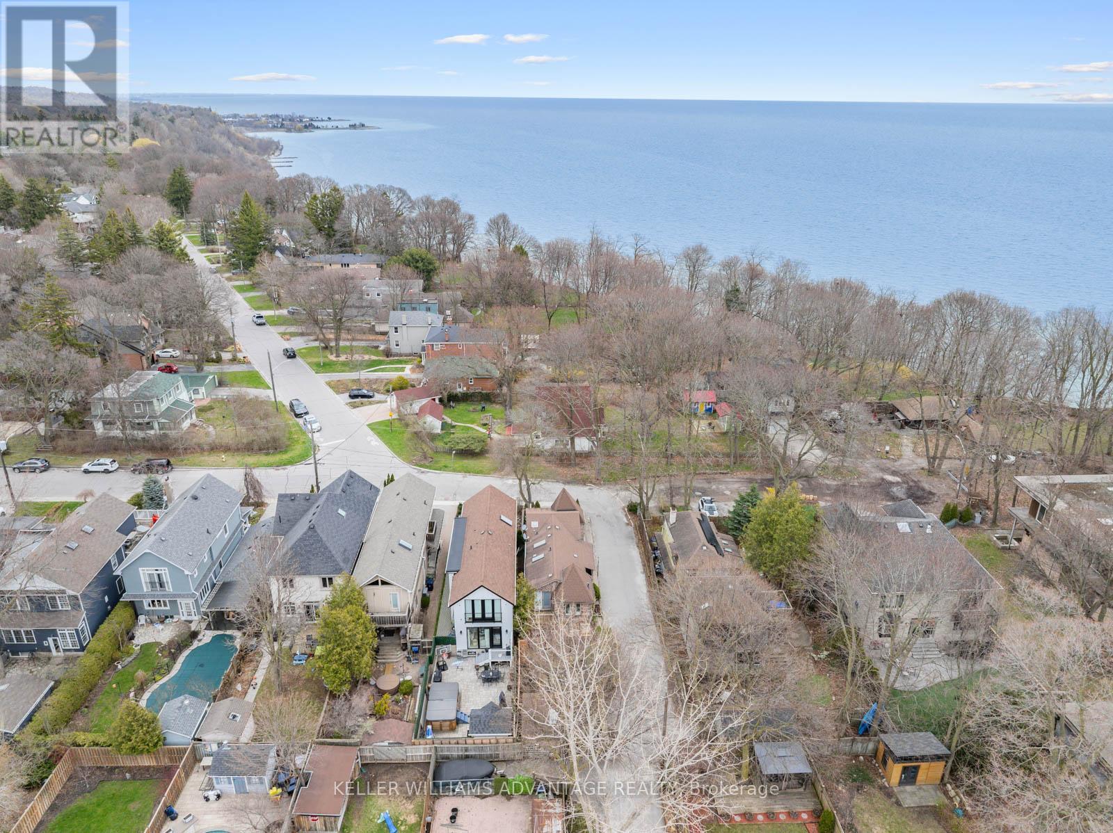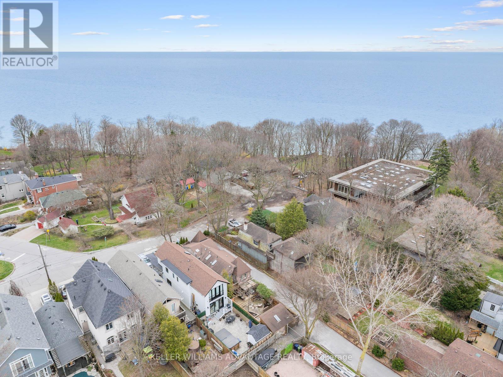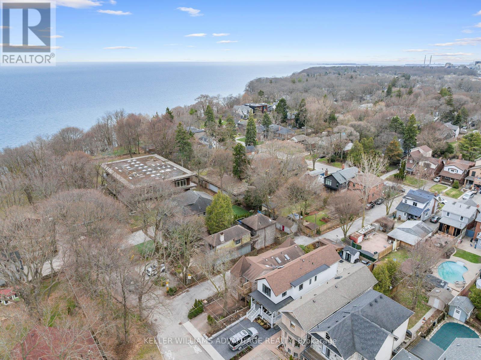 Your castle by the lake awaits. Tucked into a serene setting, this one-of-a-kind 3+1 bed, 4 bath home showcases stunning architectural details, including exposed wood beams, a charming turret and a striking stone fireplace.Beautifully curated living spaces that feel both warm and elevated. At the heart of the home is the designer kitchen crafted for both everyday living and entertaining. The walkout to your own garden escape, surrounded by lush greenery is designed for relaxation and connection. Each area of this special home is anchored by Natural light. The second-floor atrium offers a private retreat complete with its own balcony and glimpses of the lake-perfect for quiet mornings or evening unwinds. The primary suite is the sanctuary you've dreamed of. Vaulted ceilings with a private ensuite complete with soaker tub with a view of the garden and your own private balcony allows you to step outside for a quiet morning coffee. Whether hosting or unwinding, the setting feels peaceful and private. Adding to the home's versatility is a fully self-contained in-law suite with a separate entrance-ideal for extended family, guests, or additional income potential. Complete with parking and a generous rear storage space or workshop, this home offers both function and flexibility. Located on the iconic waterfront trail and literally steps to the lake you can enjoy long scenic walks and bike rides through the Bluffs, parks and flower garden. Possible laneway suite potential. (id:43681)
