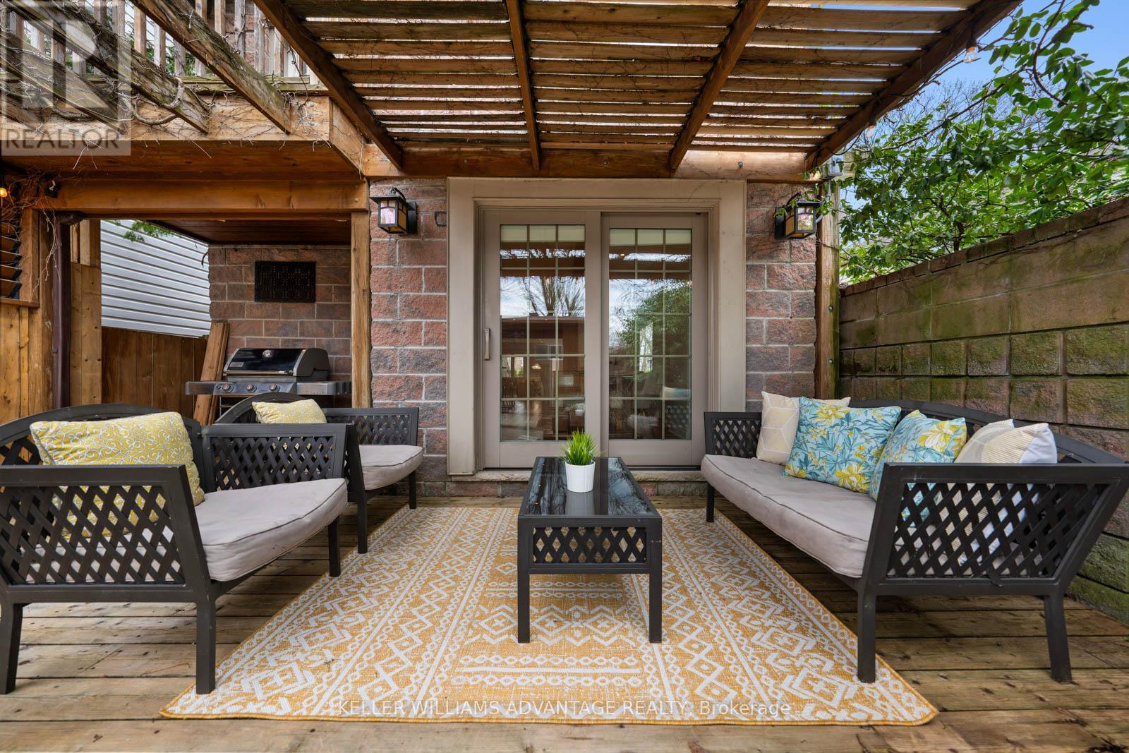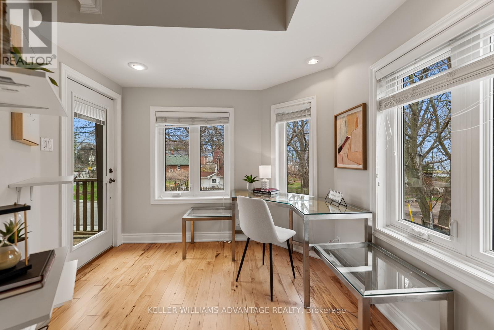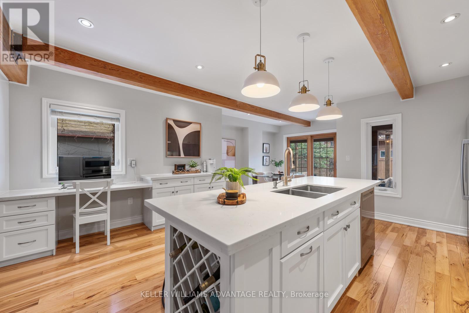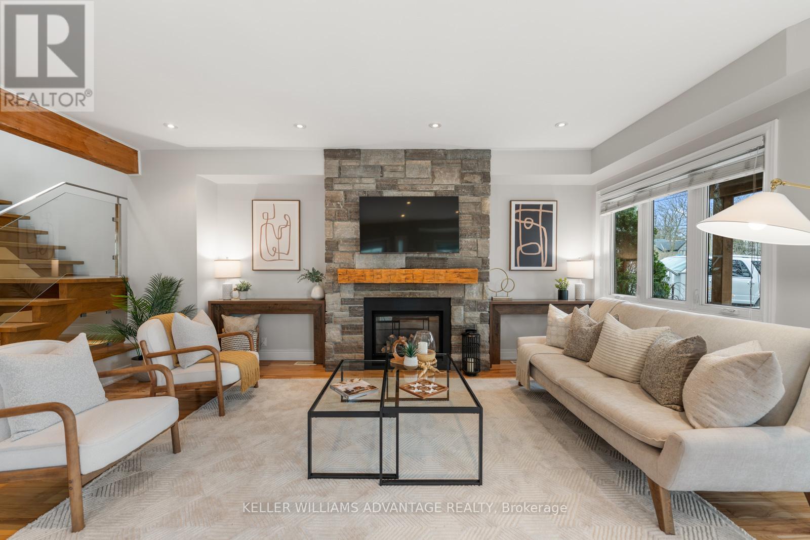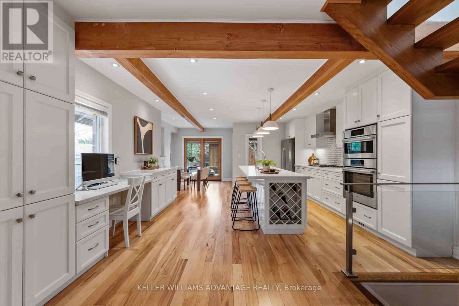 Your castle by the lake awaits. Tucked into a serene setting, this one-of-a-kind 3+1 bed, 4 bath home showcases stunning architectural details, including exposed wood beams, a charming turret and a striking stone fireplace.Beautifully curated living spaces that feel both warm and elevated. At the heart of the home is the designer kitchen crafted for both everyday living and entertaining. The walkout to your own garden escape, surrounded by lush greenery is designed for relaxation and connection. Each area of this special home is anchored by Natural light. The second-floor atrium offers a private retreat complete with its own balcony and glimpses of the lake-perfect for quiet mornings or evening unwinds. The primary suite is the sanctuary you've dreamed of. Vaulted ceilings with a private ensuite complete with soaker tub with a view of the garden and your own private balcony allows you to step outside for a quiet morning coffee. Whether hosting or unwinding, the setting feels peaceful and private. Adding to the home's versatility is a fully self-contained in-law suite with a separate entrance-ideal for extended family, guests, or additional income potential. Complete with parking and a generous rear storage space or workshop, this home offers both function and flexibility. Located on the iconic waterfront trail and literally steps to the lake you can enjoy long scenic walks and bike rides through the Bluffs, parks and flower garden. Possible laneway suite potential. (id:43681)