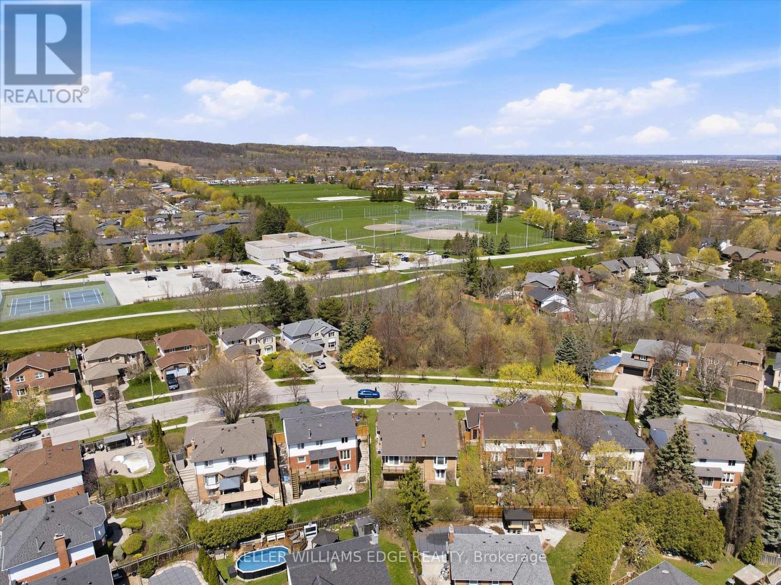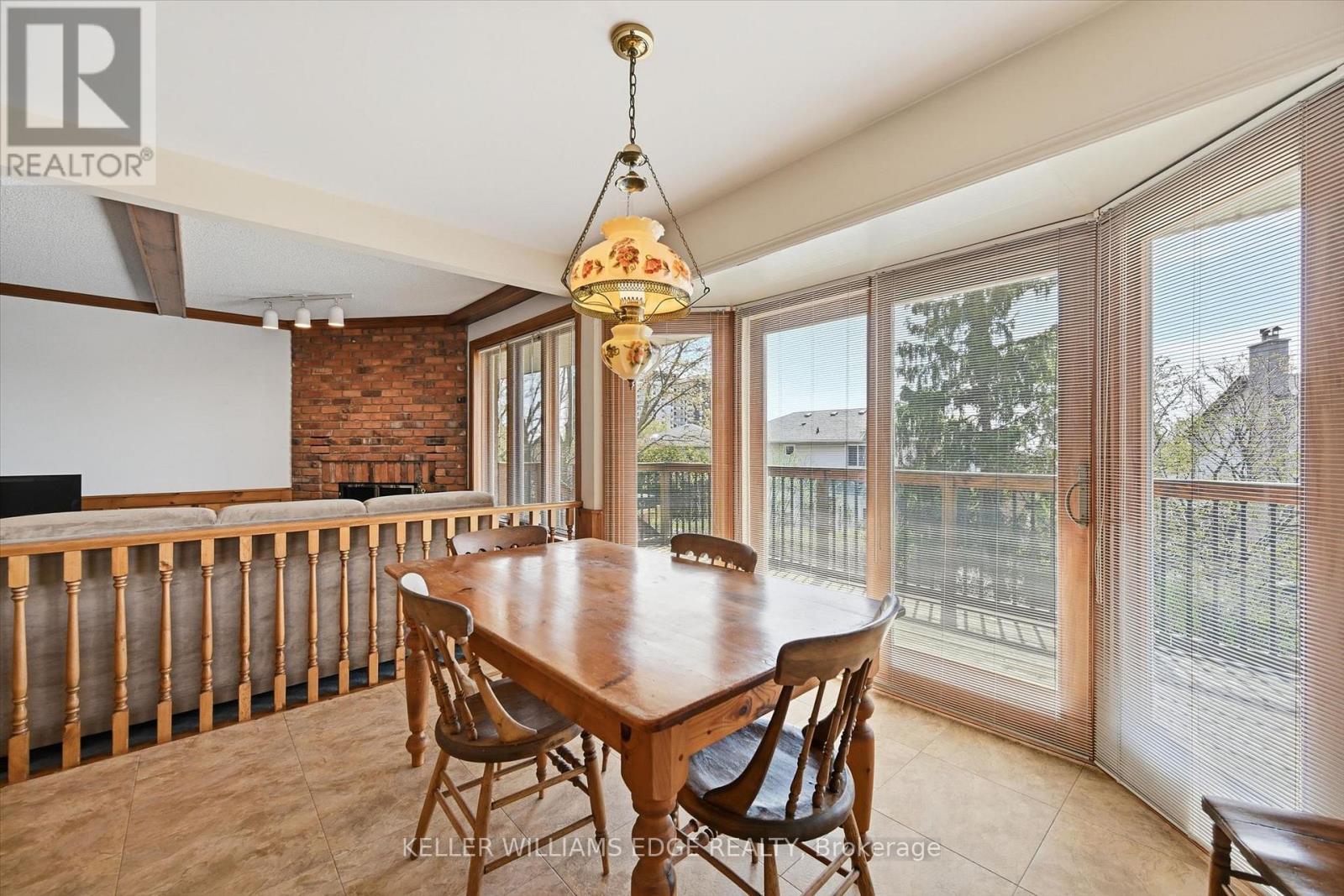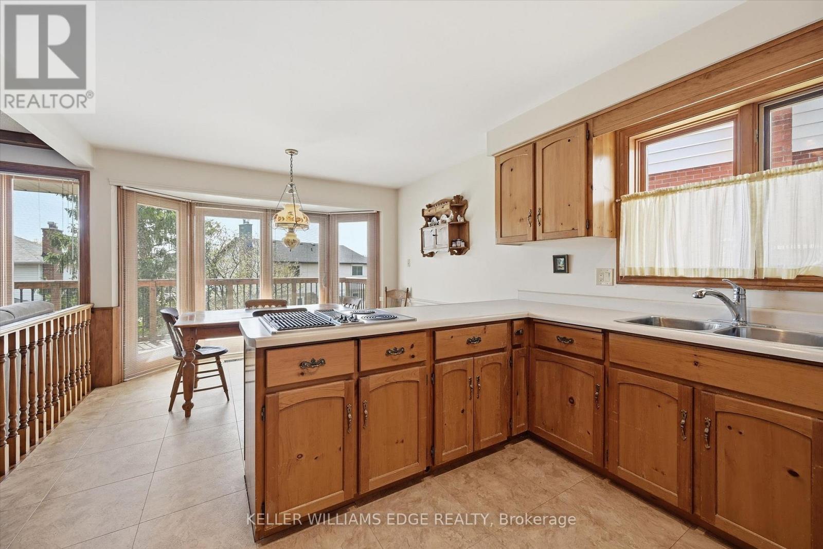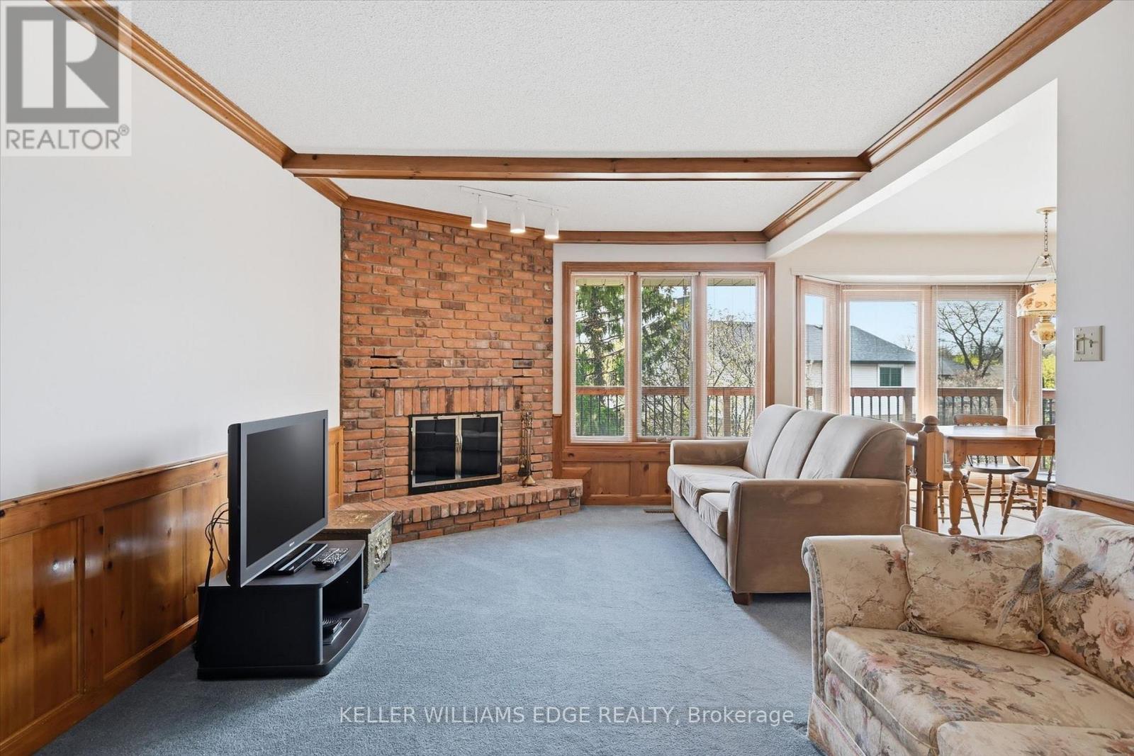 the street, and a fully finished walkout basement! Step through the welcoming front entrance, which features sidelights, into a bright foyer with a skylight and direct garage access. The heart of the home features double French doors leading to a cozy family room, highlighted by a reclaimed brick wood-burning fireplace and a beamed ceiling. This space flows into the eat-in kitchen, which has a sliding door walk-out to a balcony/deck overlooking the backyard and garden. Two main floor bedrooms and bathrooms, including a primary suite complete with a 4-piece ensuite a jetted soaker tub and separate shower. The finished walkout basement adds incredible versatility, offering a third bedroom and full bathroom, plus a large open rec room equipped with built-ins, a wet bar with seating, and a double garden door leading directly to the backyard and patio -ideal for entertaining. Additional highlights include a double-wide driveway, a two-car garage with an automatic door opener, interior entry, and a side door, along with central vacuum, main floor laundry, bay windows, and wainscoting. Major updates providing peace of mind include: roof (2024), furnace & A/C (2019), doors and windows (approx. 4+ years), and an owned hot water tank (2019). Enjoy an unbeatable location: walk to Brant Hills Community Centre, parks, schools, and bike paths, with easy access to everyday amenities and a nearby golf course. A fantastic home that combines space, functionality, and a standout walkout lower level...perfect for growing families or multi-generational living. (id:43681)