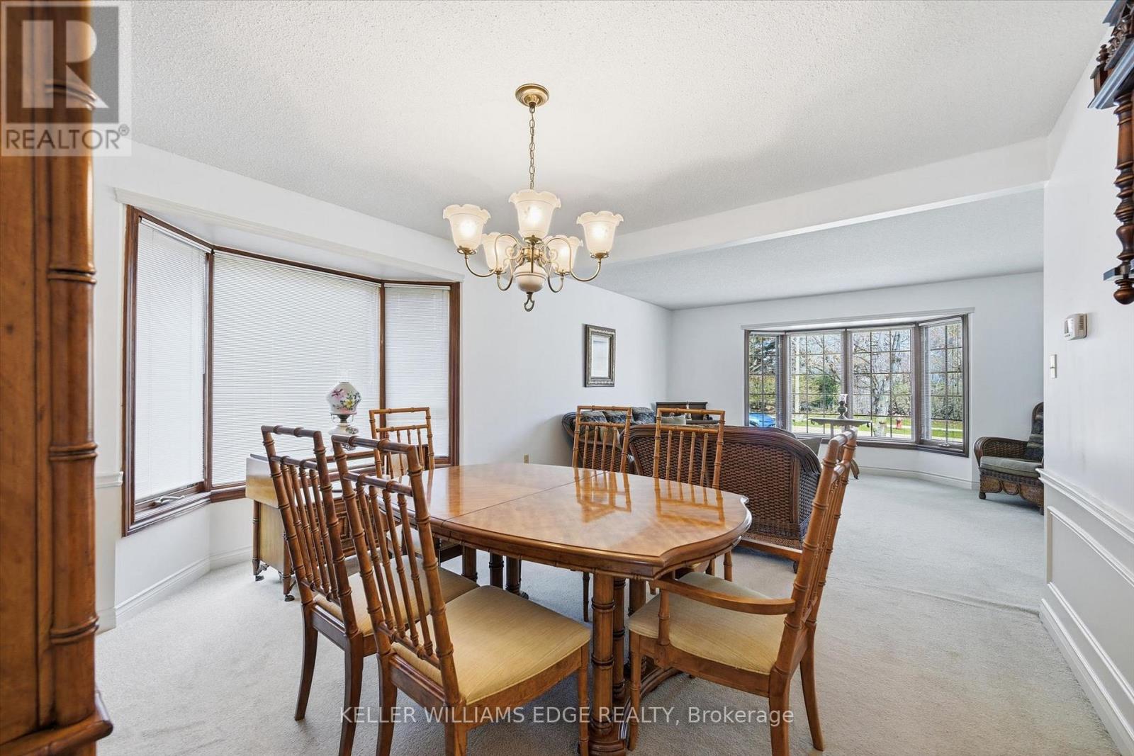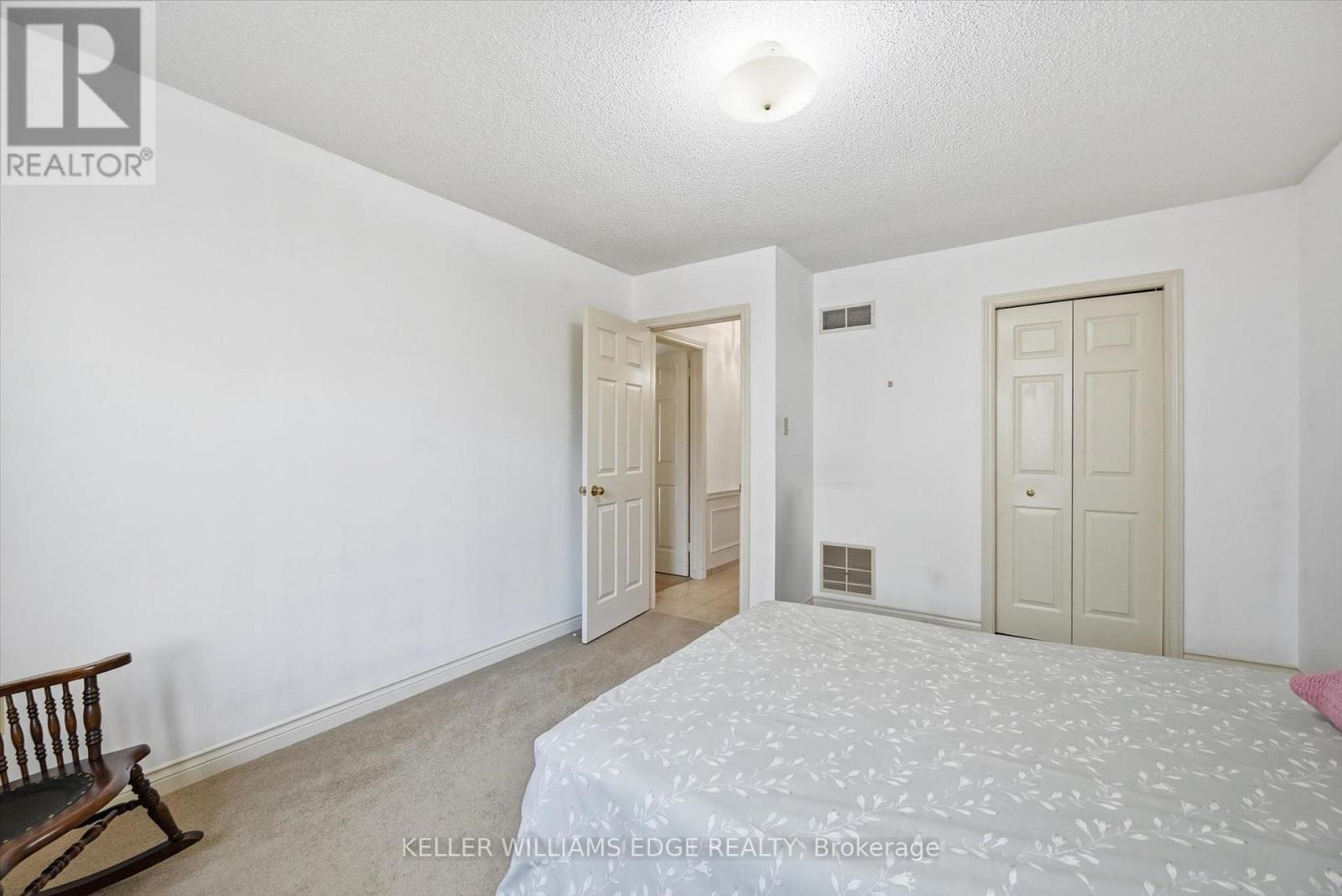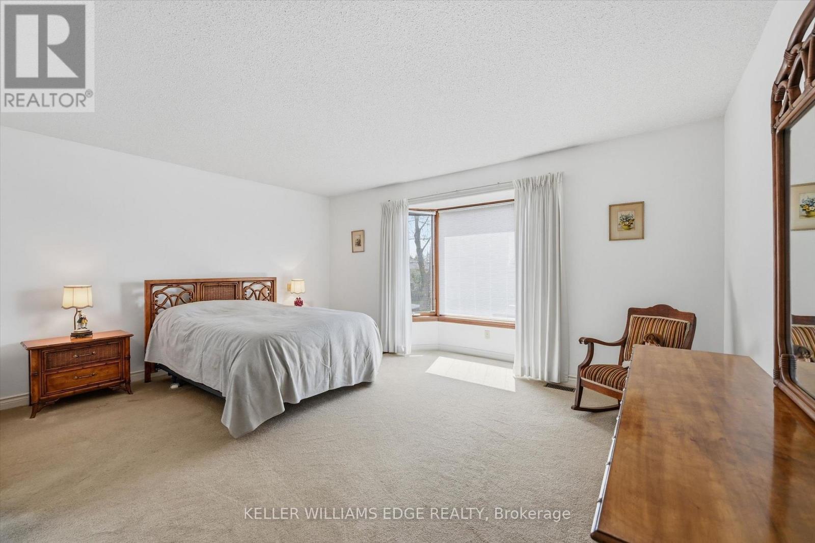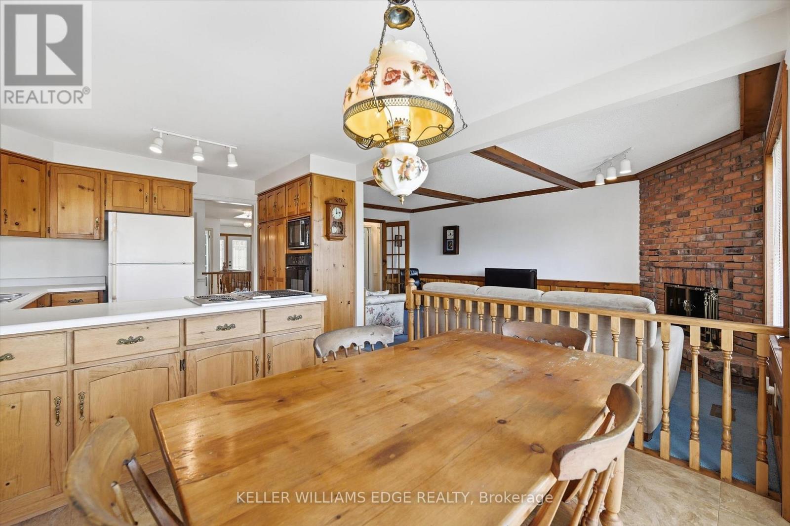 the street, and a fully finished walkout basement! Step through the welcoming front entrance, which features sidelights, into a bright foyer with a skylight and direct garage access. The heart of the home features double French doors leading to a cozy family room, highlighted by a reclaimed brick wood-burning fireplace and a beamed ceiling. This space flows into the eat-in kitchen, which has a sliding door walk-out to a balcony/deck overlooking the backyard and garden. Two main floor bedrooms and bathrooms, including a primary suite complete with a 4-piece ensuite a jetted soaker tub and separate shower. The finished walkout basement adds incredible versatility, offering a third bedroom and full bathroom, plus a large open rec room equipped with built-ins, a wet bar with seating, and a double garden door leading directly to the backyard and patio -ideal for entertaining. Additional highlights include a double-wide driveway, a two-car garage with an automatic door opener, interior entry, and a side door, along with central vacuum, main floor laundry, bay windows, and wainscoting. Major updates providing peace of mind include: roof (2024), furnace & A/C (2019), doors and windows (approx. 4+ years), and an owned hot water tank (2019). Enjoy an unbeatable location: walk to Brant Hills Community Centre, parks, schools, and bike paths, with easy access to everyday amenities and a nearby golf course. A fantastic home that combines space, functionality, and a standout walkout lower level...perfect for growing families or multi-generational living. (id:43681)