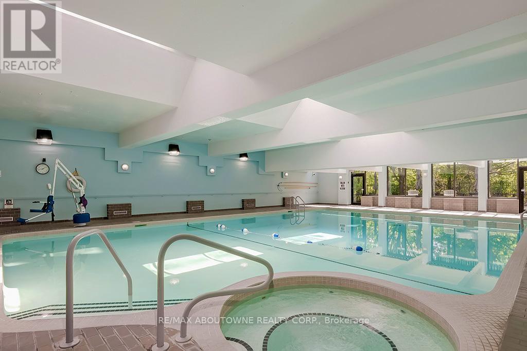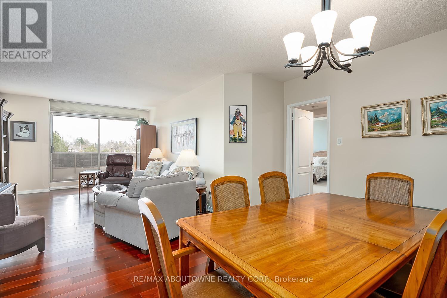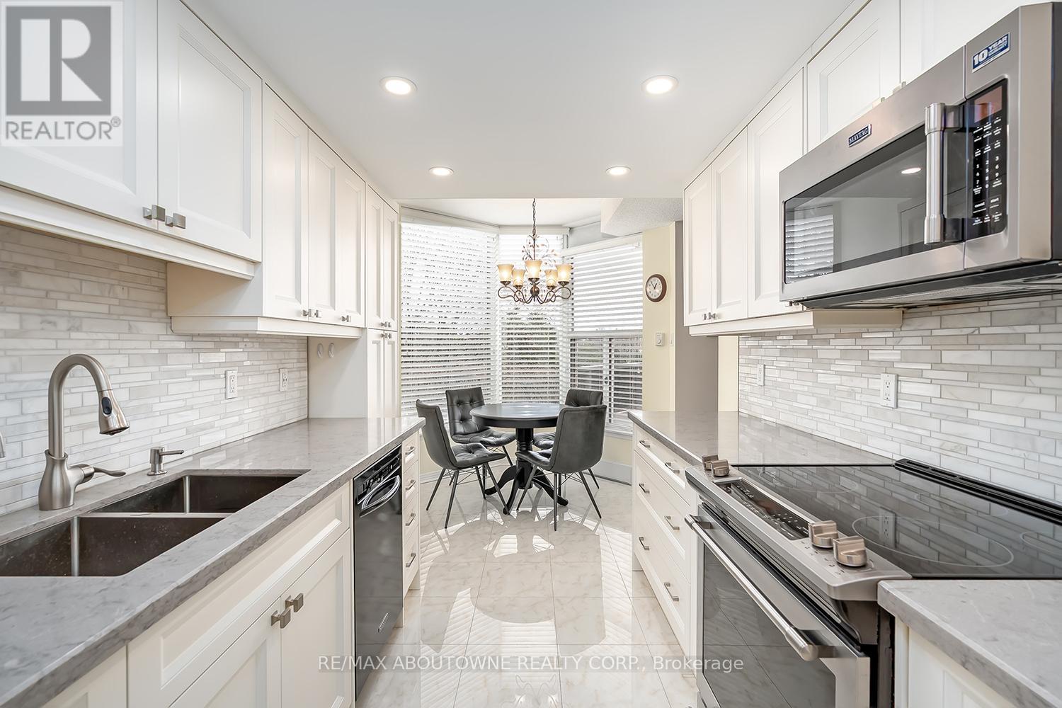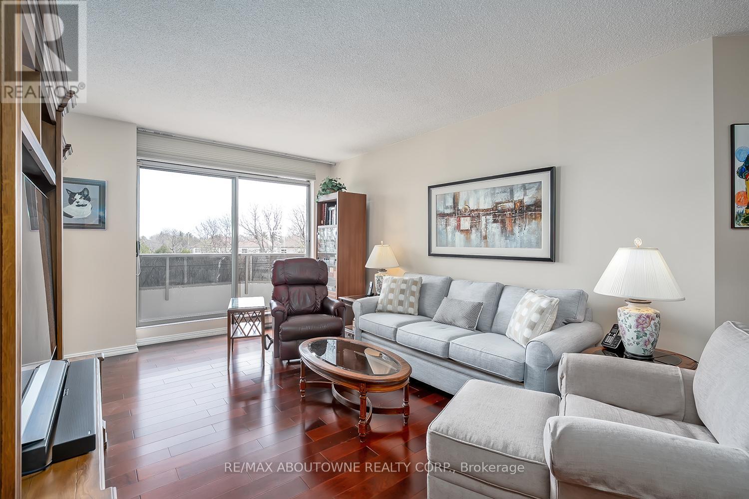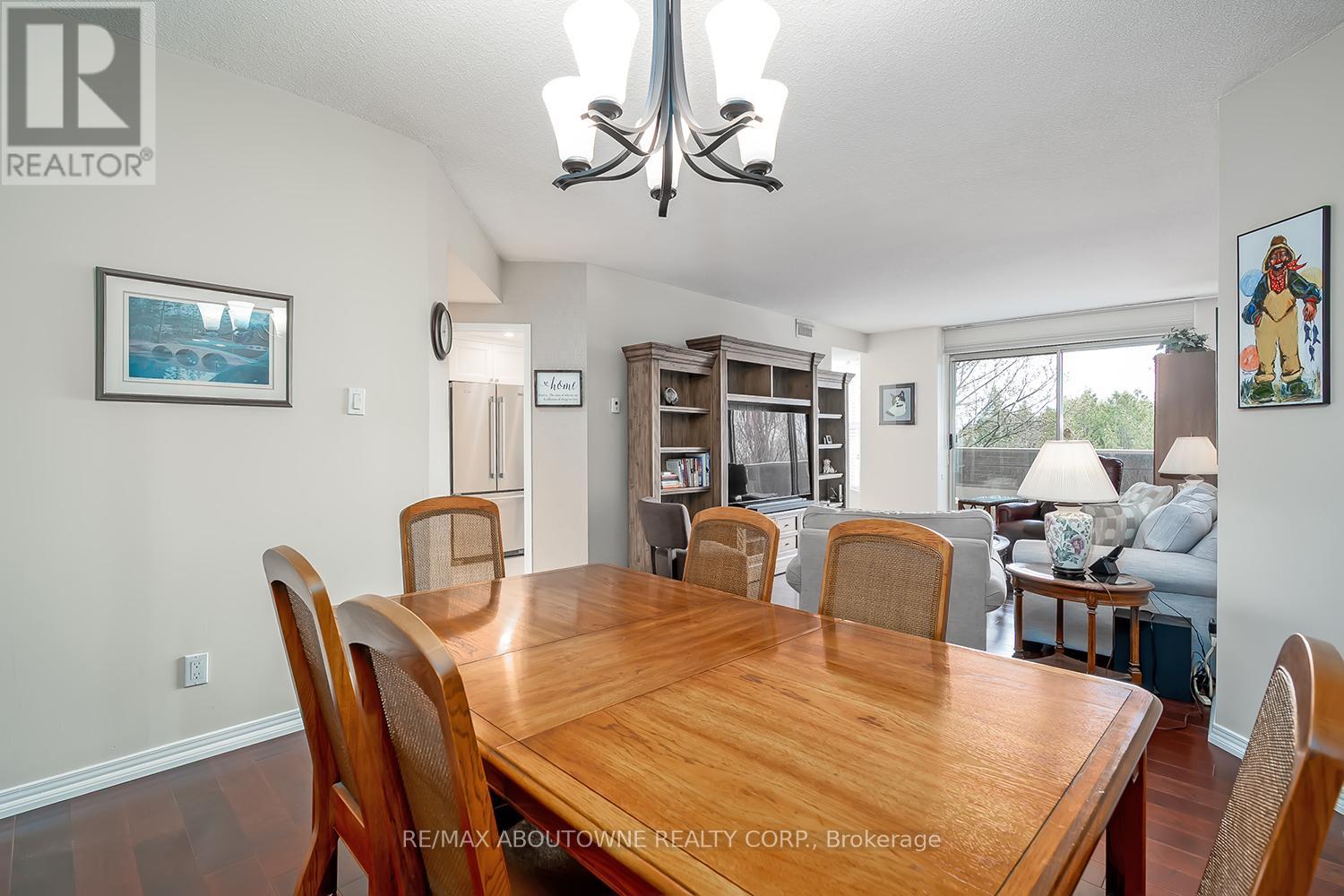 Enjoy private south east views in this bright, 2 bedroom, 2 full bathroom 1321 SF unit at the prestigious upscale Arboretum in sought after Glen Abbey. A well-appointed building lobby welcomes you home & each floor boasts newly updated hallway decor with six exclusive units per level. An oversized solid wood door greets you upon entering this suite. Elegant porcelain tile foyer & seamless engineered hardwood in the formal living & dining rooms. A gorgeous custom kitchen (2020) with white shaker style cabinetry, quartz counters, quality appliances include stainless french door fridge & 5 burner range, built in microwave & dishwasher. Stylish ceramic subway tile backsplash, porcelain tile flooring, pot lighting & open breakfast area with floor to ceiling windows providing spectacular views for morning coffee & casual dining. Sliding glass door to the private open balcony. The primary bedroom features a large window w/ cali shutters, broadloom, a large walk-in closet with shelving & private 5 piece ensuite with soaker tub & separate tiled shower. The second bedroom also features a large window with cali shutters, broadloom, & a large double door closet. In-suite laundry, heat pump (2016,) exclusive underground parking spot & a sizeable storage locker included. This beautifully maintained complex with gated access, lush grounds & mature trees offers extensive building amenities including indoor pool, hot tub, sauna & change rooms, party room w/ kitchen, fitness room, billiards, library, hobby/games room, tennis court, car wash bay, outdoor patio area with barbecues, plenty of visitor parking & guest suites. Never a dull moment at the Arboretum with its active social committee & extensive organized events. Prime location w/in walking distance to the famous Monastery Bakery. Close proximity to Glen Abbey rec centre & lush Taplow creek walking trail system just outside the door. Easy access to major highways, transit, & minutes to Oakville hospital. (id:43681)