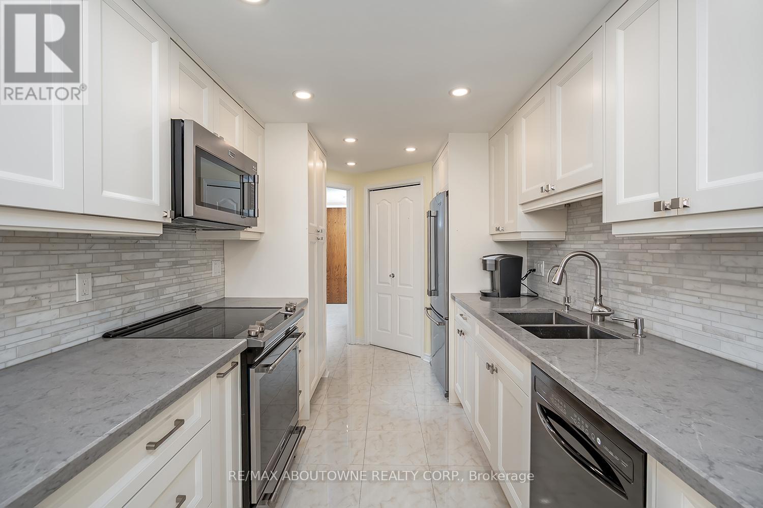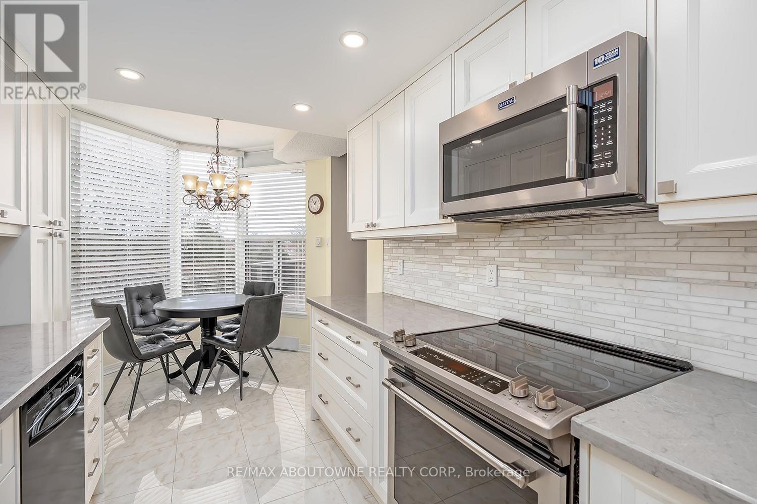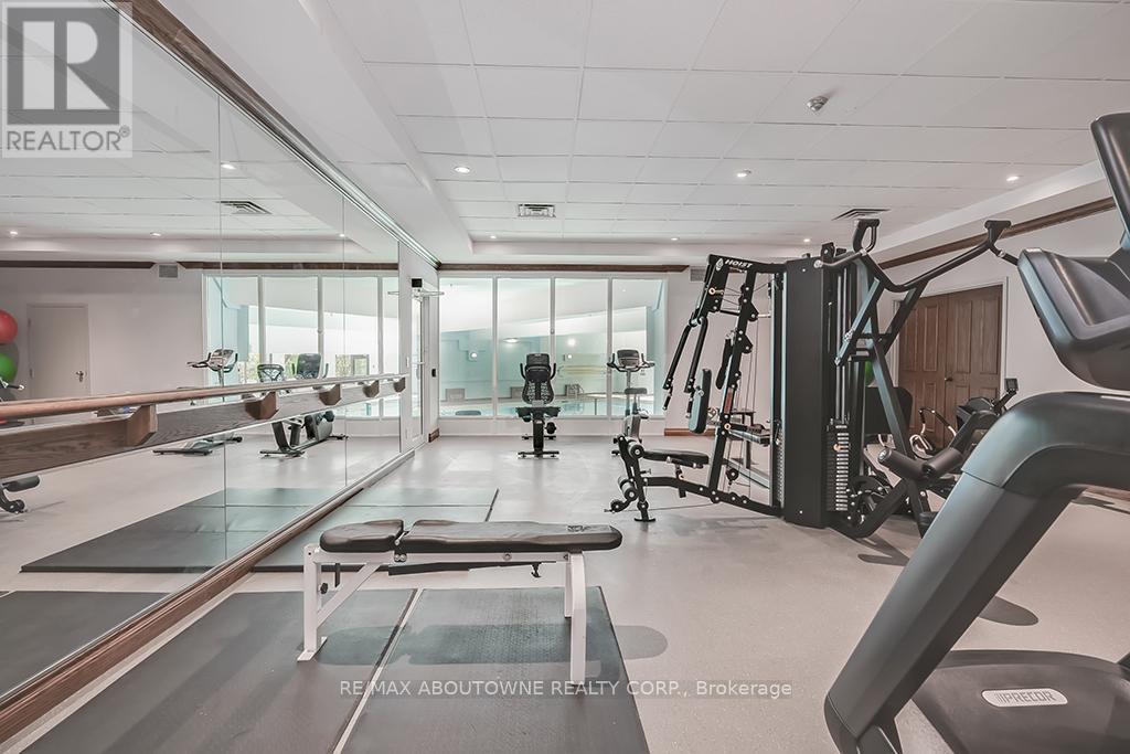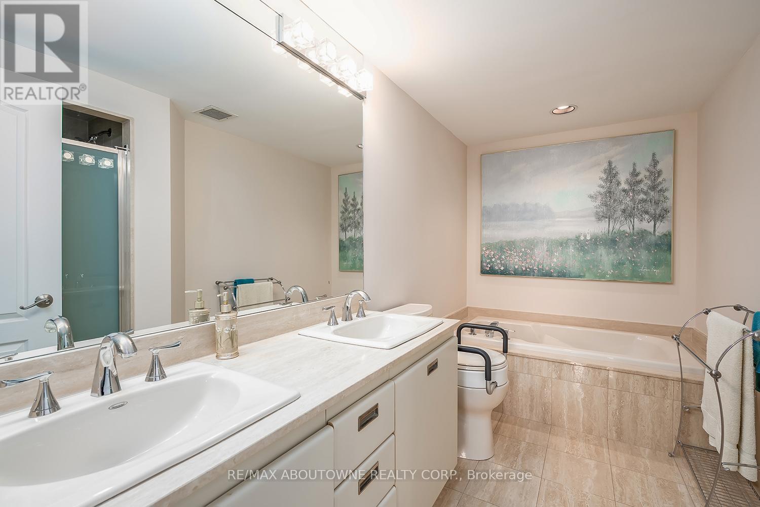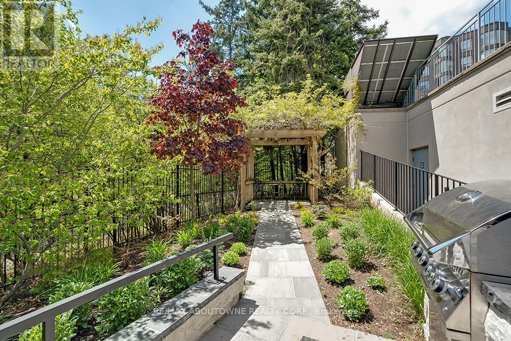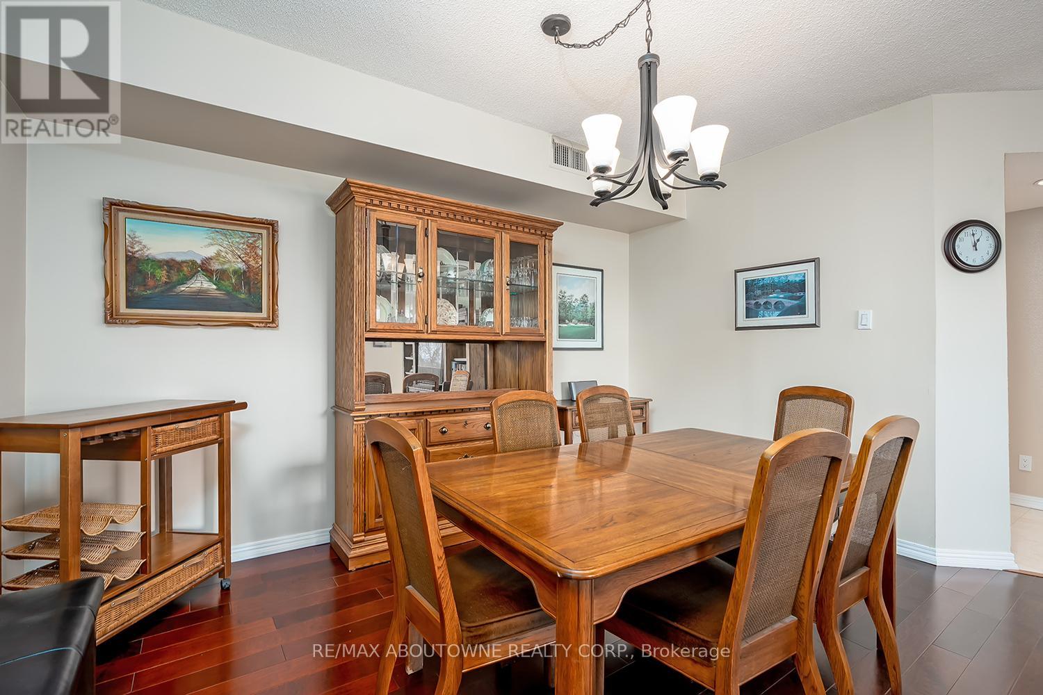 Enjoy private south east views in this bright, 2 bedroom, 2 full bathroom 1321 SF unit at the prestigious upscale Arboretum in sought after Glen Abbey. A well-appointed building lobby welcomes you home & each floor boasts newly updated hallway decor with six exclusive units per level. An oversized solid wood door greets you upon entering this suite. Elegant porcelain tile foyer & seamless engineered hardwood in the formal living & dining rooms. A gorgeous custom kitchen (2020) with white shaker style cabinetry, quartz counters, quality appliances include stainless french door fridge & 5 burner range, built in microwave & dishwasher. Stylish ceramic subway tile backsplash, porcelain tile flooring, pot lighting & open breakfast area with floor to ceiling windows providing spectacular views for morning coffee & casual dining. Sliding glass door to the private open balcony. The primary bedroom features a large window w/ cali shutters, broadloom, a large walk-in closet with shelving & private 5 piece ensuite with soaker tub & separate tiled shower. The second bedroom also features a large window with cali shutters, broadloom, & a large double door closet. In-suite laundry, heat pump (2016,) exclusive underground parking spot & a sizeable storage locker included. This beautifully maintained complex with gated access, lush grounds & mature trees offers extensive building amenities including indoor pool, hot tub, sauna & change rooms, party room w/ kitchen, fitness room, billiards, library, hobby/games room, tennis court, car wash bay, outdoor patio area with barbecues, plenty of visitor parking & guest suites. Never a dull moment at the Arboretum with its active social committee & extensive organized events. Prime location w/in walking distance to the famous Monastery Bakery. Close proximity to Glen Abbey rec centre & lush Taplow creek walking trail system just outside the door. Easy access to major highways, transit, & minutes to Oakville hospital. (id:43681)