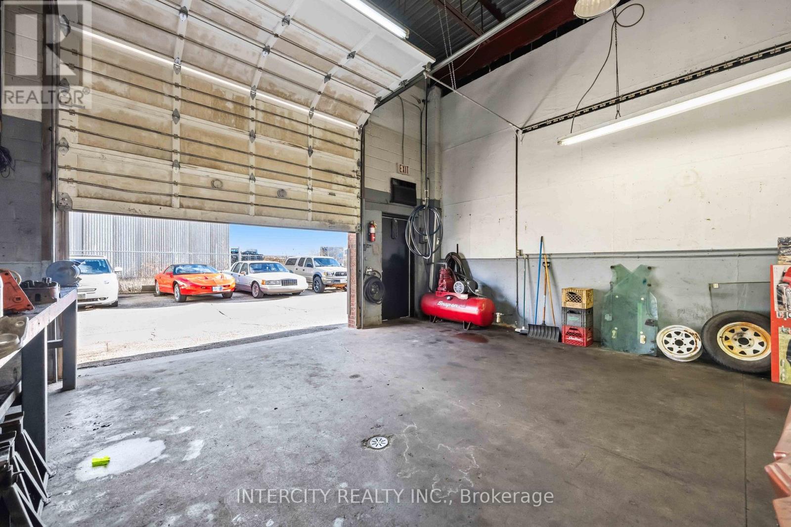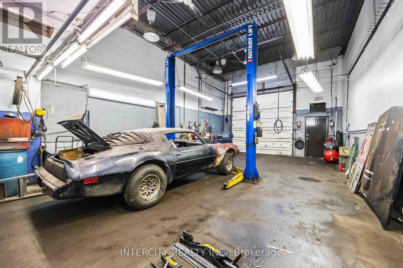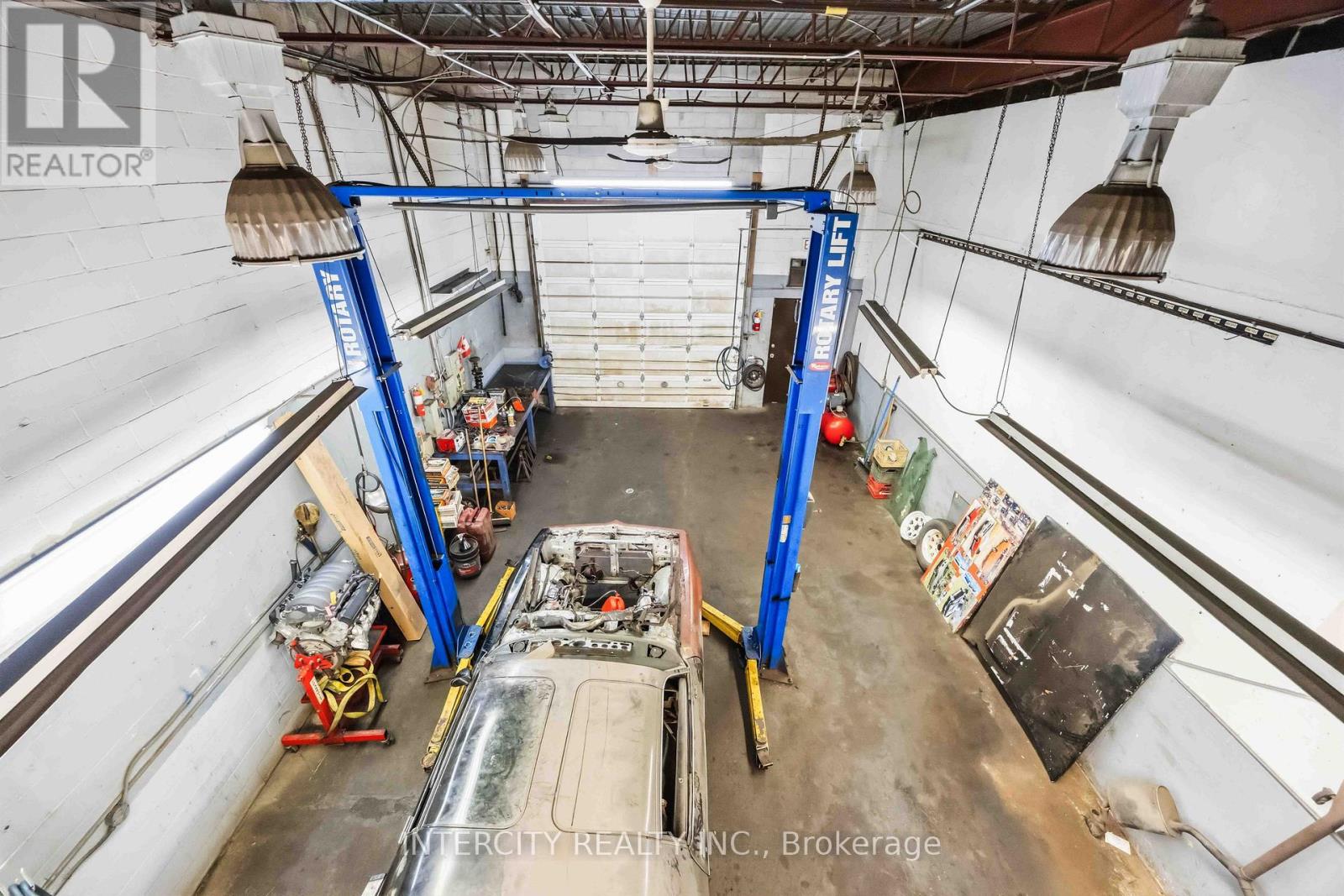 Well-maintained industrial unit offering approx. 1,347 sq. ft. plus upper mezzanine. Located in a high-demand employment corridor with excellent access to major routes. Zoned EM1 & EM2, permitting a wide range of uses including automotive, light manufacturing, warehousing, and service-related businesses. Unit is equipped with 1 hoist, 1 air compressor, and 2 work benches, making it ideal for automotive or trades and left for tenants use. Features include a large rear drive-in bay door for shipping/receiving and a separate rear man door for convenient access. Functional layout with efficient use & added mezzanine for storage or office. (id:43681)