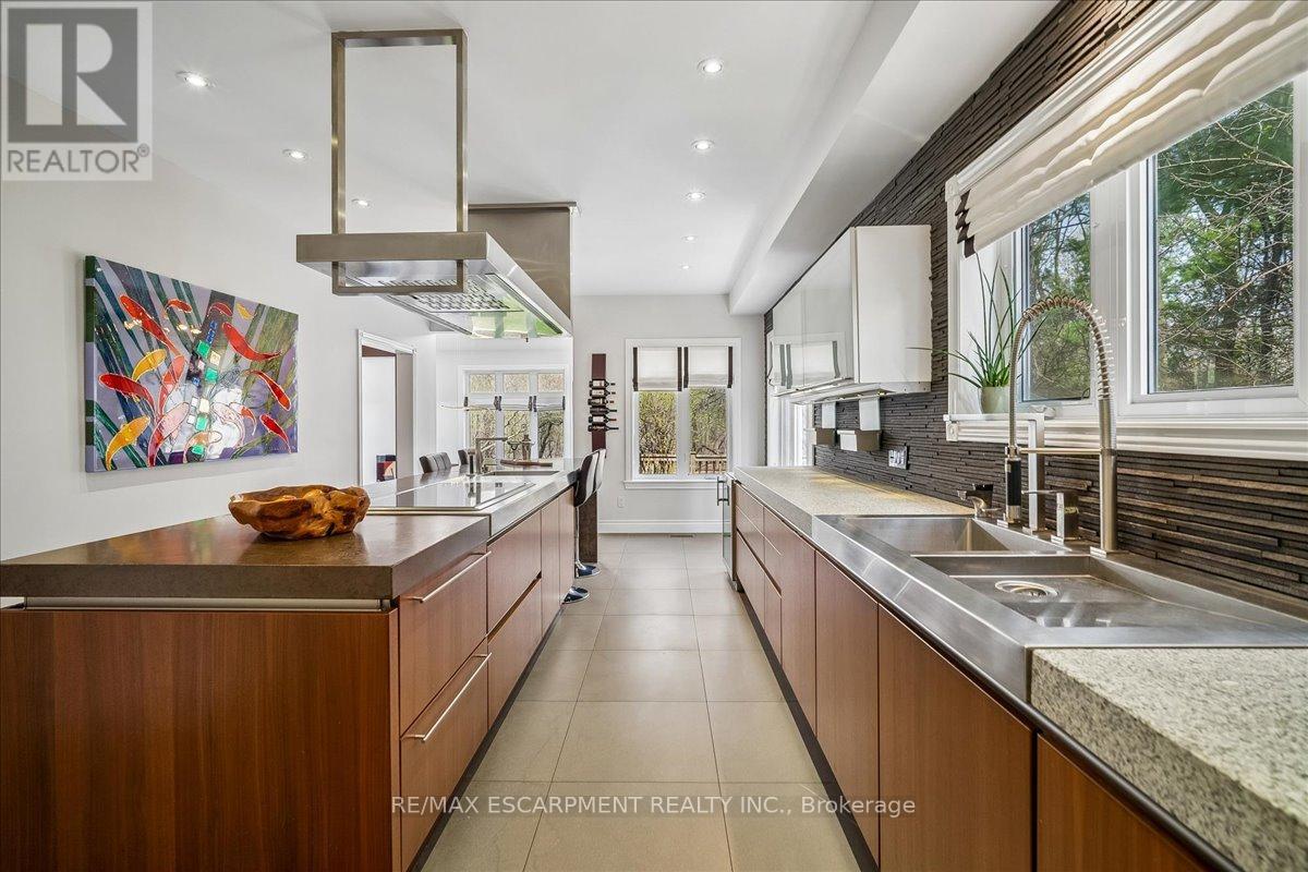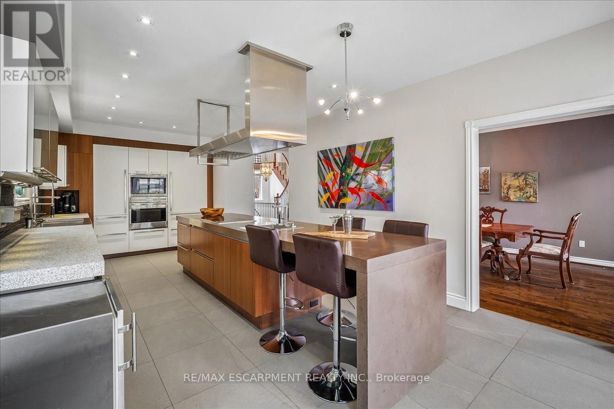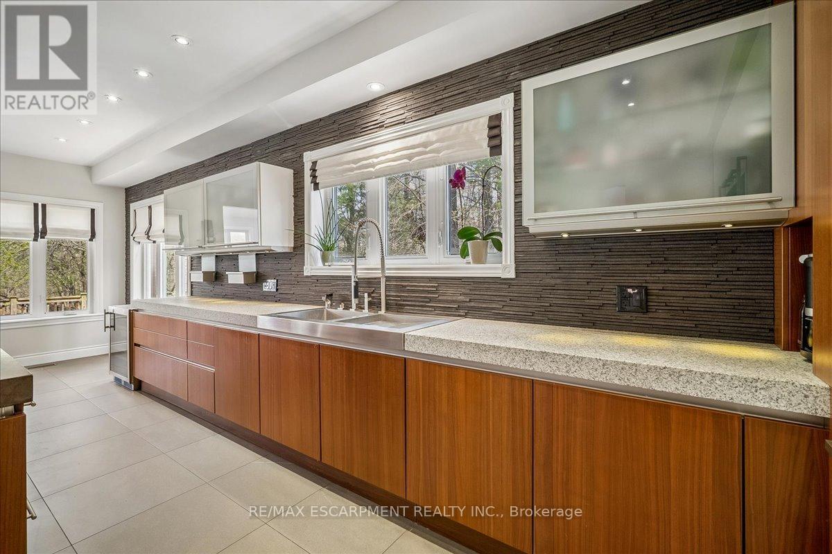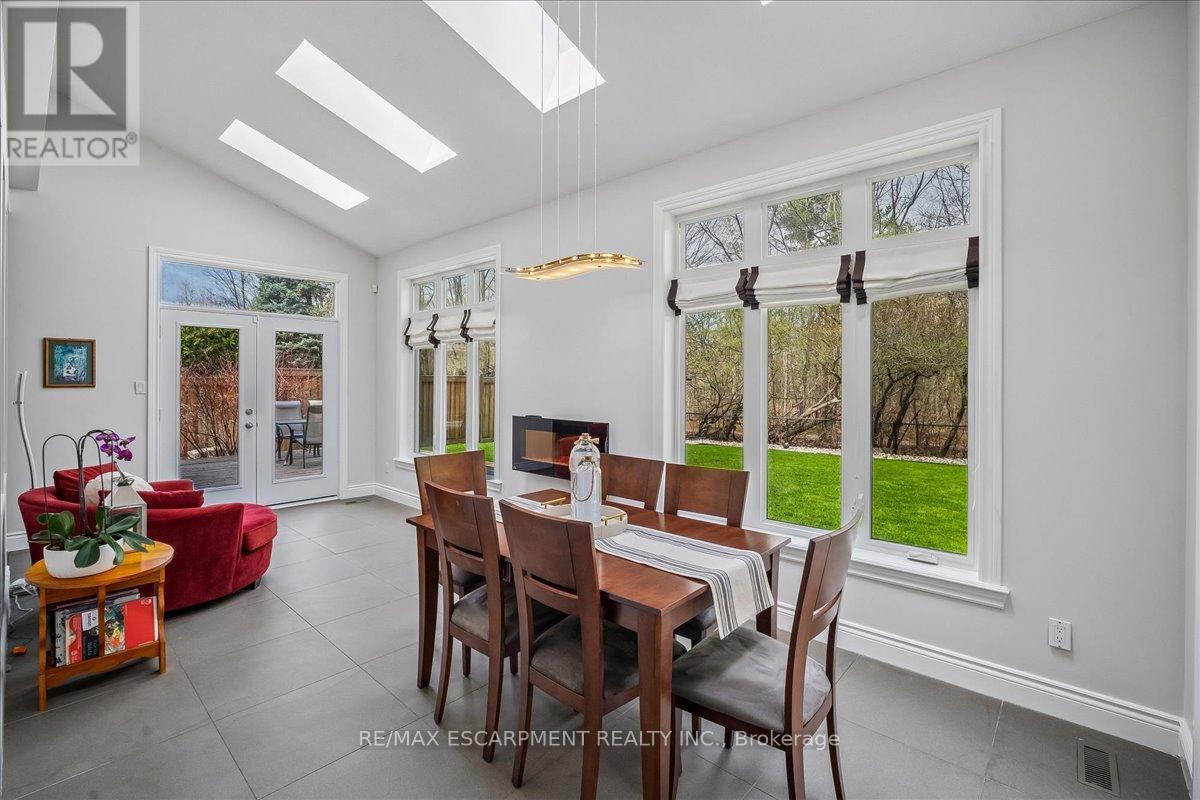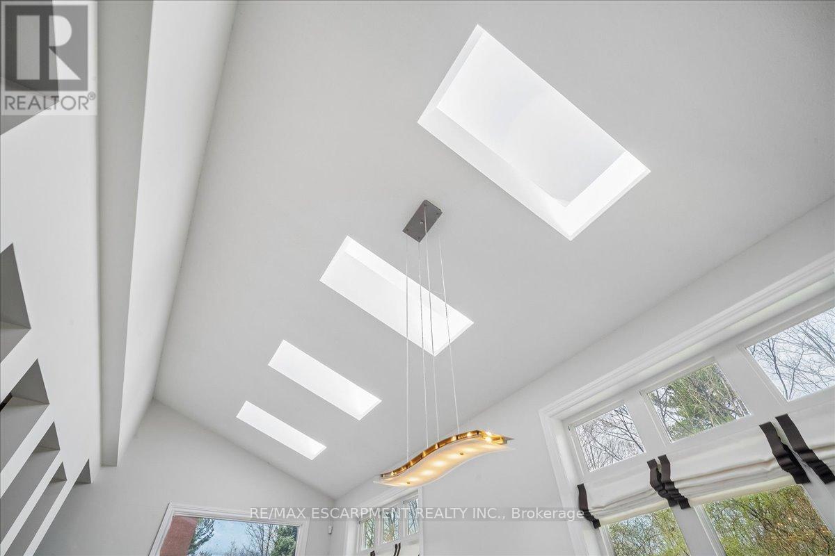 Set on one of River Oaks' most coveted streets, known for its estate-sized lots and executive homes, this is a rare opportunity to own a residence that feels completely immersed in nature. With forest and walking paths wrapping the rear and south side, and a ravine beyond, the setting is incredibly private-something almost unheard of in Oakville. Offering over 4,200 sq. ft. above grade and 6,000 sq. ft. of finished living space, the home has been impeccably maintained and thoughtfully upgraded, blending scale, warmth, and timeless character. At its heart is a truly exceptional custom kitchen by BINNS Kitchens of Toronto, a $285K investment designed for those who love to cook and entertain. Anchored by a dramatic 15 ft island and equipped with Sub-Zero and Wolf appliances, the space is as functional as it is striking. It flows effortlessly into a sun-filled solarium with four skylights and garden doors on both sides, opening to two private decks and creating a seamless indoor-outdoor experience. The main floor offers beautifully proportioned principal rooms, a welcoming family room with wood-burning fireplace, a refined dining space with architectural openings that allow light to move through the home, and a versatile front den perfect as a library or office. Upstairs, four generous bedrooms and three full baths provide comfort for family and guests, along with a separate study tucked behind French doors. The lower level is designed for unforgettable evenings, featuring a classic wood bar with brass rail, a full-size snooker table, gas fireplace, and abundant space to relax, entertain, or unwind-complete with a steam shower bathroom. Surrounded by mature landscaping, enhanced with stonework, lighting, irrigation, and modern conveniences including a Tesla charger, this is a home that offers not just space, but a lifestyle-private, inviting, and truly rare. (id:43681)