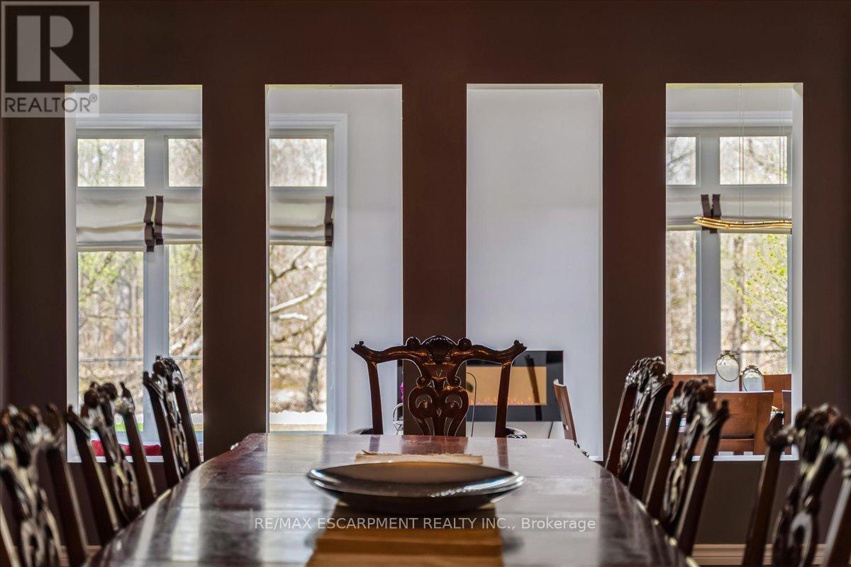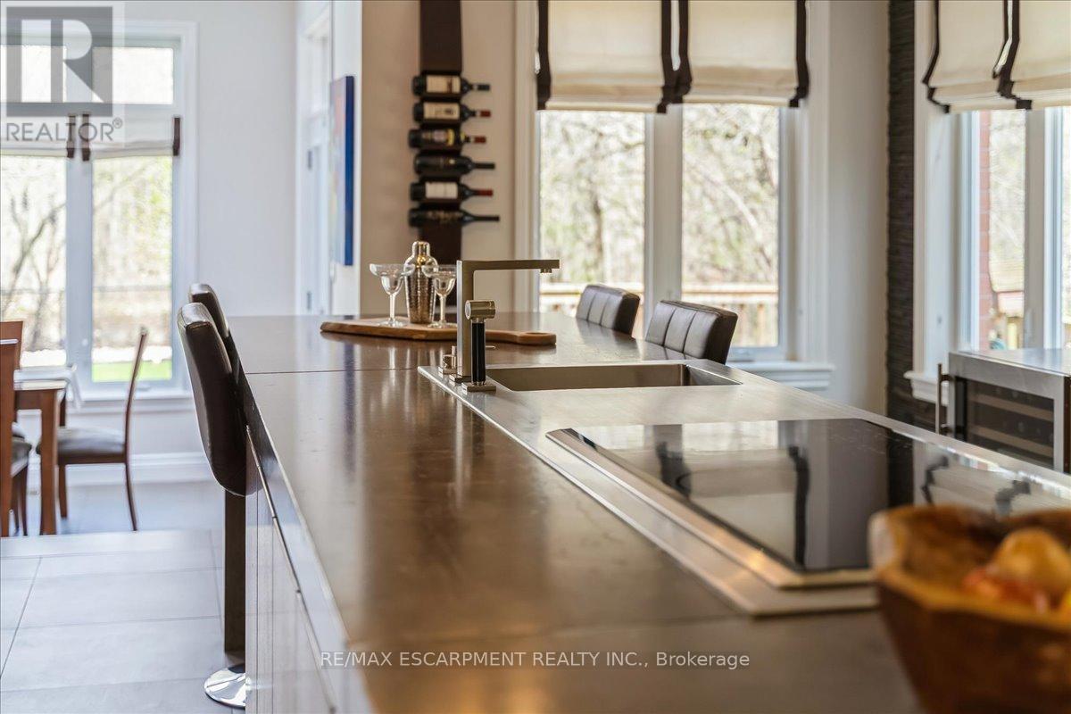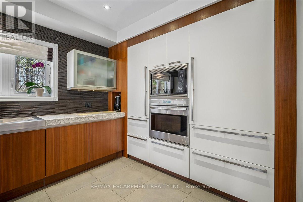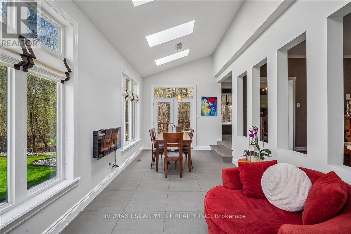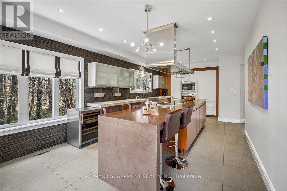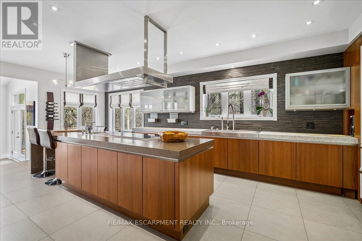 Set on one of River Oaks' most coveted streets, known for its estate-sized lots and executive homes, this is a rare opportunity to own a residence that feels completely immersed in nature. With forest and walking paths wrapping the rear and south side, and a ravine beyond, the setting is incredibly private-something almost unheard of in Oakville. Offering over 4,200 sq. ft. above grade and 6,000 sq. ft. of finished living space, the home has been impeccably maintained and thoughtfully upgraded, blending scale, warmth, and timeless character. At its heart is a truly exceptional custom kitchen by BINNS Kitchens of Toronto, a $285K investment designed for those who love to cook and entertain. Anchored by a dramatic 15 ft island and equipped with Sub-Zero and Wolf appliances, the space is as functional as it is striking. It flows effortlessly into a sun-filled solarium with four skylights and garden doors on both sides, opening to two private decks and creating a seamless indoor-outdoor experience. The main floor offers beautifully proportioned principal rooms, a welcoming family room with wood-burning fireplace, a refined dining space with architectural openings that allow light to move through the home, and a versatile front den perfect as a library or office. Upstairs, four generous bedrooms and three full baths provide comfort for family and guests, along with a separate study tucked behind French doors. The lower level is designed for unforgettable evenings, featuring a classic wood bar with brass rail, a full-size snooker table, gas fireplace, and abundant space to relax, entertain, or unwind-complete with a steam shower bathroom. Surrounded by mature landscaping, enhanced with stonework, lighting, irrigation, and modern conveniences including a Tesla charger, this is a home that offers not just space, but a lifestyle-private, inviting, and truly rare. (id:43681)
