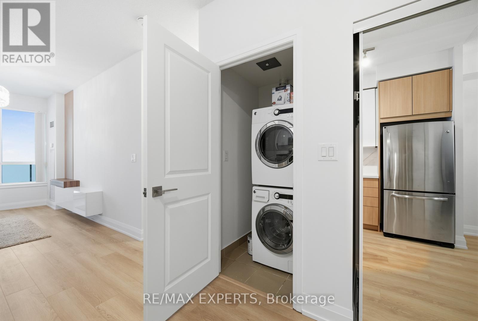$511.82 每月**Recently updated with approximately $20,000 in renovations**, this bright and spacious 1+Den unit offers a functional 622 sq ft layout, ideally situated on the 24th floor. The unit has been freshly painted throughout and features **brand-new flooring**, creating a clean, modern, move-in-ready feel.The **updated modern kitchen features quartz countertops with a matching slab backsplash**, showcasing a stylish two-tone design and a seamless, modern look. The bathroom vanity has been refaced and finished with a new countertop and new sink, adding to the unit's refreshed appeal. Additional highlights include 9' ceilings, mirrored closets, and a thoughtfully designed layout.Enjoy a stunning, unobstructed northwest view from the 40 sq ft balcony, perfect for relaxing or entertaining. The versatile den can be used as a second bedroom, home office, or breakfast area.Residents enjoy direct indoor access to a shopping mall with a supermarket, medical offices, retail stores, salons, cafes, and more. Exceptional building amenities include a 24-hour concierge, indoor pool, gym, party rooms, guest suites, and more. Move-in ready with flexible closing available. (id:43681)