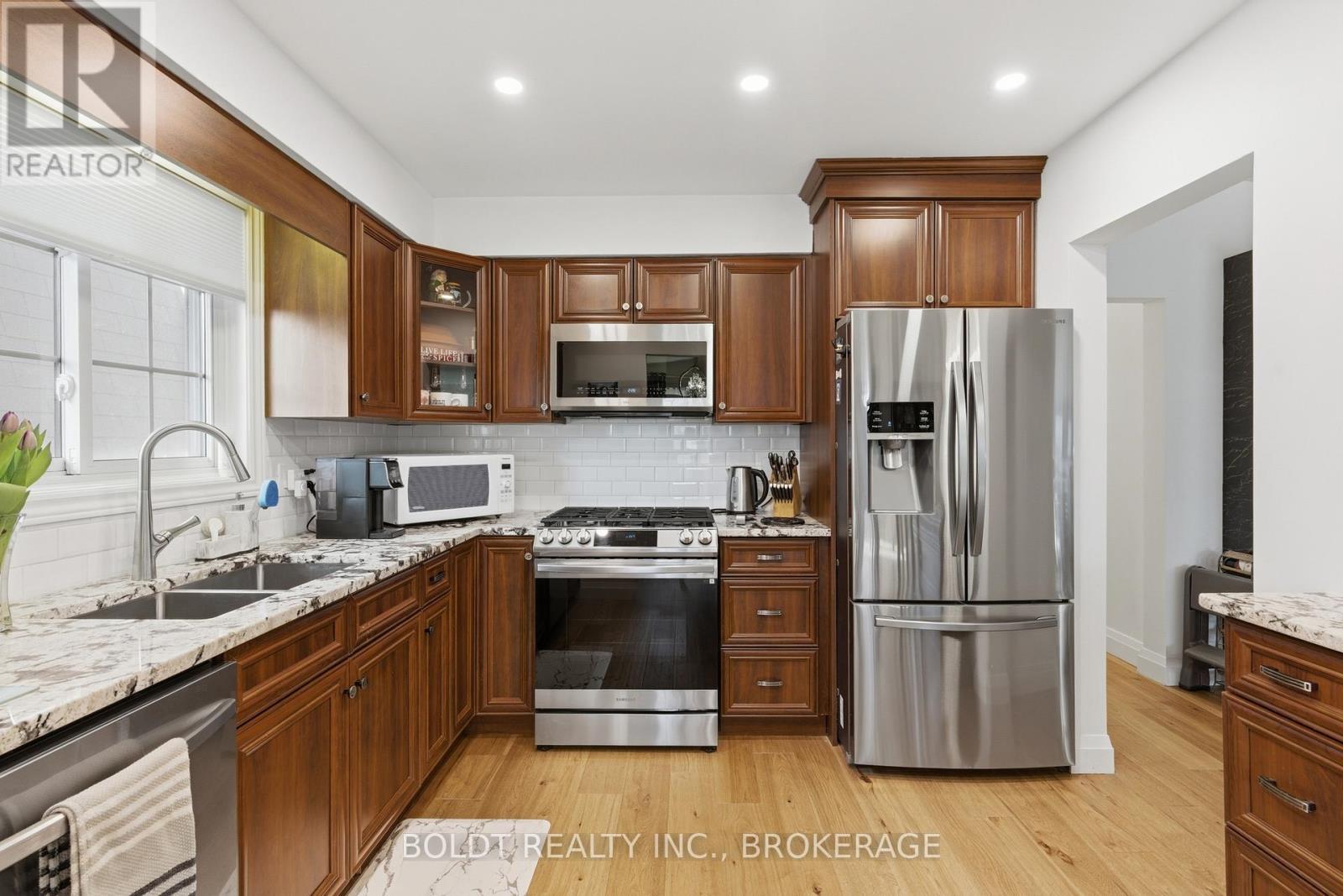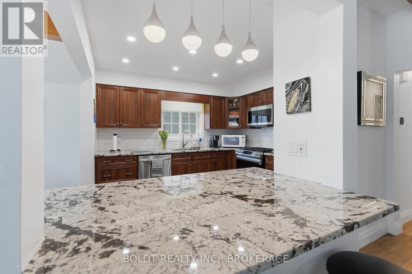 Stunning 3+2 bedroom, 2 full bath raised bungalow offering space, style, and flexibility for modern family living.Step inside to a large, welcoming foyer that opens into a beautifully renovated main floor. The updated kitchen features granite countertops, a large island, and an oversized pantry, giving you both function and wow factor.The living and dining areas feature vaulted ceilings and are filled with natural light, creating an open, airy feel that makes the entire space shine.The main floor offers three bedrooms, with the third currently used as a walk-in closet and easily converted back if desired.Downstairs, the finished lower level delivers serious living space with a large family room anchored by a cozy gas fireplace, plus two additional bedrooms. A separate entrance opens the door for in-law suite potential or multi-generational living.At the back of the home, a bright sunroom leads to a private deck overlooking the large backyard, perfect for relaxing, entertaining, or enjoying summer evenings.Complete with an attached garage and located in a great neighbourhood close to schools, parks, shopping, and everyday amenities, this home checks all the boxes. (id:43681)