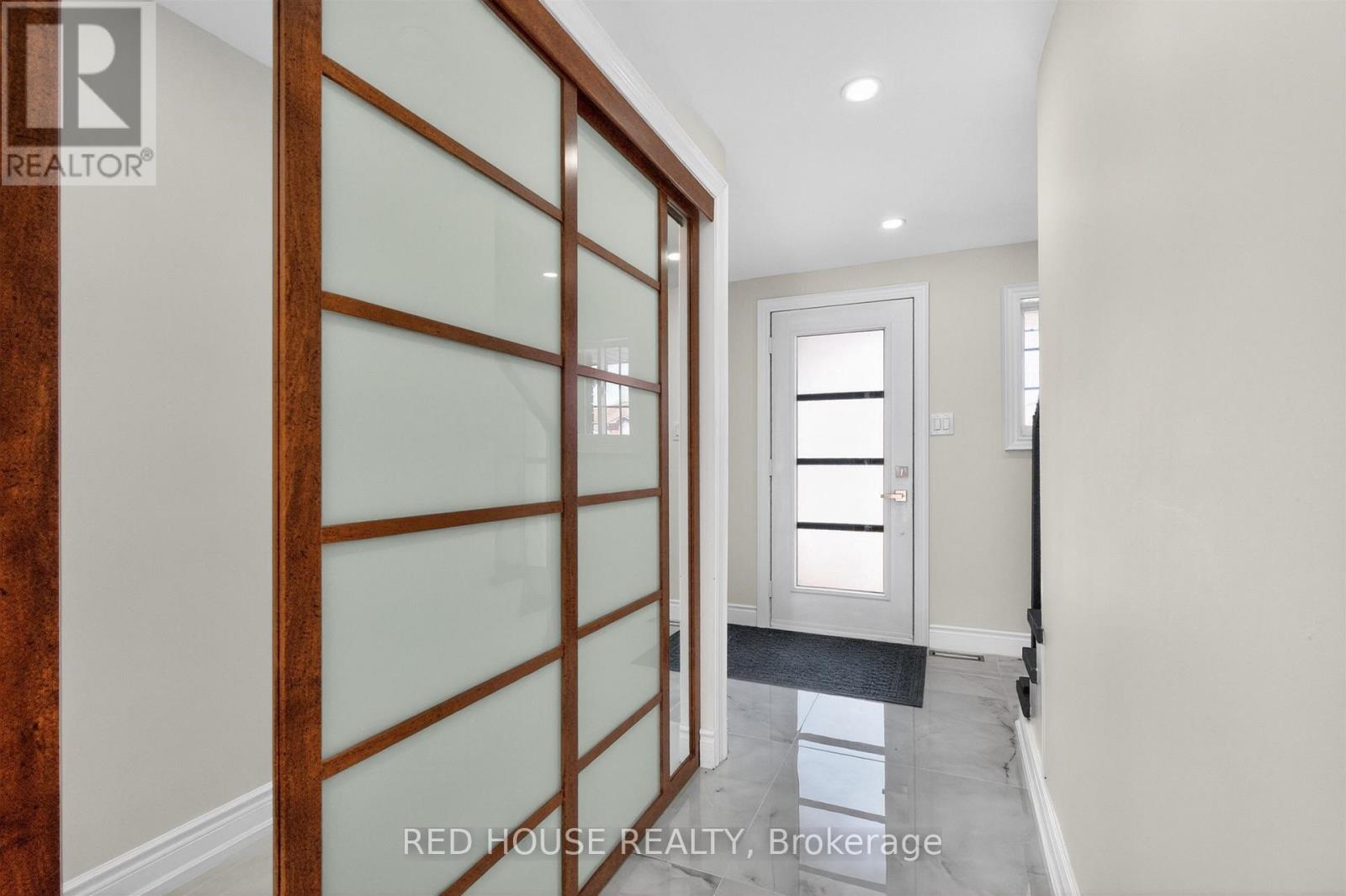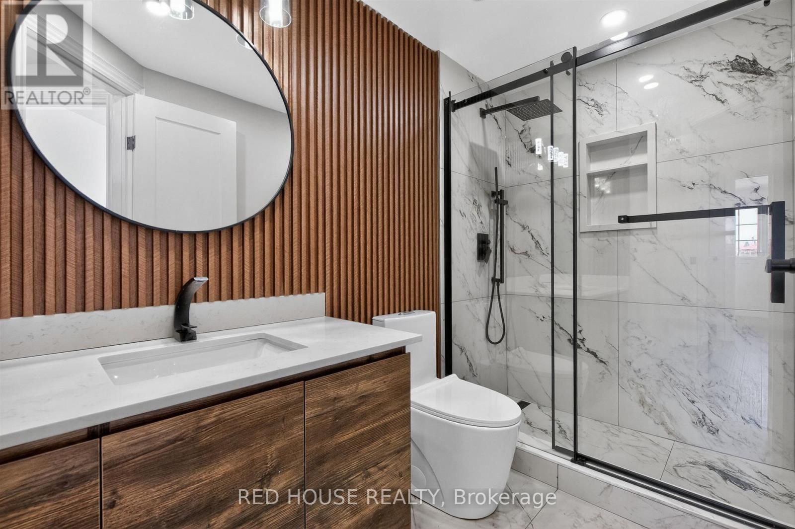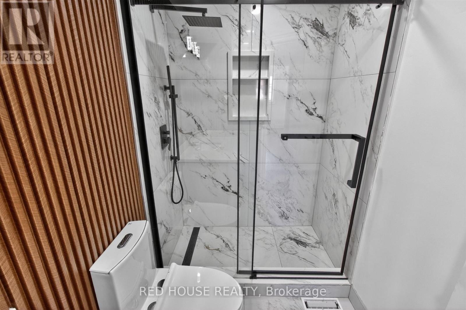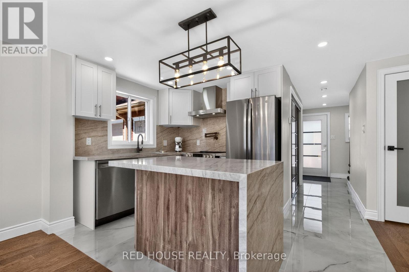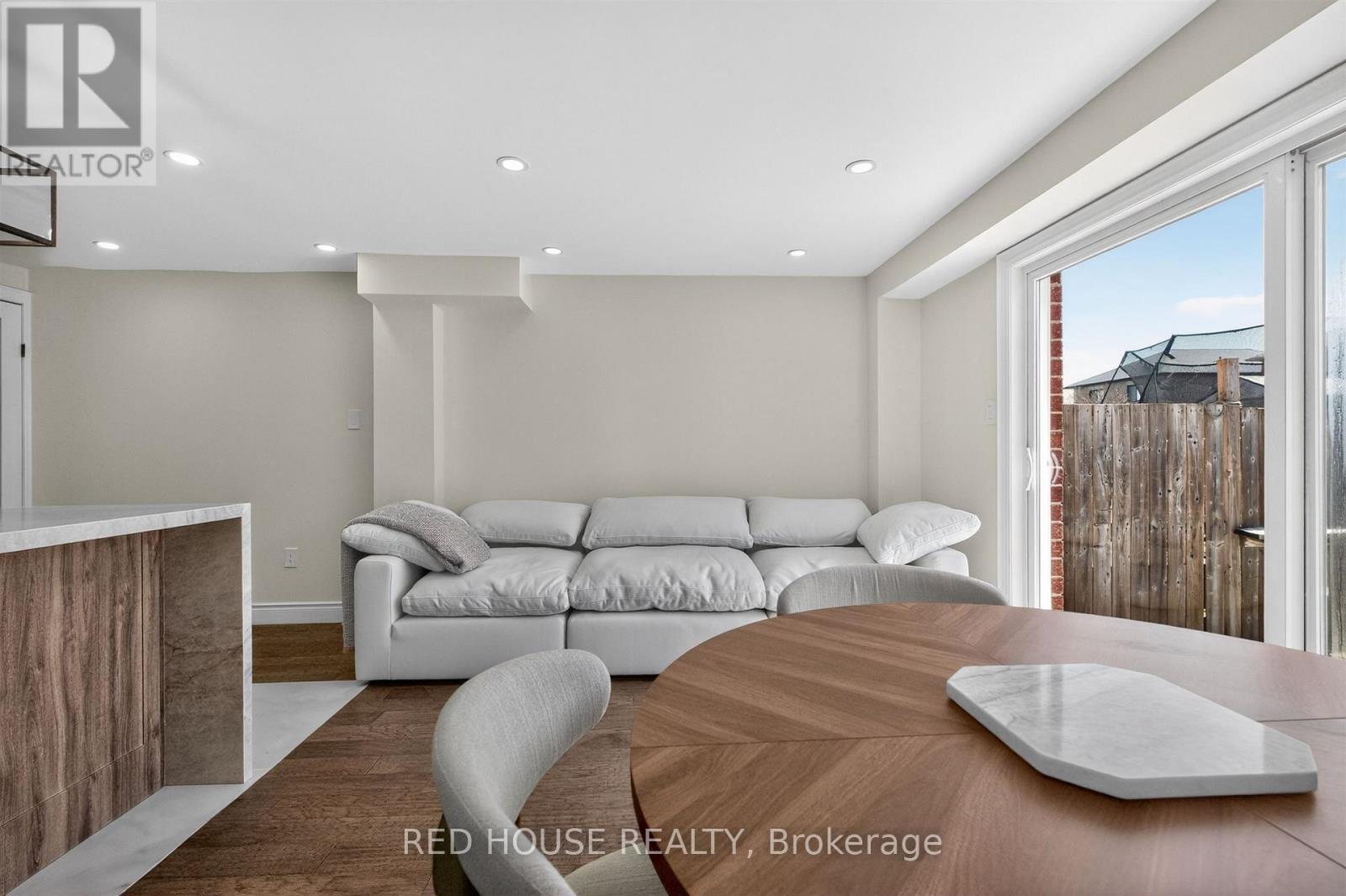 This meticulously upgraded residence where modern design and high-quality finishes come together in a premium offering. From the moment you arrive, the expanded front deck enhances curb appeal and creates a welcoming entry. Inside, the home unfolds with a clean, contemporary aesthetic defined by exceptional design and cohesive materials. Hardwood flooring and large format tile runs throughout the principal living spaces. The open-concept layout is bright and inviting, anchored by a stunning kitchen that has been thoughtfully reimagined. The kitchen features striking quartzite countertops and backsplash with a waterfall-style island, paired seamlessly with beautiful custom cabinetry. Stainless steel appliances, a modern range hood, and a designer light fixture complete the space, while the layout flows effortlessly into the dining and living areas-ideal for both everyday living and entertaining. The main floor is enhanced by pot lights throughout. Large sliding doors at the rear allow for natural light to flood the space. The staircase itself is finished with solid wood treads, glass panel railings, and black accents. The washrooms have been elevated to a spa-like standard. The primary bathroom showcases a frameless glass shower enclosure with black fixtures, and a rainfall shower system. A custom vanity with warm wood tones, and vertical slat paneling adds depth. Additional details throughout the home include upgraded interior doors, black lever hardware, and clean trim work. The lower level offers a fully finished, turn-key space with tiled flooring throughout, extending the living area and providing flexibility for recreation, work, or extended family use. Ideally situated in Barrie's sought-after Georgian Drive community, this home offers exceptional proximity to Highway 400, providing access for commuters, while close to a wide range of amenities. Every element has been carefully considered and executed, resulting in a home that is truly turnkey. (id:43681)