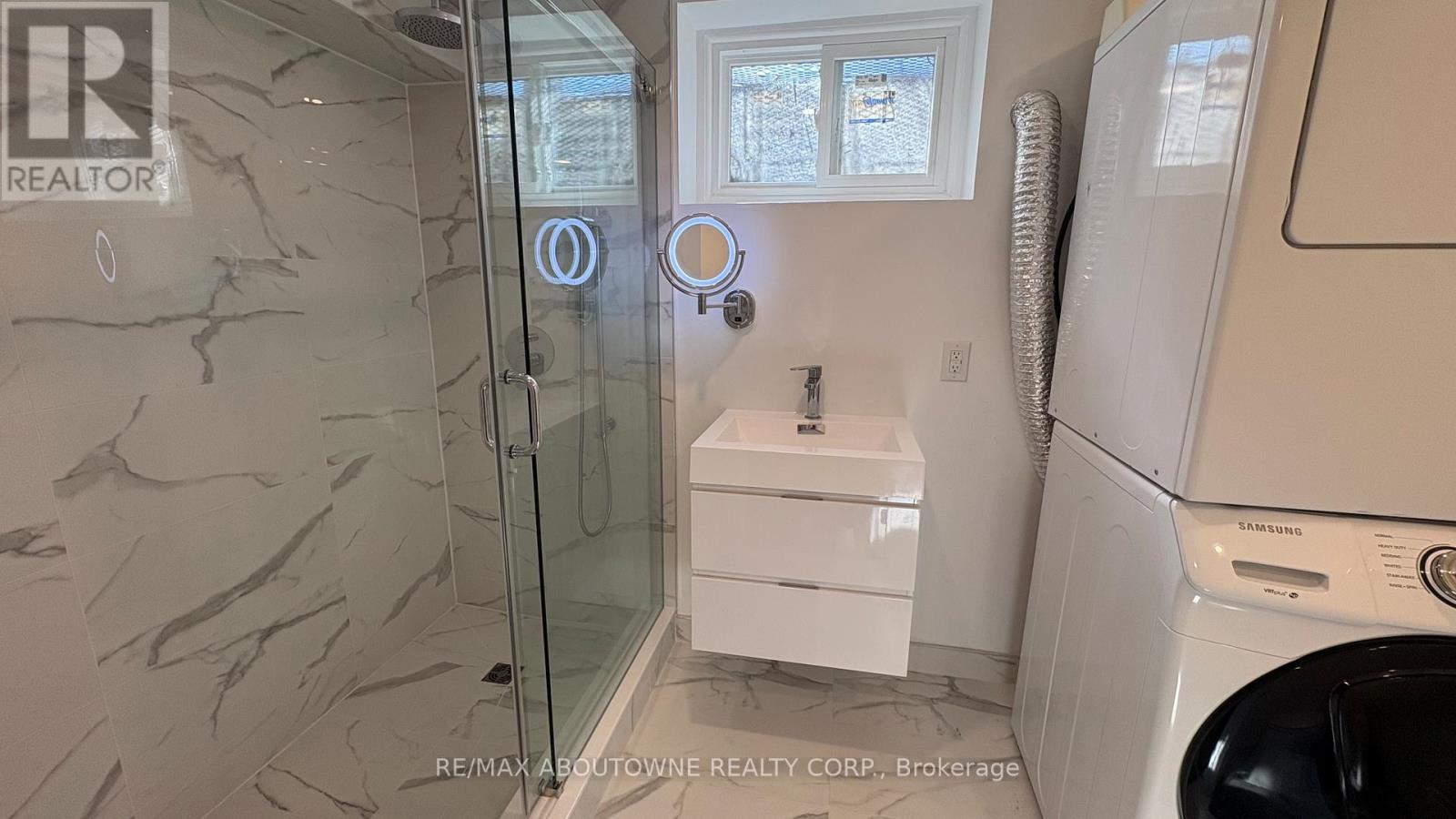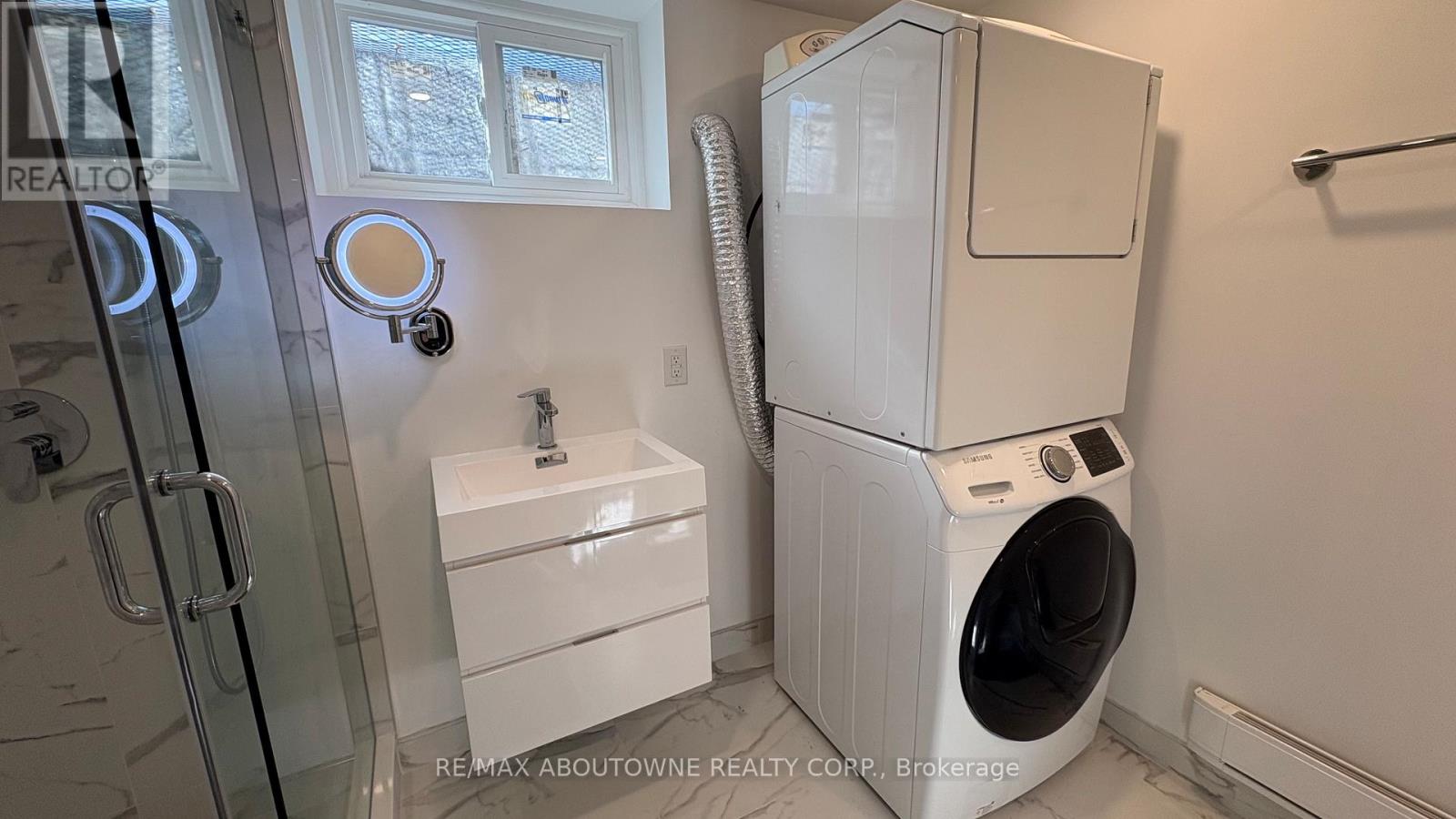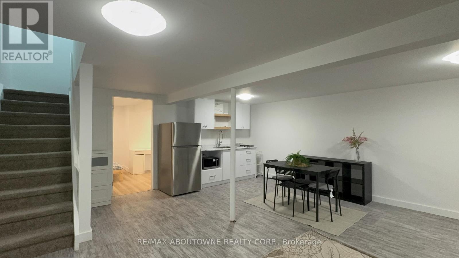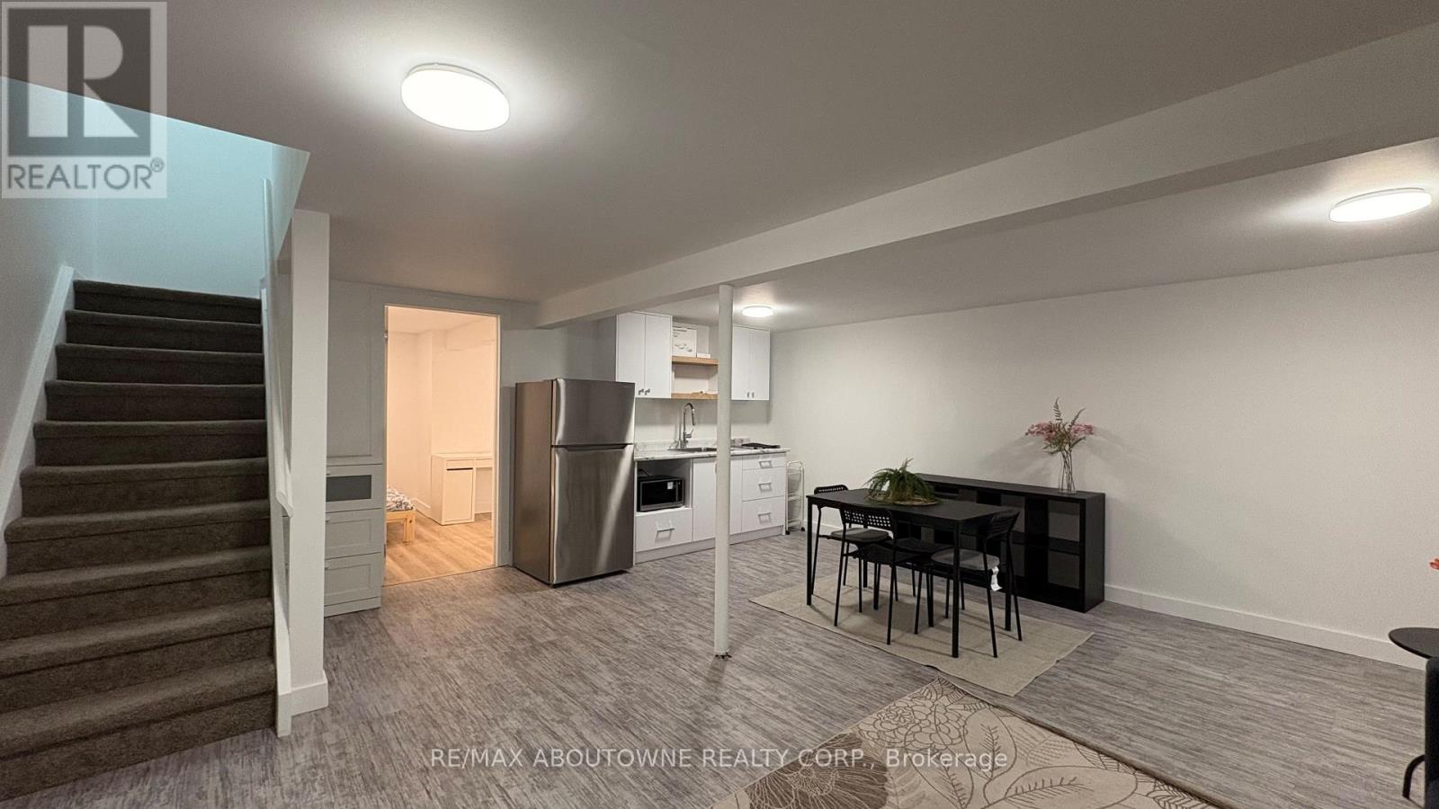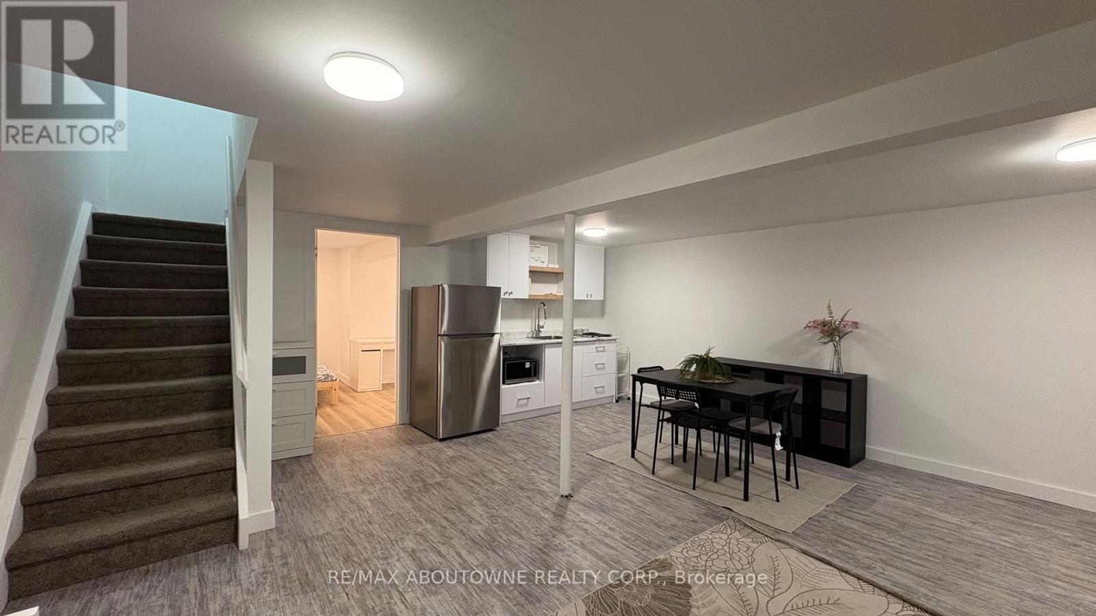 Lower level living space available for lease with access through a shared front foyer and a private entrance to the basement. Bright and well-designed layout featuring an open concept living and dining area, kitchenette, separate bedroom space, full bathroom and in-suite laundry. Walk-out basement with window providing natural light. Fully furnished and rent includes heat, hydro, water and shared internet (tenant may arrange their own internet if preferred). Furnishings include a sofa with a pull-out queen bed, dining table, workspace and a double bed in the bedroom. Conveniently located close to Sheridan College, public transit, shopping and major routes. Suitable for a single occupant or couple. Students and working professionals welcome. No parking available. (id:43681)
