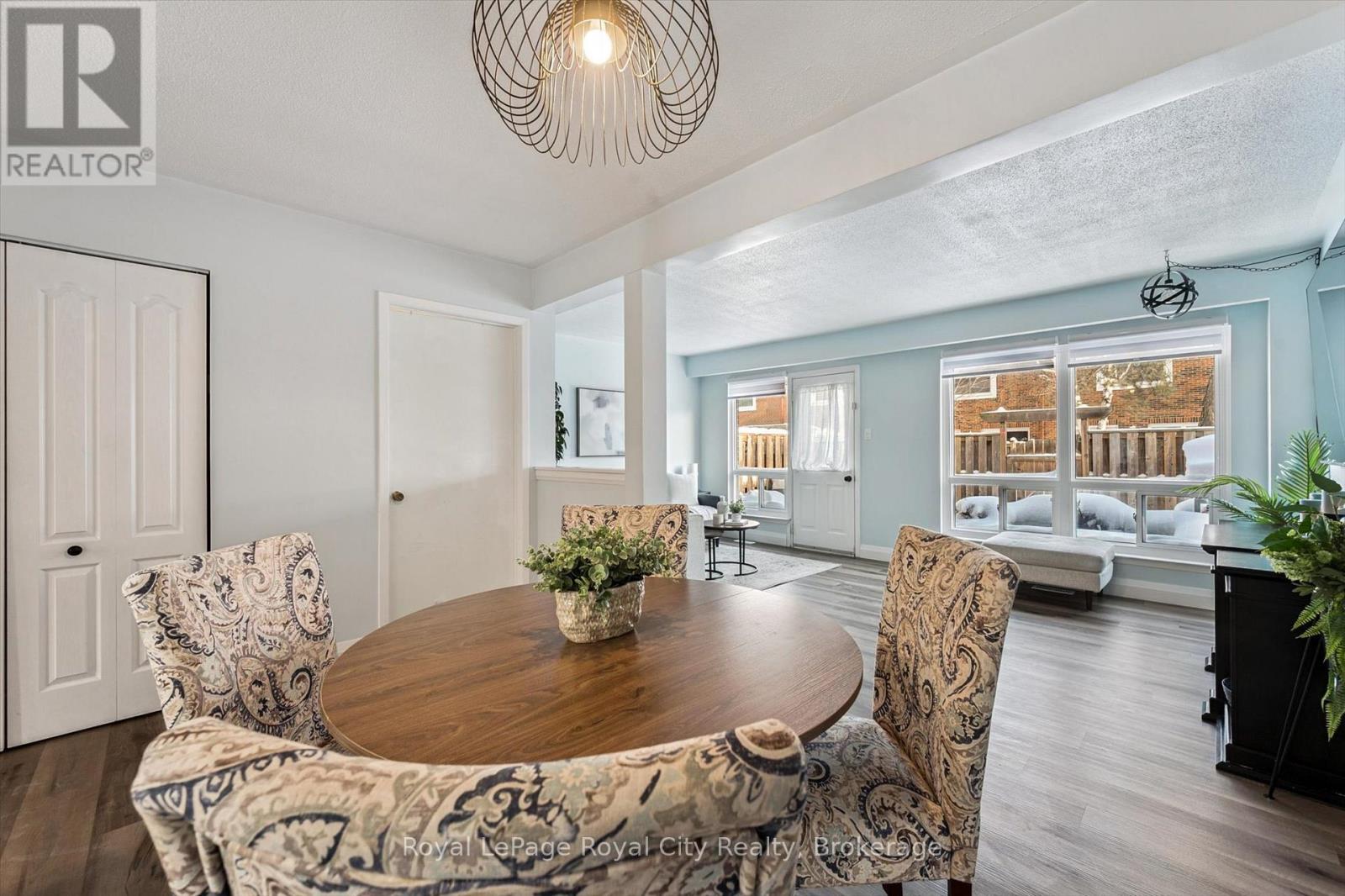 Tucked away in one of Guelph's best-kept secrets, this charming townhouse complex offers the perfect blend of convenience and community. Surrounded by mature greenery and close to all amenities, it truly feels like a little neighbourhood of its own. Welcome to this beautifully maintained end-unit townhouse, where thoughtful updates and pride of ownership shine throughout. The main floor has been fully updated and features a lovely modern kitchen with newer appliances, stylish new flooring, and contemporary light fixtures that create a bright and inviting atmosphere. Upstairs, you'll find three generously sized bedrooms, offering plenty of space for family, guests, or a home office. The finished recreation room in the basement provides additional living space - perfect for movie nights, a playroom, or a cozy retreat. Step outside to your private, fully fenced back patio, ideal for summer barbecues, morning coffee, or simply unwinding at the end of the day. Lovingly cared for and move-in ready, this home is waiting for its next owners to settle in and make it their own. A rare opportunity to enjoy low-maintenance living in a wonderful community you'll be proud to call home. (id:43681)