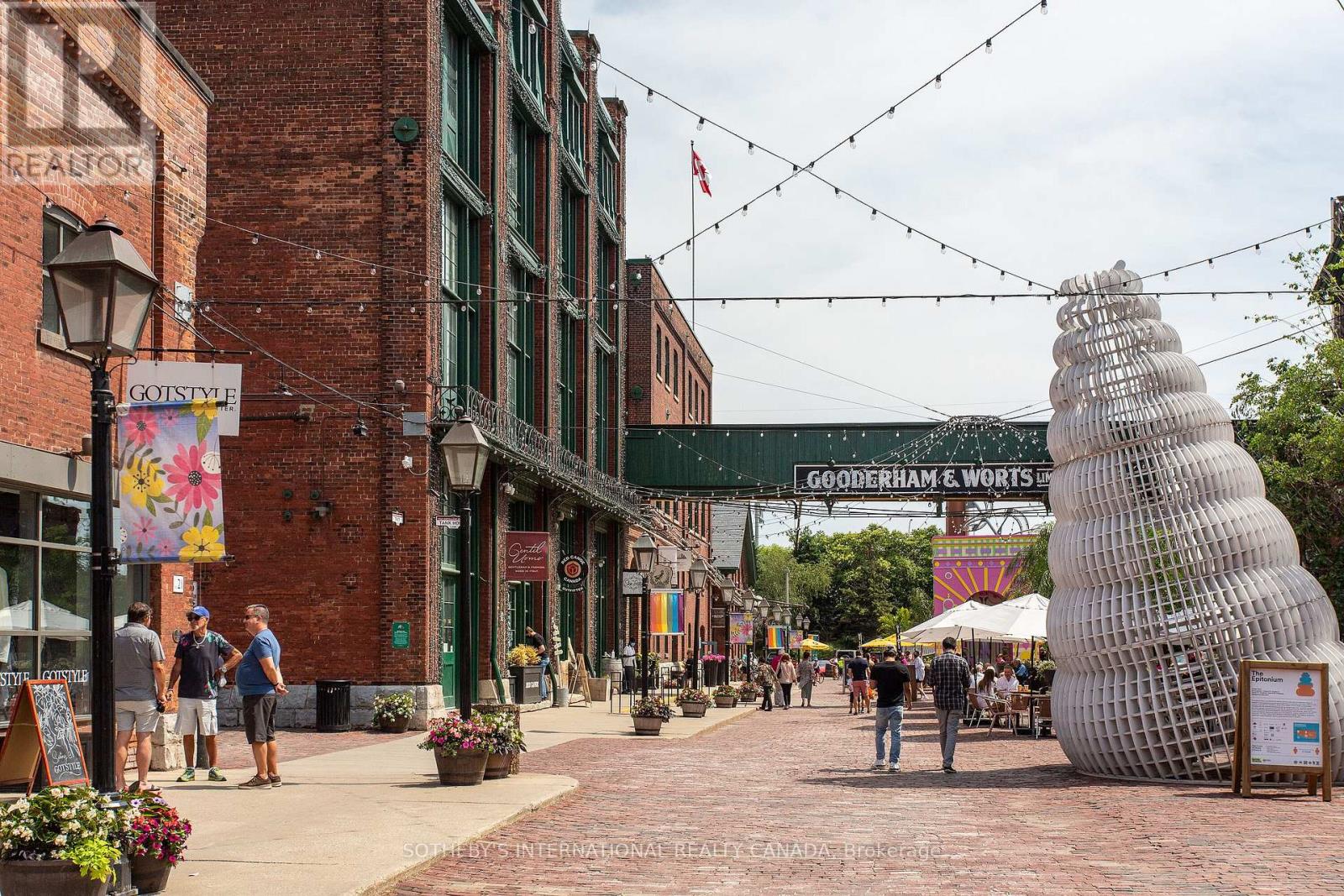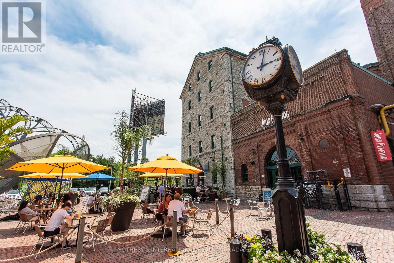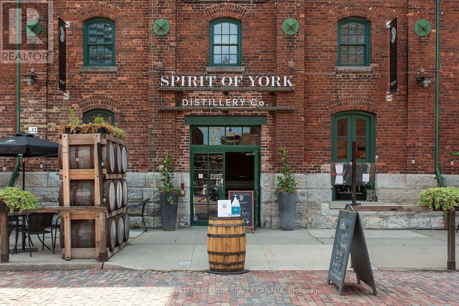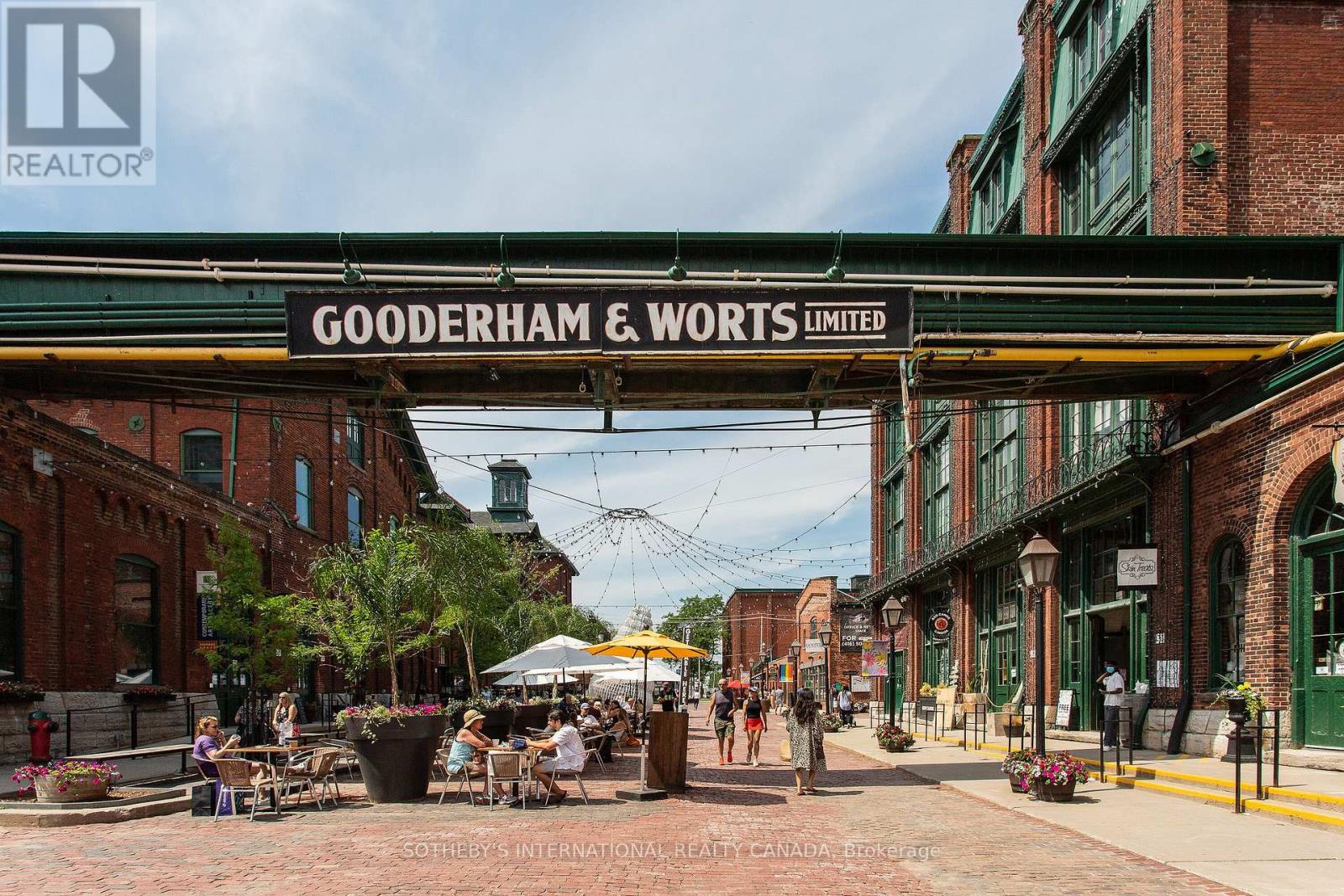 Offering a composed expression of city living with the historic Distillery District, this fully furnished two bedroom, two bathroom suite is thoughtfully arranged as a turnkey short term residence, designed for ease, comfort and flexibility. Hardwood floors and integrated millwork create a cohesive interior, while the updated kitchen anchors the living space with a centre island, bamboo cabinetry, stainless steel appliances, and generous preparation space. Natural light moves easily through the combined living and dining areas, framed by floor to ceiling south facing windows and a walkout to a large private balcony. The suite's split bedroom plan provides both privacy and adaptability. The primary bedroom features a walk in closet, a well proportioned ensuite bathroom, and a quiet south facing outlook. The second bedroom offers versatility as a guest room, office, or extended living space, also benefiting from southern exposure. Warm materials, refined finishes, and an intuitive layout establish a calm contemporary atmosphere. Offered fully furnished and configured for short term occupancy, the suite is ideally suited for executives, relocations, and professionals seeking a refined, turnkey residence in the city. Positioned within one of Toronto's most distinctive neighbourhoods, the Distillery District's cobblestone streets, galleries, cafés, and restaurants unfold just outside the door. Convenient access to the Financial District, St Lawrence Market, King East, transit, and major routes further enhances its ease of living. Parking and a bicycle are included. (id:43681)