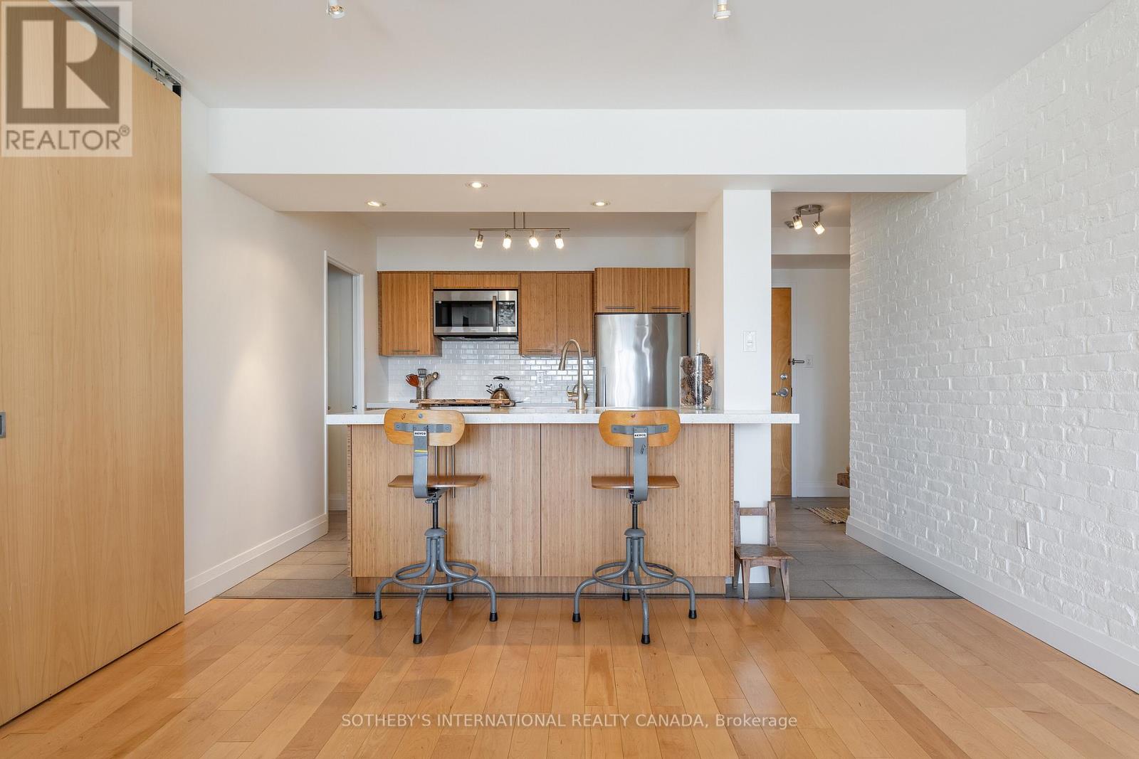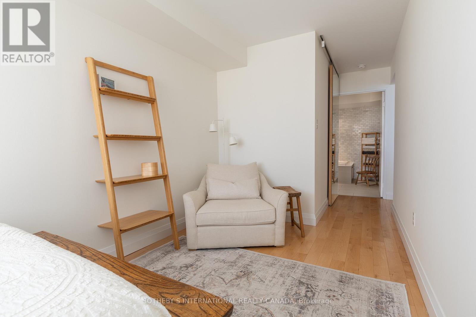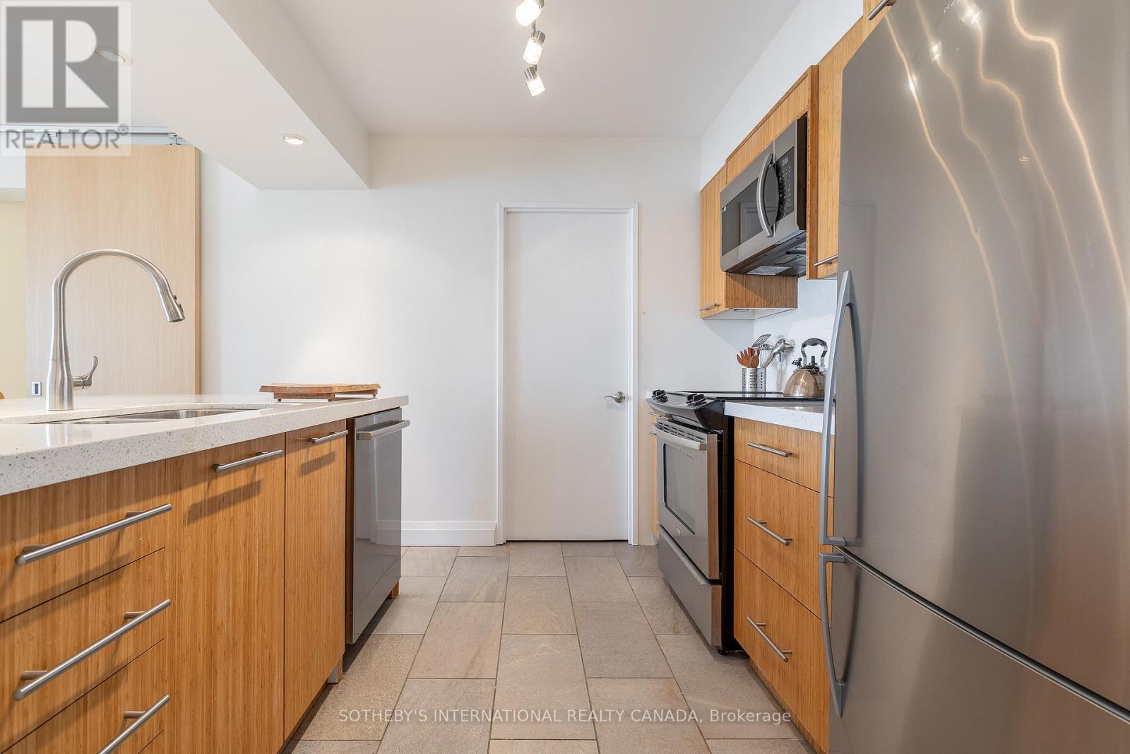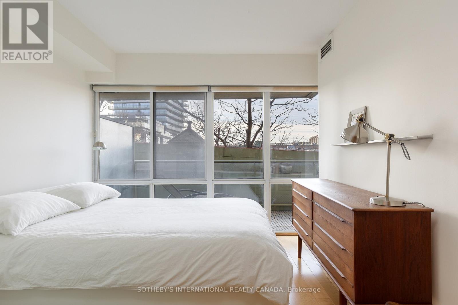 Offering a composed expression of city living with the historic Distillery District, this fully furnished two bedroom, two bathroom suite is thoughtfully arranged as a turnkey short term residence, designed for ease, comfort and flexibility. Hardwood floors and integrated millwork create a cohesive interior, while the updated kitchen anchors the living space with a centre island, bamboo cabinetry, stainless steel appliances, and generous preparation space. Natural light moves easily through the combined living and dining areas, framed by floor to ceiling south facing windows and a walkout to a large private balcony. The suite's split bedroom plan provides both privacy and adaptability. The primary bedroom features a walk in closet, a well proportioned ensuite bathroom, and a quiet south facing outlook. The second bedroom offers versatility as a guest room, office, or extended living space, also benefiting from southern exposure. Warm materials, refined finishes, and an intuitive layout establish a calm contemporary atmosphere. Offered fully furnished and configured for short term occupancy, the suite is ideally suited for executives, relocations, and professionals seeking a refined, turnkey residence in the city. Positioned within one of Toronto's most distinctive neighbourhoods, the Distillery District's cobblestone streets, galleries, cafés, and restaurants unfold just outside the door. Convenient access to the Financial District, St Lawrence Market, King East, transit, and major routes further enhances its ease of living. Parking and a bicycle are included. (id:43681)