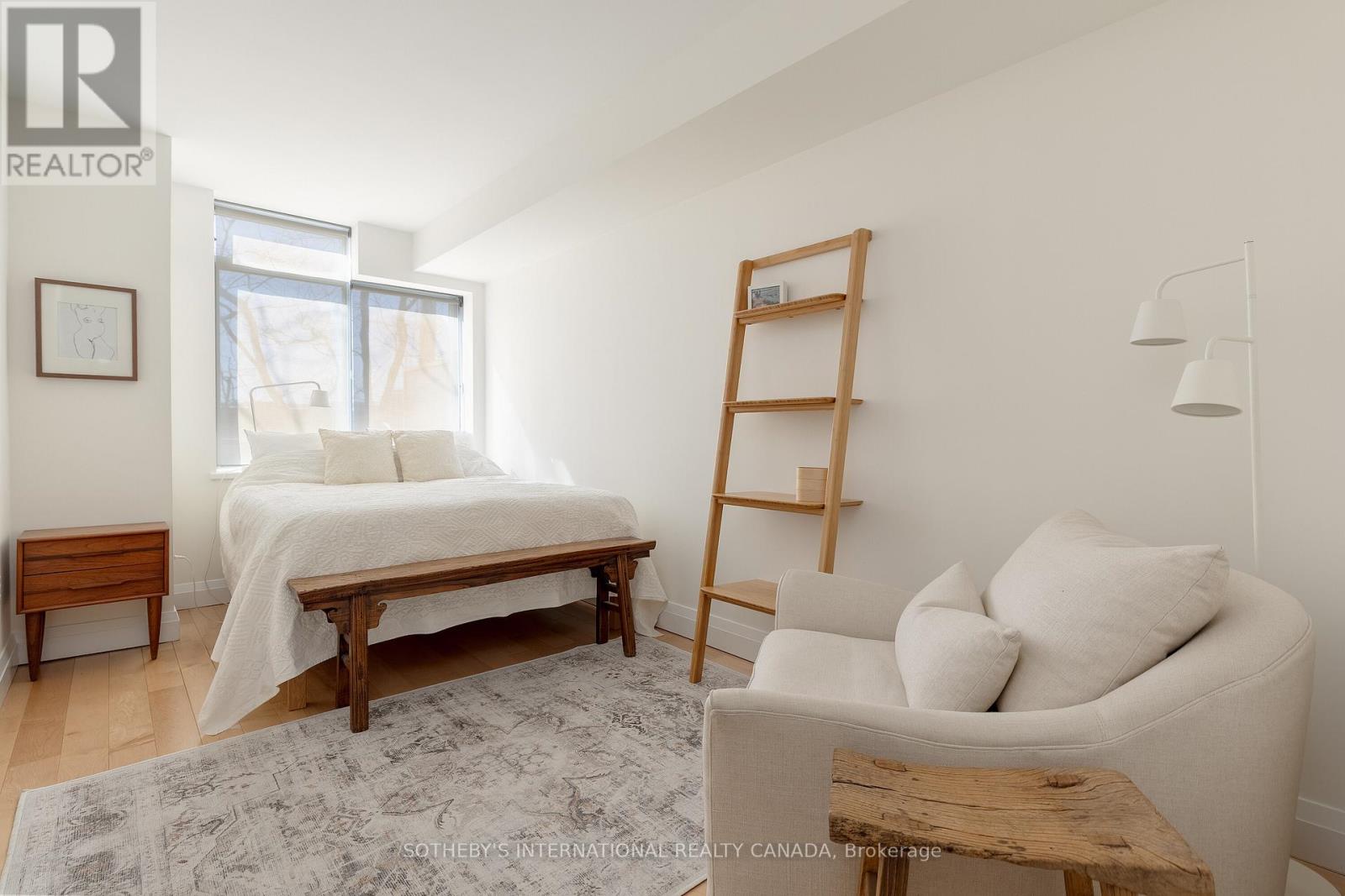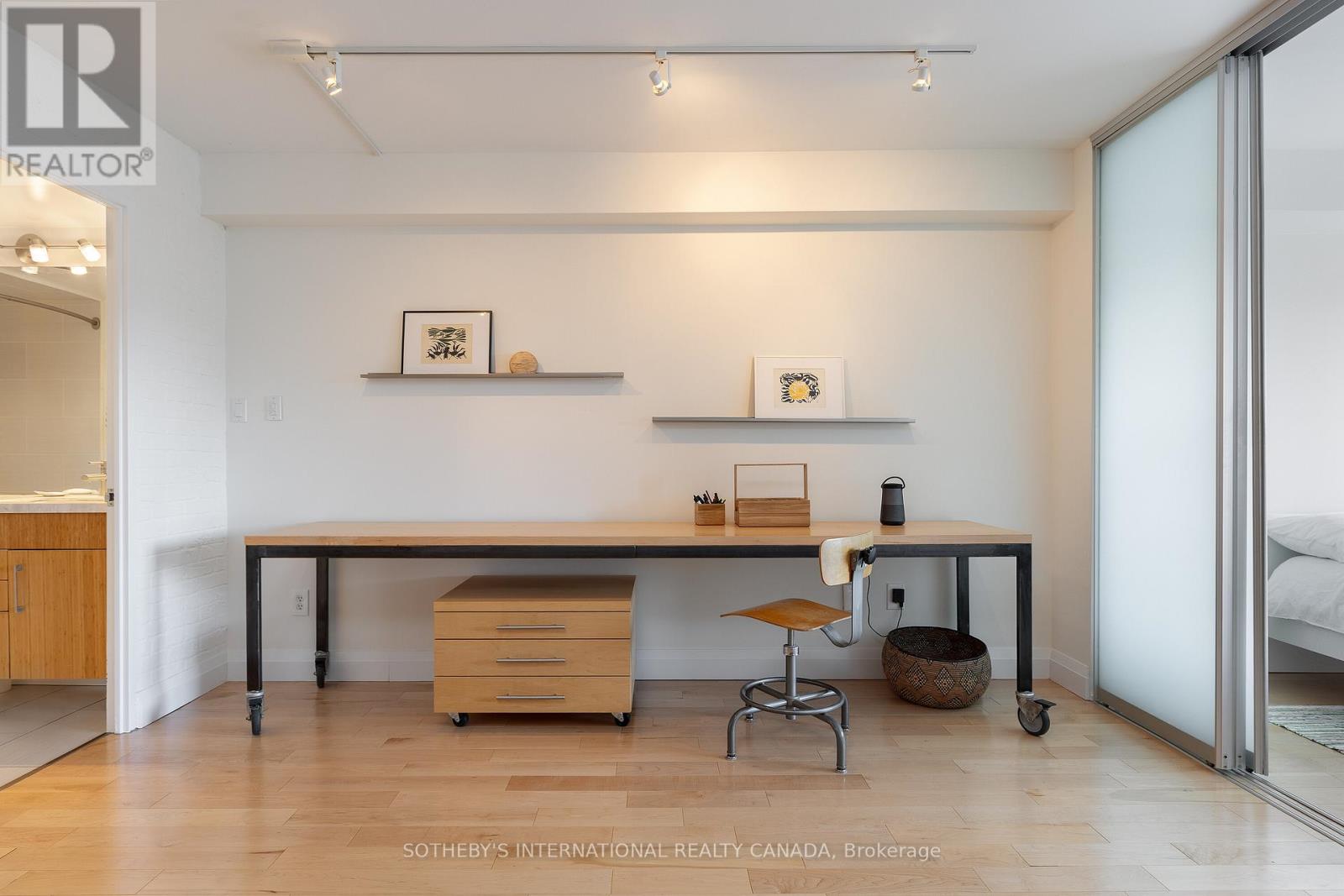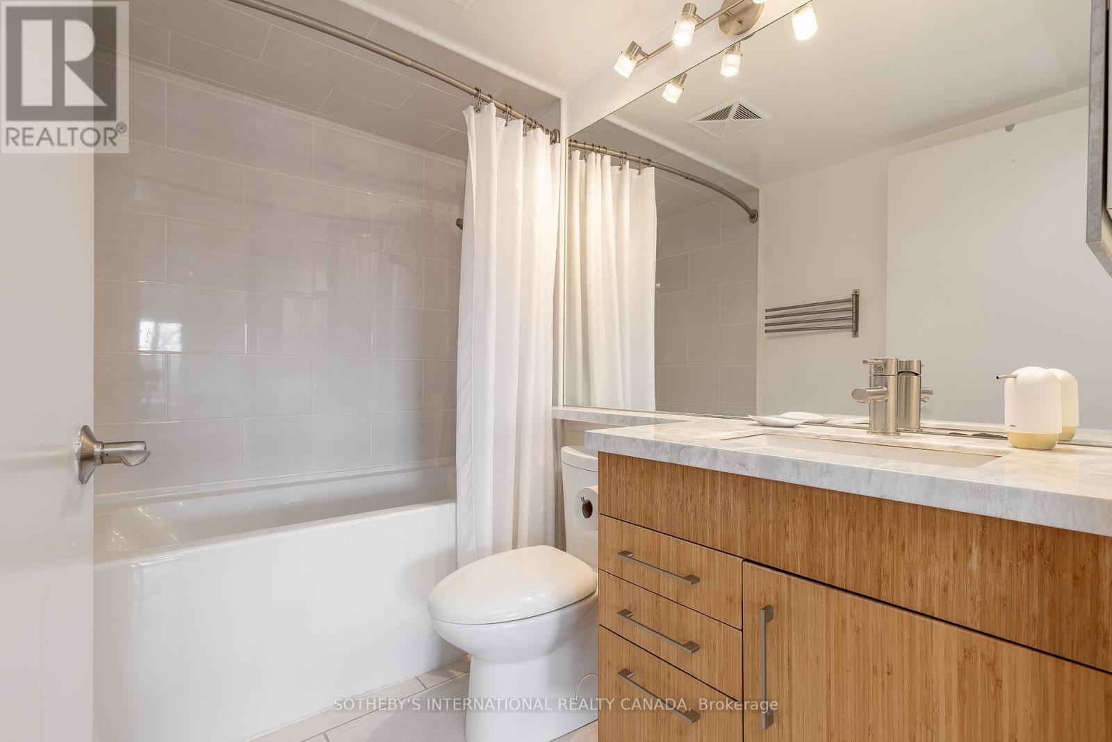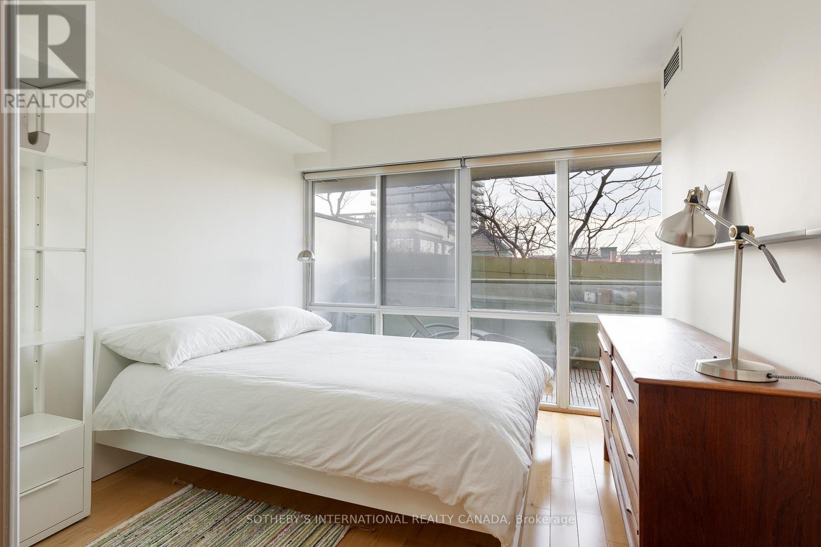 Offering a composed expression of city living with the historic Distillery District, this fully furnished two bedroom, two bathroom suite is thoughtfully arranged as a turnkey short term residence, designed for ease, comfort and flexibility. Hardwood floors and integrated millwork create a cohesive interior, while the updated kitchen anchors the living space with a centre island, bamboo cabinetry, stainless steel appliances, and generous preparation space. Natural light moves easily through the combined living and dining areas, framed by floor to ceiling south facing windows and a walkout to a large private balcony. The suite's split bedroom plan provides both privacy and adaptability. The primary bedroom features a walk in closet, a well proportioned ensuite bathroom, and a quiet south facing outlook. The second bedroom offers versatility as a guest room, office, or extended living space, also benefiting from southern exposure. Warm materials, refined finishes, and an intuitive layout establish a calm contemporary atmosphere. Offered fully furnished and configured for short term occupancy, the suite is ideally suited for executives, relocations, and professionals seeking a refined, turnkey residence in the city. Positioned within one of Toronto's most distinctive neighbourhoods, the Distillery District's cobblestone streets, galleries, cafés, and restaurants unfold just outside the door. Convenient access to the Financial District, St Lawrence Market, King East, transit, and major routes further enhances its ease of living. Parking and a bicycle are included. (id:43681)