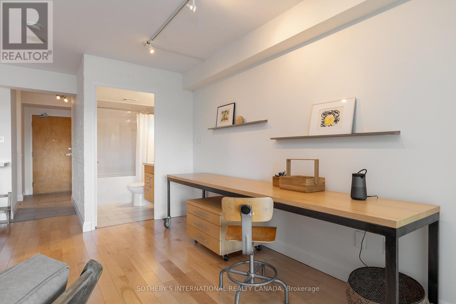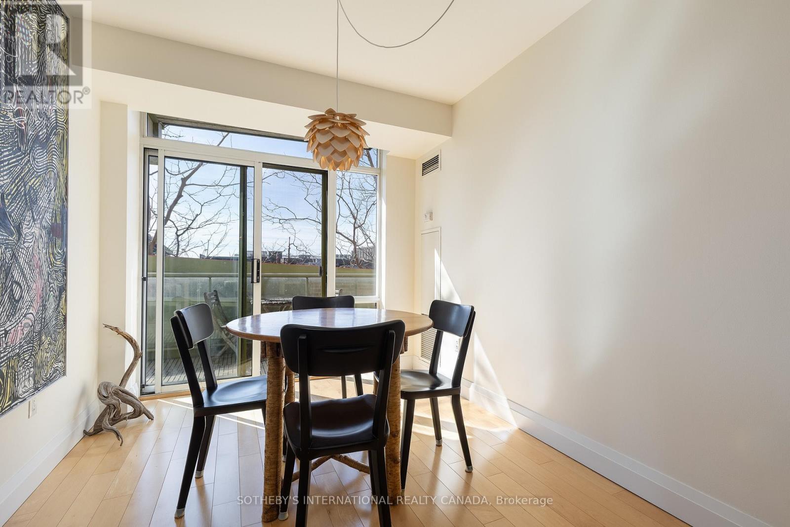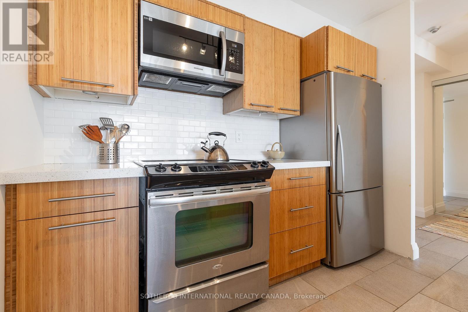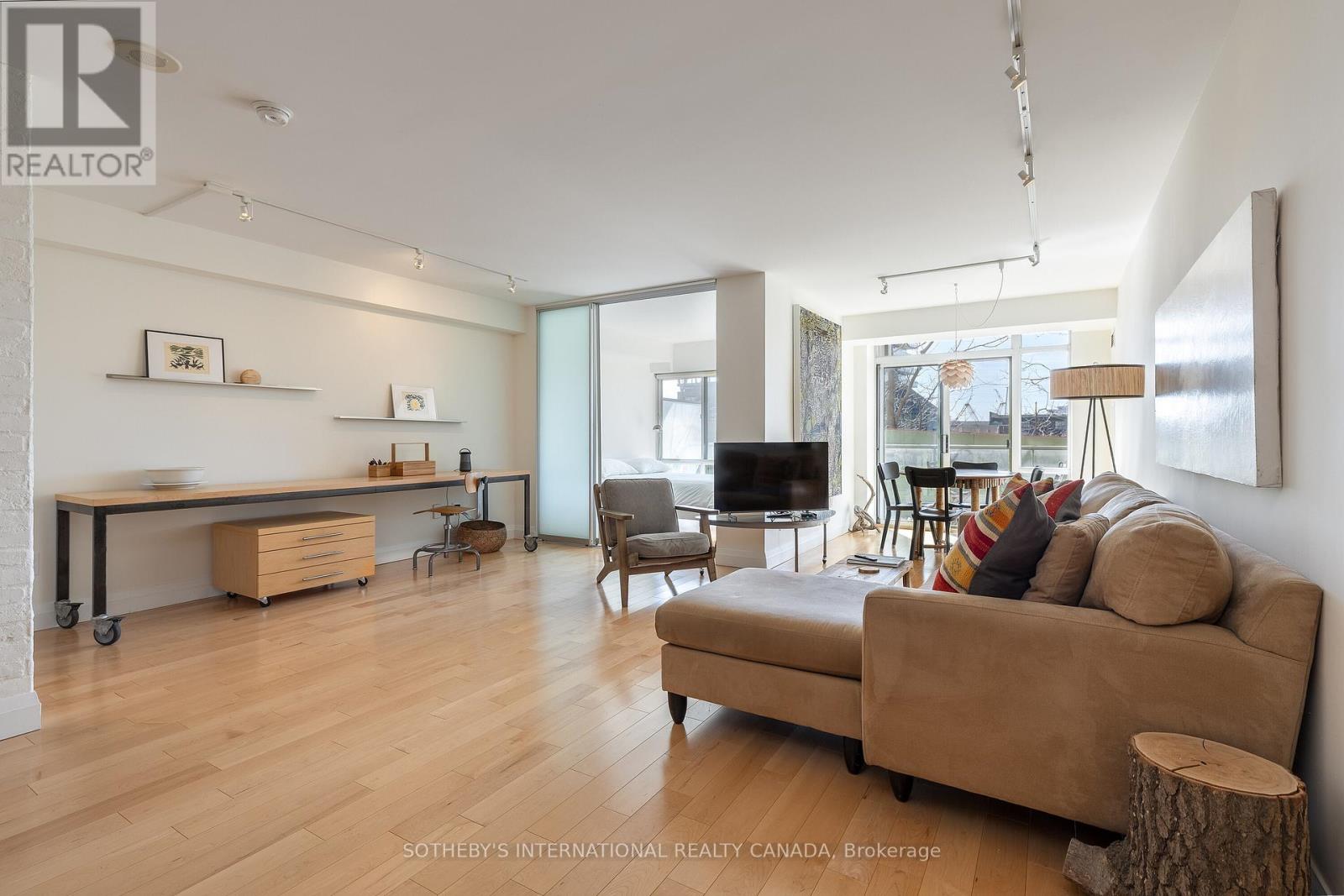 Offering a composed expression of city living with the historic Distillery District, this fully furnished two bedroom, two bathroom suite is thoughtfully arranged as a turnkey short term residence, designed for ease, comfort and flexibility. Hardwood floors and integrated millwork create a cohesive interior, while the updated kitchen anchors the living space with a centre island, bamboo cabinetry, stainless steel appliances, and generous preparation space. Natural light moves easily through the combined living and dining areas, framed by floor to ceiling south facing windows and a walkout to a large private balcony. The suite's split bedroom plan provides both privacy and adaptability. The primary bedroom features a walk in closet, a well proportioned ensuite bathroom, and a quiet south facing outlook. The second bedroom offers versatility as a guest room, office, or extended living space, also benefiting from southern exposure. Warm materials, refined finishes, and an intuitive layout establish a calm contemporary atmosphere. Offered fully furnished and configured for short term occupancy, the suite is ideally suited for executives, relocations, and professionals seeking a refined, turnkey residence in the city. Positioned within one of Toronto's most distinctive neighbourhoods, the Distillery District's cobblestone streets, galleries, cafés, and restaurants unfold just outside the door. Convenient access to the Financial District, St Lawrence Market, King East, transit, and major routes further enhances its ease of living. Parking and a bicycle are included. (id:43681)