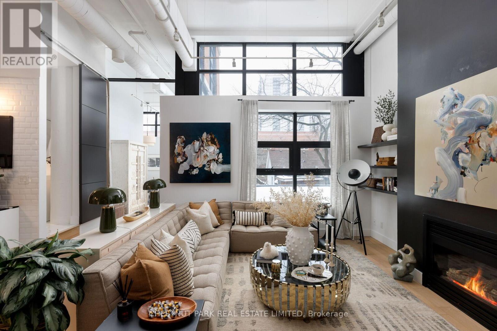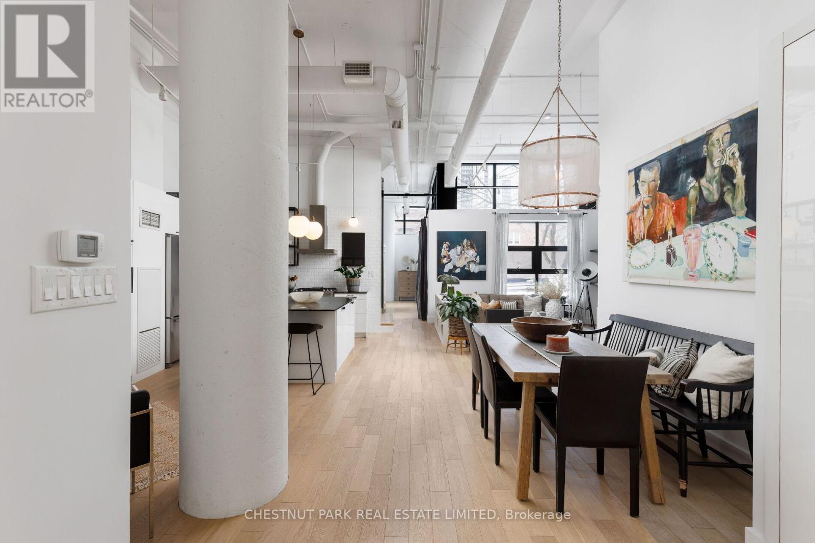 $1,211.52 每月***Open House Sunday 2-4 pm*** This loft is inspirational. Bright, airy, and undeniably authentic, this magazine-worthy residence at 90 Sumach captures the essence of loft living. Soaring 14-foot ceilings and expansive windows flood the approximately 1,600 square feet with natural light, amplifying the scale and architectural integrity of the original conversion. Timeless, neutral renovations honour the building's industrial roots while introducing refined, modern comfort. The kitchen is thoughtfully designed with stainless steel Jenn-Air appliances, custom cabinetry, marble countertops and generous workspace - equally suited to casual mornings or elevated entertaining. Defined living and dining areas create a sense of intention within the open plan with white oak floor throughout, balancing volume with function. Two well-proportioned bedrooms and two baths provide privacy and flexibility, while custom built-ins throughout add polish and practical storage. Life at 90 Sumach, formerly known as Brewery Lofts, extends beyond the suite. Mingle with neighbours on the landscaped rooftop terrace and take in city views above the treetops. Step outside to explore the cafes, parks, and restaurants of Corktown, Leslieville, and the Distillery District, with quick access to the DVP, Gardiner Expressway, Union Station, and financial district. The building needs little introduction - one of Toronto's most celebrated loft conversions, known for its scale, character, and enduring appeal. For those who understand true loft living, this one speaks for itself. Authentic volume, timeless architecture, unmistakable presence. (id:43681)