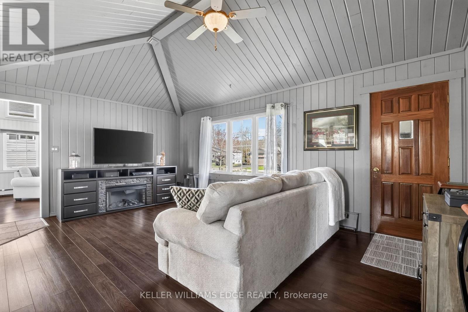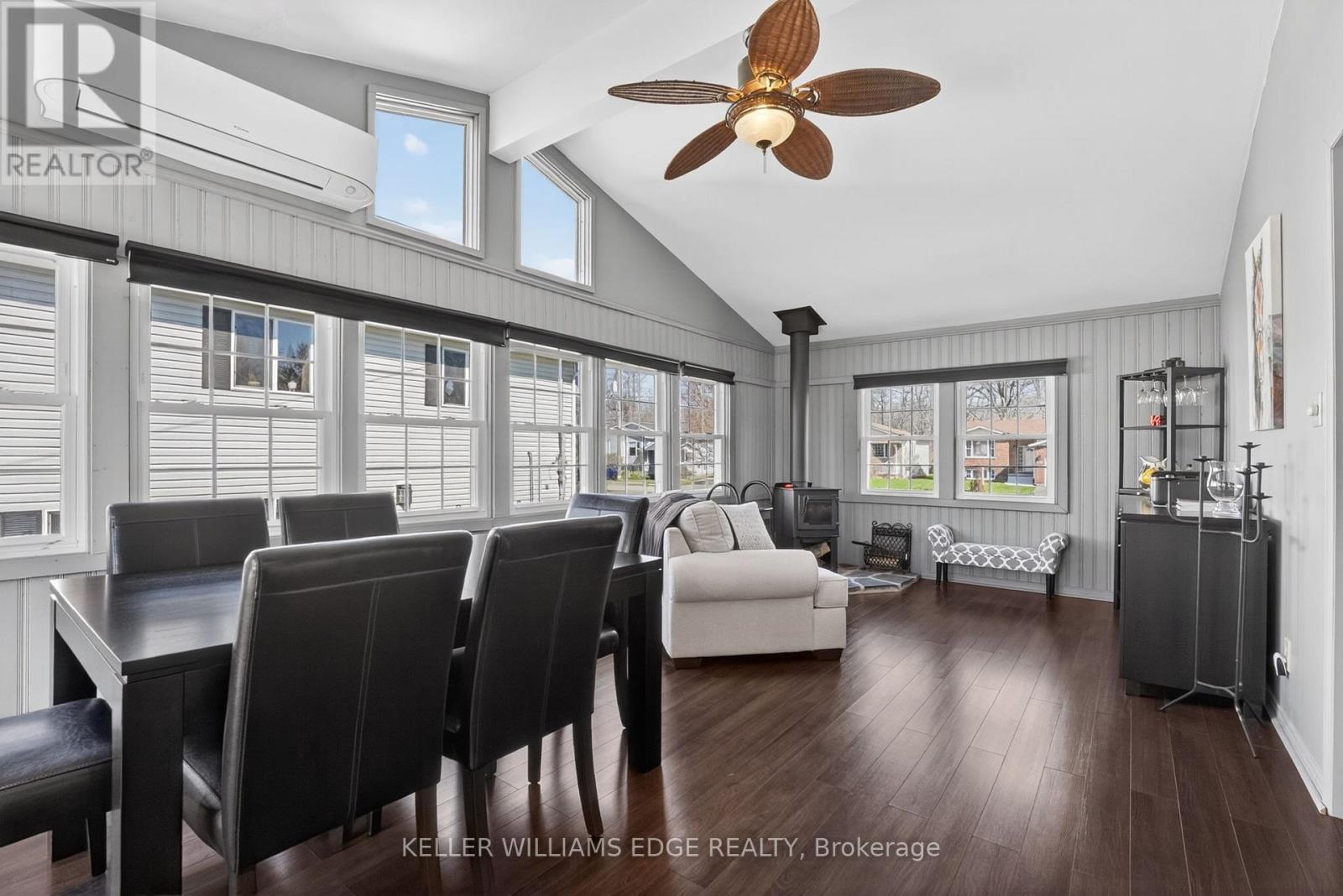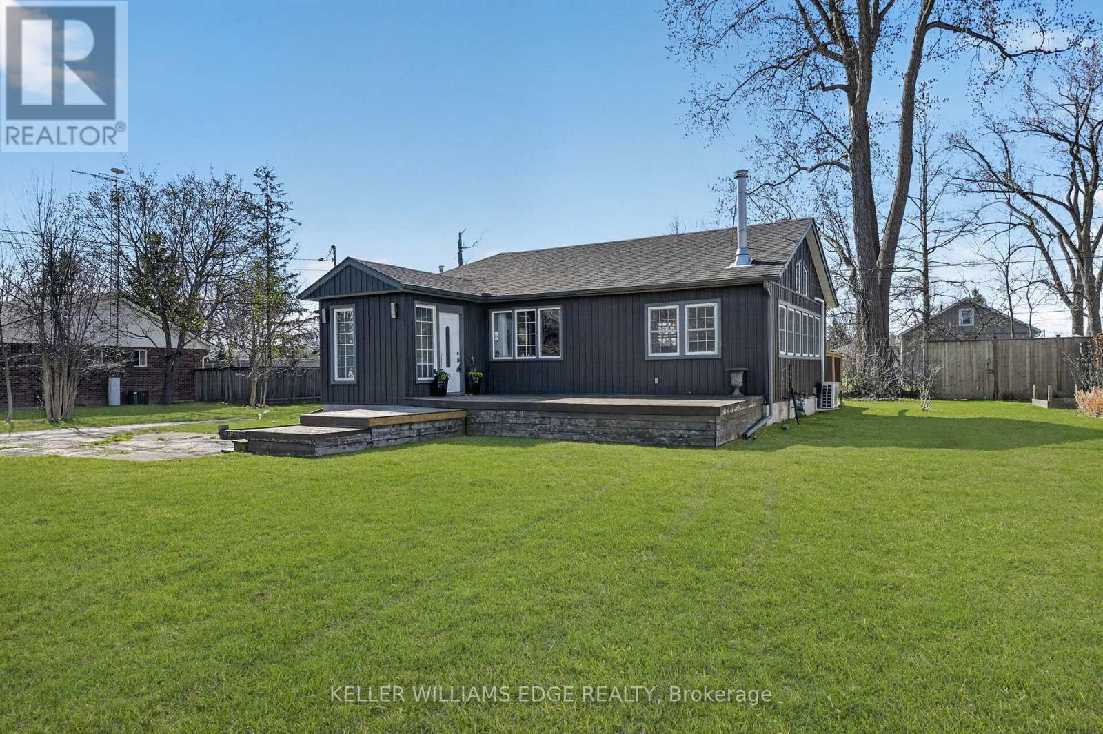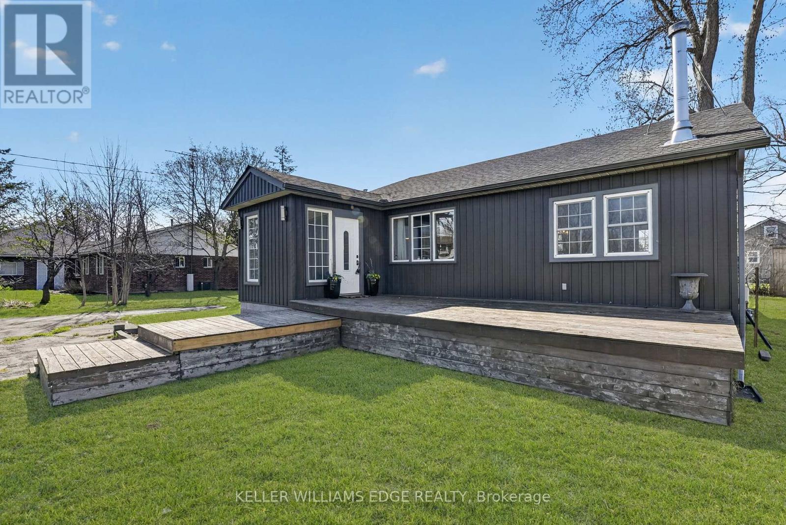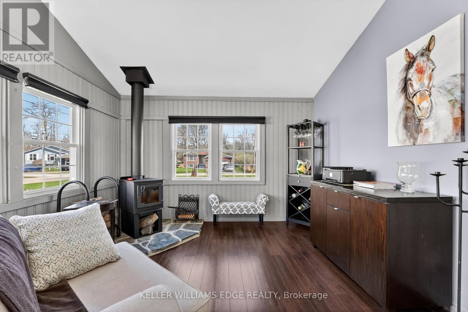 This gorgeous 1149 sq ft bungalow stands out with its modern dark exterior, a front deck lounging space, and an expansive multi-tiered deck spanning the entire back of the home, perfect for summer evenings, entertaining, or quiet mornings. Inside the front door, a spacious foyer/mudroom adds everyday function and storage, leading into the grand living area where a soaring vaulted ceiling and vertical wood slat walls create a warm, inviting space rich in texture and character. The open-concept layout flows seamlessly from the kitchen into the dining area and secondary sitting space, all filled with natural light from oversized windows. Just off the dining area, a cozy sitting room with a wood-burning fireplace (2024) creates a natural extension of the living space, offering the perfect spot to unwind and enjoy a true cottage-like feel year-round. With two comfortable sized bedrooms, this home is perfectly suited for those looking to simplify or downsize without compromise. The spacious 4-piece bathroom features a jetted tub and separate shower, offering a relaxing retreat. The dedicated utility room with laundry enhances the ease of one-floor living. Located within walking distance to the beach and just minutes from historic downtown Ridgeway, you'll enjoy easy access to charming boutique shops, local restaurants, everyday amenities, and the beloved Ridgeway Farmers' Market, making it easy to embrace a relaxed, community-focused lifestyle you won't need to vacation from. Set on a generous 0.25-acre lot, this home offers a peaceful setting while still being close to everything you need. A rare opportunity for buyers seeking a cozy, move-in-ready home with character, just move in and enjoy! (id:43681)