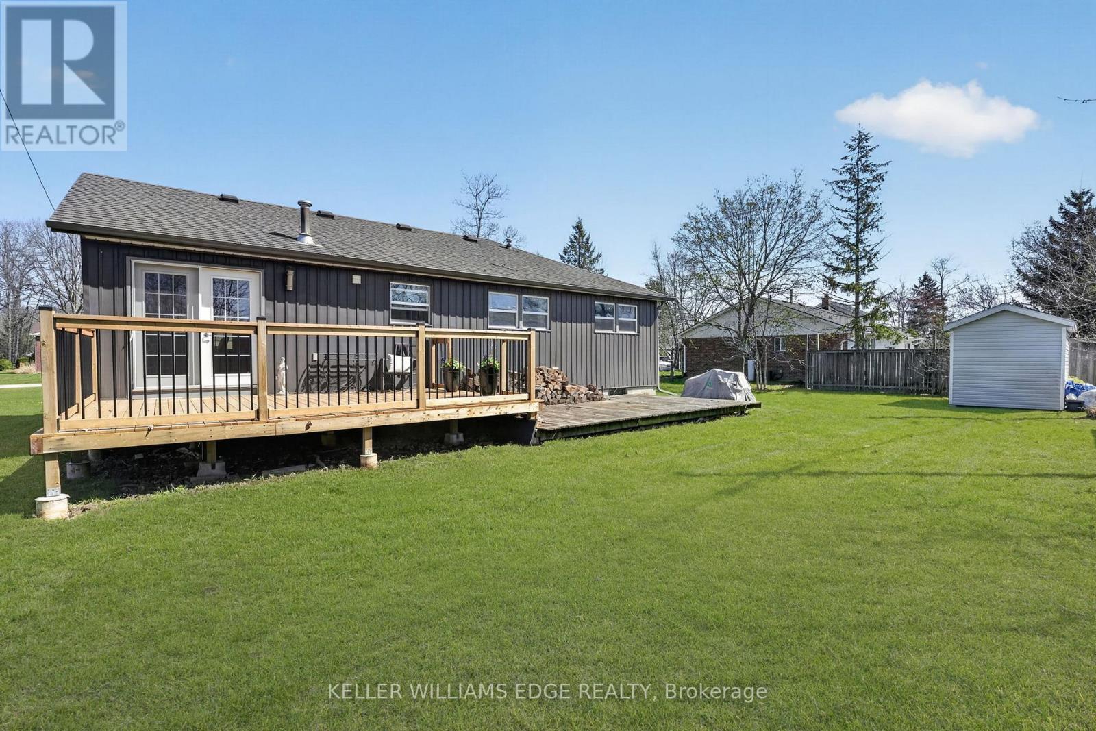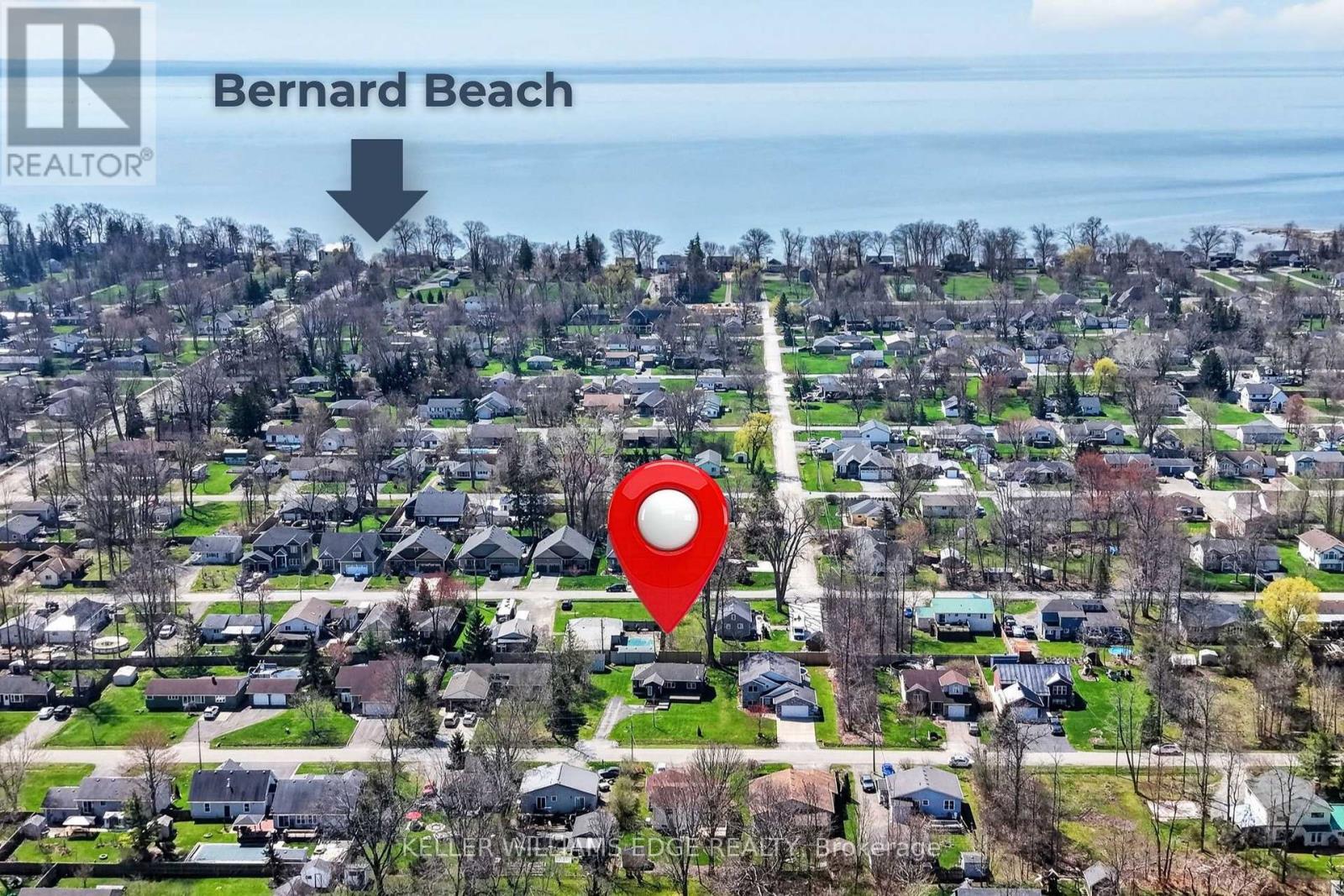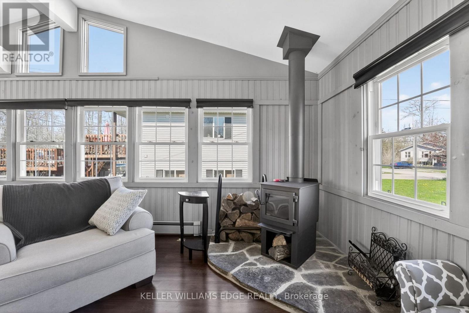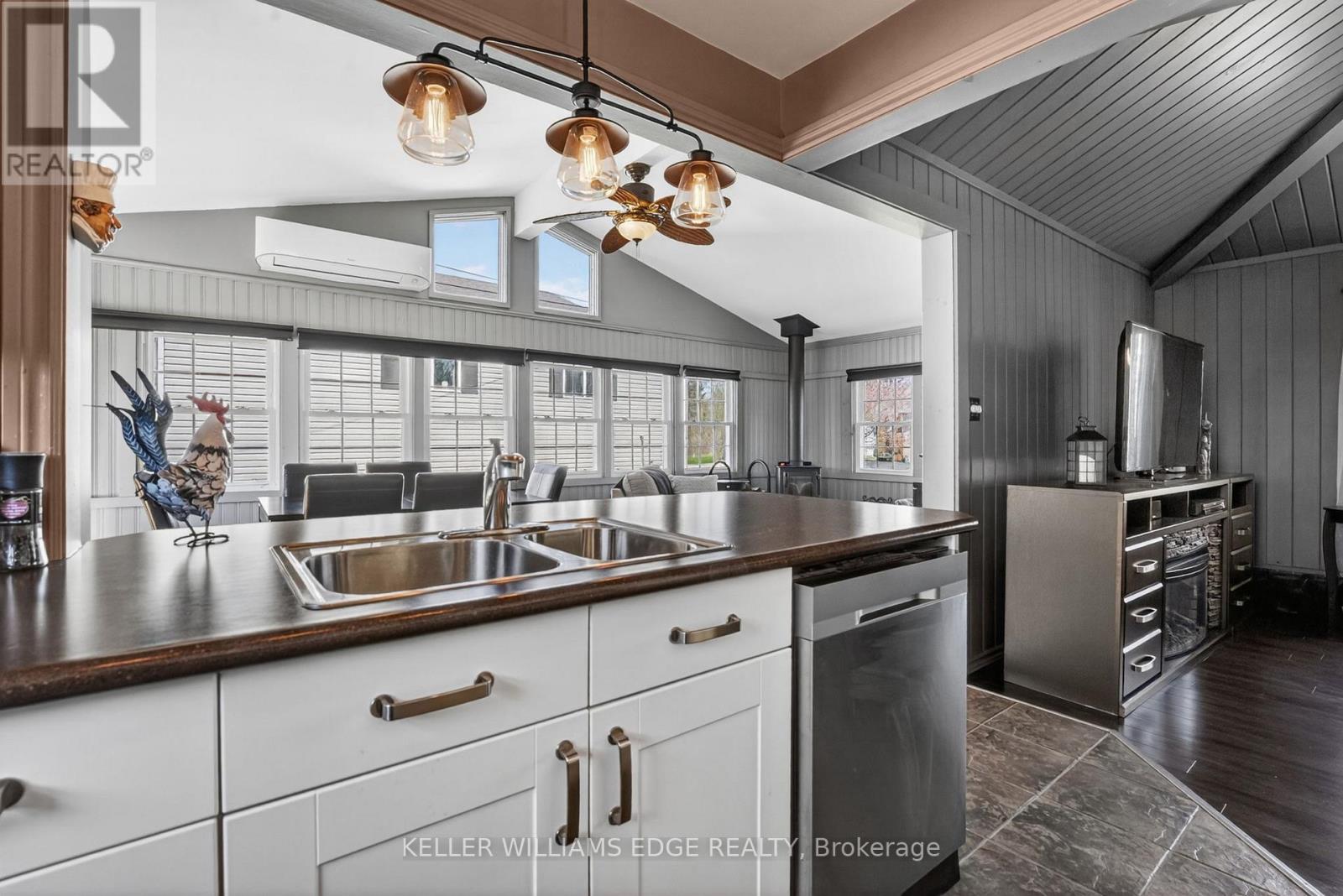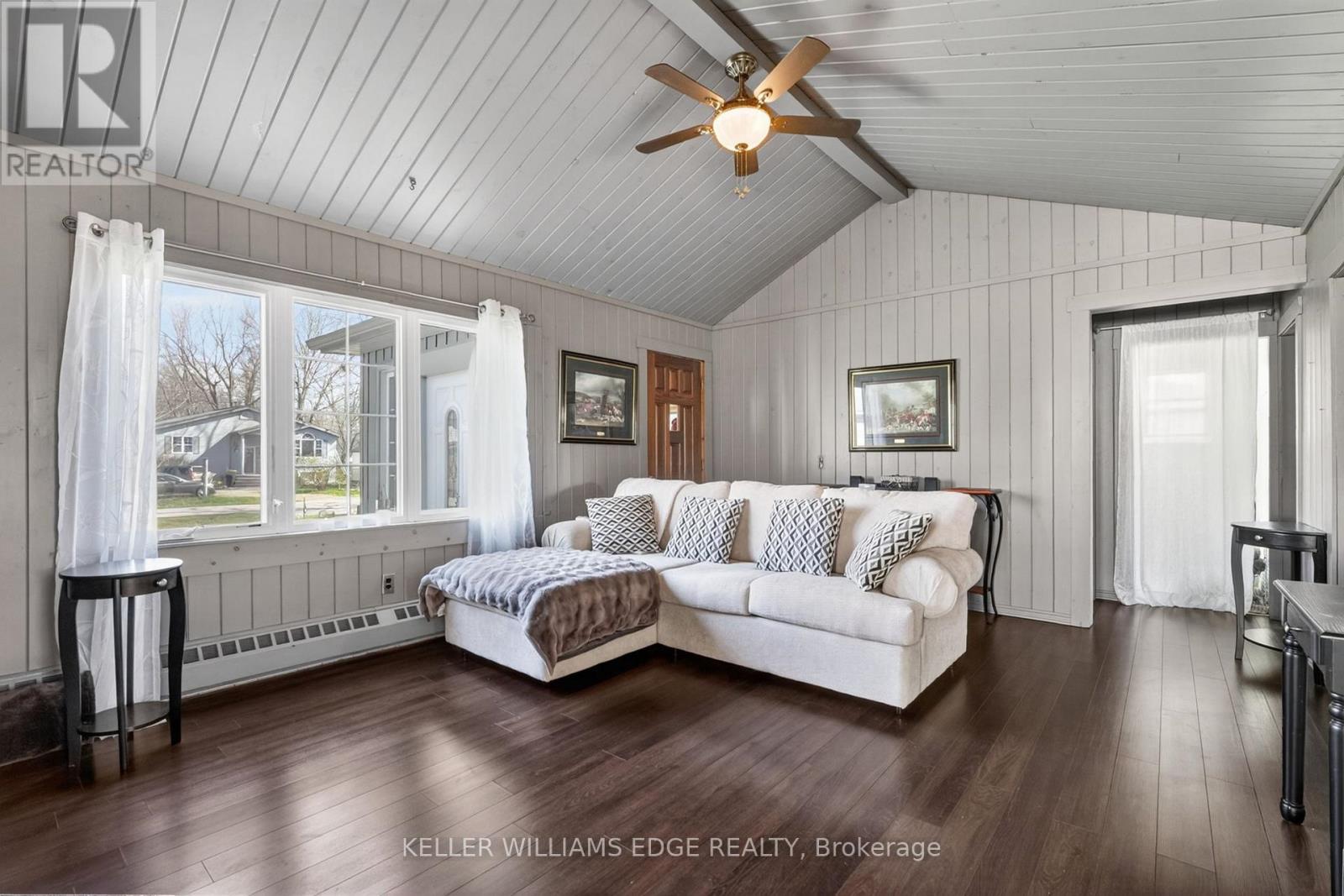This gorgeous 1149 sq ft bungalow stands out with its modern dark exterior, a front deck lounging space, and an expansive multi-tiered deck spanning the entire back of the home, perfect for summer evenings, entertaining, or quiet mornings. Inside the front door, a spacious foyer/mudroom adds everyday function and storage, leading into the grand living area where a soaring vaulted ceiling and vertical wood slat walls create a warm, inviting space rich in texture and character. The open-concept layout flows seamlessly from the kitchen into the dining area and secondary sitting space, all filled with natural light from oversized windows. Just off the dining area, a cozy sitting room with a wood-burning fireplace (2024) creates a natural extension of the living space, offering the perfect spot to unwind and enjoy a true cottage-like feel year-round. With two comfortable sized bedrooms, this home is perfectly suited for those looking to simplify or downsize without compromise. The spacious 4-piece bathroom features a jetted tub and separate shower, offering a relaxing retreat. The dedicated utility room with laundry enhances the ease of one-floor living. Located within walking distance to the beach and just minutes from historic downtown Ridgeway, you'll enjoy easy access to charming boutique shops, local restaurants, everyday amenities, and the beloved Ridgeway Farmers' Market, making it easy to embrace a relaxed, community-focused lifestyle you won't need to vacation from. Set on a generous 0.25-acre lot, this home offers a peaceful setting while still being close to everything you need. A rare opportunity for buyers seeking a cozy, move-in-ready home with character, just move in and enjoy! (id:43681)