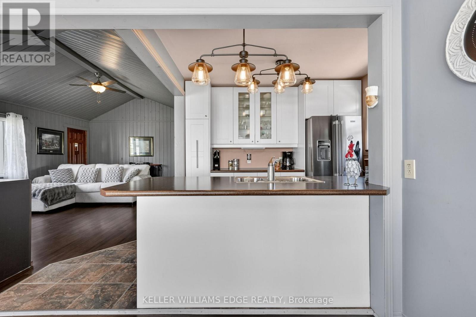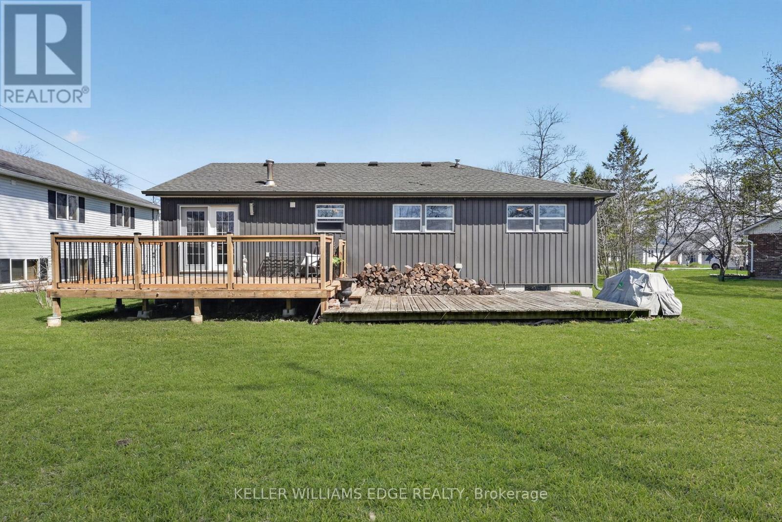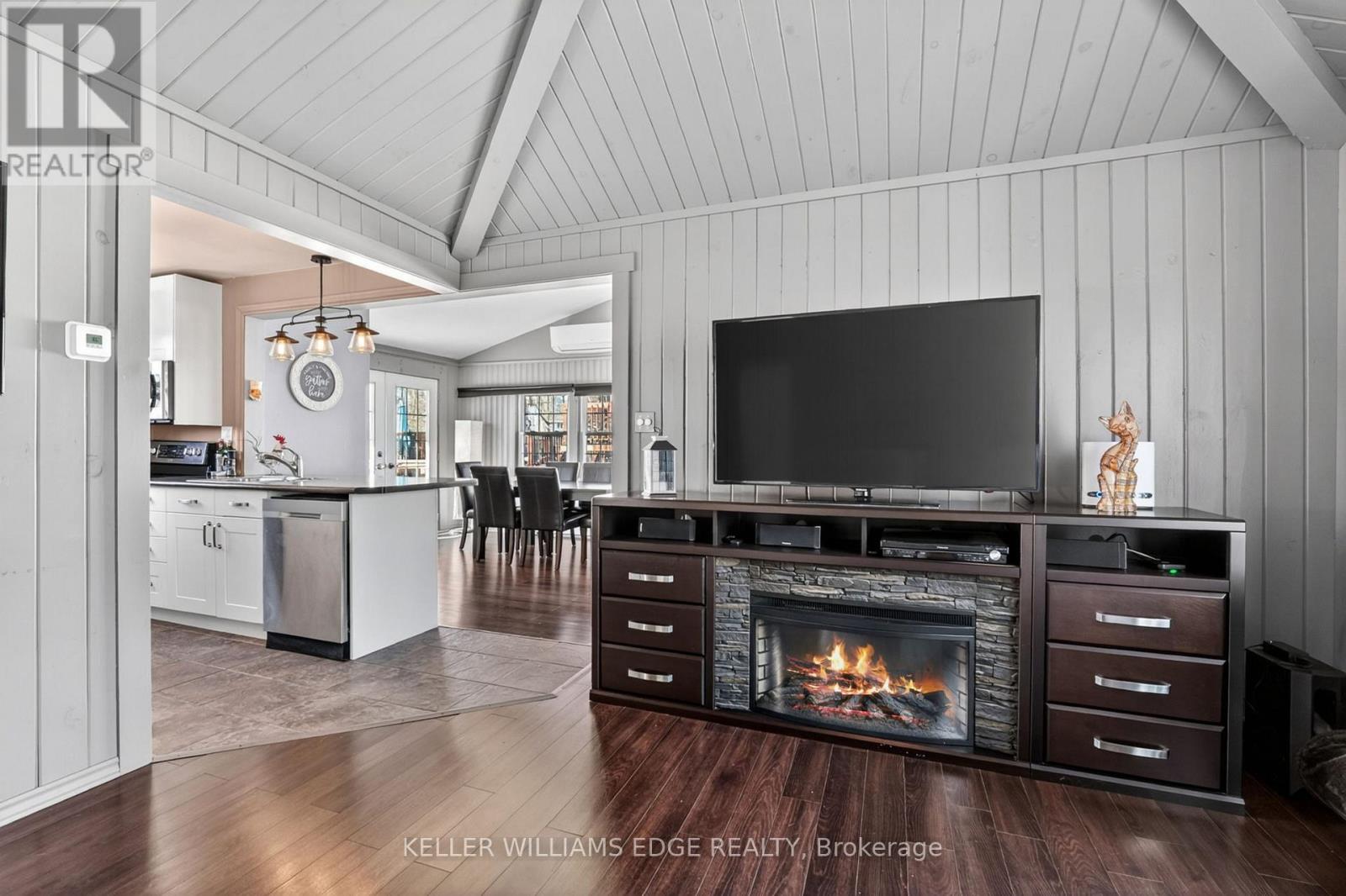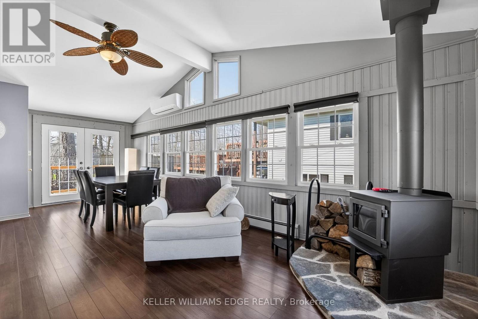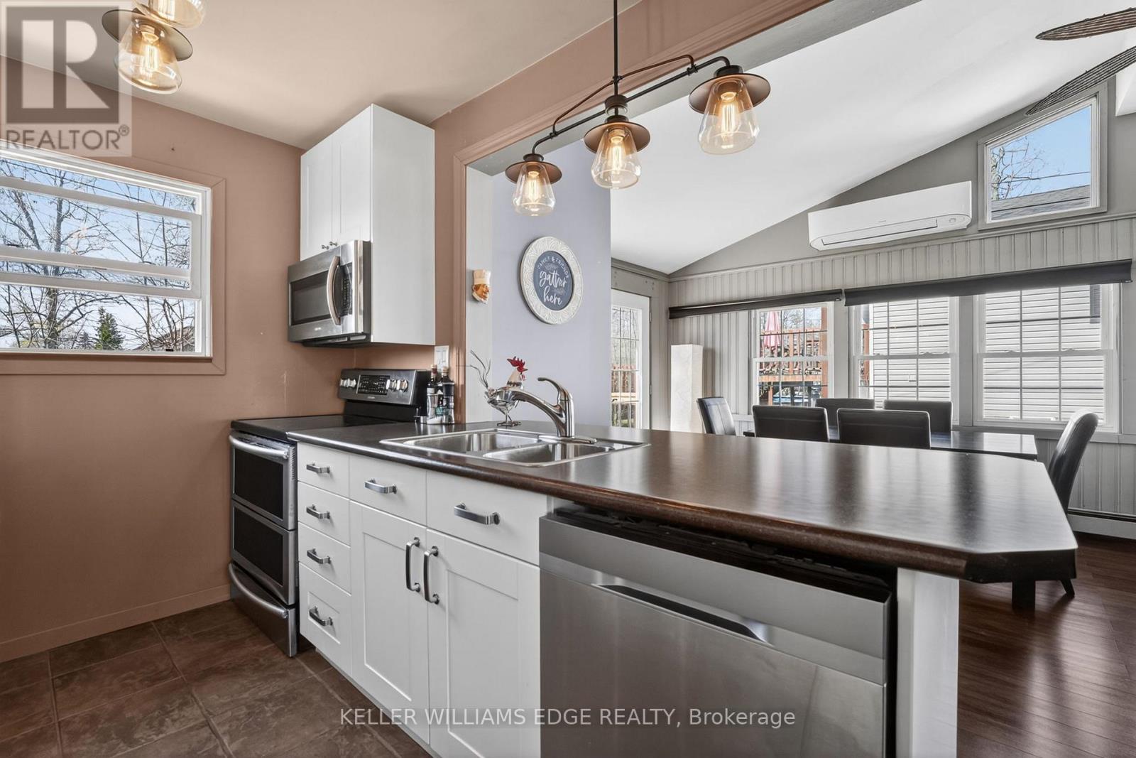 This gorgeous 1149 sq ft bungalow stands out with its modern dark exterior, a front deck lounging space, and an expansive multi-tiered deck spanning the entire back of the home, perfect for summer evenings, entertaining, or quiet mornings. Inside the front door, a spacious foyer/mudroom adds everyday function and storage, leading into the grand living area where a soaring vaulted ceiling and vertical wood slat walls create a warm, inviting space rich in texture and character. The open-concept layout flows seamlessly from the kitchen into the dining area and secondary sitting space, all filled with natural light from oversized windows. Just off the dining area, a cozy sitting room with a wood-burning fireplace (2024) creates a natural extension of the living space, offering the perfect spot to unwind and enjoy a true cottage-like feel year-round. With two comfortable sized bedrooms, this home is perfectly suited for those looking to simplify or downsize without compromise. The spacious 4-piece bathroom features a jetted tub and separate shower, offering a relaxing retreat. The dedicated utility room with laundry enhances the ease of one-floor living. Located within walking distance to the beach and just minutes from historic downtown Ridgeway, you'll enjoy easy access to charming boutique shops, local restaurants, everyday amenities, and the beloved Ridgeway Farmers' Market, making it easy to embrace a relaxed, community-focused lifestyle you won't need to vacation from. Set on a generous 0.25-acre lot, this home offers a peaceful setting while still being close to everything you need. A rare opportunity for buyers seeking a cozy, move-in-ready home with character, just move in and enjoy! (id:43681)
