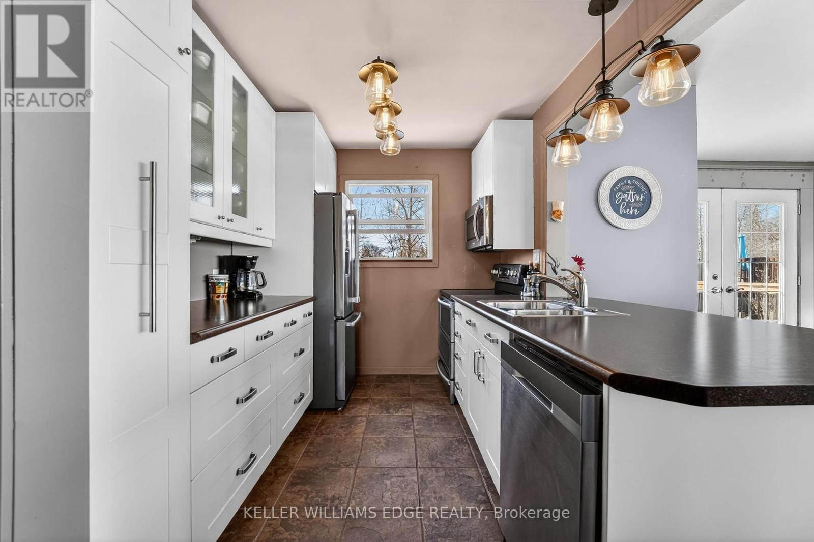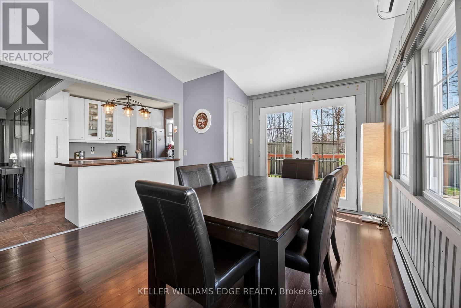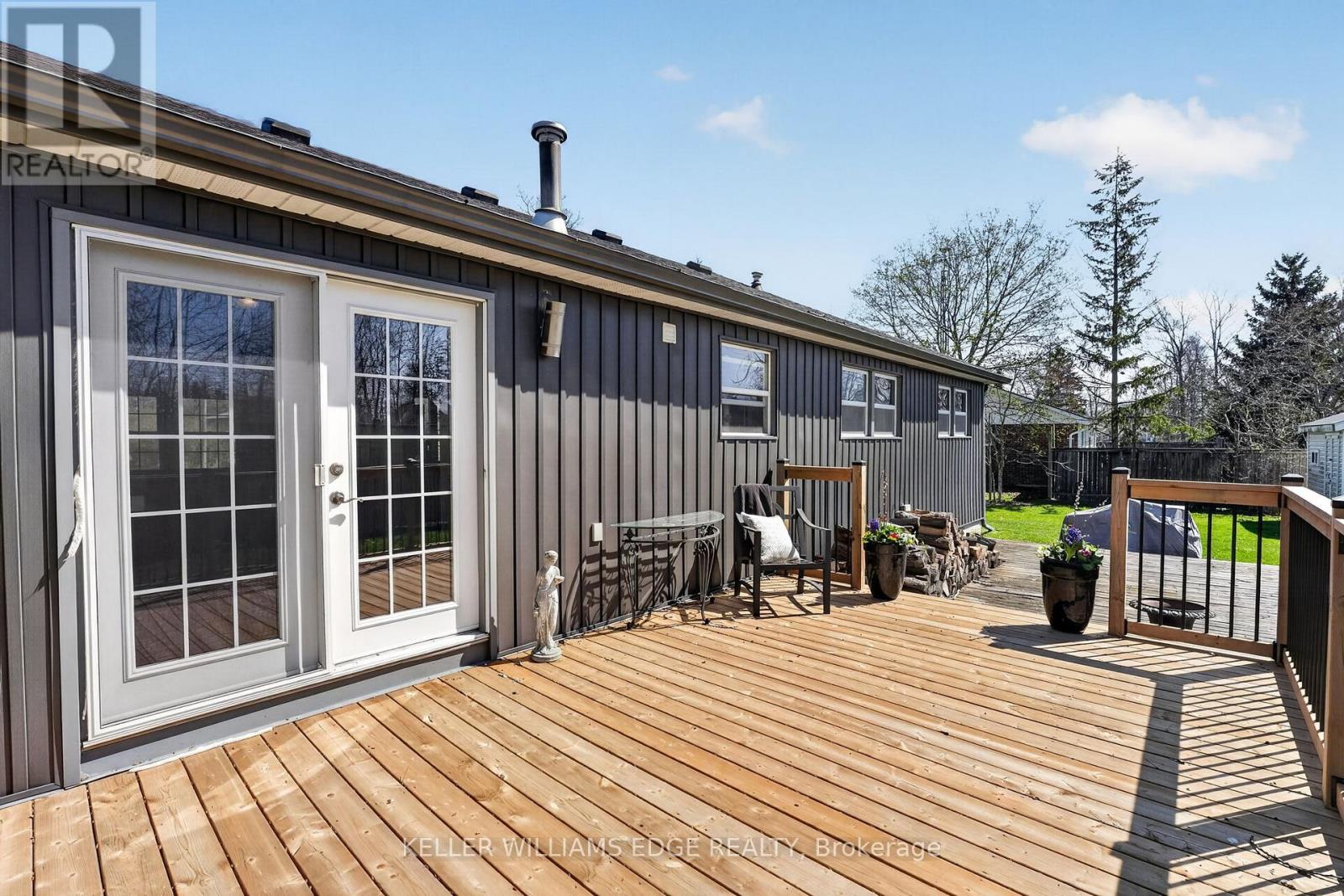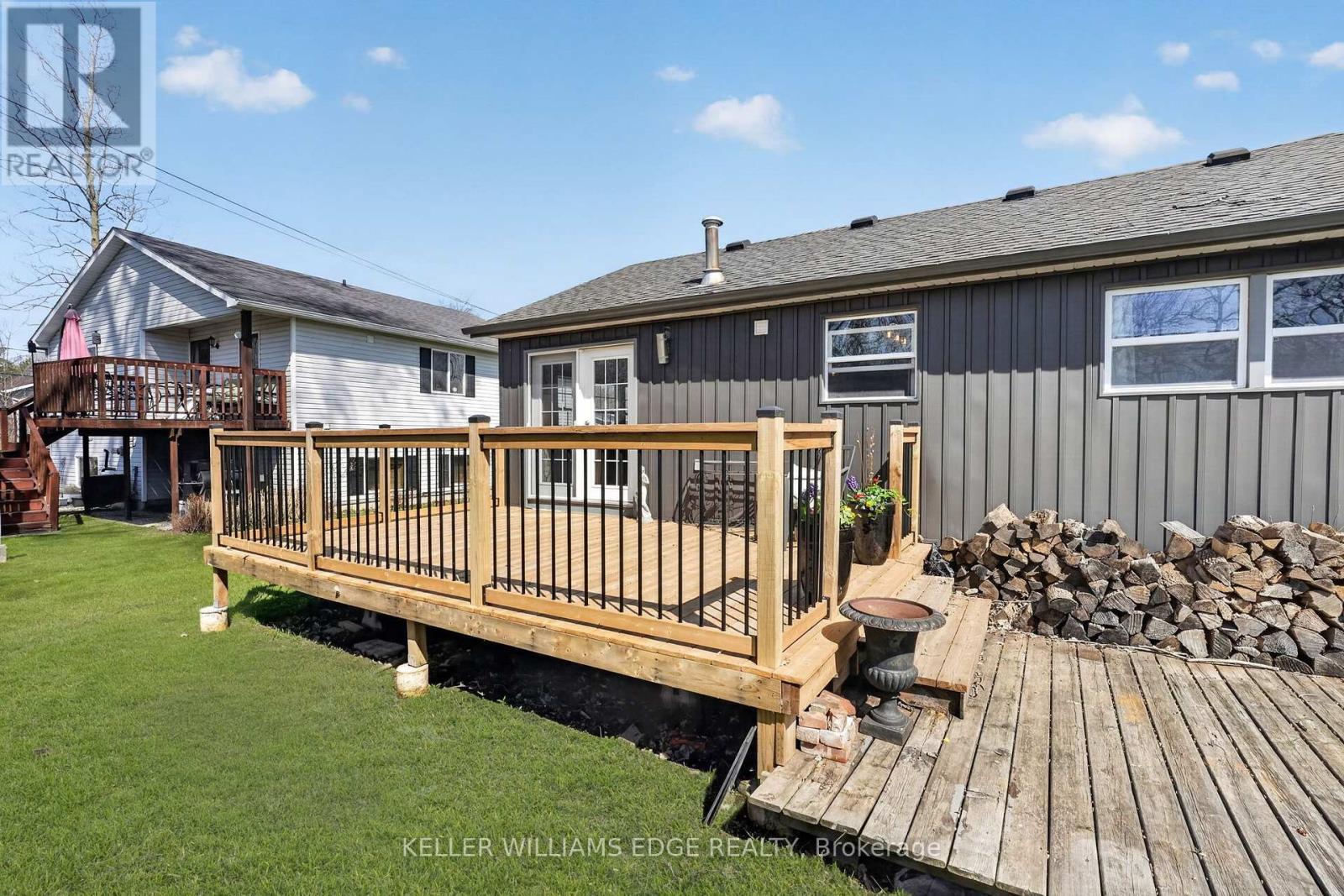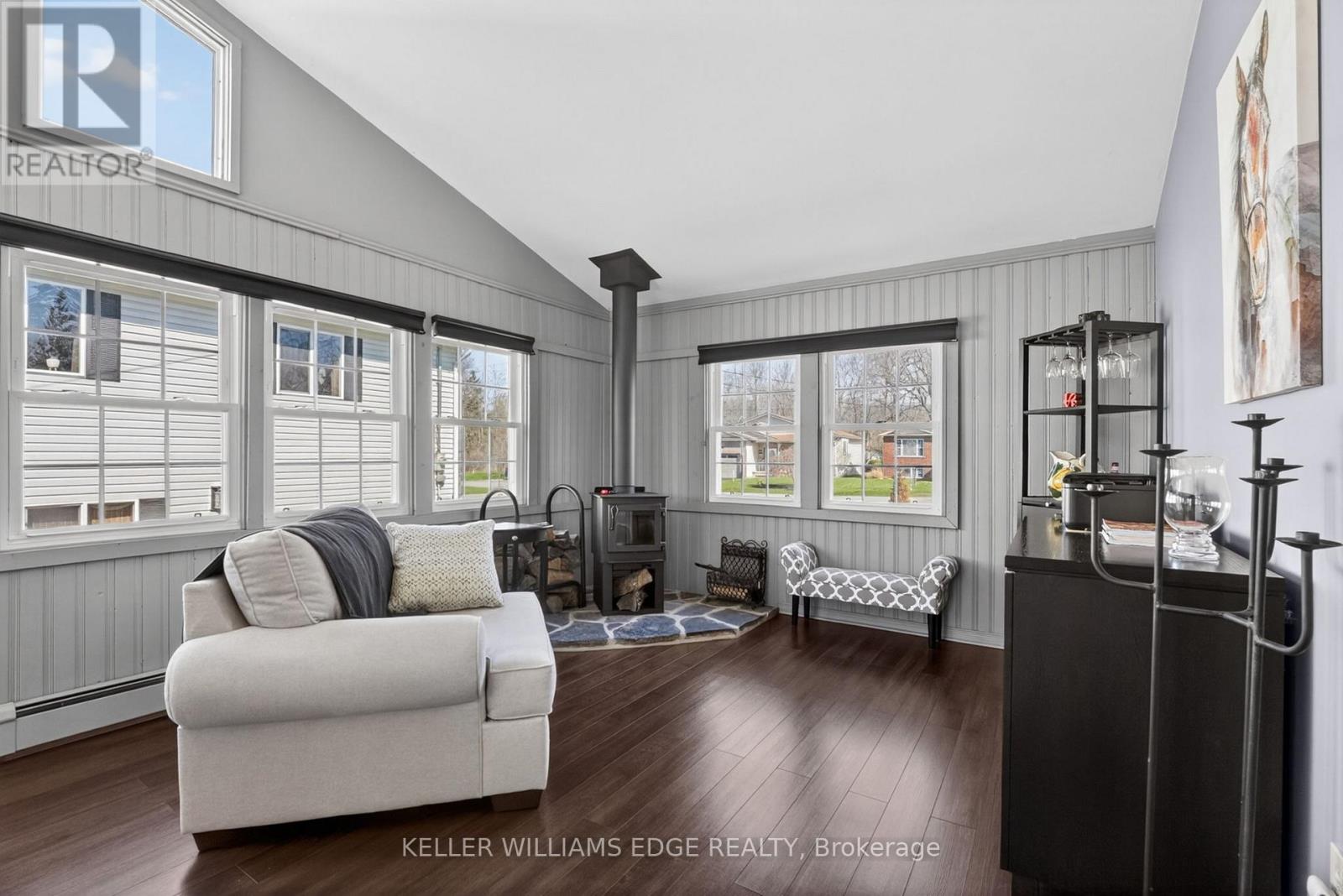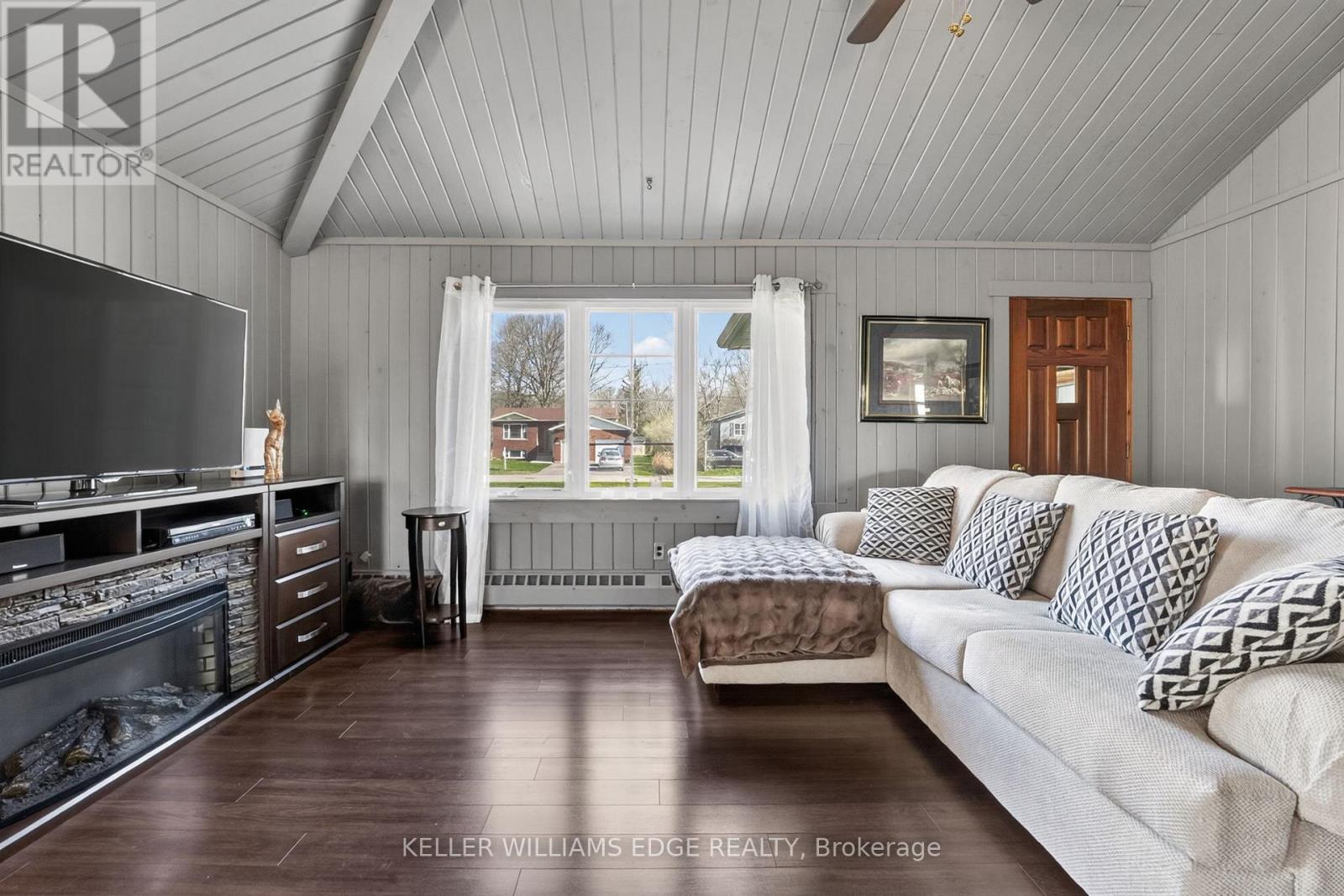 This gorgeous 1149 sq ft bungalow stands out with its modern dark exterior, a front deck lounging space, and an expansive multi-tiered deck spanning the entire back of the home, perfect for summer evenings, entertaining, or quiet mornings. Inside the front door, a spacious foyer/mudroom adds everyday function and storage, leading into the grand living area where a soaring vaulted ceiling and vertical wood slat walls create a warm, inviting space rich in texture and character. The open-concept layout flows seamlessly from the kitchen into the dining area and secondary sitting space, all filled with natural light from oversized windows. Just off the dining area, a cozy sitting room with a wood-burning fireplace (2024) creates a natural extension of the living space, offering the perfect spot to unwind and enjoy a true cottage-like feel year-round. With two comfortable sized bedrooms, this home is perfectly suited for those looking to simplify or downsize without compromise. The spacious 4-piece bathroom features a jetted tub and separate shower, offering a relaxing retreat. The dedicated utility room with laundry enhances the ease of one-floor living. Located within walking distance to the beach and just minutes from historic downtown Ridgeway, you'll enjoy easy access to charming boutique shops, local restaurants, everyday amenities, and the beloved Ridgeway Farmers' Market, making it easy to embrace a relaxed, community-focused lifestyle you won't need to vacation from. Set on a generous 0.25-acre lot, this home offers a peaceful setting while still being close to everything you need. A rare opportunity for buyers seeking a cozy, move-in-ready home with character, just move in and enjoy! (id:43681)