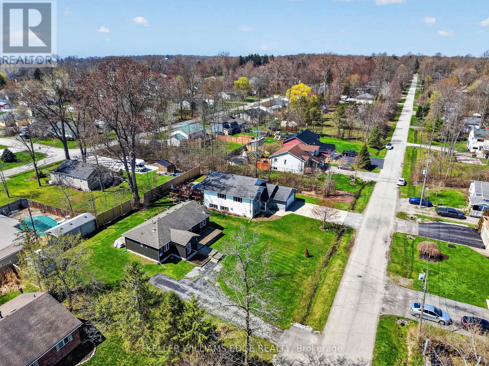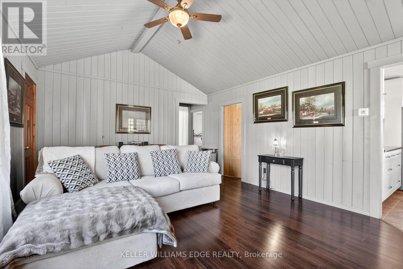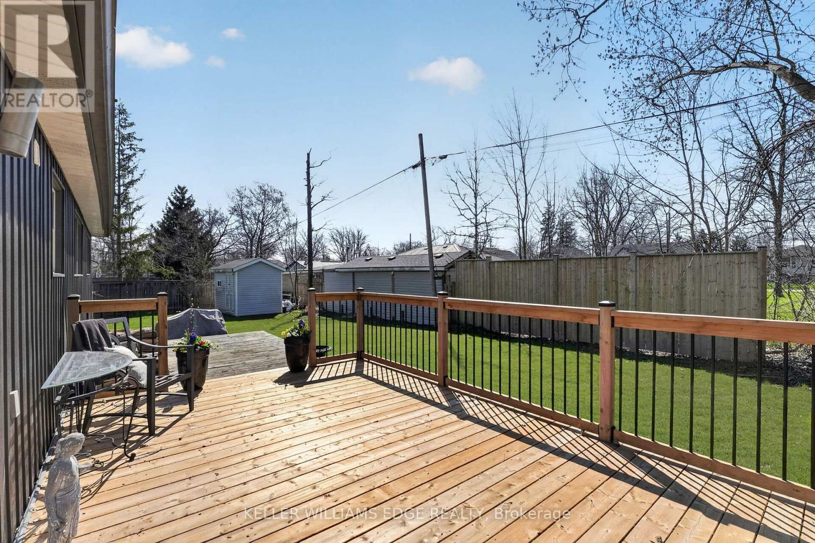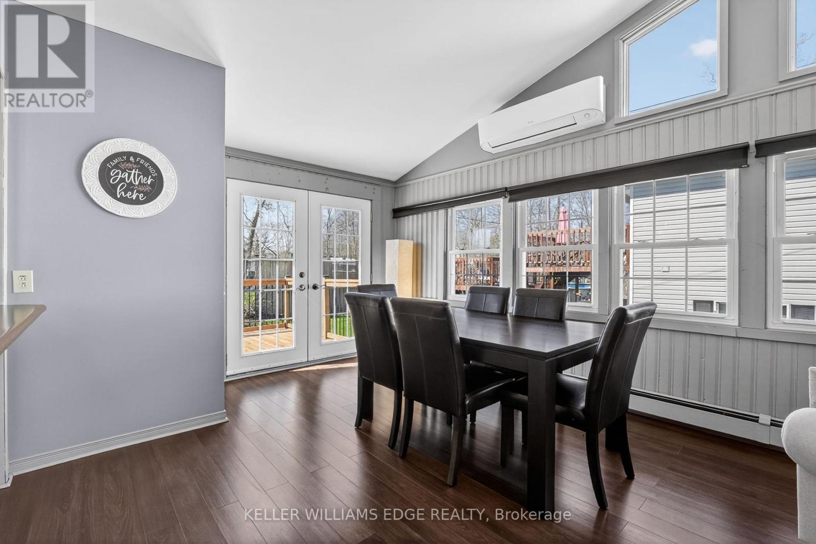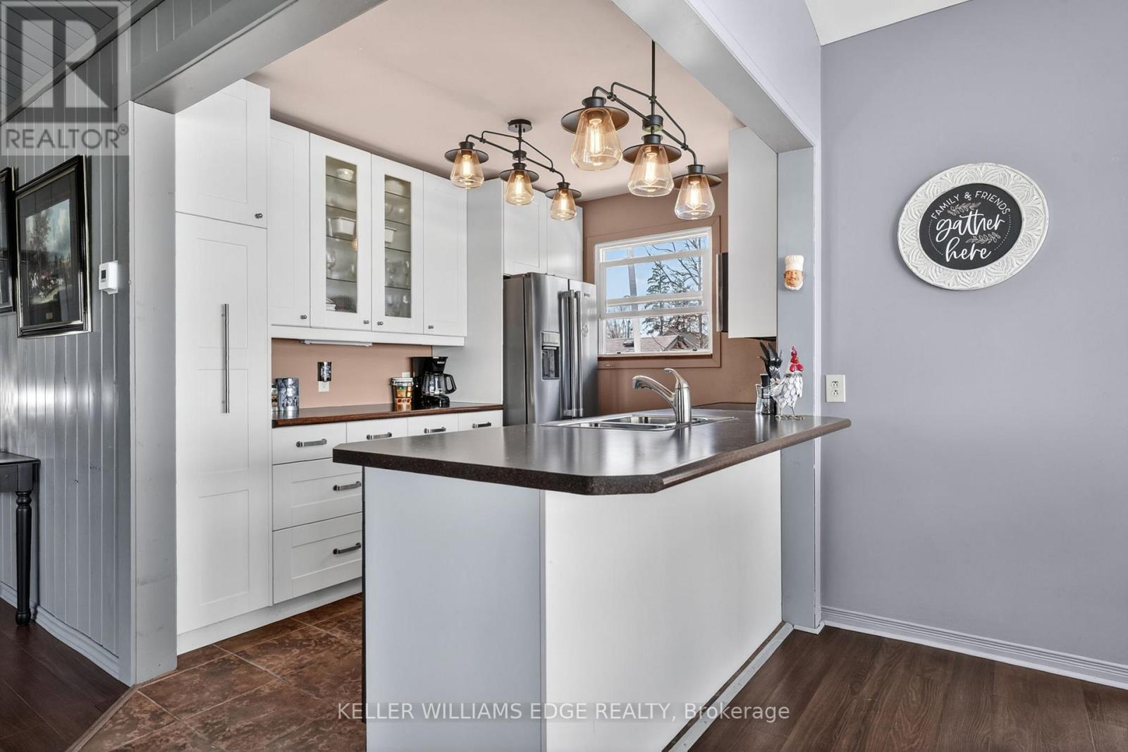 This gorgeous 1149 sq ft bungalow stands out with its modern dark exterior, a front deck lounging space, and an expansive multi-tiered deck spanning the entire back of the home, perfect for summer evenings, entertaining, or quiet mornings. Inside the front door, a spacious foyer/mudroom adds everyday function and storage, leading into the grand living area where a soaring vaulted ceiling and vertical wood slat walls create a warm, inviting space rich in texture and character. The open-concept layout flows seamlessly from the kitchen into the dining area and secondary sitting space, all filled with natural light from oversized windows. Just off the dining area, a cozy sitting room with a wood-burning fireplace (2024) creates a natural extension of the living space, offering the perfect spot to unwind and enjoy a true cottage-like feel year-round. With two comfortable sized bedrooms, this home is perfectly suited for those looking to simplify or downsize without compromise. The spacious 4-piece bathroom features a jetted tub and separate shower, offering a relaxing retreat. The dedicated utility room with laundry enhances the ease of one-floor living. Located within walking distance to the beach and just minutes from historic downtown Ridgeway, you'll enjoy easy access to charming boutique shops, local restaurants, everyday amenities, and the beloved Ridgeway Farmers' Market, making it easy to embrace a relaxed, community-focused lifestyle you won't need to vacation from. Set on a generous 0.25-acre lot, this home offers a peaceful setting while still being close to everything you need. A rare opportunity for buyers seeking a cozy, move-in-ready home with character, just move in and enjoy! (id:43681)