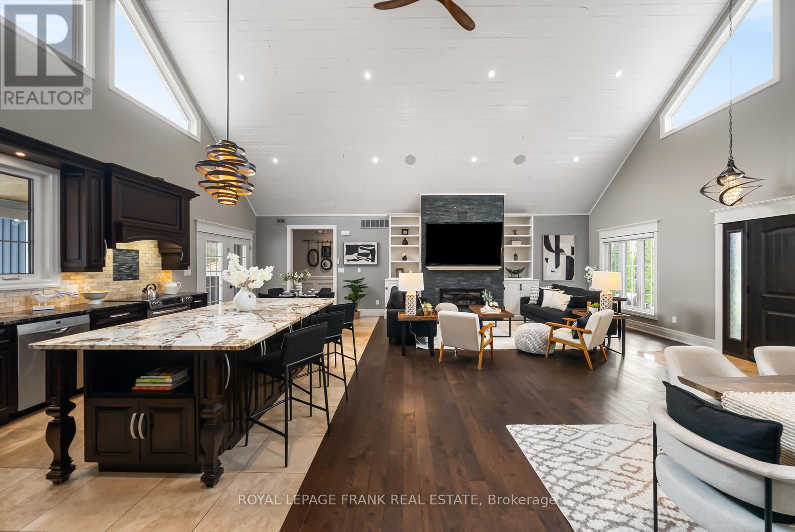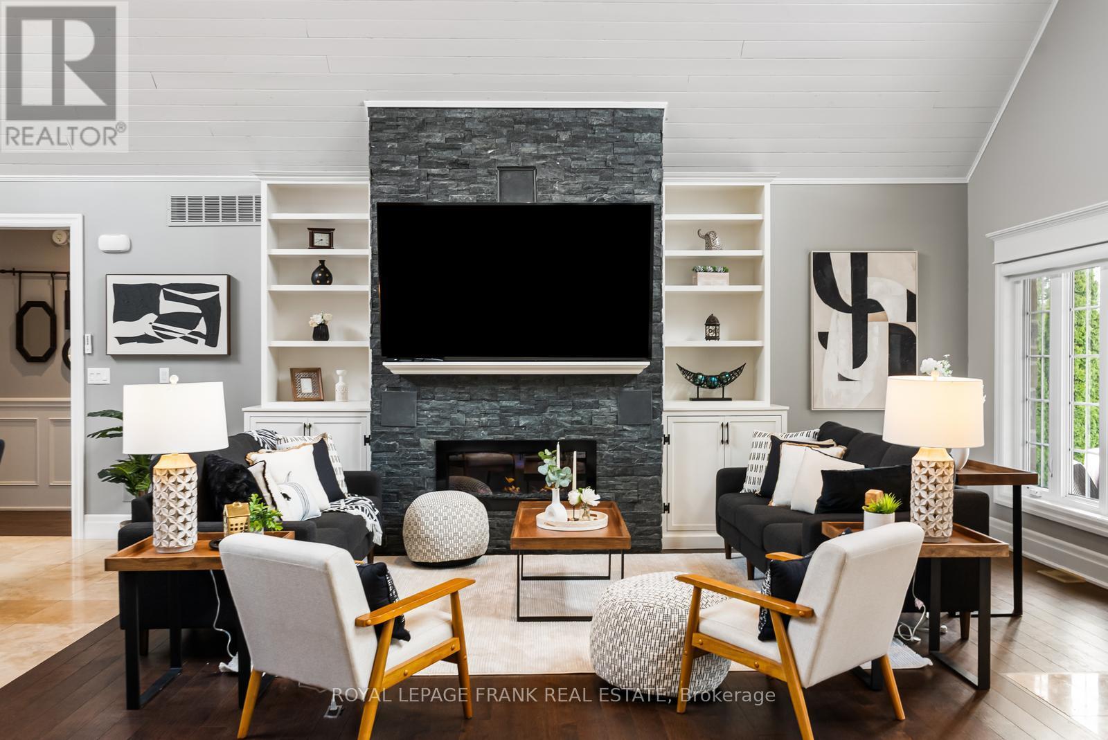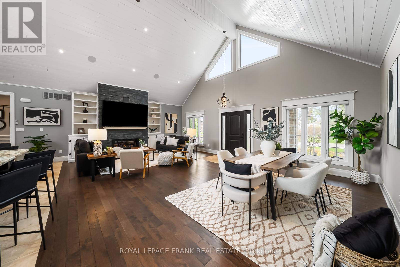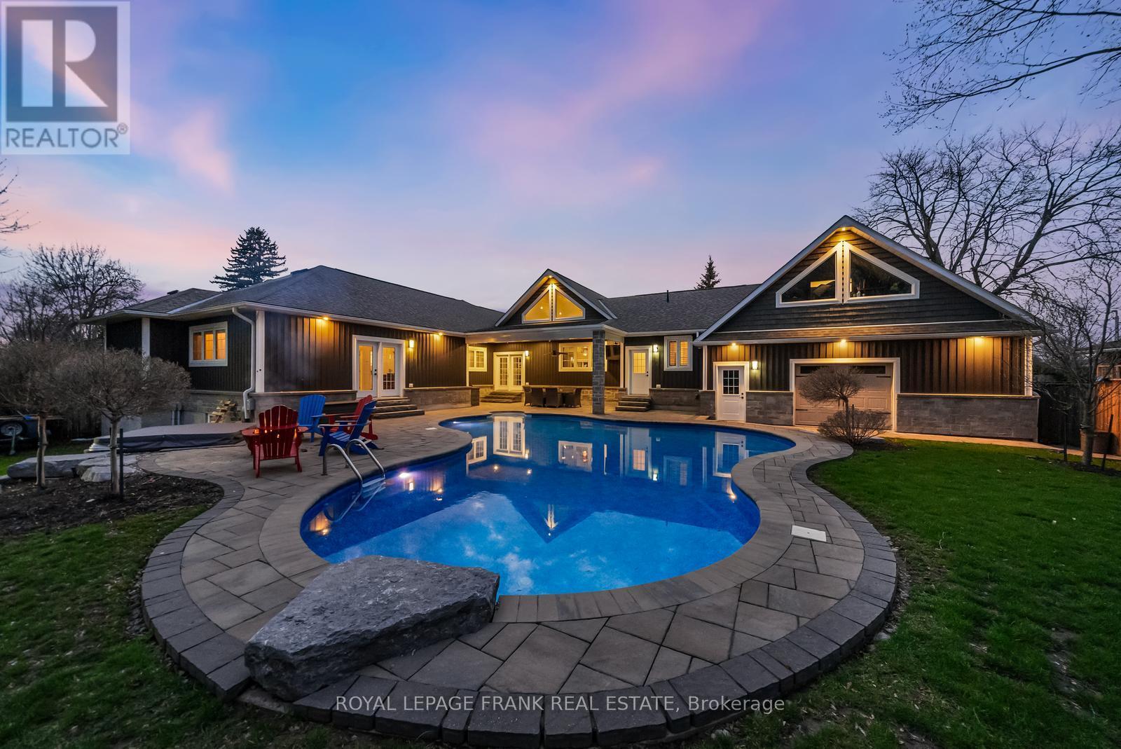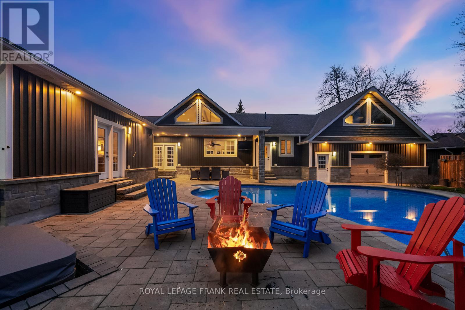 Welcome to an extraordinary, masterfully crafted bungalow offering over 5,300 square feet of impeccably refined living space. Set on an expansive 100' x 150' private estate lot, the residence is complemented by a resort-inspired backyard oasis, showcasing a lagoon-style heated saltwater pool and hot tub enveloped by professionally curated landscaping. A triple-wide, extended driveway accommodates up to 12 vehicles, in addition to a heated four-car garage featuring a convenient drive-through bay. Inside, a breathtaking great room unfolds beneath soaring 20-foot cathedral ceilings, framed by dramatic gable-end windows that bathe the space in natural light. The main level is defined by 9-foot ceilings, exquisite hardwood flooring, and expansive four-foot-wide hallways enhanced with elegant wainscoting. At the heart of the home lies a chef's kitchen of exceptional quality, appointed with fine solid wood cabinetry, soft-close detailing, and pristine quartz countertops anchored by a grand centre island. The primary suite serves as a serene private sanctuary, complete with dual walk-in closets and a spa-inspired ensuite featuring a granite walk-in shower, freestanding tub, heated floors, and a discreet, soundproof in-suite laundry. Three additional main-level bedrooms offer flexible accommodation for family and guests. The finished lower level extends the home's luxurious living space, presenting two generously sized bedrooms, a dedicated fitness studio, and an expansive family room centered around a striking 100" Napoleon fireplace. Above the garage, a spacious loft provides an ideal setting for a private office or creative studio. The professionally landscaped grounds, complete with a comprehensive irrigation system, ensures an effortlessly maintained outdoor environment. This exceptional estate is perfectly tailored for discerning homeowners who value both luxury, versatility and comfort. (id:43681)