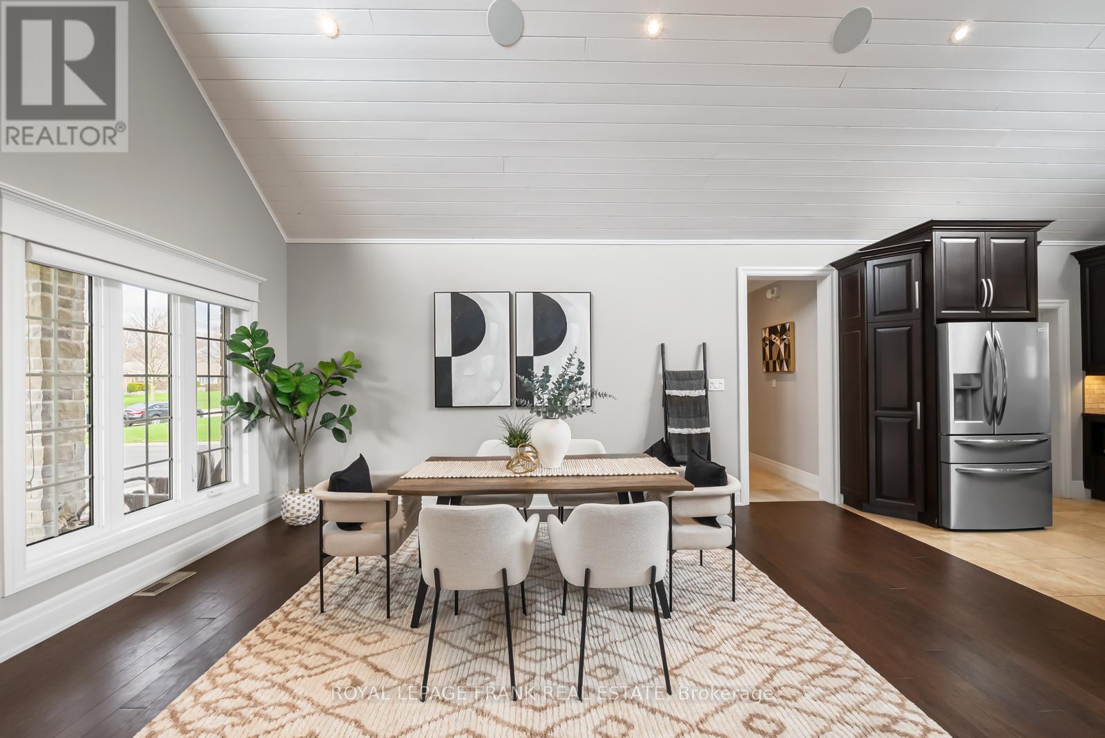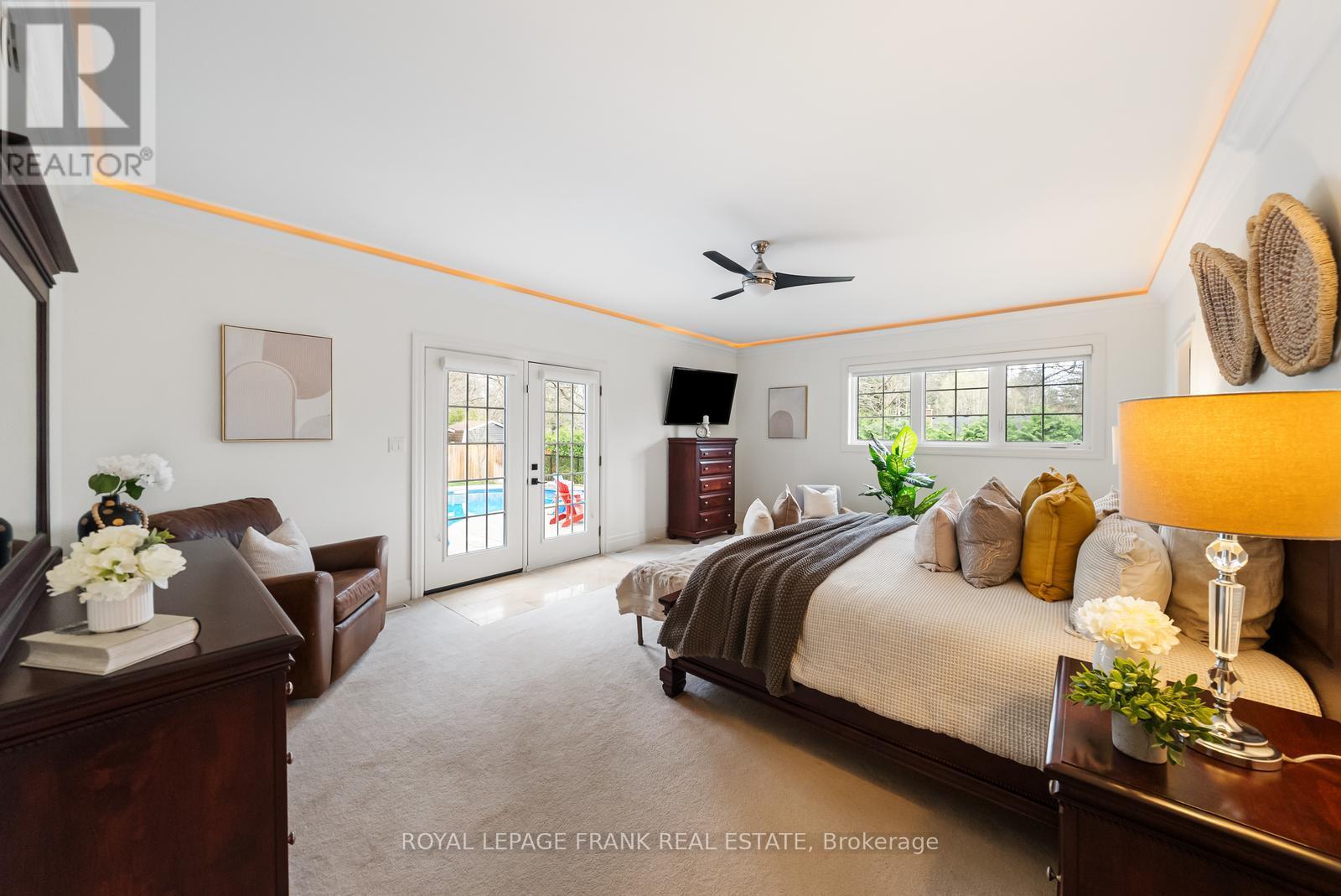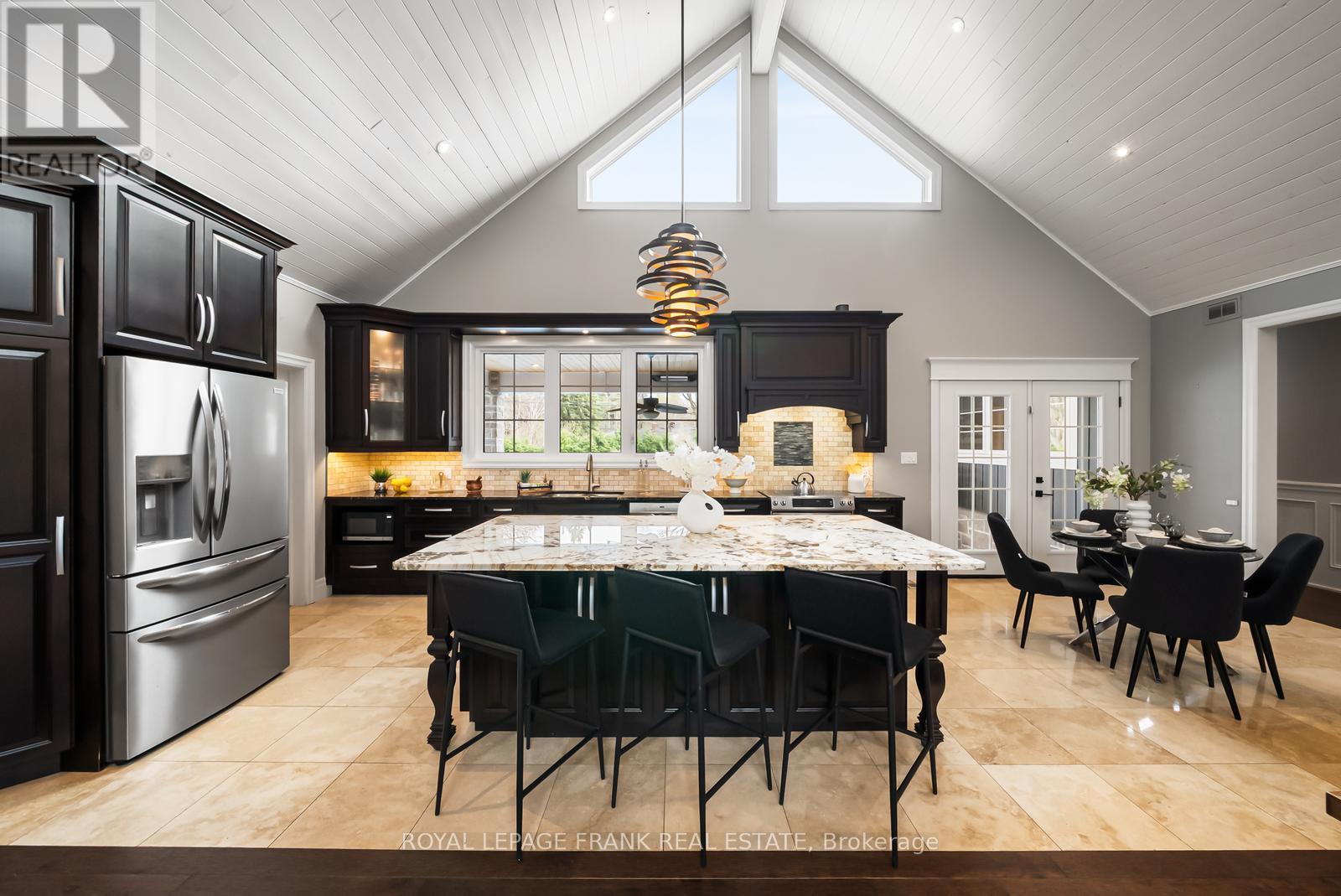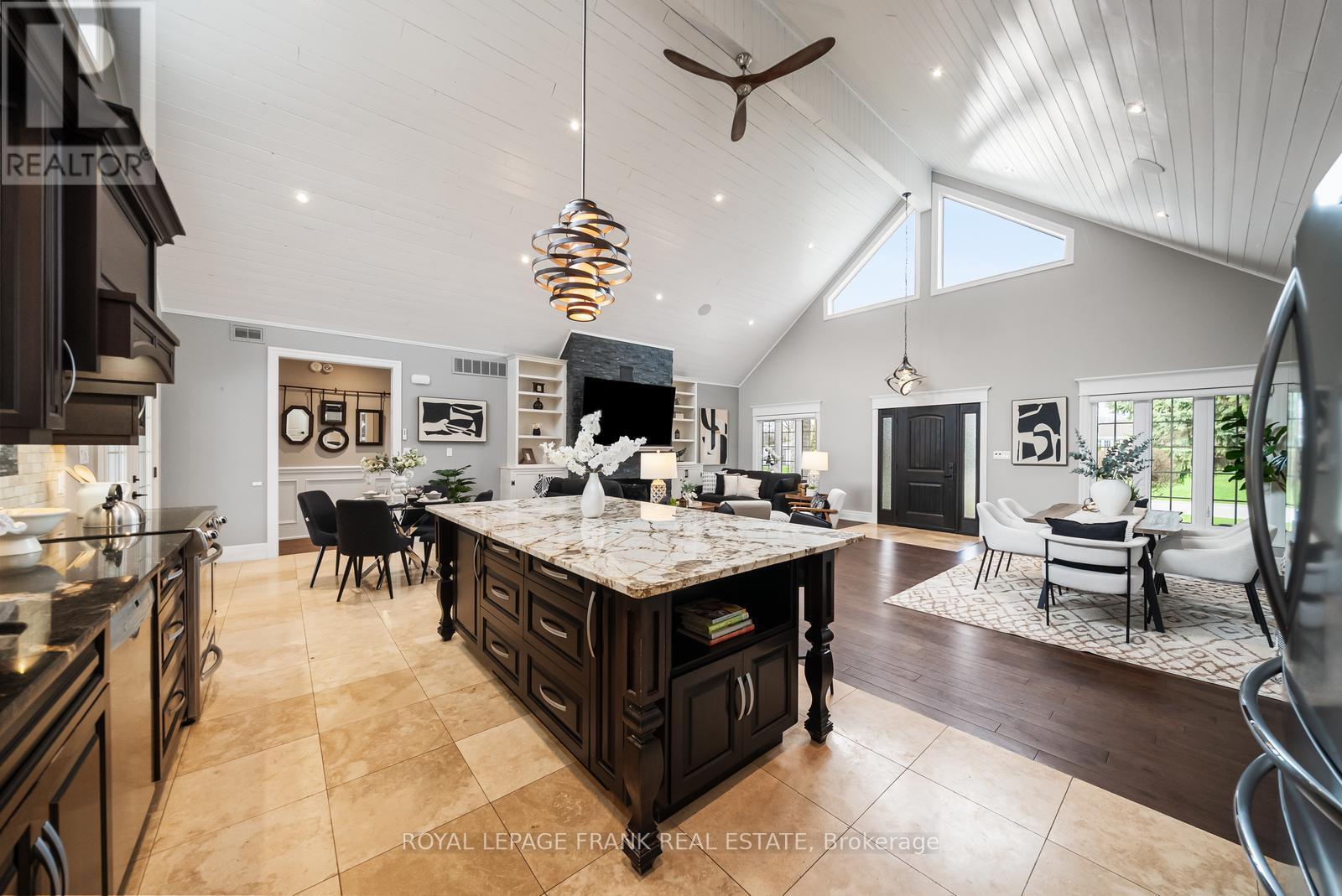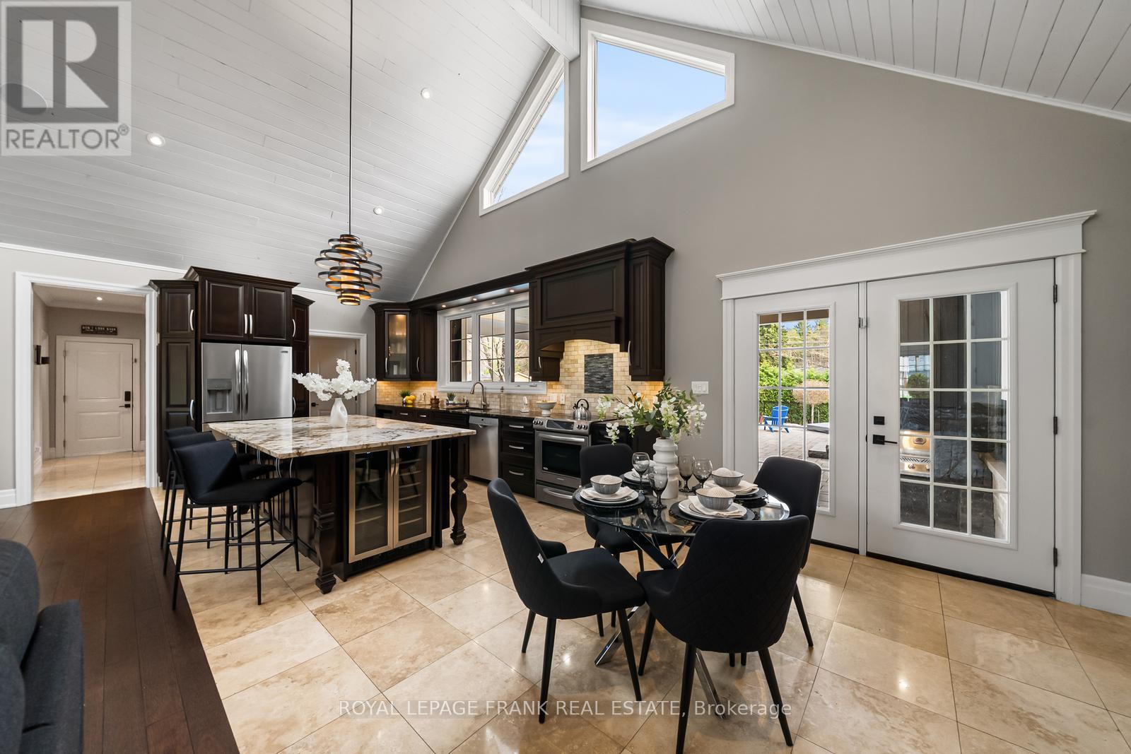 Welcome to an extraordinary, masterfully crafted bungalow offering over 5,300 square feet of impeccably refined living space. Set on an expansive 100' x 150' private estate lot, the residence is complemented by a resort-inspired backyard oasis, showcasing a lagoon-style heated saltwater pool and hot tub enveloped by professionally curated landscaping. A triple-wide, extended driveway accommodates up to 12 vehicles, in addition to a heated four-car garage featuring a convenient drive-through bay. Inside, a breathtaking great room unfolds beneath soaring 20-foot cathedral ceilings, framed by dramatic gable-end windows that bathe the space in natural light. The main level is defined by 9-foot ceilings, exquisite hardwood flooring, and expansive four-foot-wide hallways enhanced with elegant wainscoting. At the heart of the home lies a chef's kitchen of exceptional quality, appointed with fine solid wood cabinetry, soft-close detailing, and pristine quartz countertops anchored by a grand centre island. The primary suite serves as a serene private sanctuary, complete with dual walk-in closets and a spa-inspired ensuite featuring a granite walk-in shower, freestanding tub, heated floors, and a discreet, soundproof in-suite laundry. Three additional main-level bedrooms offer flexible accommodation for family and guests. The finished lower level extends the home's luxurious living space, presenting two generously sized bedrooms, a dedicated fitness studio, and an expansive family room centered around a striking 100" Napoleon fireplace. Above the garage, a spacious loft provides an ideal setting for a private office or creative studio. The professionally landscaped grounds, complete with a comprehensive irrigation system, ensures an effortlessly maintained outdoor environment. This exceptional estate is perfectly tailored for discerning homeowners who value both luxury, versatility and comfort. (id:43681)
