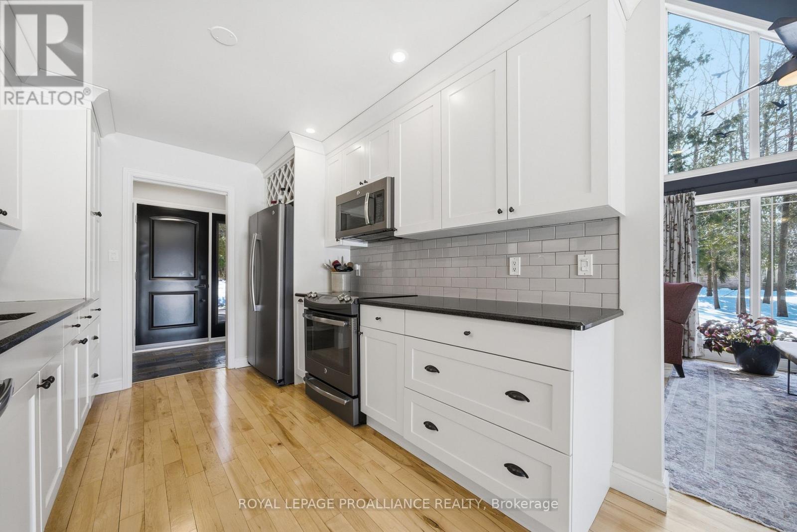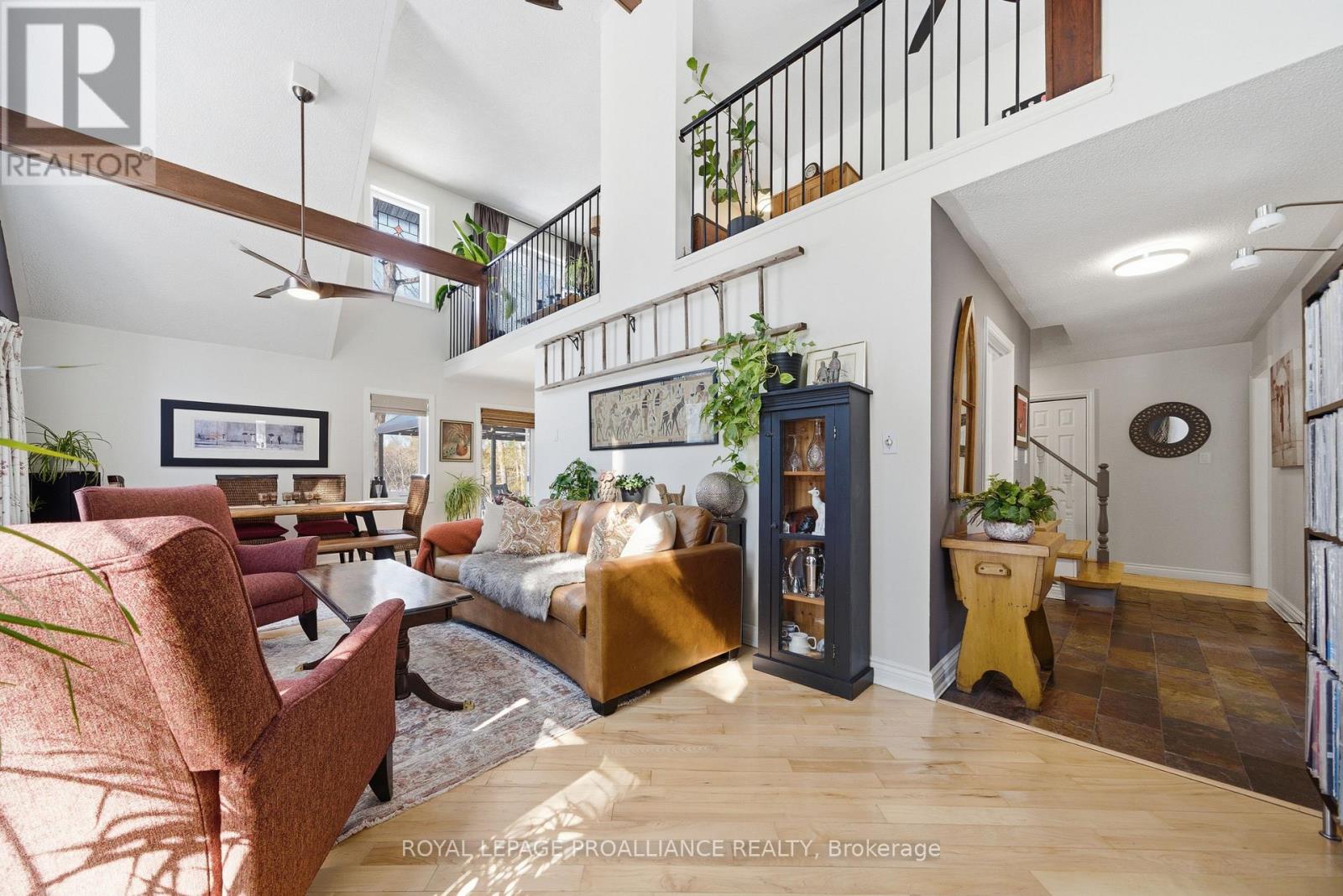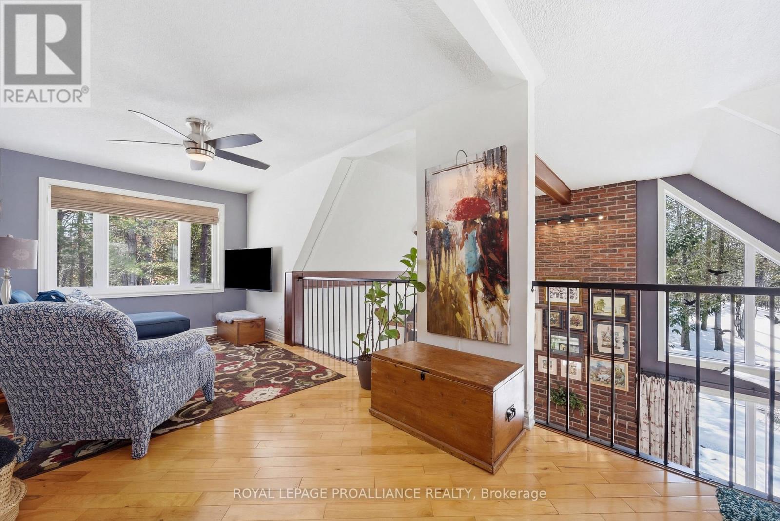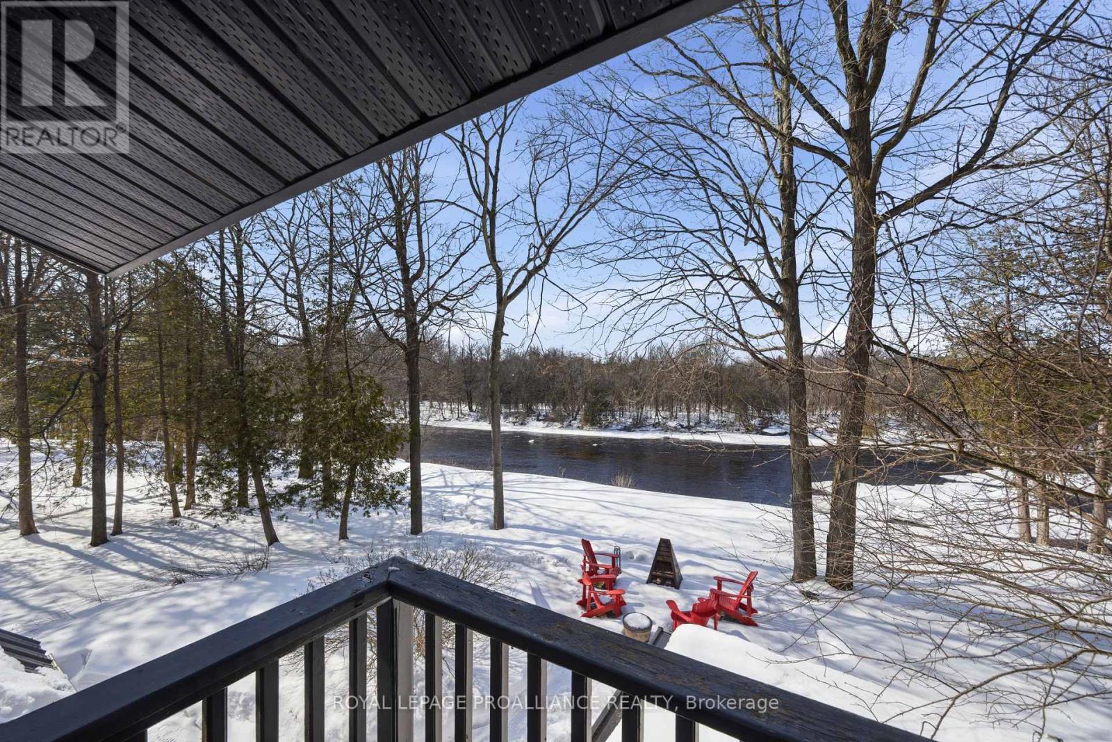 This unique and beautifully updated home offers stunning views of the Moira River and is filled with natural light from large windows throughout. Featuring an attached two-car garage, this property combines comfort and functionality in an exceptional waterfront setting. The main floor boasts a stunning living room with vaulted ceilings and a striking floor-to-ceiling brick fireplace that creates a warm and inviting focal point, flowing seamlessly into the dining area. The well-appointed kitchen offers ample storage, a large double sink, stainless steel appliances, granite countertops, and convenient walk-out access to the rear deck-perfect for entertaining with a river front backdrop. The primary bedroom is conveniently located on the main level and includes a walk-in closet, a luxurious 4-piece en-suite with soaker tub and tiled stand-up shower, and it's own walk-out to the rear deck. Main floor laundry and a 2-piece bathroom add to the convenience. Upstairs, a generous sitting room overlooks the living space below and features a private balcony with river views, along with an additional bedroom and a 5-piece bathroom. The fully finished basement provides incredible flexibility with a recreation room complete with a stove fireplace, a 2-piece bathroom, three additional flex spaces ideal for a home office, gym, hobbies or guest bedroom, walk-up access to the garage, and abundant storage throughout. (id:43681)