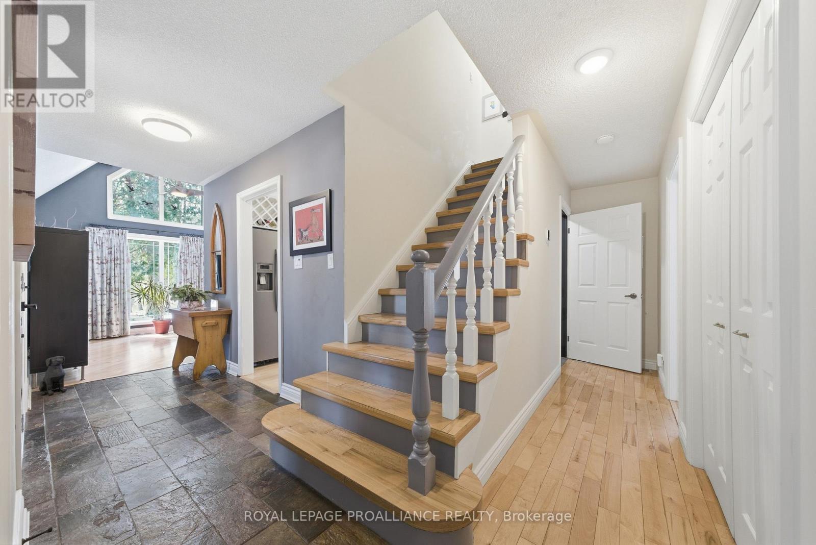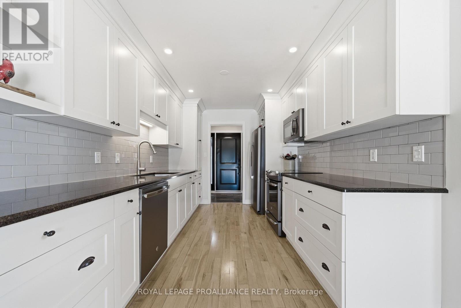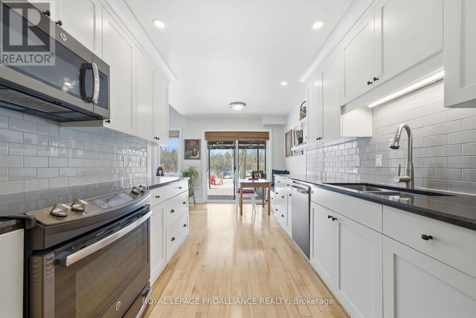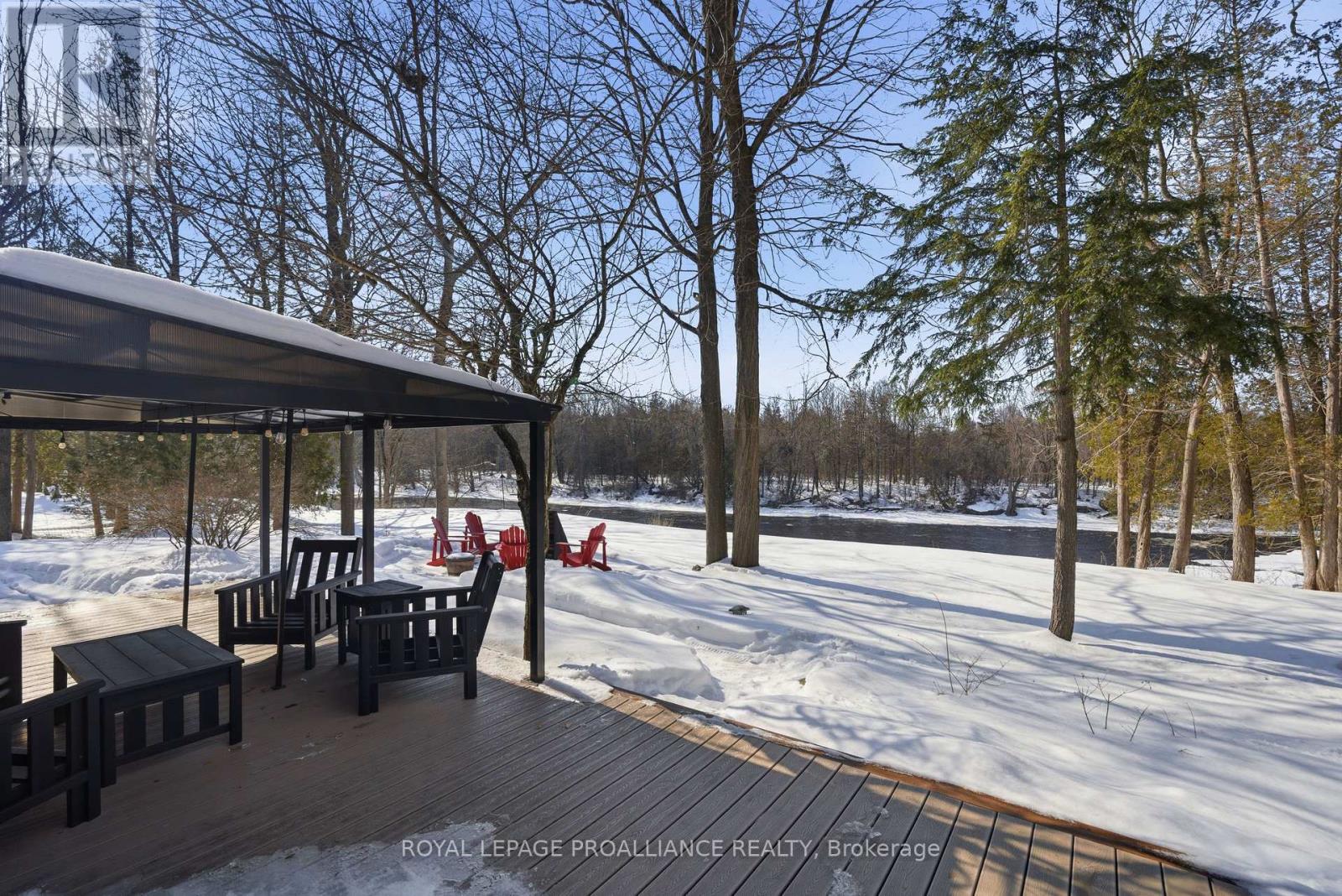 This unique and beautifully updated home offers stunning views of the Moira River and is filled with natural light from large windows throughout. Featuring an attached two-car garage, this property combines comfort and functionality in an exceptional waterfront setting. The main floor boasts a stunning living room with vaulted ceilings and a striking floor-to-ceiling brick fireplace that creates a warm and inviting focal point, flowing seamlessly into the dining area. The well-appointed kitchen offers ample storage, a large double sink, stainless steel appliances, granite countertops, and convenient walk-out access to the rear deck-perfect for entertaining with a river front backdrop. The primary bedroom is conveniently located on the main level and includes a walk-in closet, a luxurious 4-piece en-suite with soaker tub and tiled stand-up shower, and it's own walk-out to the rear deck. Main floor laundry and a 2-piece bathroom add to the convenience. Upstairs, a generous sitting room overlooks the living space below and features a private balcony with river views, along with an additional bedroom and a 5-piece bathroom. The fully finished basement provides incredible flexibility with a recreation room complete with a stove fireplace, a 2-piece bathroom, three additional flex spaces ideal for a home office, gym, hobbies or guest bedroom, walk-up access to the garage, and abundant storage throughout. (id:43681)