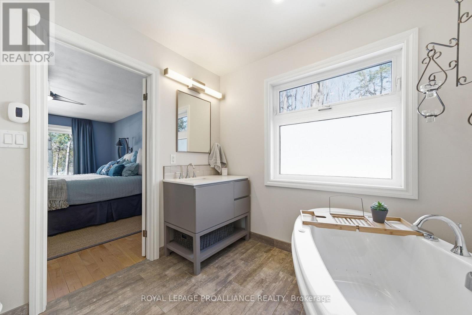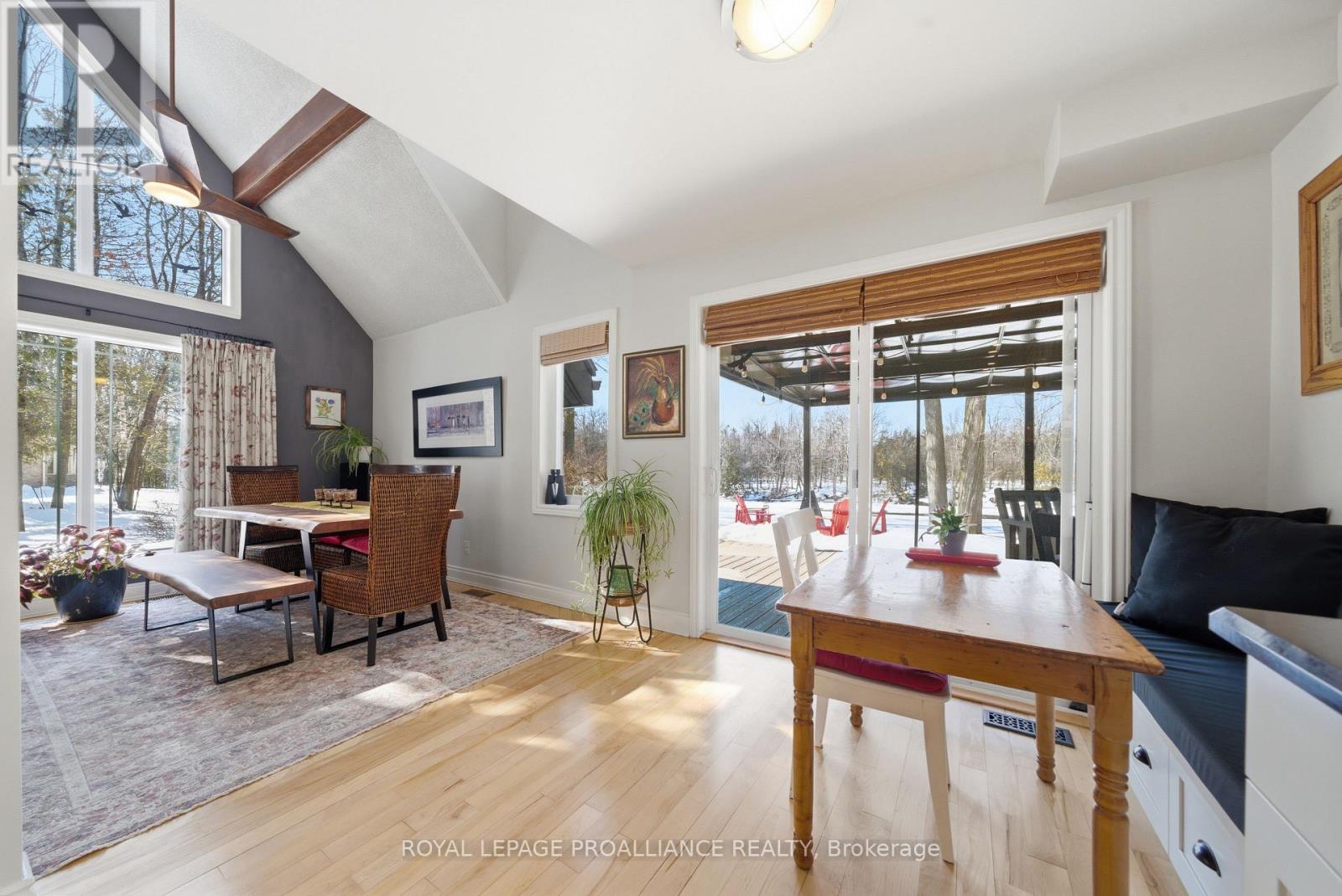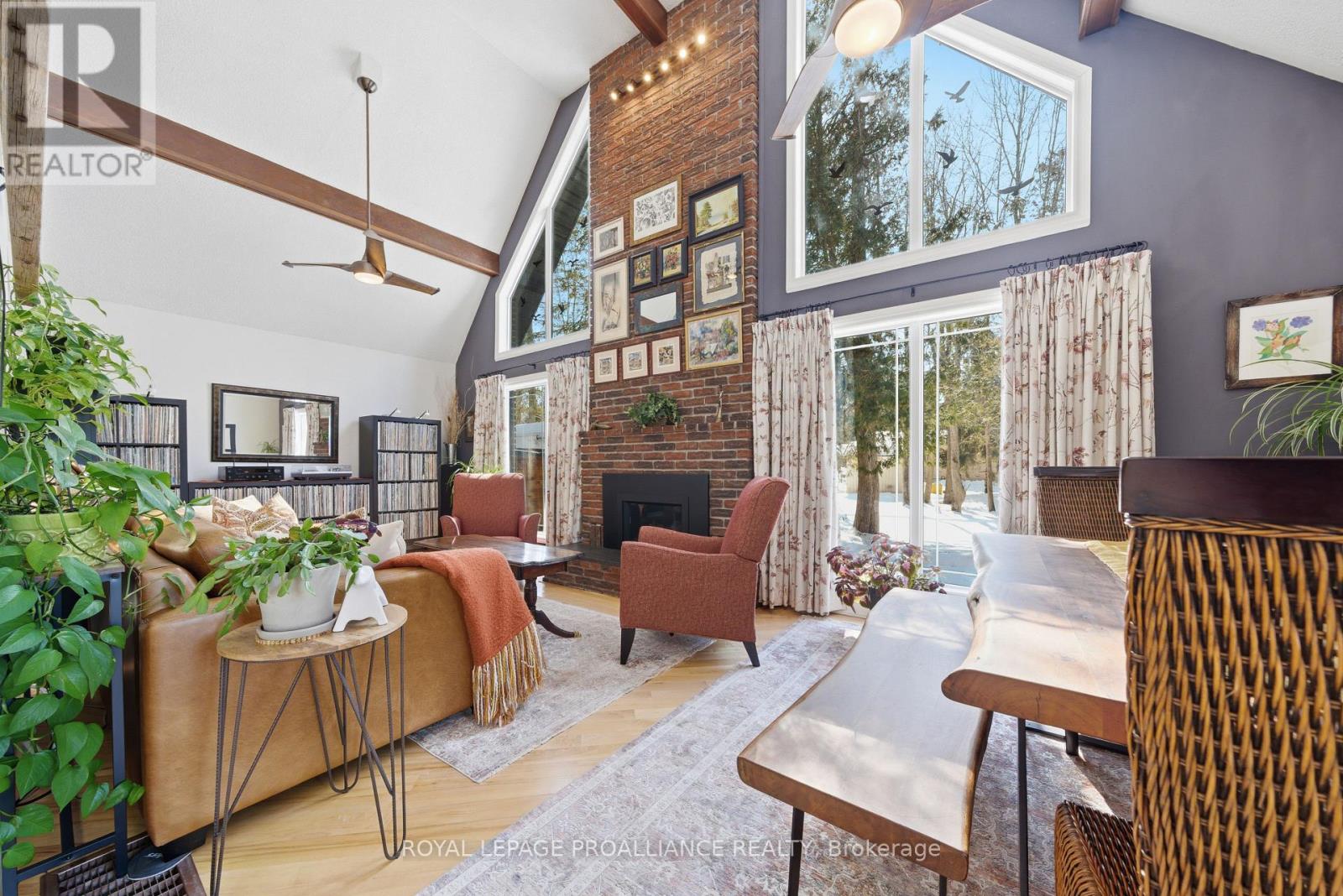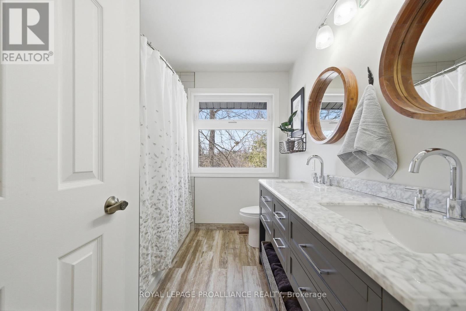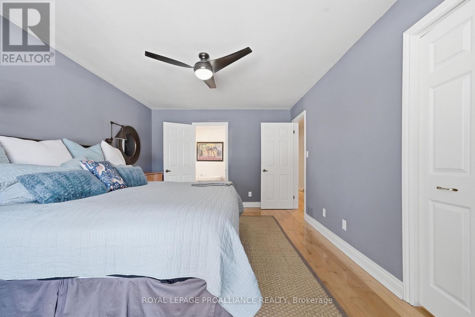 This unique and beautifully updated home offers stunning views of the Moira River and is filled with natural light from large windows throughout. Featuring an attached two-car garage, this property combines comfort and functionality in an exceptional waterfront setting. The main floor boasts a stunning living room with vaulted ceilings and a striking floor-to-ceiling brick fireplace that creates a warm and inviting focal point, flowing seamlessly into the dining area. The well-appointed kitchen offers ample storage, a large double sink, stainless steel appliances, granite countertops, and convenient walk-out access to the rear deck-perfect for entertaining with a river front backdrop. The primary bedroom is conveniently located on the main level and includes a walk-in closet, a luxurious 4-piece en-suite with soaker tub and tiled stand-up shower, and it's own walk-out to the rear deck. Main floor laundry and a 2-piece bathroom add to the convenience. Upstairs, a generous sitting room overlooks the living space below and features a private balcony with river views, along with an additional bedroom and a 5-piece bathroom. The fully finished basement provides incredible flexibility with a recreation room complete with a stove fireplace, a 2-piece bathroom, three additional flex spaces ideal for a home office, gym, hobbies or guest bedroom, walk-up access to the garage, and abundant storage throughout. (id:43681)