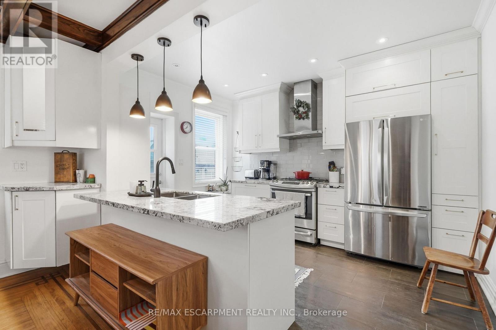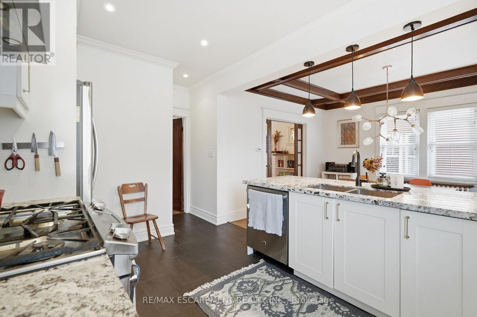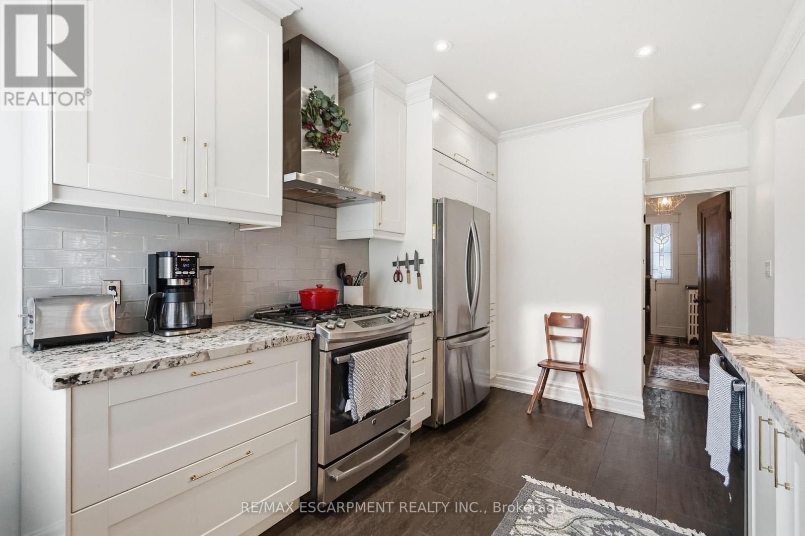 Welcome to 37 Connaught Avenue South, where timeless character meets one of Hamilton's most connected, neighbourly communities. Set on a quiet, tree-lined street in Gibson/Stipley South, this is more than a home, it's a place where neighbours know each other, kids play outside, and there's a true sense of community. This beautifully updated 2.5-storey home offers 4 spacious bedrooms and 2.5 bathrooms, blending historic charm with thoughtful modern upgrades. Freshly painted and move-in ready, every space feels warm and refined. At the heart of the home is a stunning renovated kitchen with soaring ceilings, custom cabinetry, stainless steel appliances, granite countertops, and a functional peninsula perfect for everyday living and entertaining. It flows into a welcoming dining area with hardwood floors and an original beam ceiling. The cozy family room features pocket French doors, hardwood flooring, a gas fireplace with natural stone surround, and custom built-ins, the perfect place to unwind. Original character shines throughout with coffered ceilings, walnut trim, solid wood doors, antique hardware, inlay floors, and beautiful stained glass details. Location is everything. Just minutes to Ottawa Street's vibrant shops, cafés, antique markets, and local dining, plus close to Gage Park where you can enjoy trails, the greenhouse, playgrounds, festivals, and year-round outdoor activities. 37 Connaught Avenue South isn't just a home, it's a lifestyle rooted in community, character, and convenience. (id:43681)