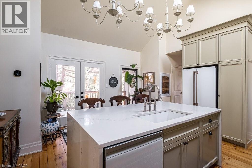Dundas Dream! This circa 1880 character cottage known as, but not really a cottage, offers an impressive near 2500 sq ft of outstanding living space starting with the storybook curb appeal with gorgeous perennial landscaping, unassuming from street level, but wait 'til you see what it's like in the backyard with a full 2 stories in the rear! A choice locale where you're right in the heart of the Cross-Melville heritage district of downtown Dundas! Walkable to everything this bungalow has a private ‘forest’ on a 72’ double wide lot, featuring a sunken garden and inground heated saltwater pool surrounded by lush ferns, hostas, peonies, rose bushes, hydrangeas and Japanese grasses. This tardis of a home is much larger than it appears and its flexible layout is perfect for empty nesters and includes private space for another family member. Professionally transformed to a re-imagined layout and living space, stripped to the studs in 2023. New HVAC, wiring, footings, support beams and everything, plus the joy of staying inside to do your laundry!! Unique reverse bungalow layout with main level living and lower garden level bedrooms, all at or above grade. 4 beds and 4 baths (2 half). The primary has jack and jill 5-piece bath access & a large WIC. Another with custom built-ins w/ closet and desk. The remaining two bedrooms share a WIC in their own ‘wing’. Additional storage via a large custom hallway w/ built-ins featuring double closets and a bench with hooks. There’s even secret storage under the newly constructed, heritage style, staircase. This home is not to be missed. Loads of charm and character from rustic pine plank floors, salvaged brick floors from the old Grafton building, antique mantel with ornate cast iron insert, beamed ceilings, matching regency chandeliers imported from Chicago, and so much more. (id:43681)