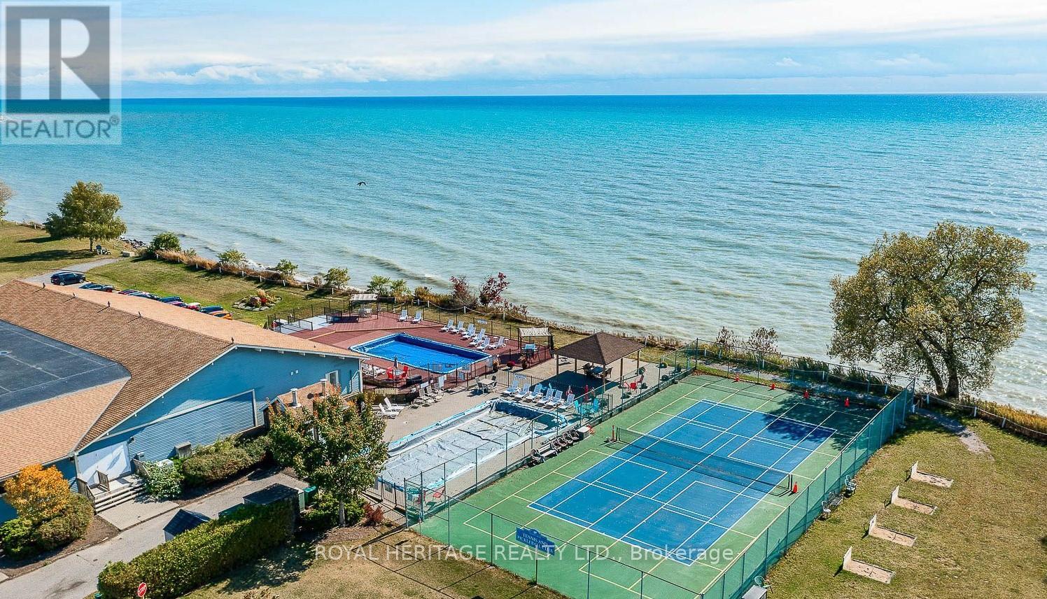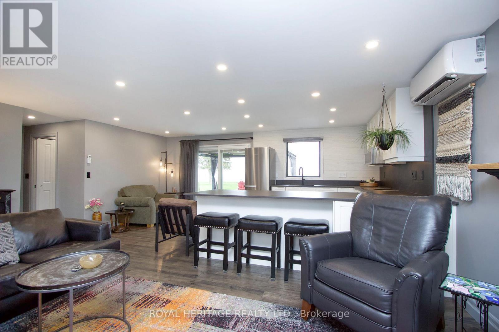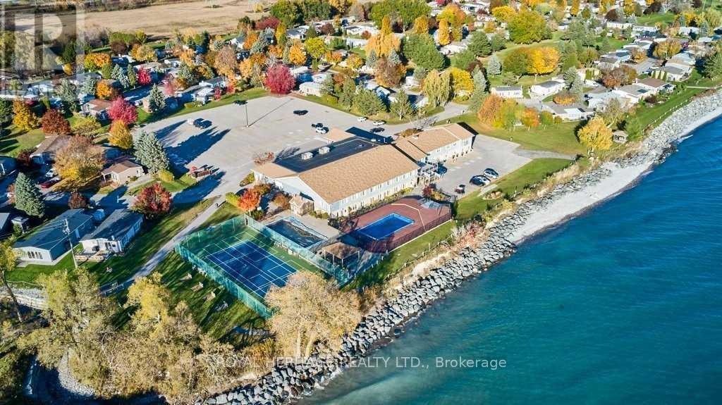 Located in the adult gated community of Wilmot Creek on the shores of Lake Ontario, is this bright and cozy two-bedroom home. Completely renovated top to bottom, inside and out in 2021, incl. engineered hand scraped flooring, pot lighting, popcorn removed from ceilings, crawl space enhancement, new siding, and more, this home feels fresh, and thoughtfully designed. Home shows pride of ownership from the moment you pull into the driveway you see a composite deck, Interlocking brick and maintenance free gardens. Step inside, you're greeted by an open-concept living space that blends the kitchen, dining, and living areas seamlessly-perfect for both quiet mornings and hosting friends. Sunlight pours in through windows, bouncing off clean, modern finishes: soft neutral walls, and sleek fixtures giving the whole space a calm, airy feel. Kitchen is complete with pot lighting, contemporary cabinetry, quartz countertops, and updated appliances, all arranged to keep the space feeling open and social. Cook while still chatting with someone relaxing on the couch or sitting at the breakfast bar. Both bedrooms are comfortable and inviting, with enough space for cozy furnishings and personal touches. The bathroom is equally refreshed, featuring a stylish walk-in shower with glass doors, modern tile work, and clean lines. The real highlight, a stunning view of Lake Ontario. Mornings start with coffee and lake breezes, while evenings bring sunsets reflecting off the water. Whether you're lounging, dining outside, or simply taking in the view, the deck feels like an extension of the home's peaceful charm. See attached feature sheet for complete list of improvements. Nothing left to do but move in and enjoy this amazing lifestyle- Mthly Maintenance Fee Include use of 9 hole golf course, 2 heated salt water pools, gym, pickle ball tennis courts and much more- Pet friendly ** Opportunity to assume existing lease (subject to approval) buyer advantage over new lease rates. (id:43681)