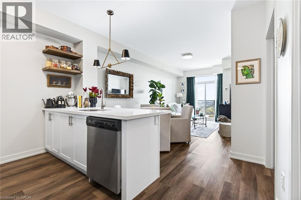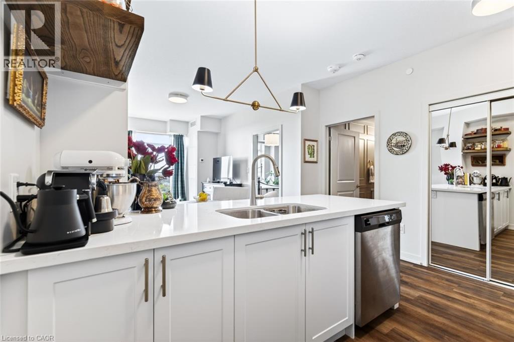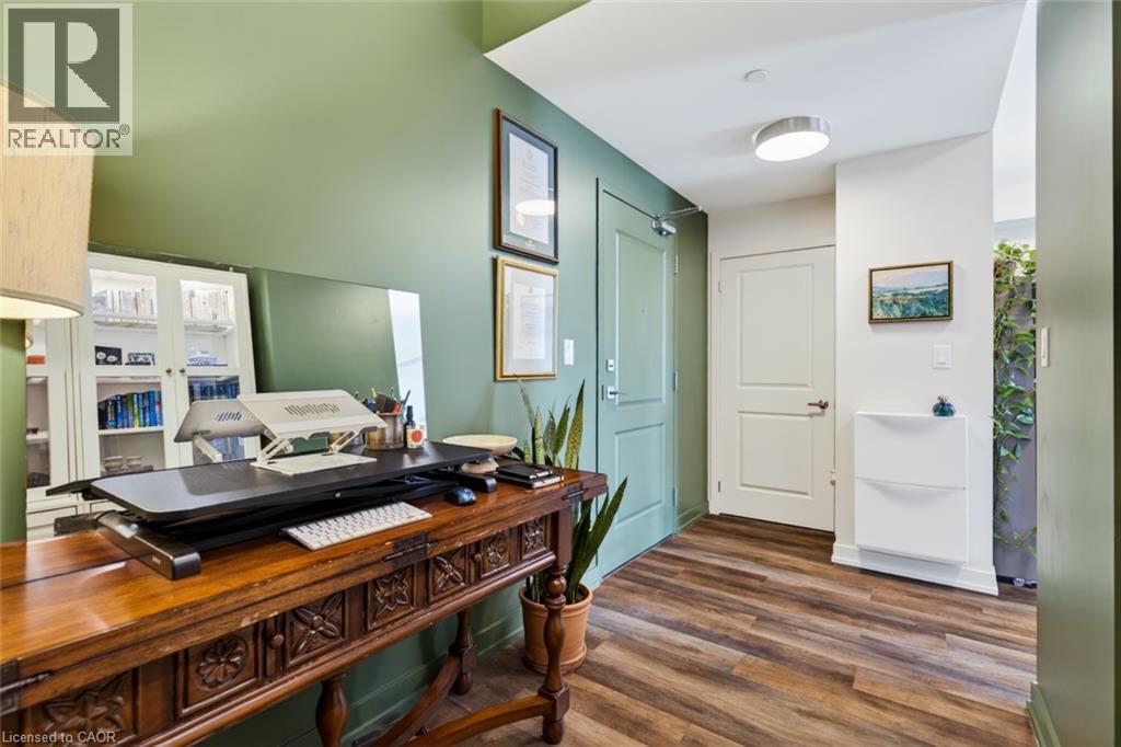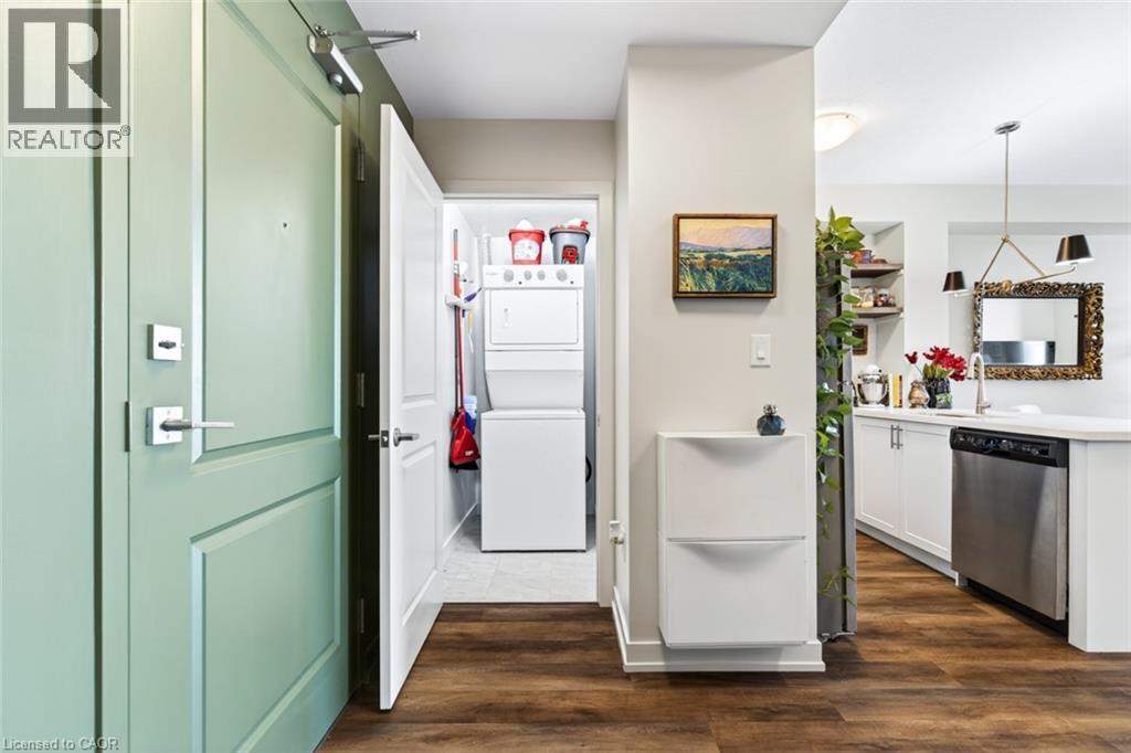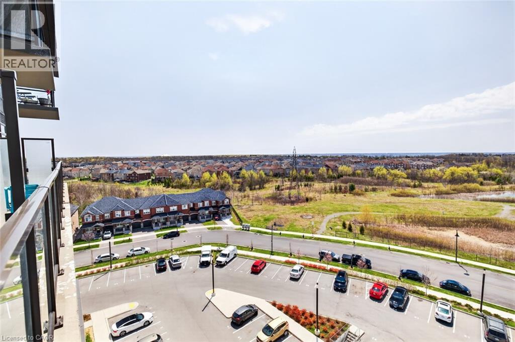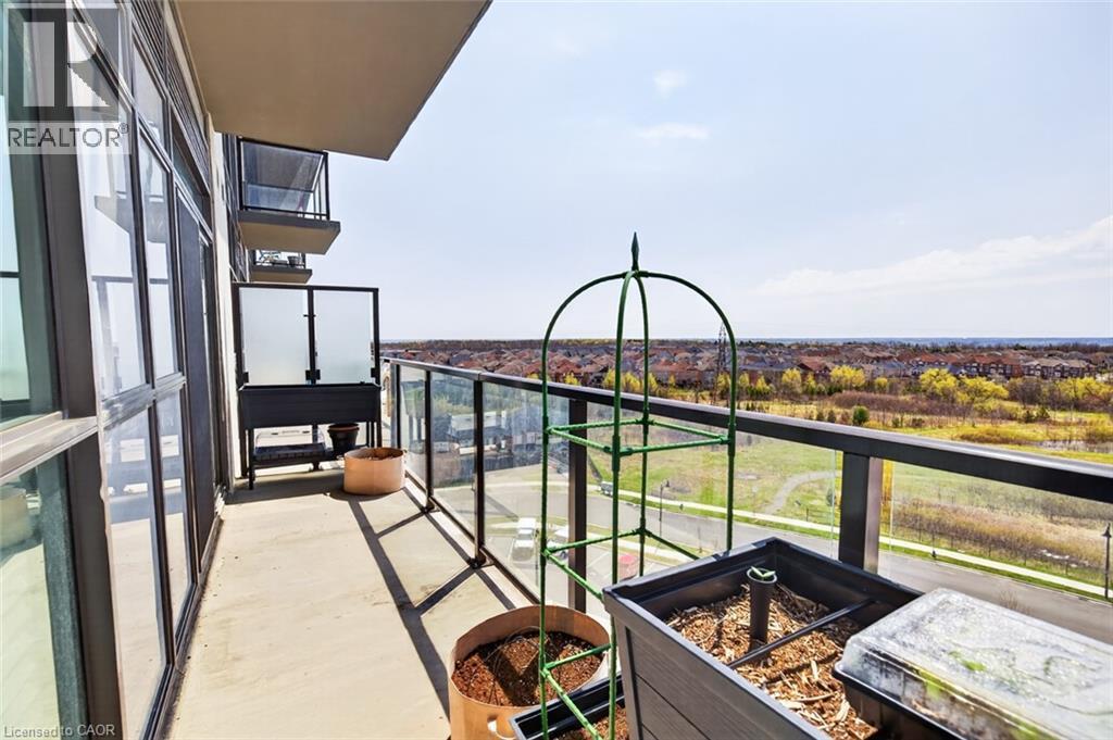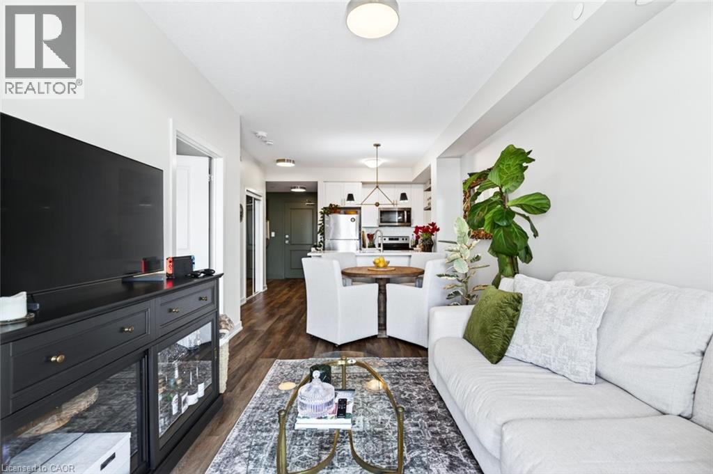 Stunning 1 bed + den, 1 bath condo built by award-winning New Horizon Development Group. This thoughtfully designed unit features a bright open-concept layout, modern kitchen with sleek finishes, in-suite laundry, and geo-thermal heating & cooling. The versatile den is perfect for a home office or reading nook, while large windows fill the space with natural light. Enjoy your private balcony with beautiful, unobstructed views. Includes storage locker and 1 underground parking space. Residents have access to excellent amenities including a party room, gym, rooftop patios, and bike storage. Located in the highly desirable Waterdown community, close to dining, shopping, schools, parks, and just a 5-minute drive to downtown Burlington or Aldershot GO Station. Book your private showing today! (id:43681)
